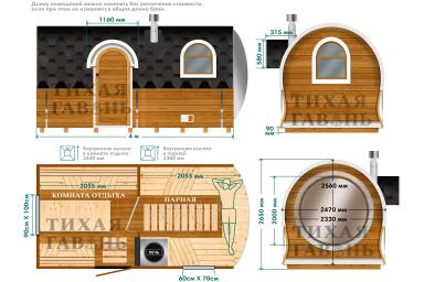 Баня Сундук Премиум Сфера 4 м создана на базе модели Сундук Премиум. За основу взята фирменная форма корпуса с шириной 2,47 м и высотой 2,56 м, после чего в конструкцию было встроено выпуклое панорамное окно в парной.