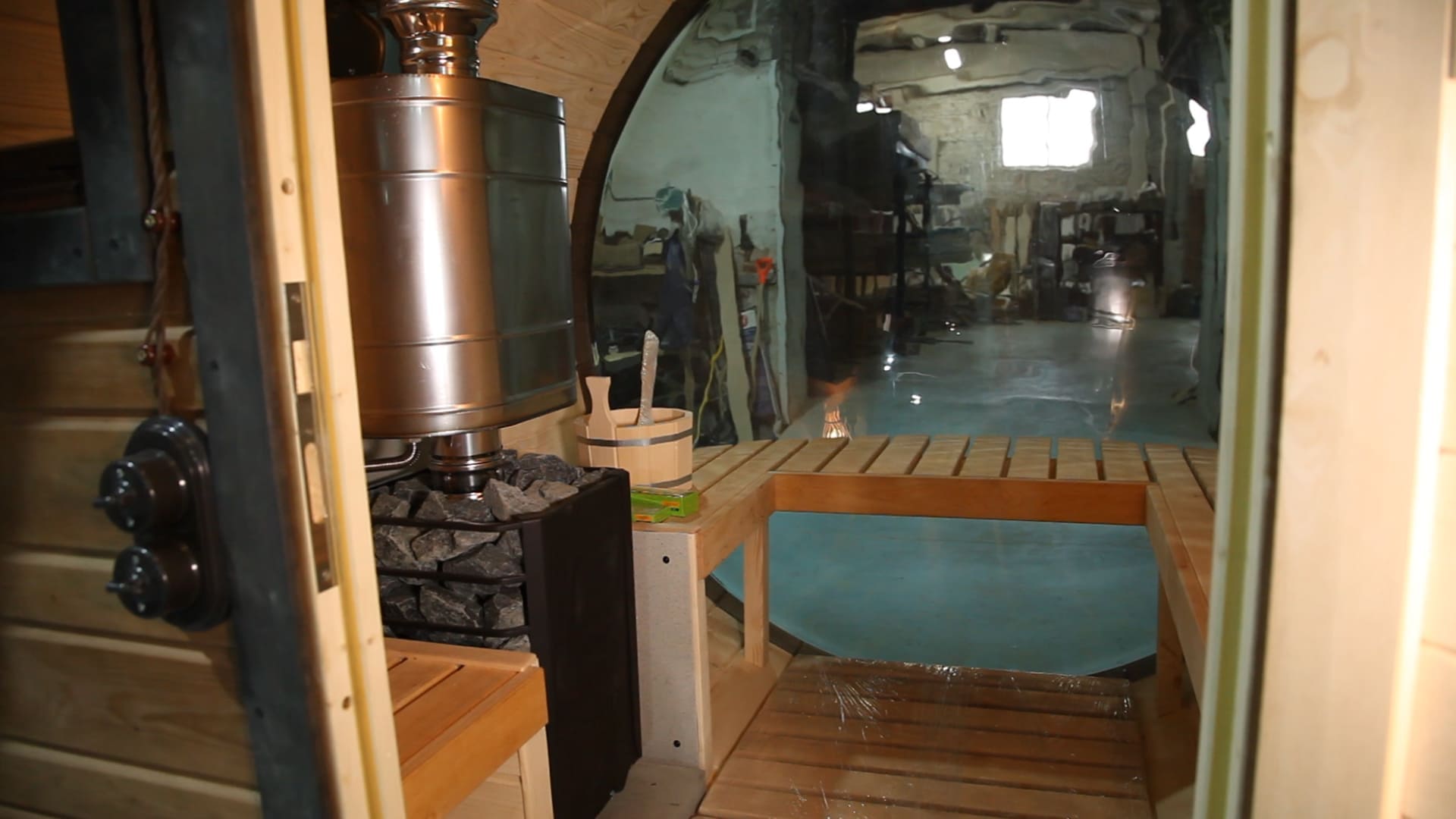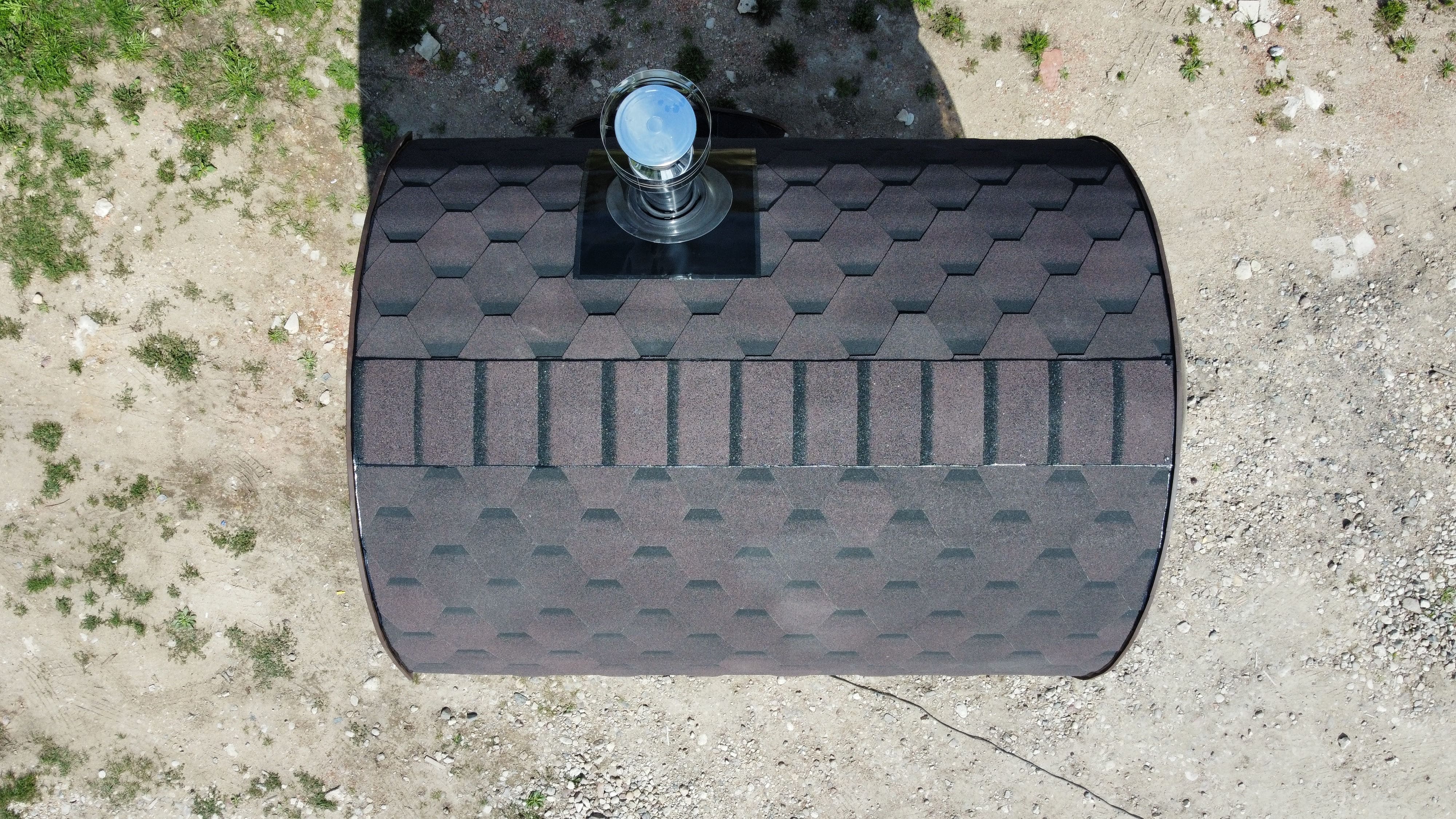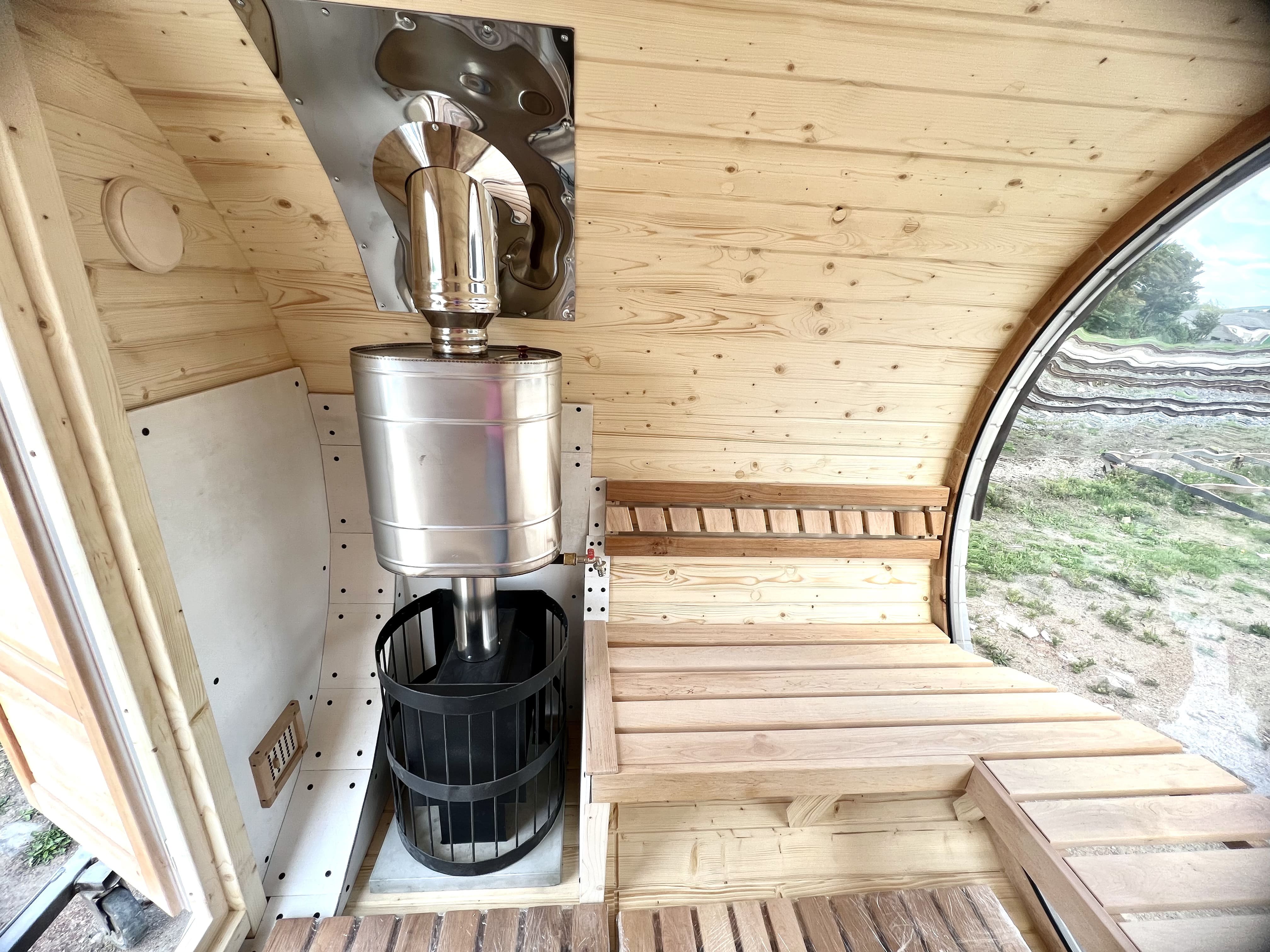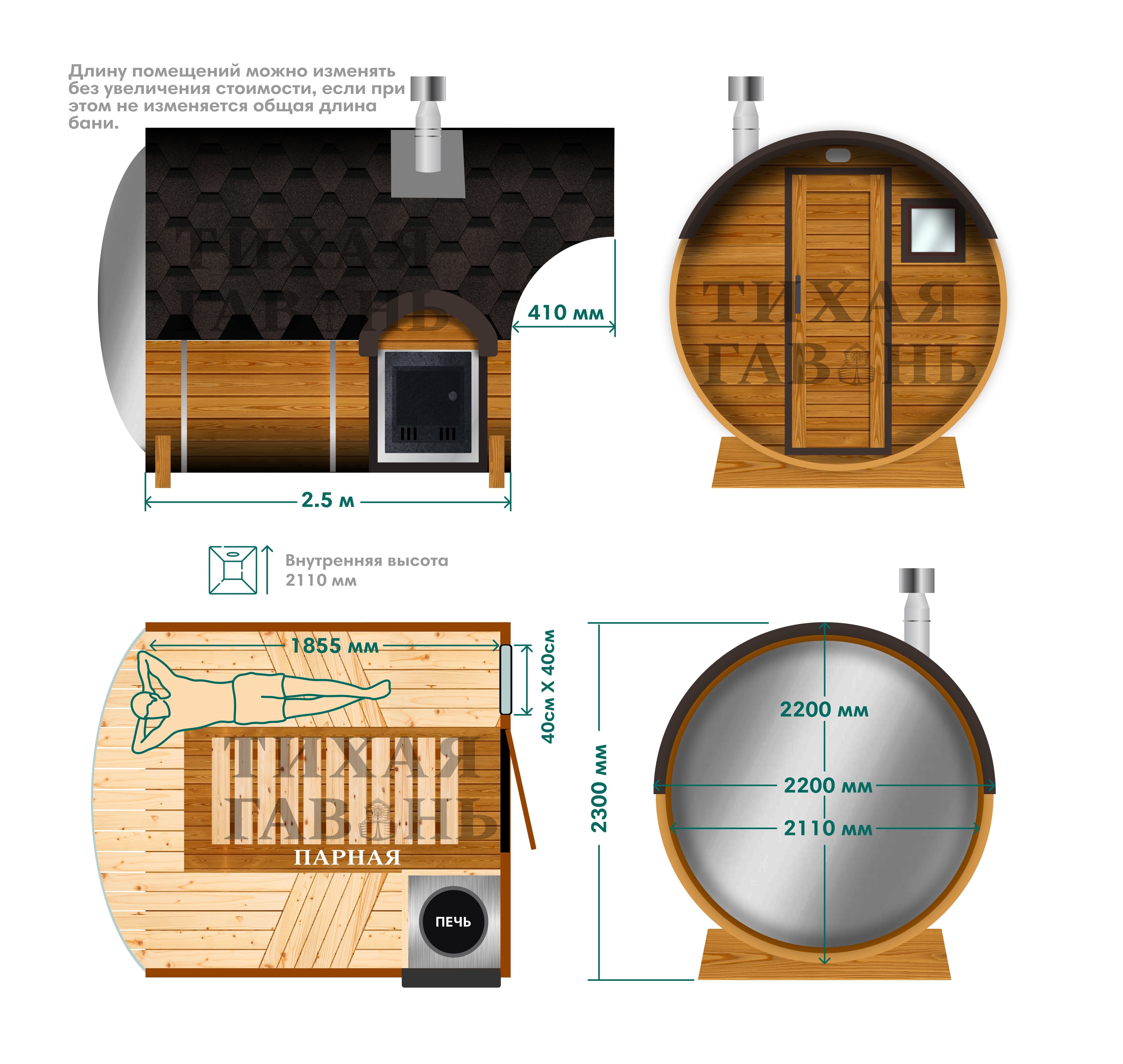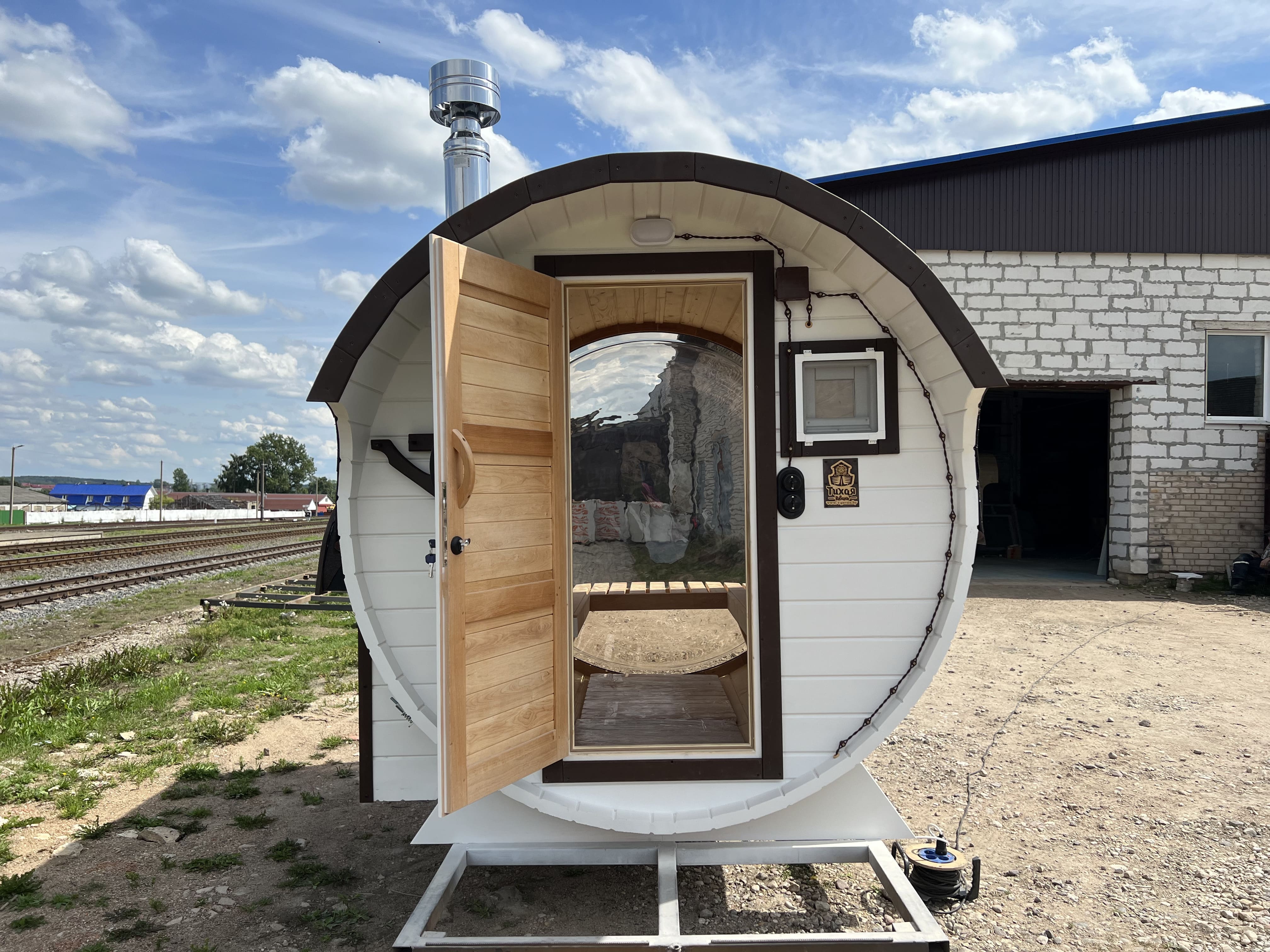 Баня-бочка Батискаф 2,5 м с козырьком сочетает автономность, мобильность и полноценный функционал парной, сохраняя компактные габариты и выразительный внешний вид.