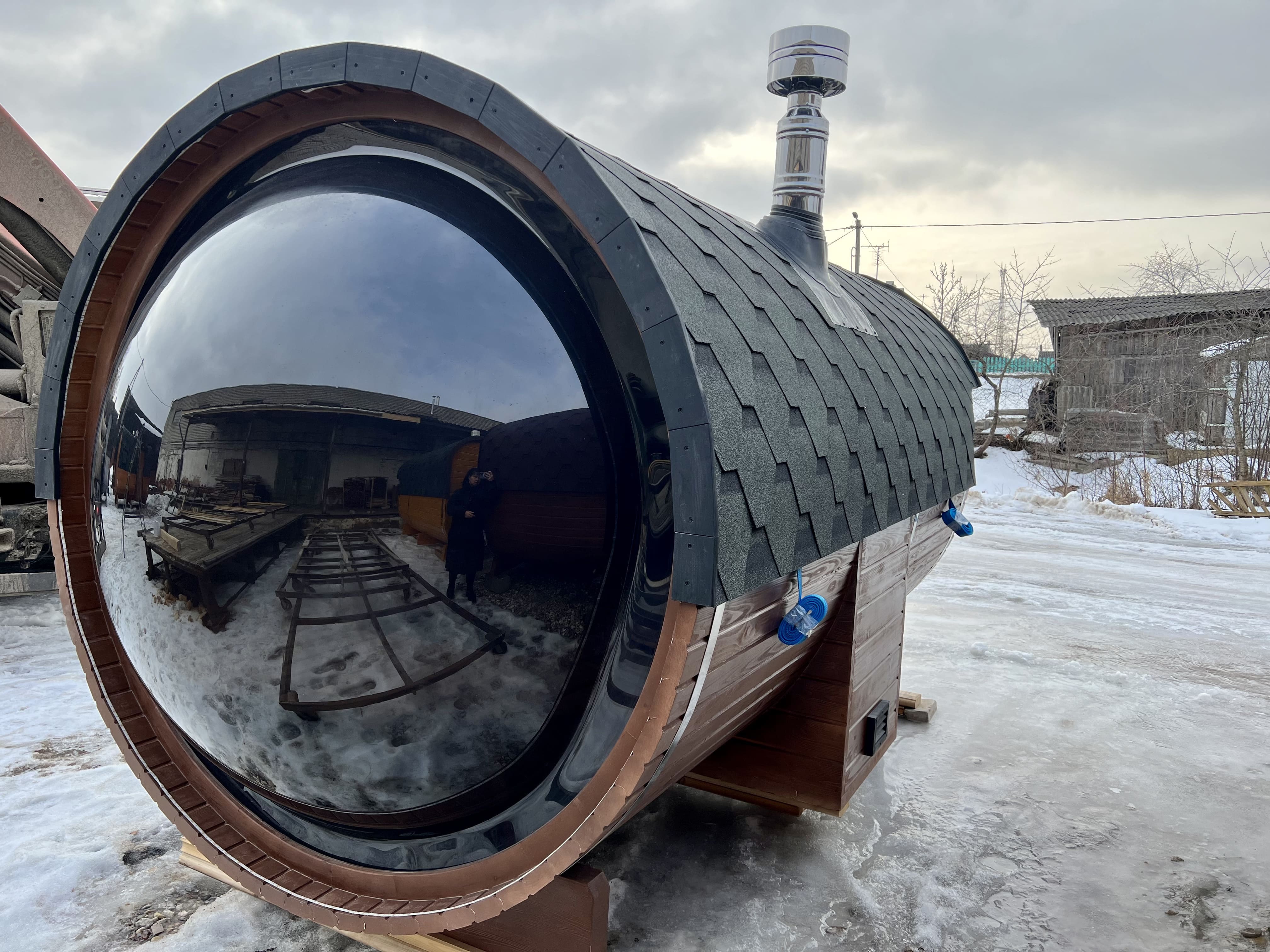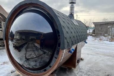 Баня-бочка Батискаф 4,5 м с козырьком - увеличенная версия мобильной модели с выпуклым панорамным окном и расширенной внутренней планировкой. Длина 4,5 м даёт больше пространства по сравнению с предыдущими версиями и позволяет комфортно разделить зону отдыха и парную.
