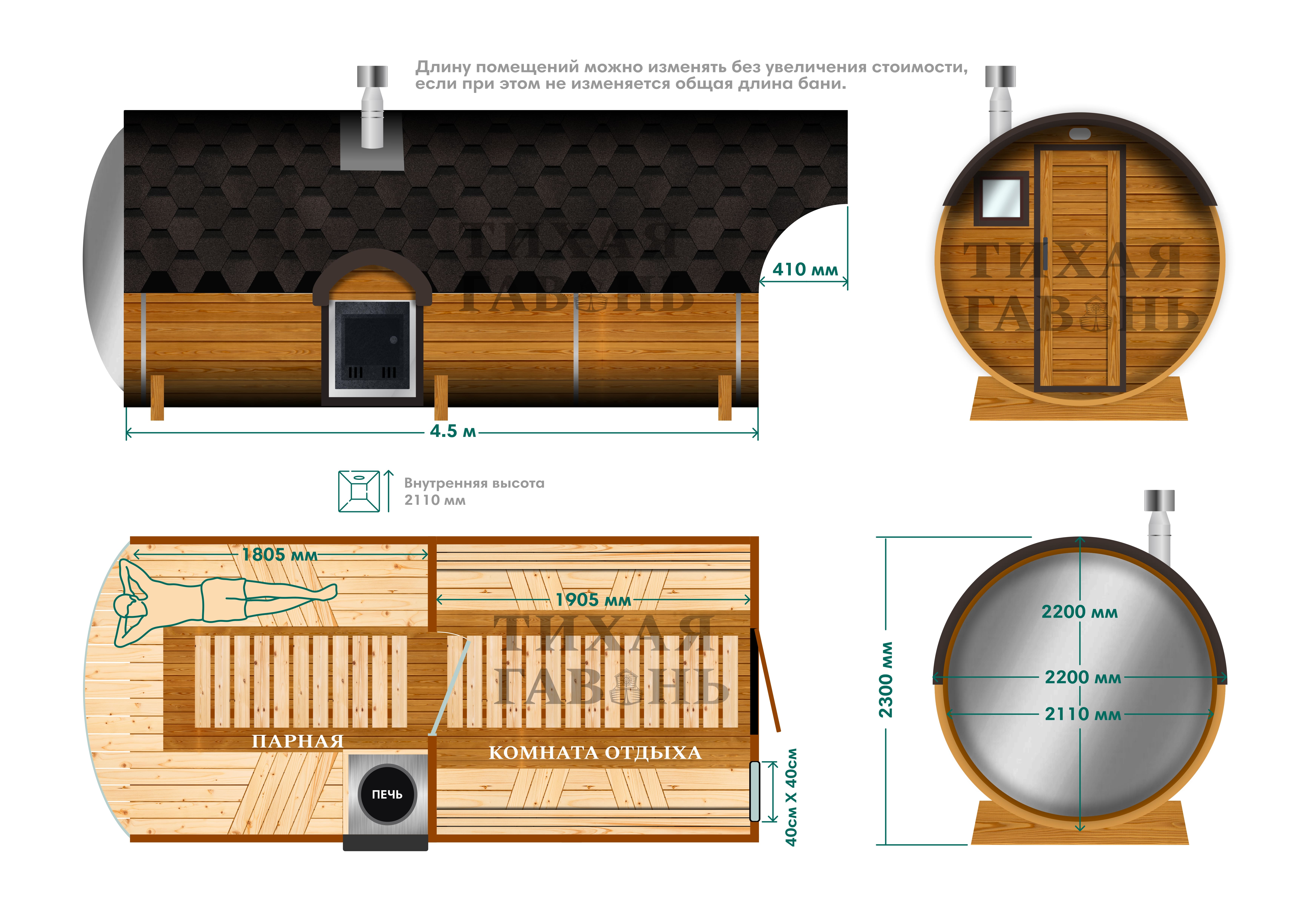 Внутри предусмотрены две комнаты - помещение для переодевания и отдыха, а также полноценная парная. Увеличенная длина делает комнату отдыха просторнее, позволяет разместить лавки, стол или дополнительное хранение.