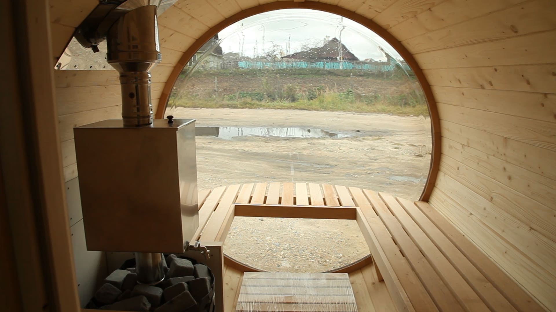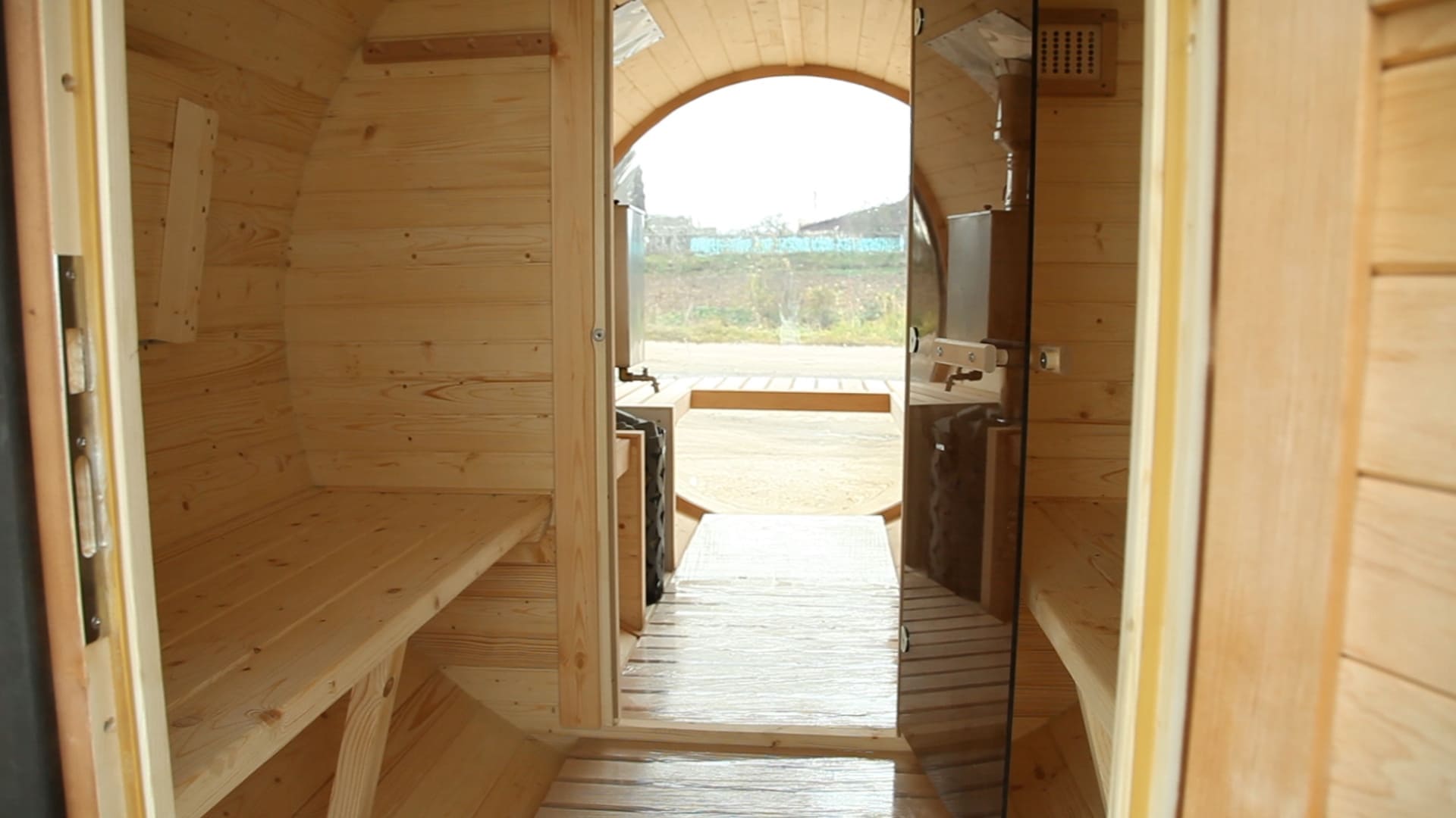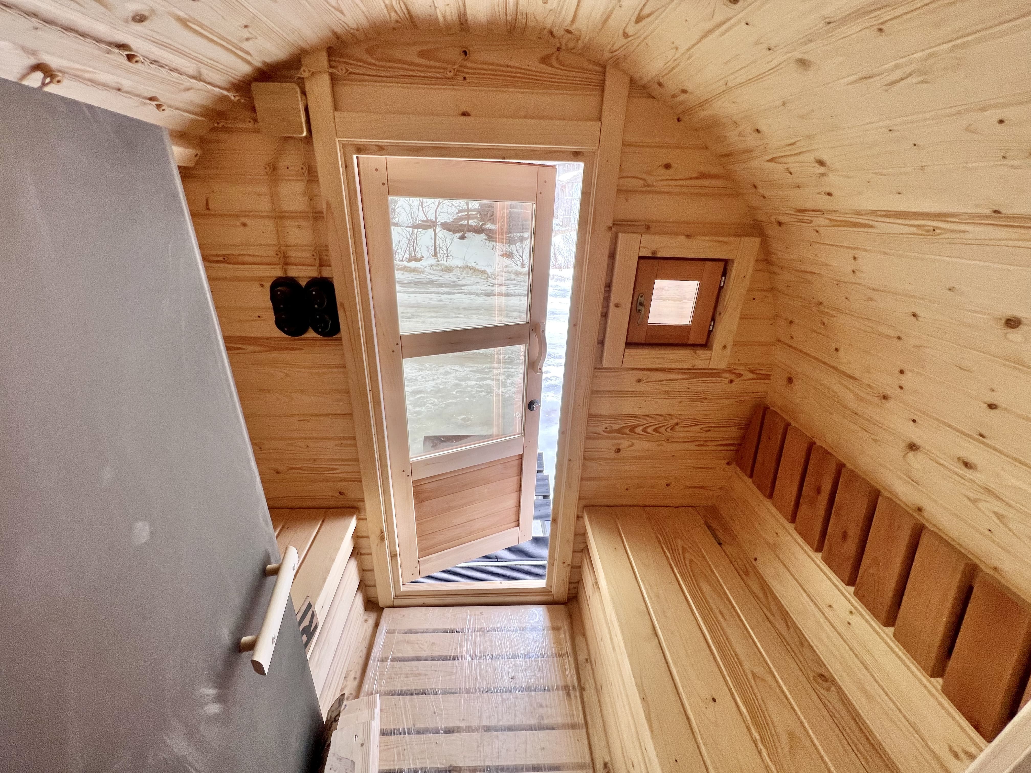 Панорамное выпуклое окно расположено в парной и создаёт ощущение открытого пространства. Во время парения открывается обзор на участок или природную локацию. Козырёк защищает вход от осадков и делает использование удобным в любую погоду.