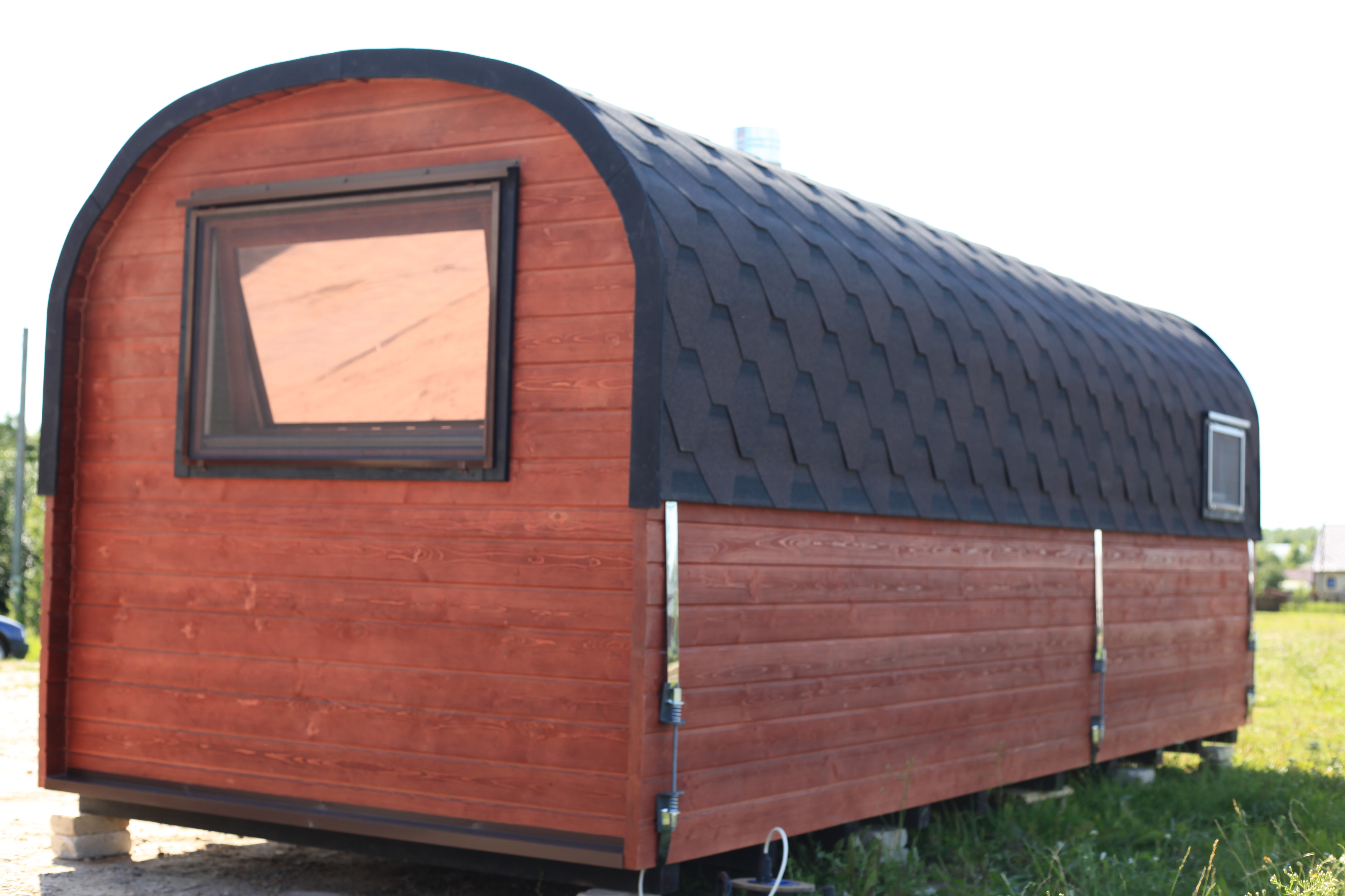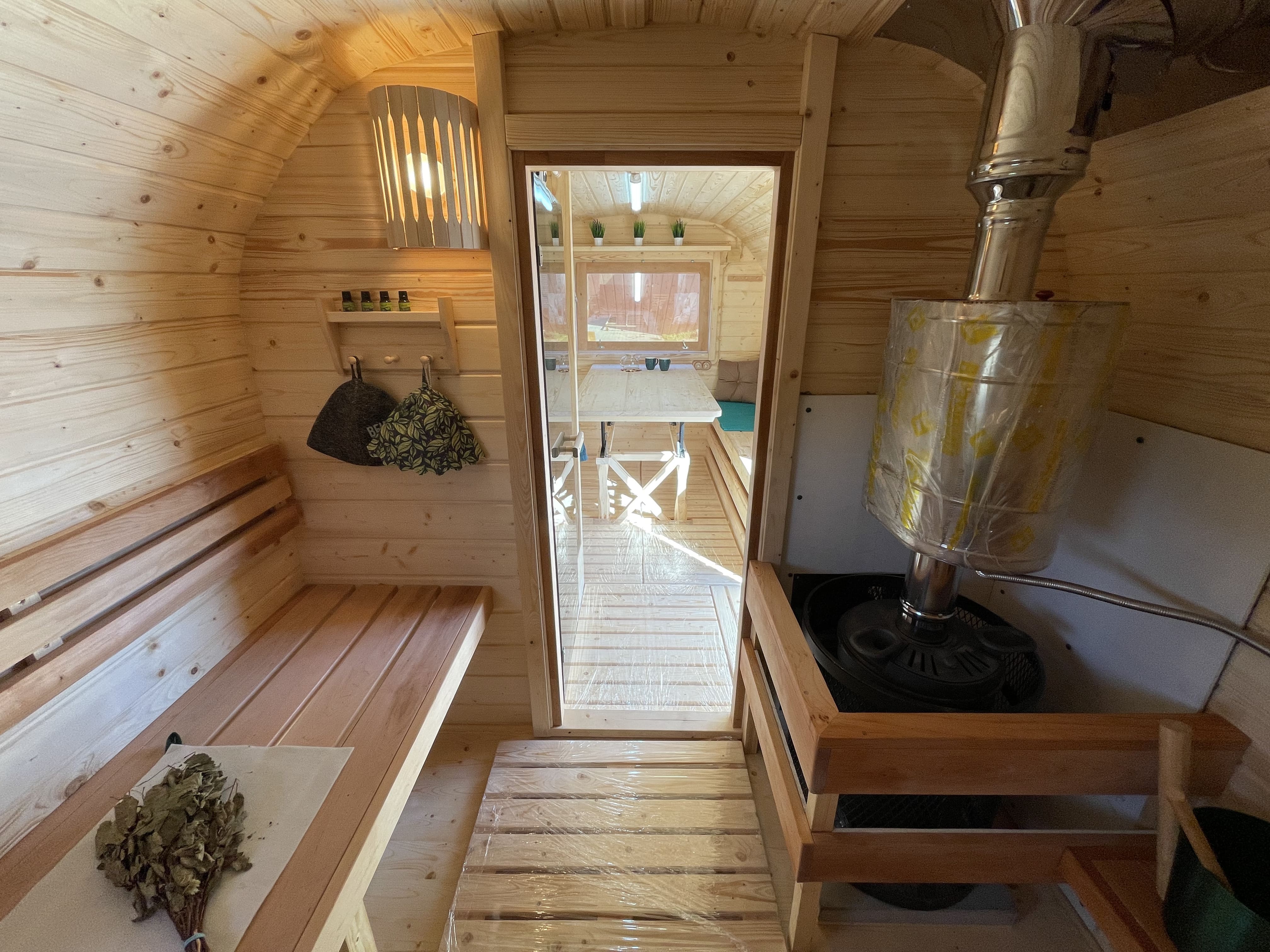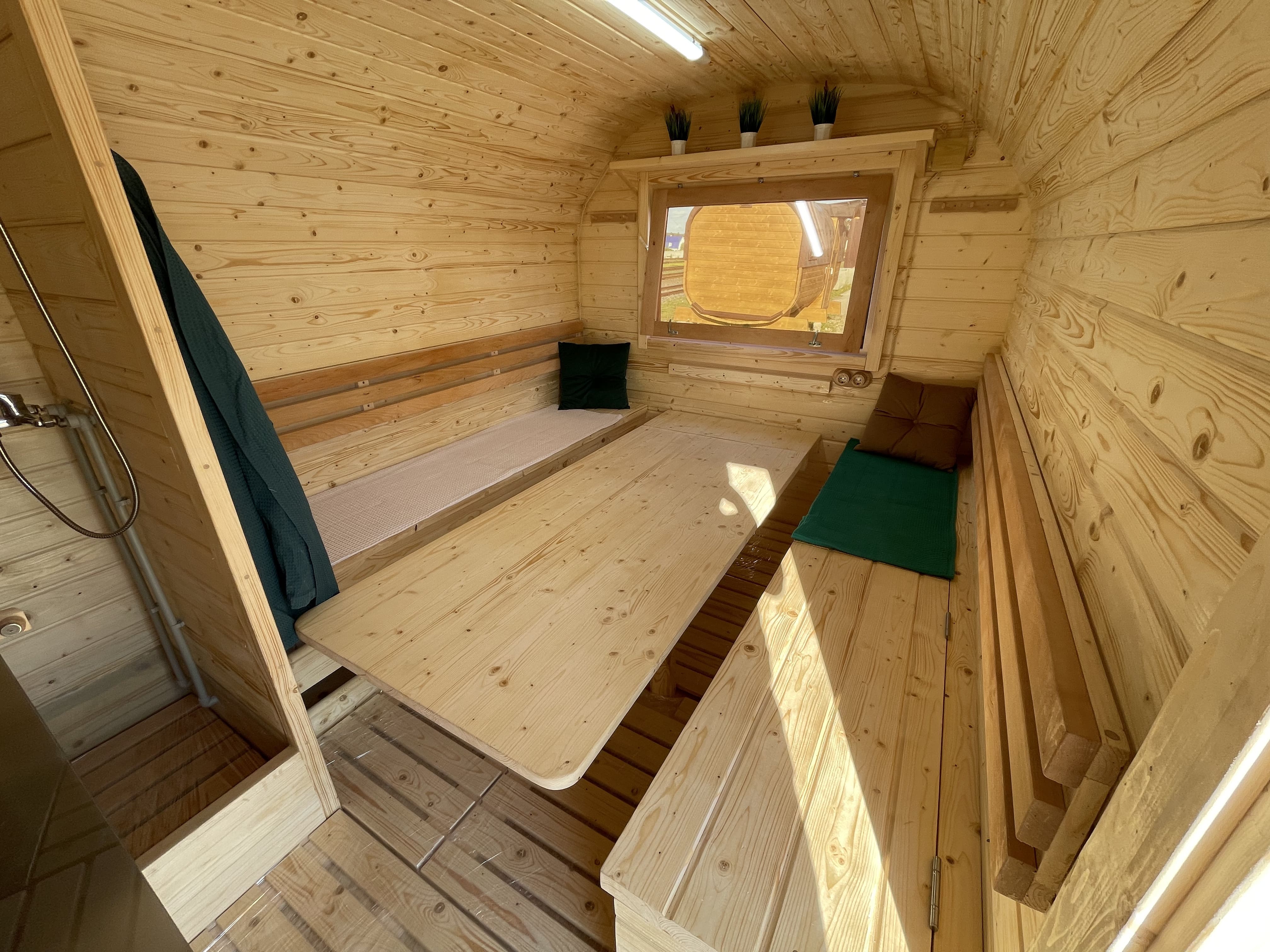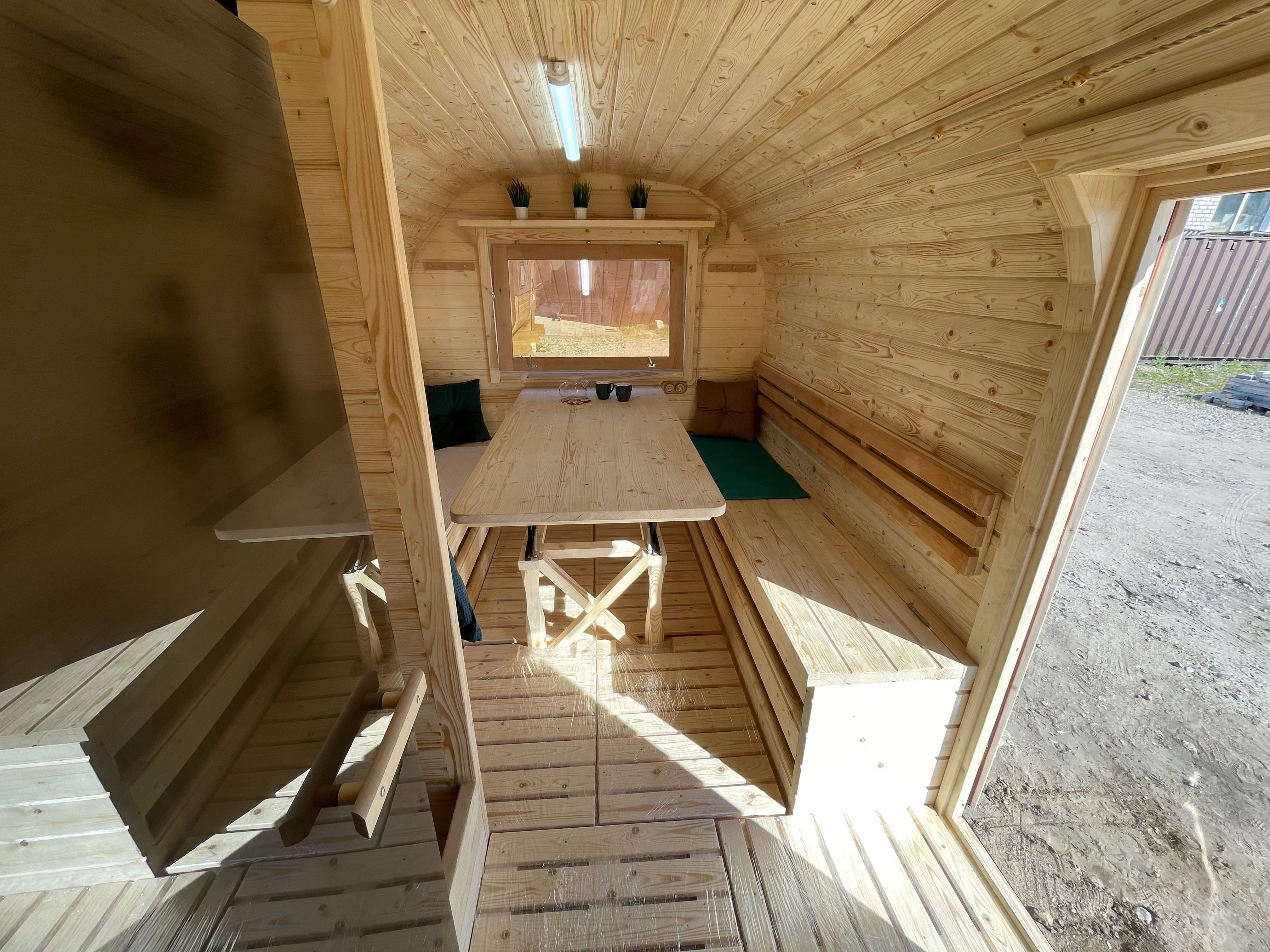 Комната отдыха: Стол трансформер. Скамейки с подъемными крышками и ящиками для хранения. Две спинки над скамейками. Поддон из стеклопластика и шторка, смеситель и лейка. Бойлер на 50 л (горизонтальный). Ввод воды под быстросъем (краник, трубы, быстросъем). Дополнительно полка над окном.
