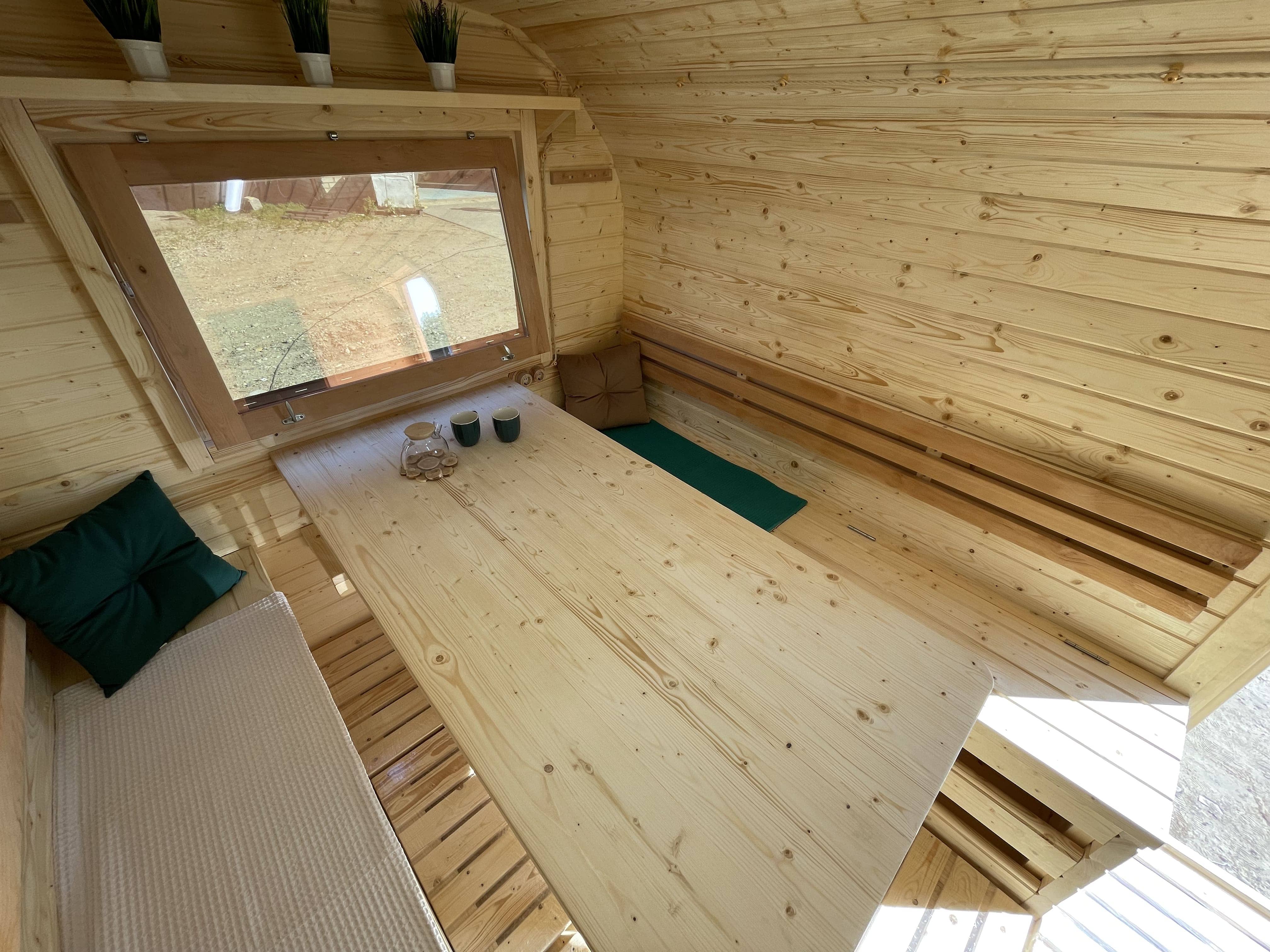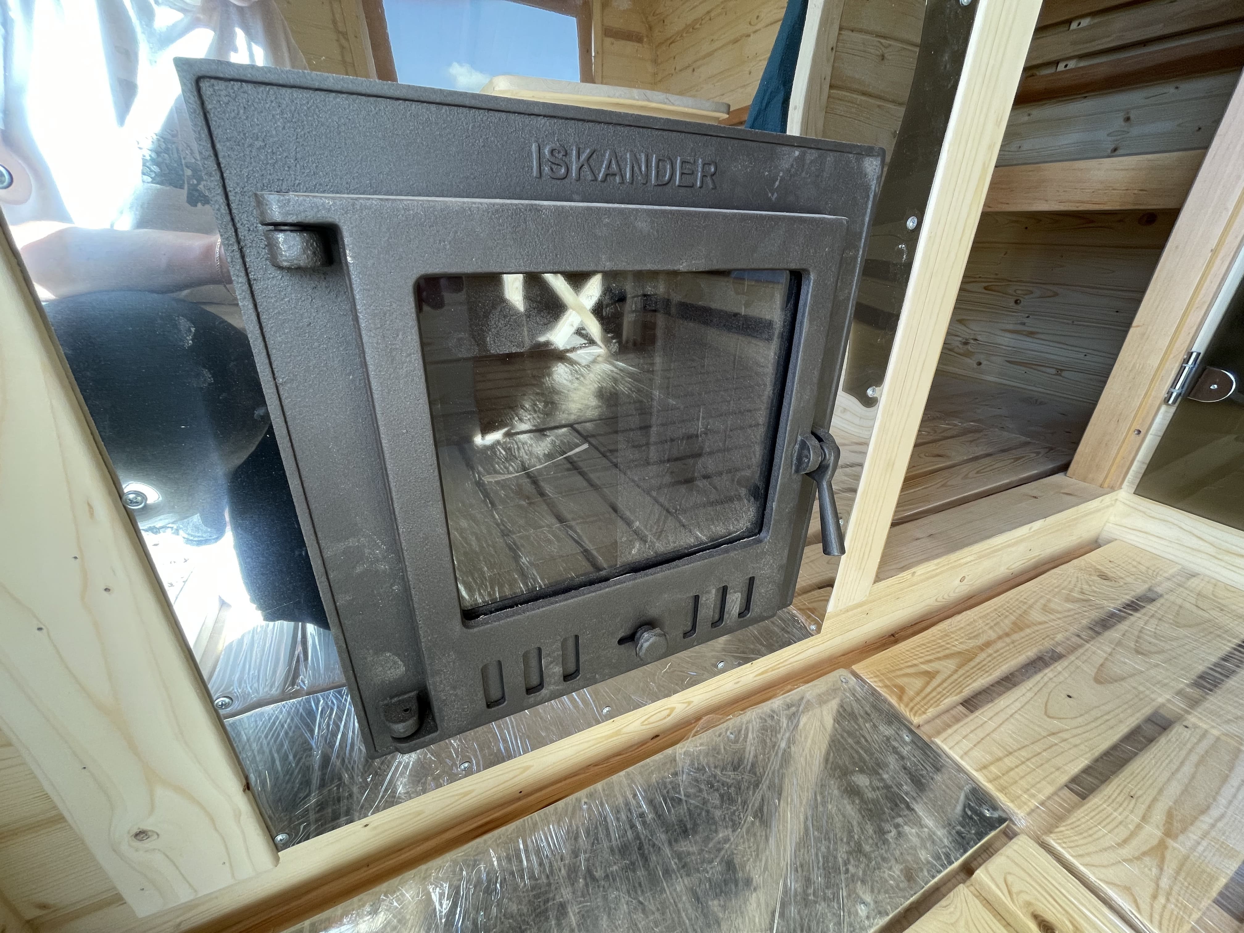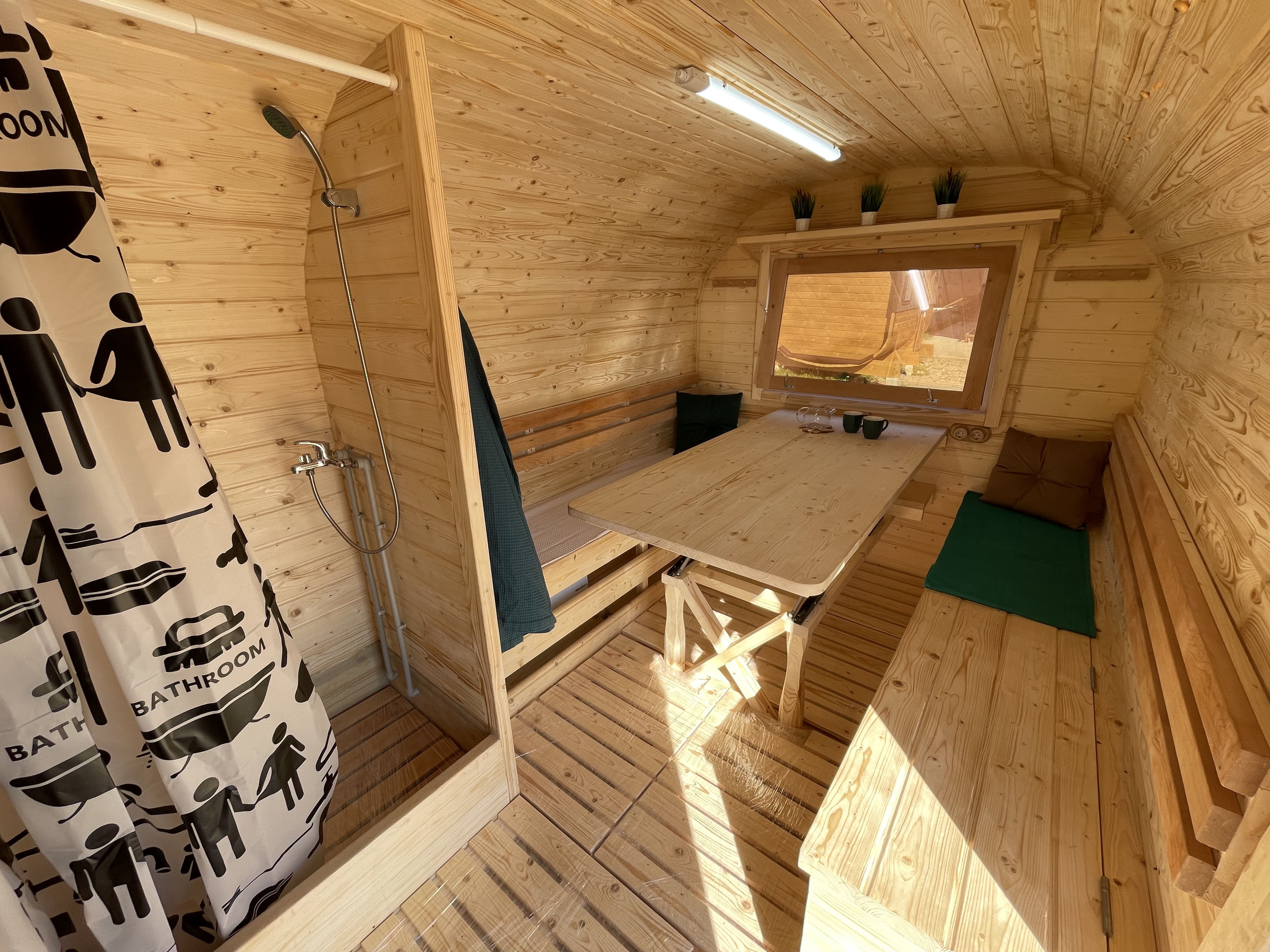 Комната отдыха: Стол трансформер. Скамейки с подъемными крышками и ящиками для хранения. Две спинки над скамейками. Поддон из стеклопластика и шторка, смеситель и лейка. Бойлер на 50 л (горизонтальный). Ввод воды под быстросъем (краник, трубы, быстросъем). Дополнительно полка над окном.