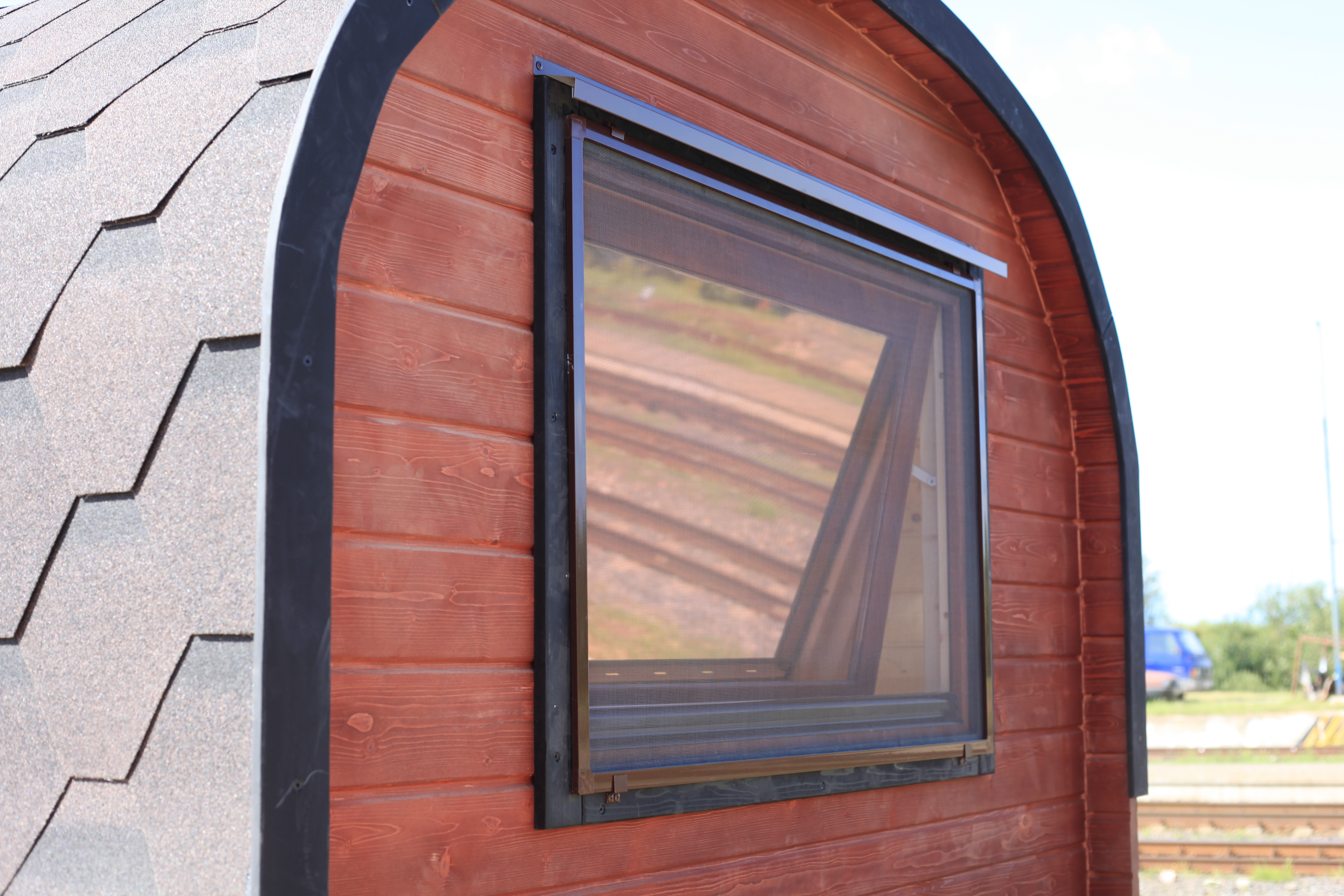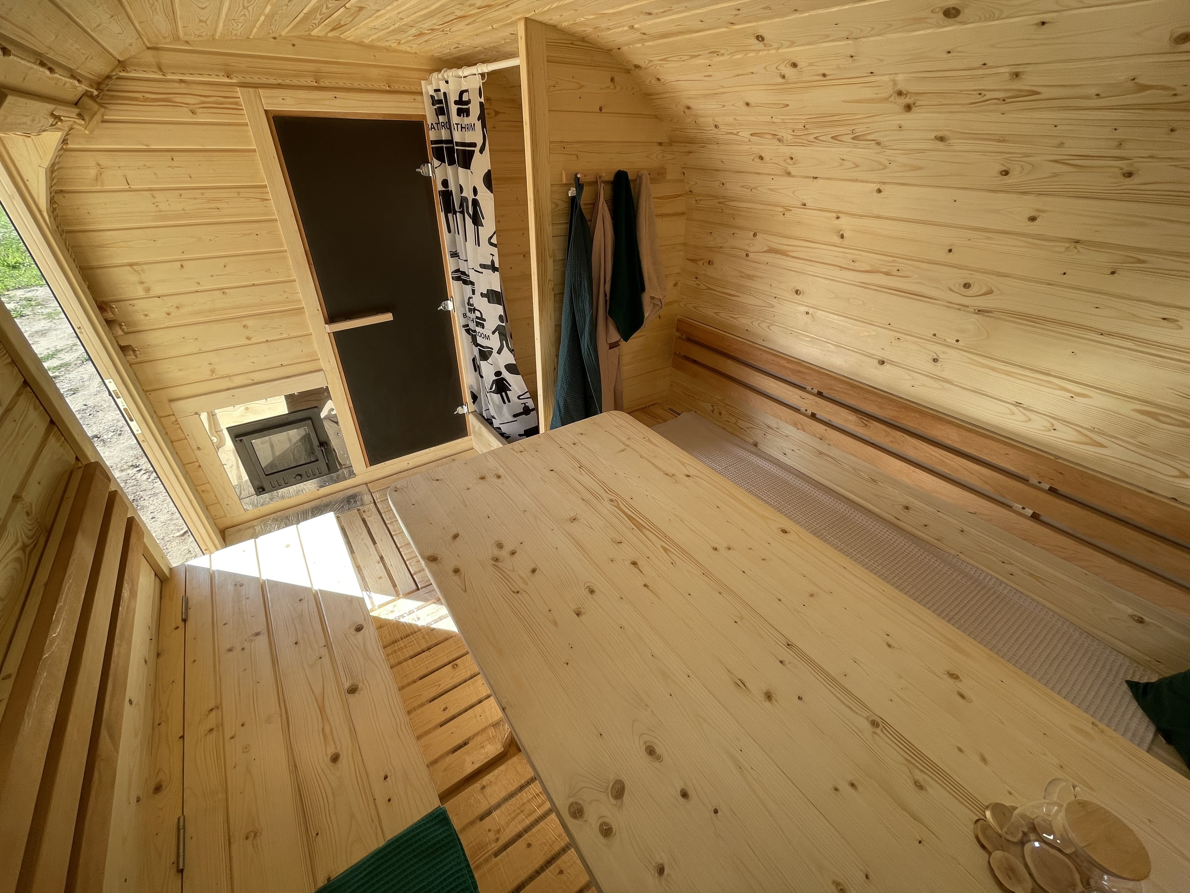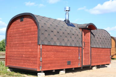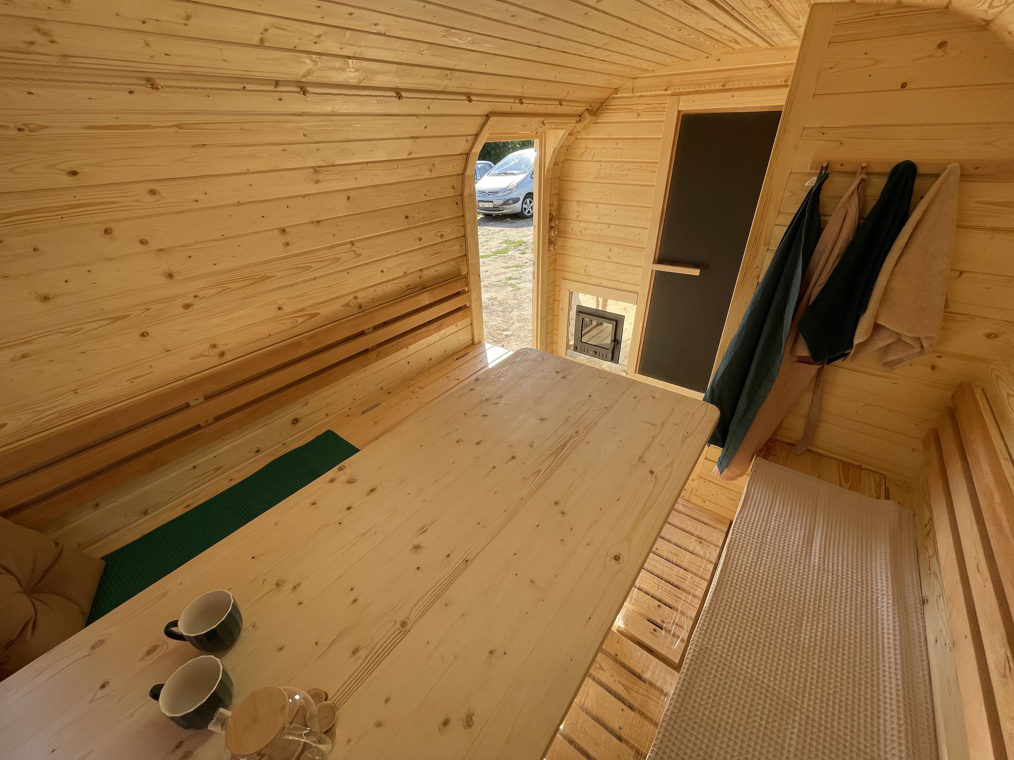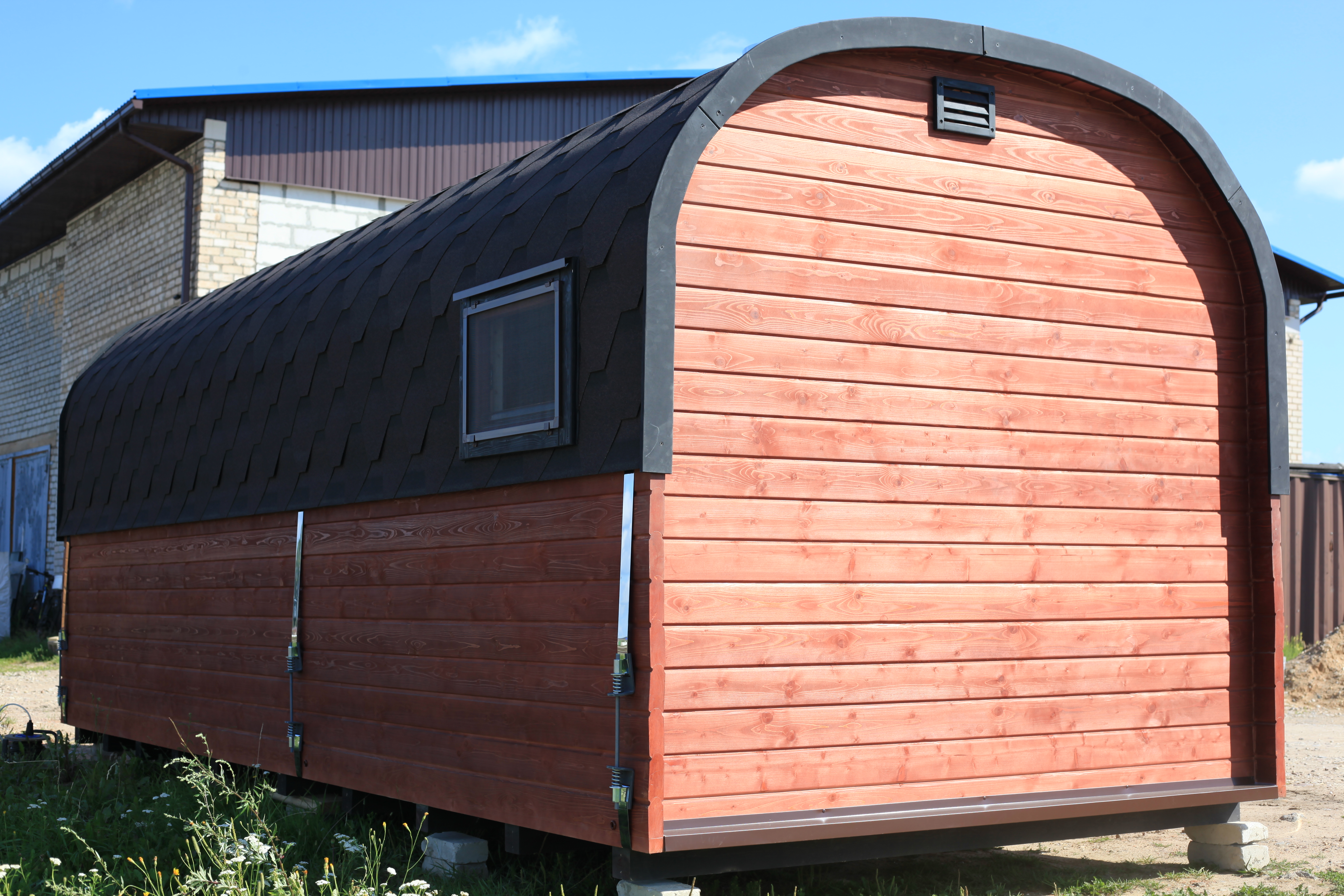 Комната отдыха: Стол трансформер. Скамейки с подъемными крышками и ящиками для хранения. Две спинки над скамейками. Поддон из стеклопластика и шторка, смеситель и лейка. Бойлер на 50 л (горизонтальный). Ввод воды под быстросъем (краник, трубы, быстросъем). Дополнительно полка над окном.