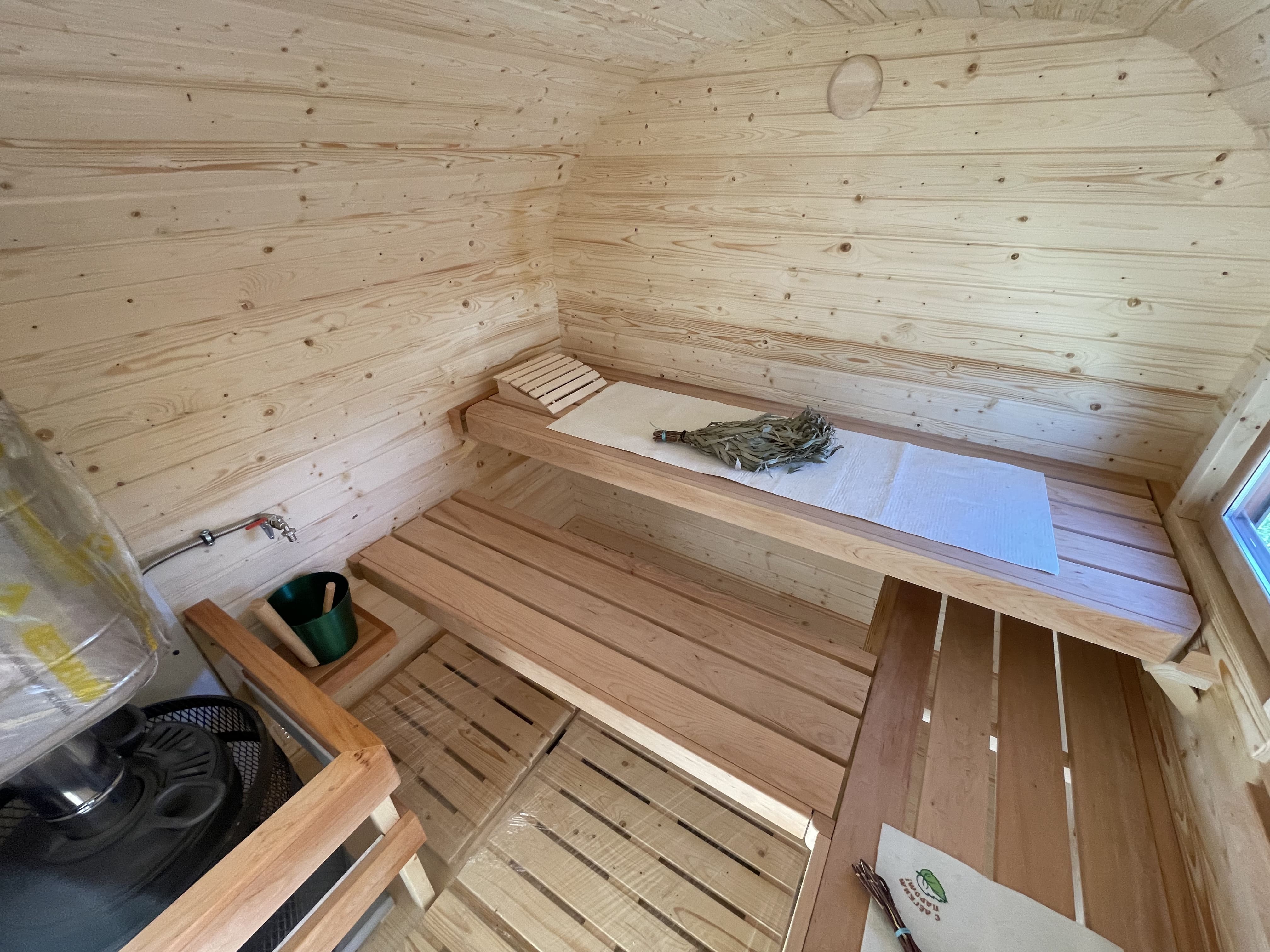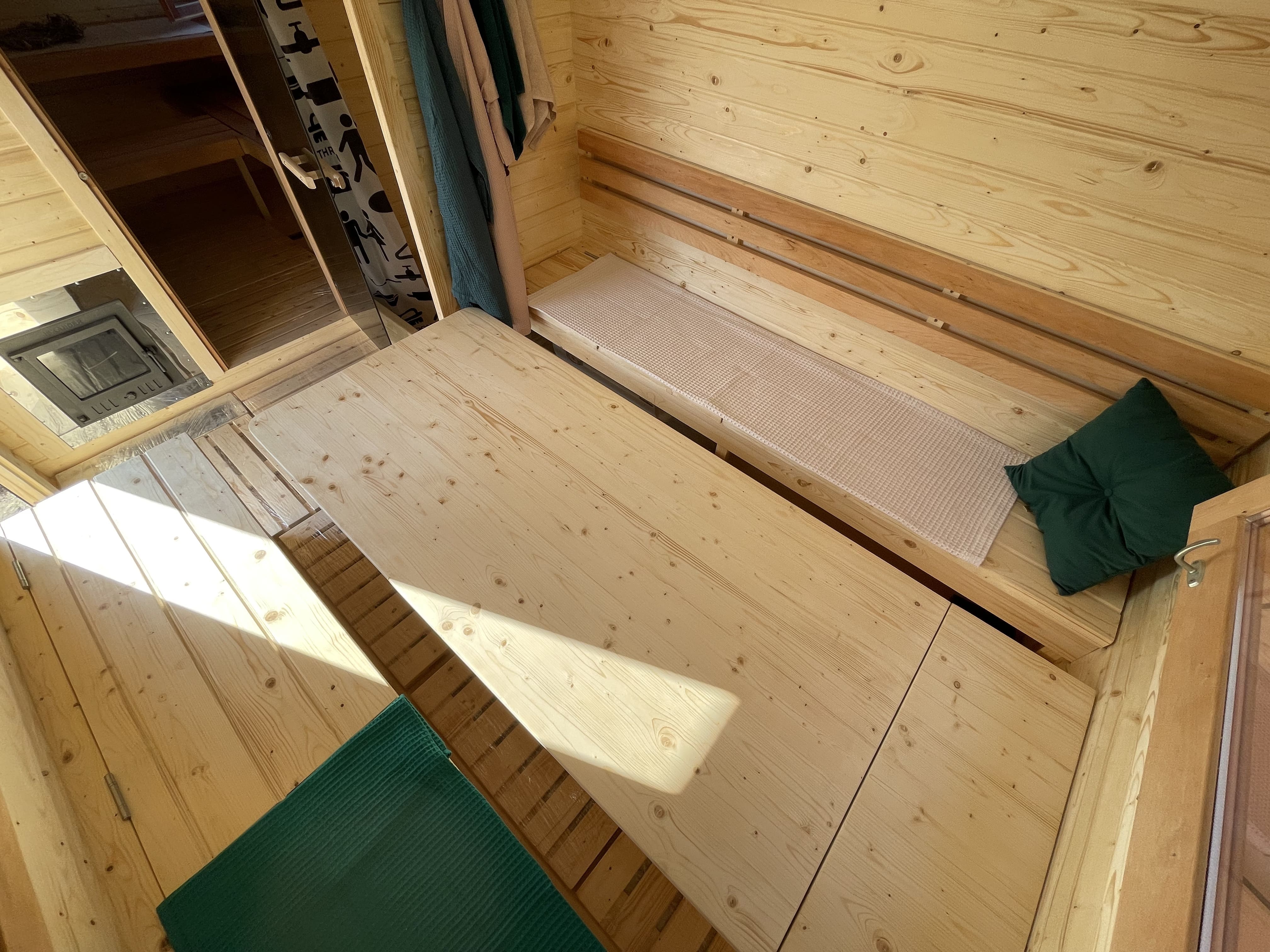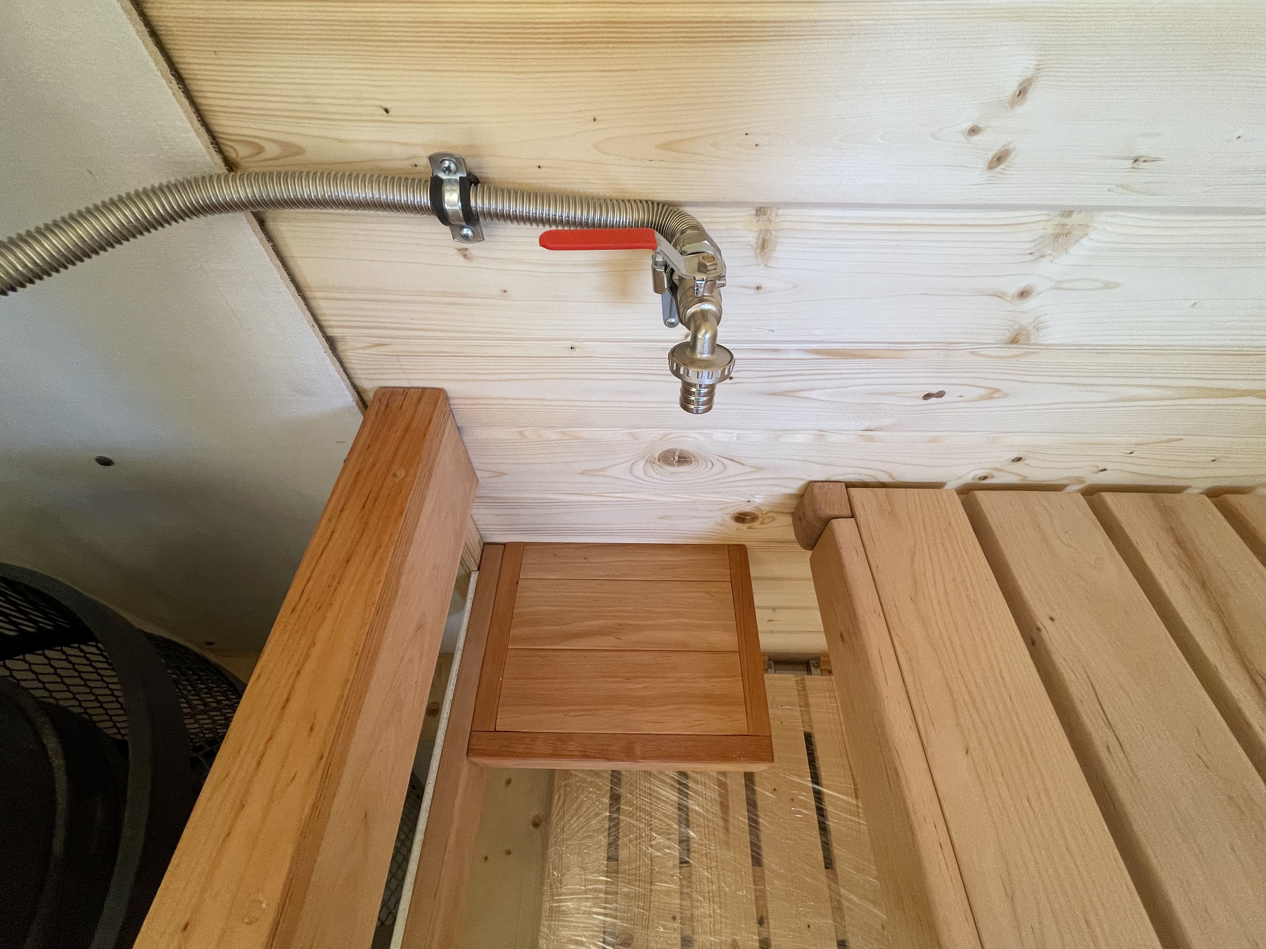 Парная: Двойной пол с уклоном с желобом из нержавеющей стали. Дополнительный полок выдвижной. Верхний полок откидной без спинки. Вентклапан регулируется путем откручивания. Защита вокруг печи. Полочка под запарник.