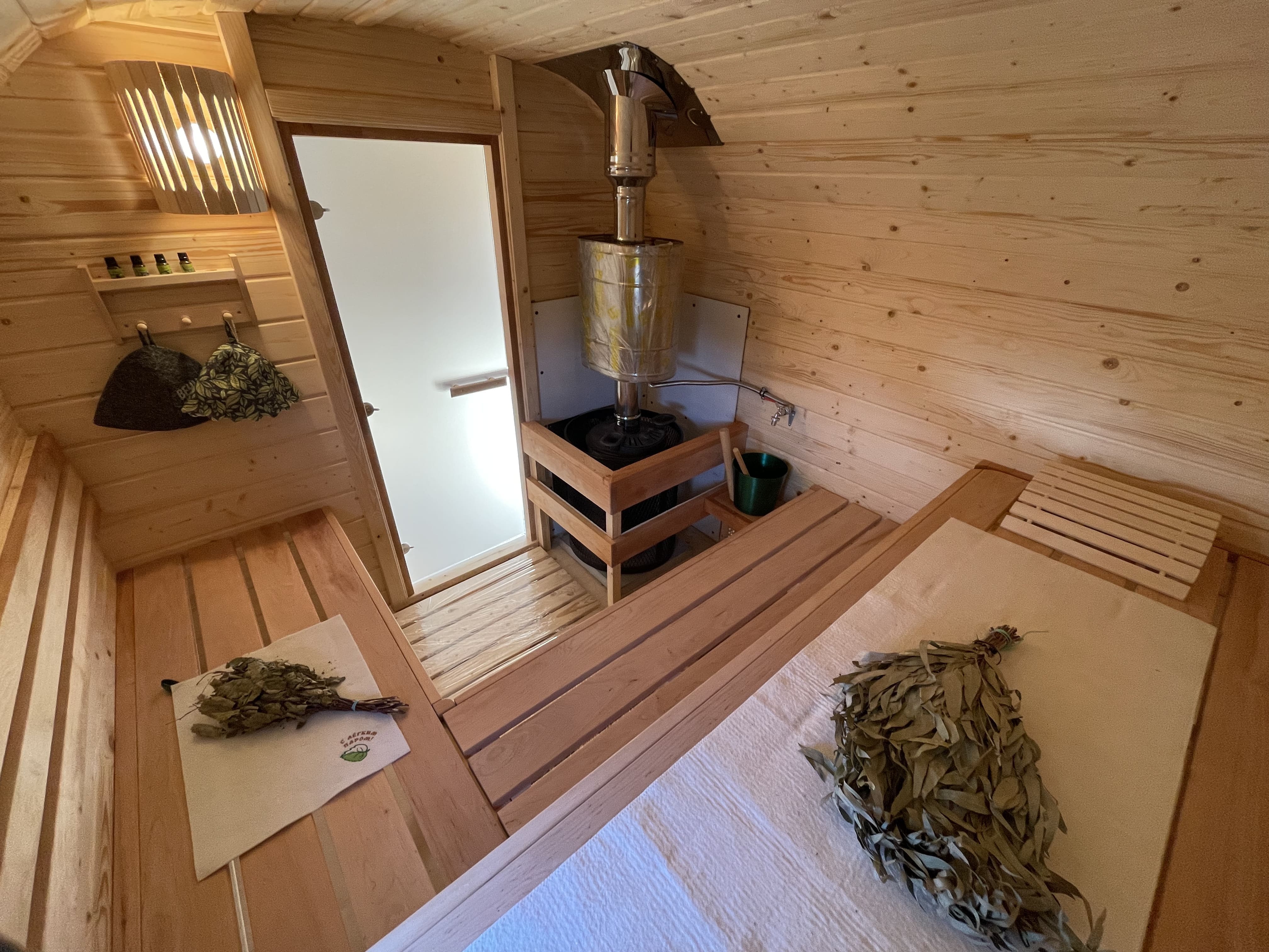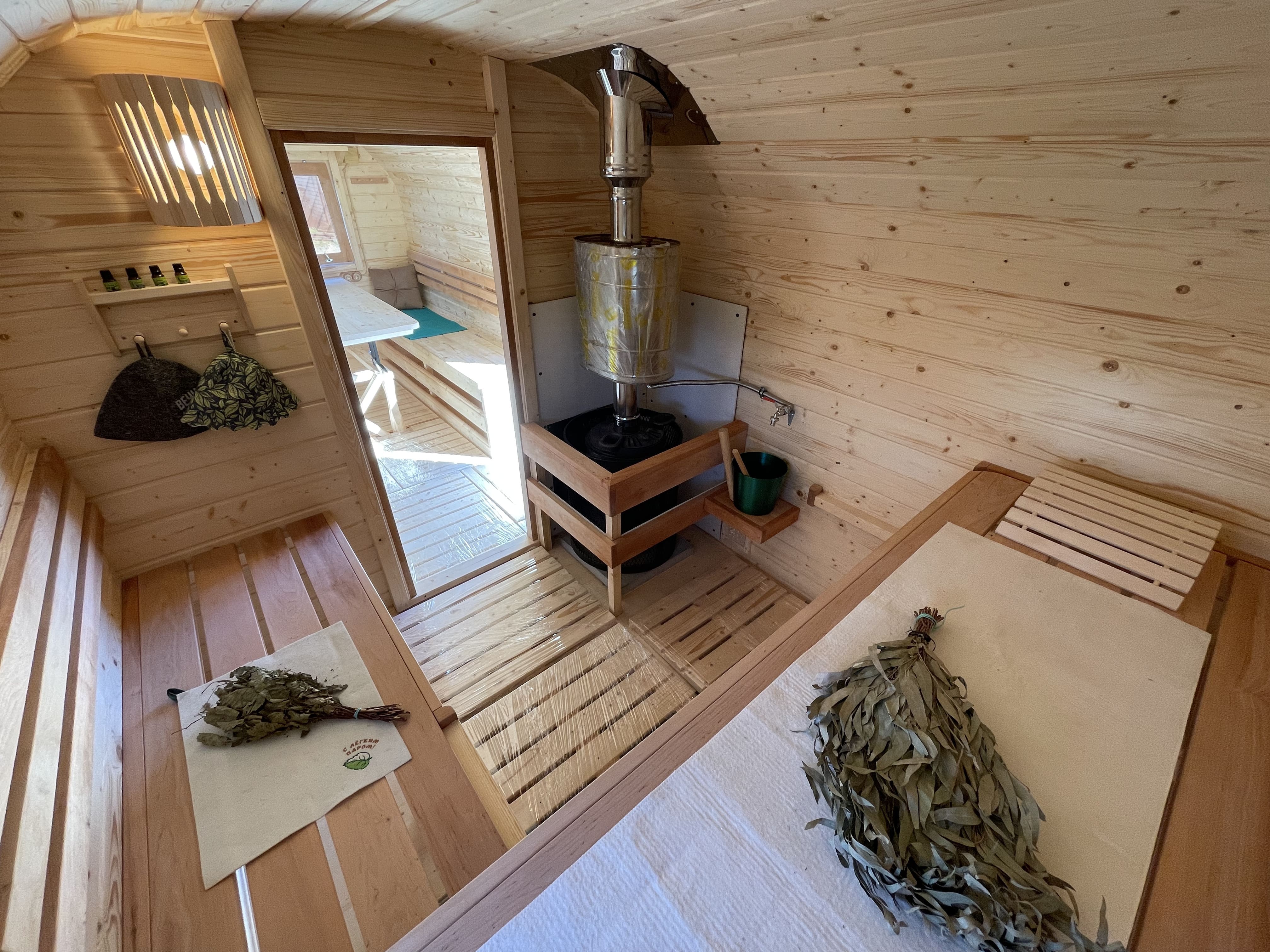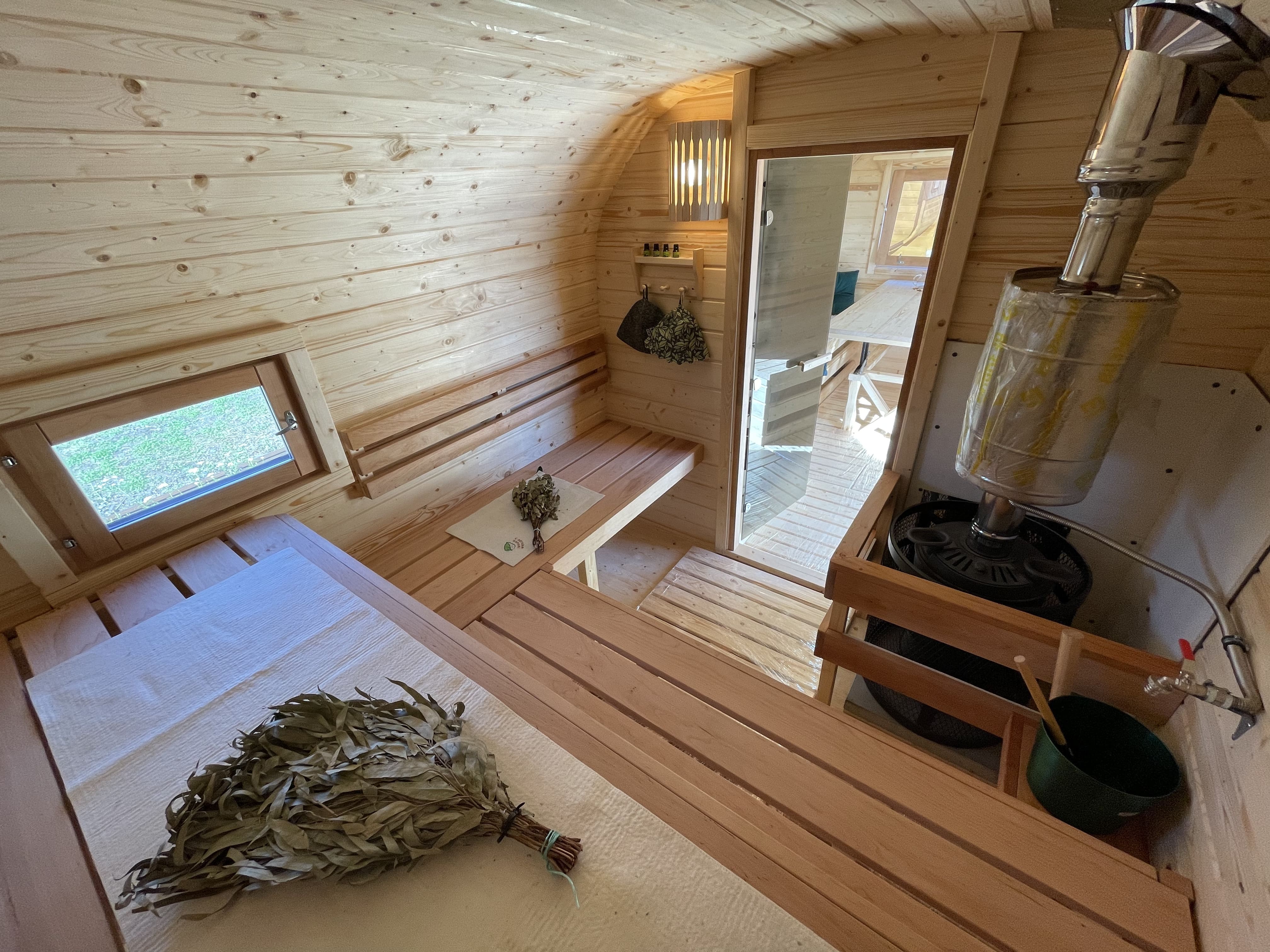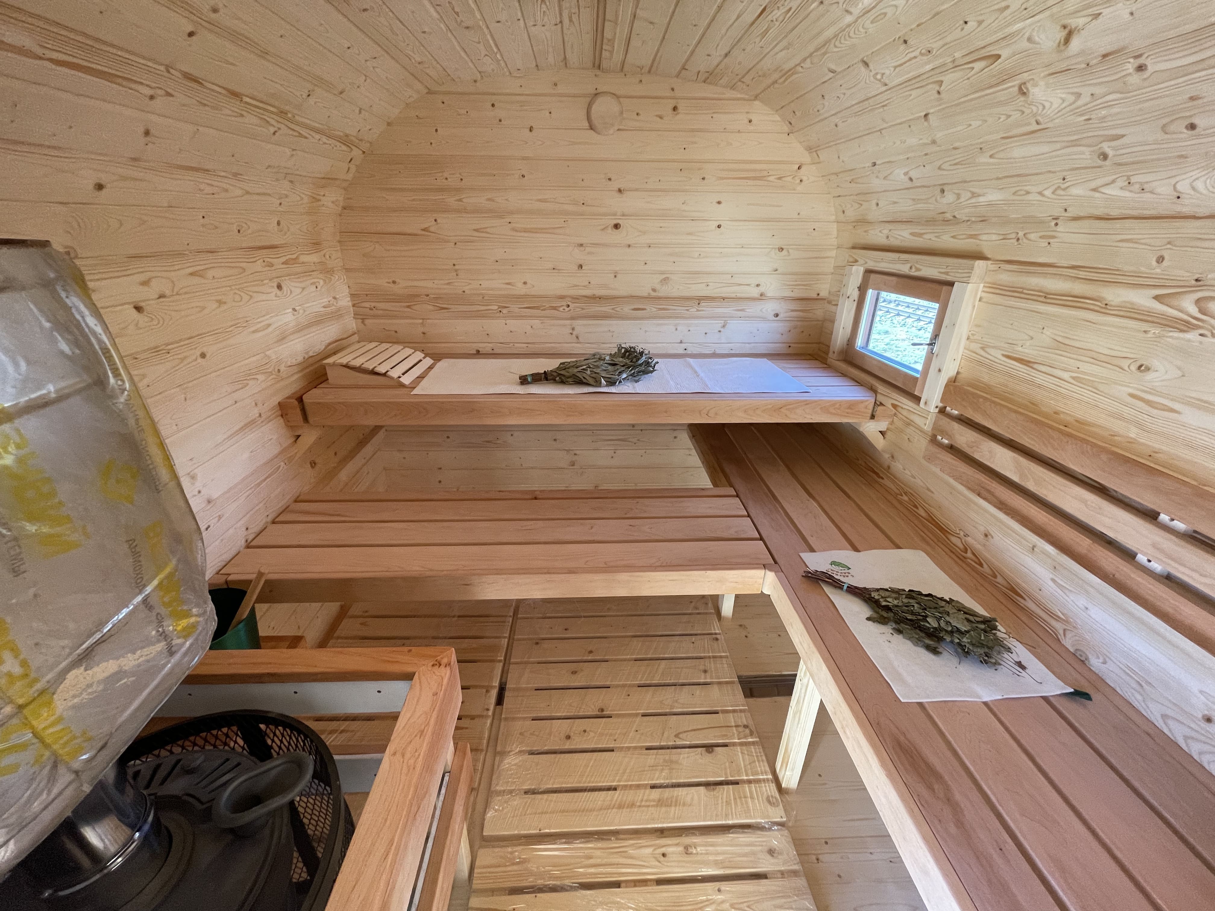 Парная: Двойной пол с уклоном с желобом из нержавеющей стали. Дополнительный полок выдвижной. Верхний полок откидной без спинки. Вентклапан регулируется путем откручивания. Защита вокруг печи. Полочка под запарник.