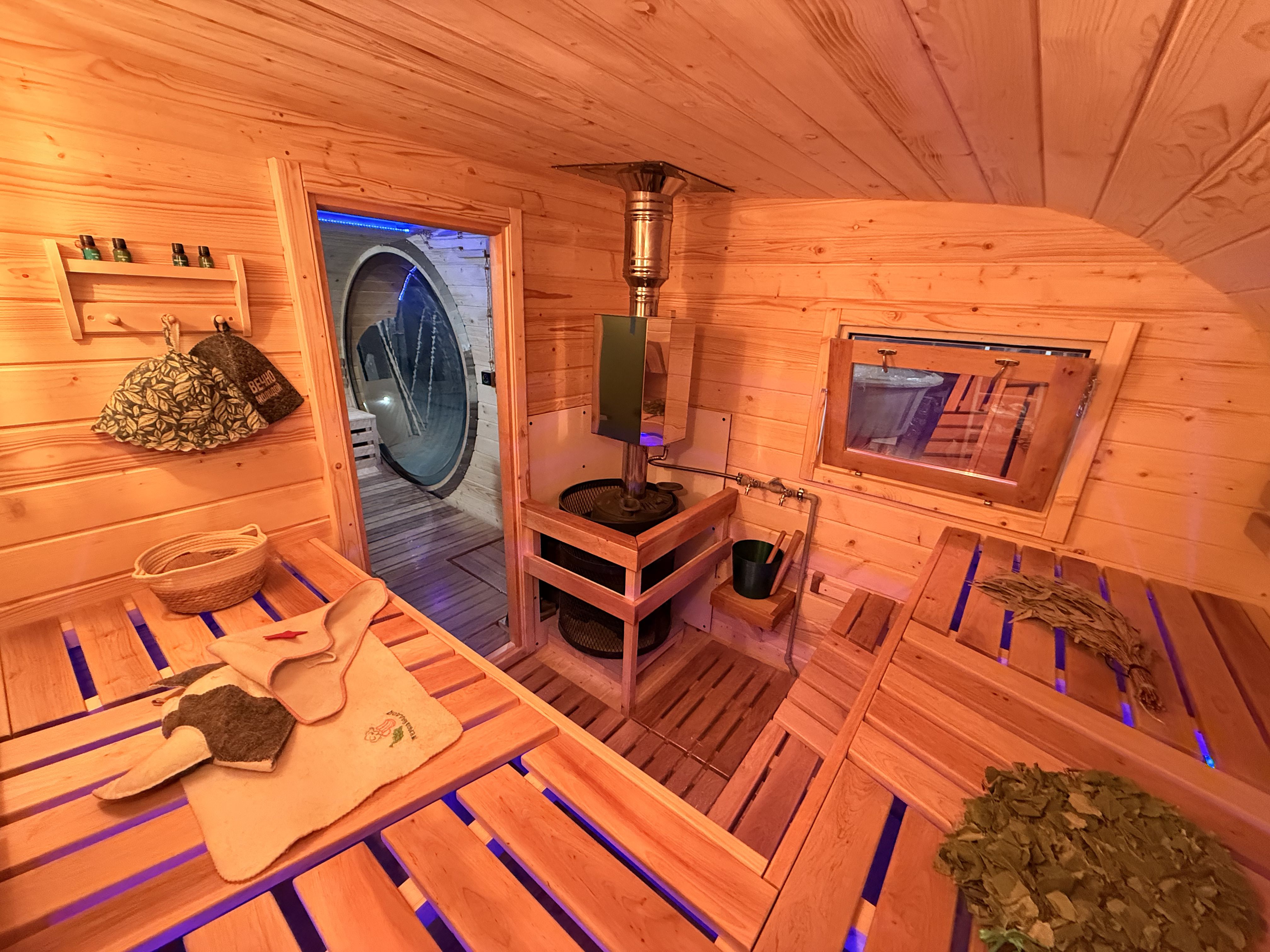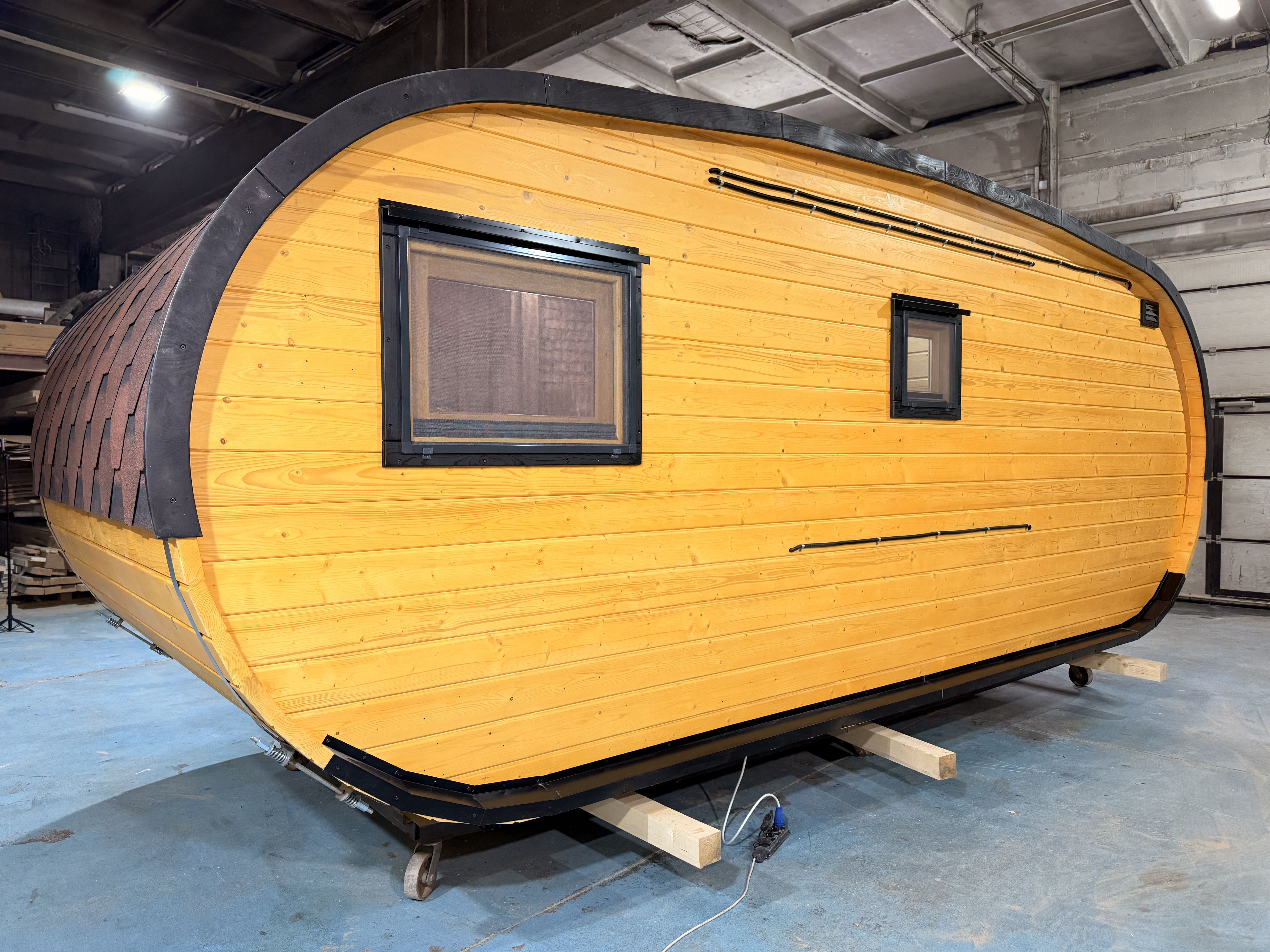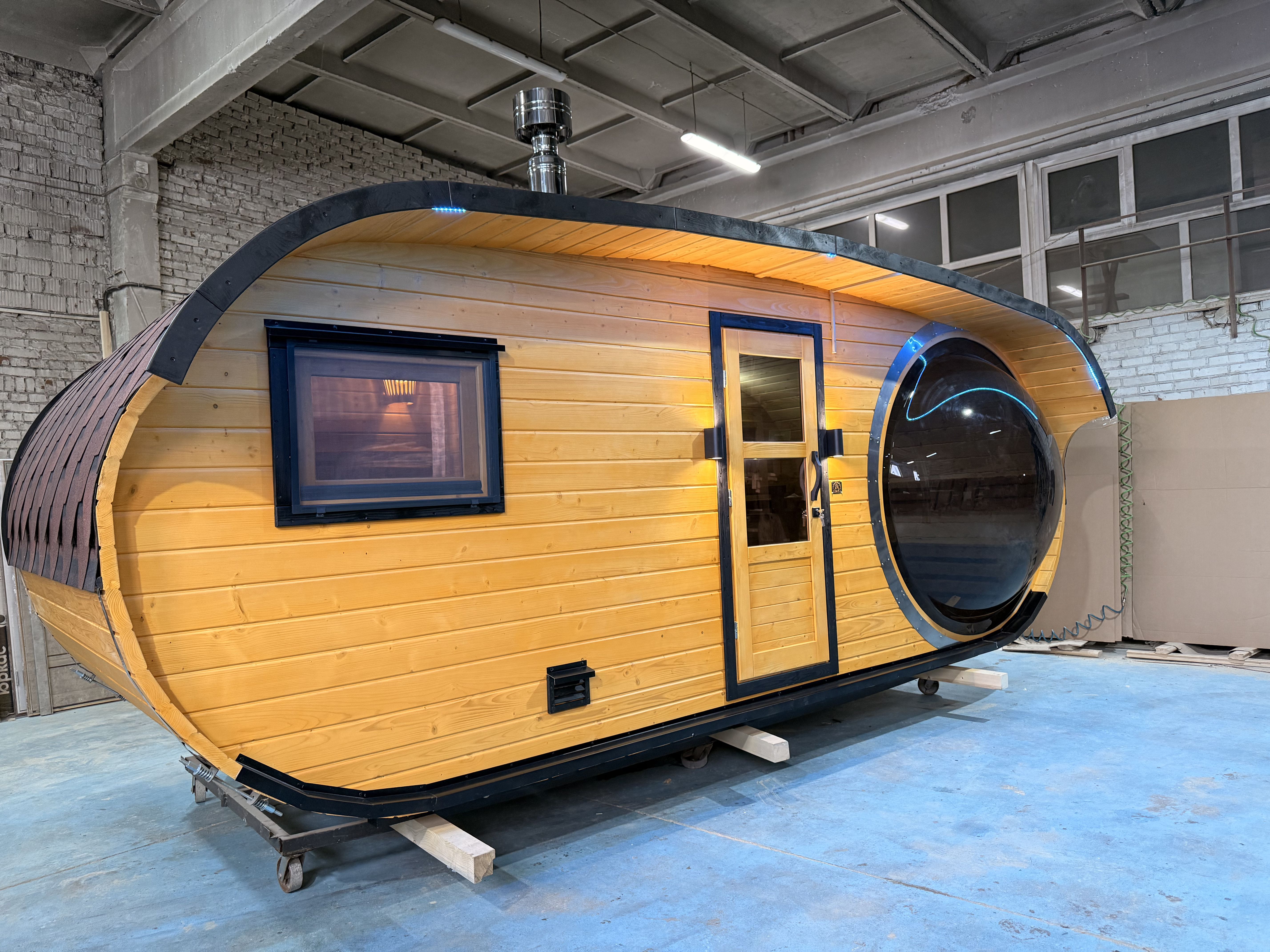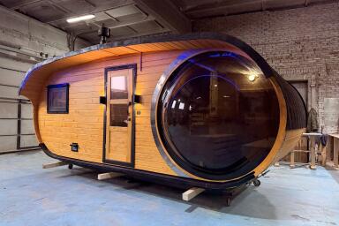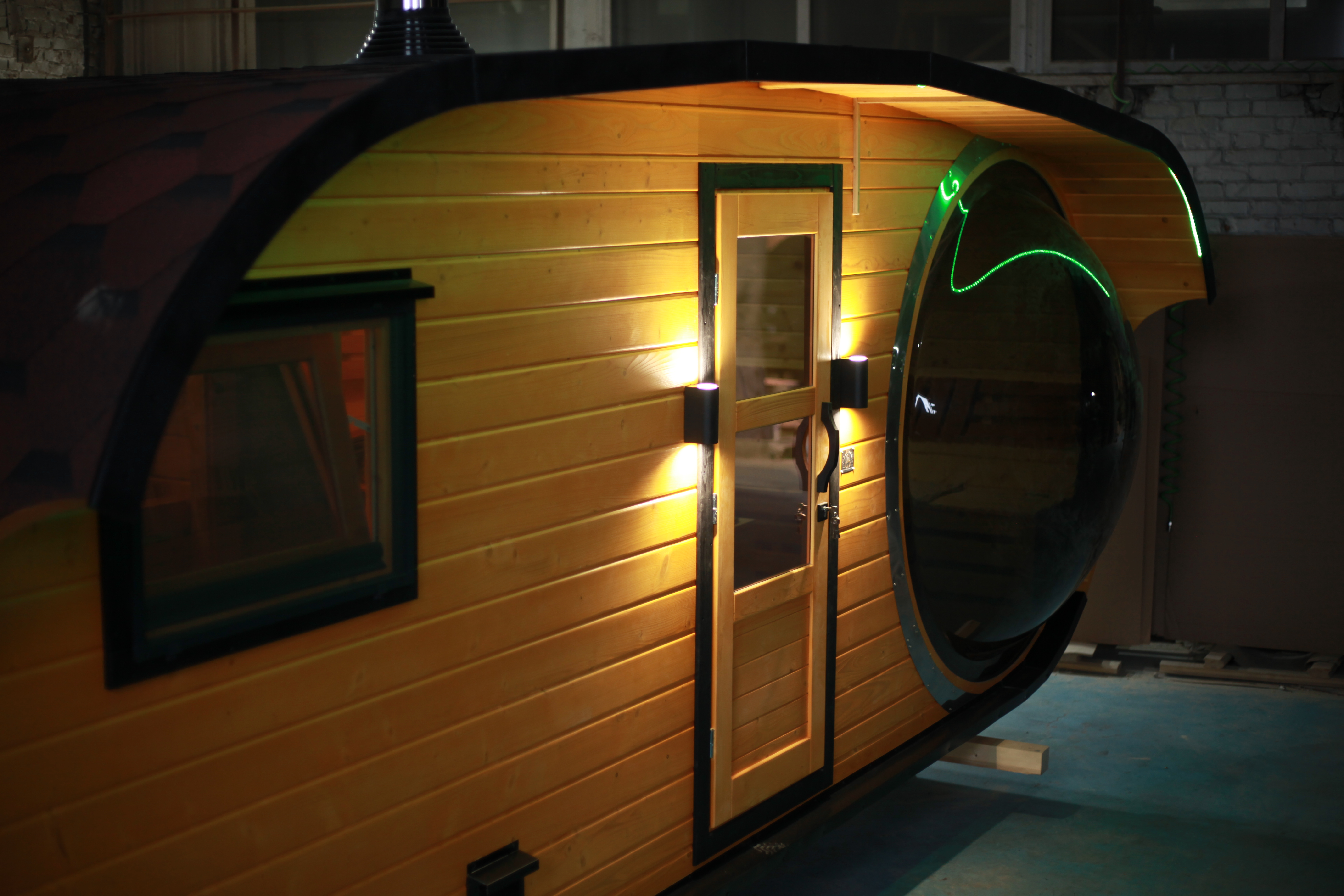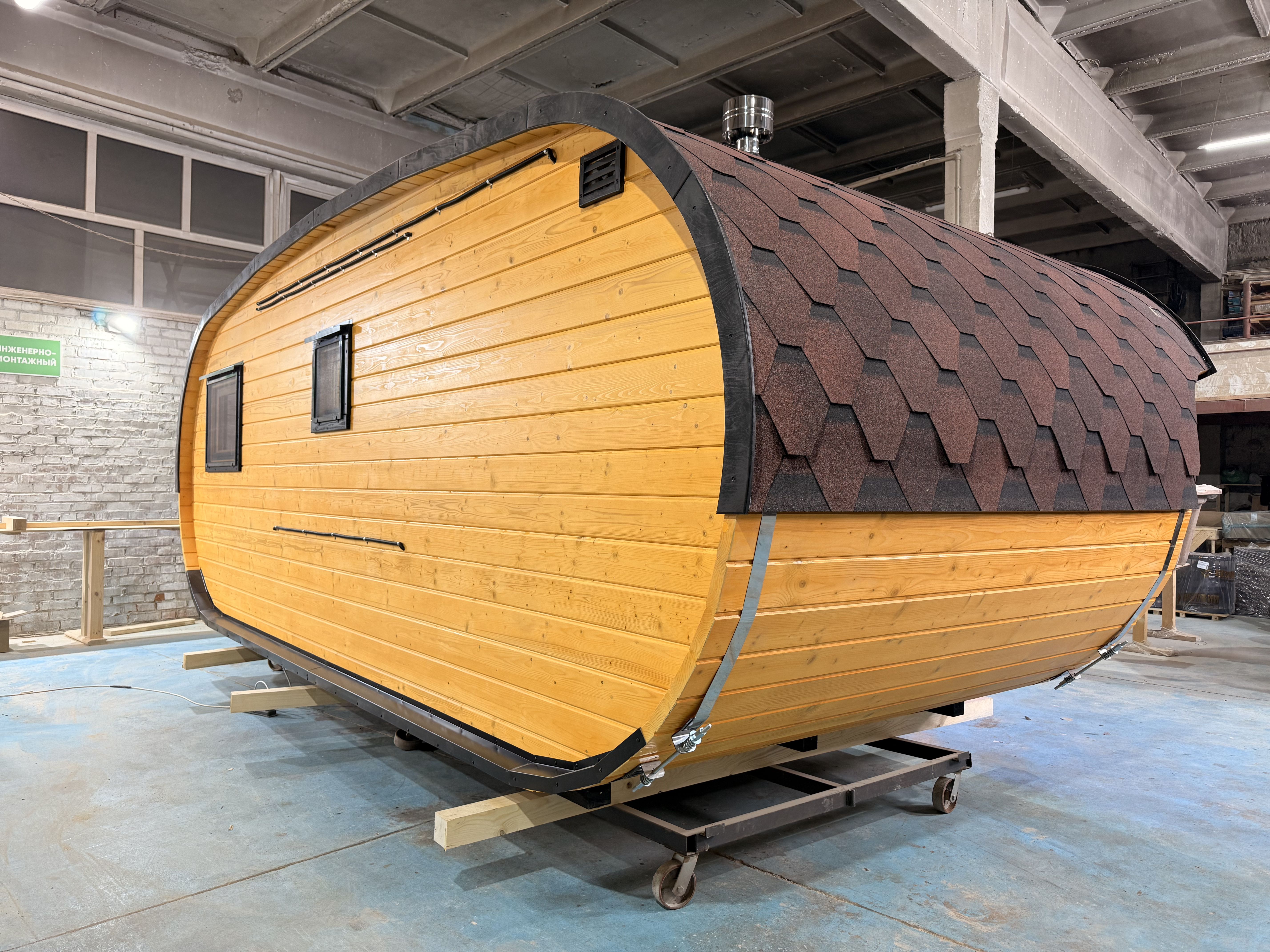 Баня овальная 3*6 метра с панорамным куполом и душевой