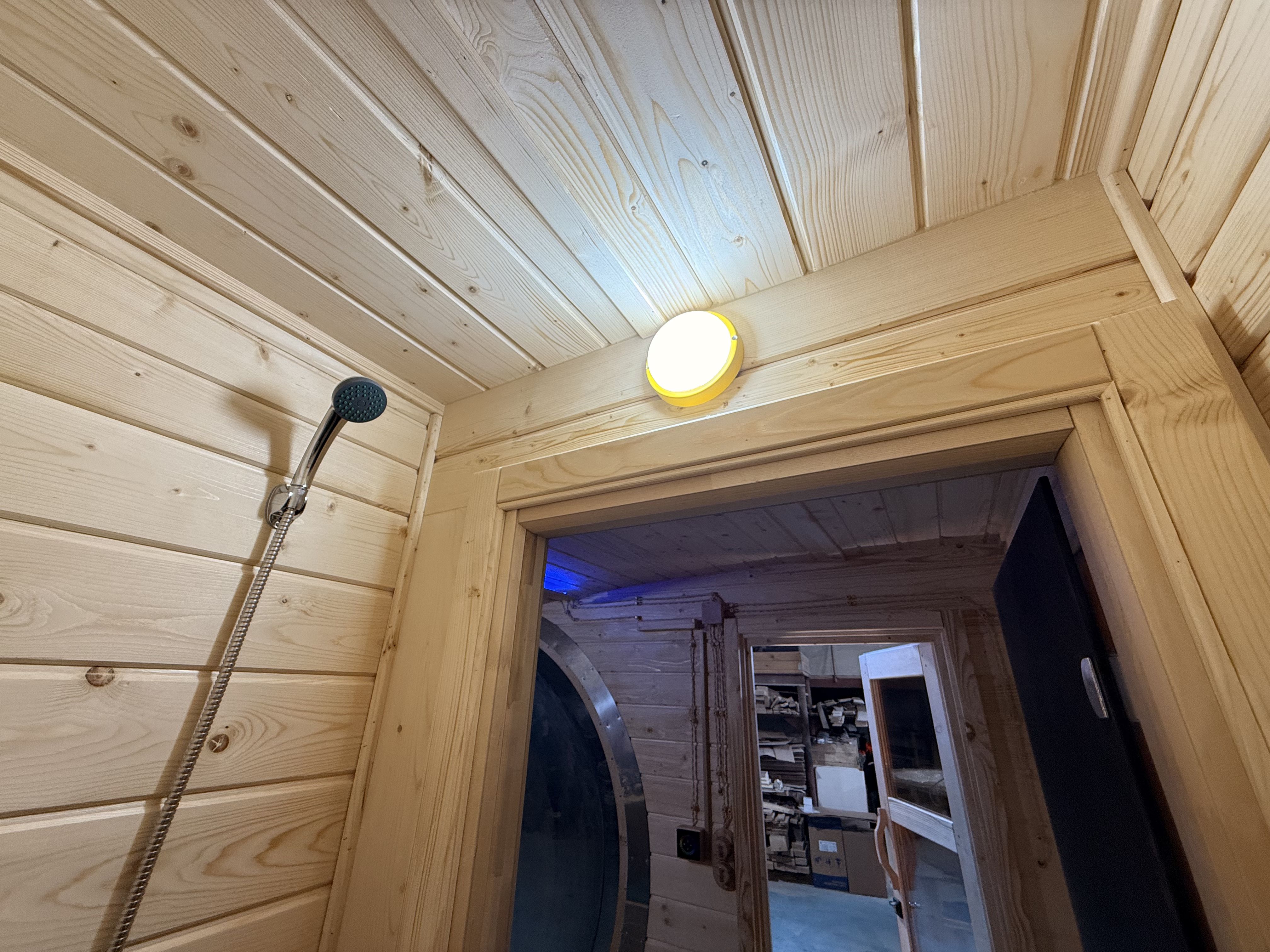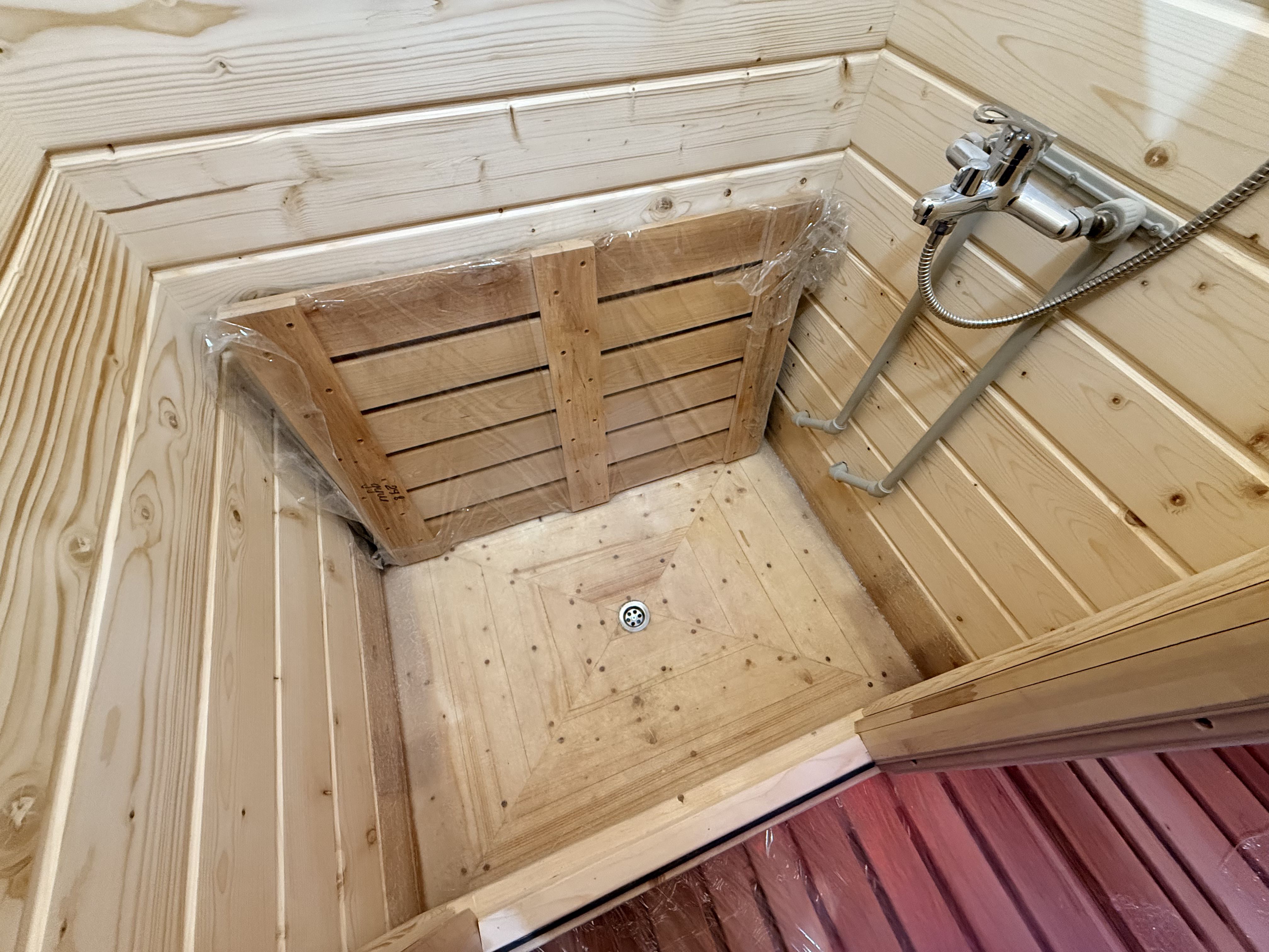 Главная / Каталог / Наши работы / Проекты овальных бань Батискаф / Баня овальная 3*6 метра с панорамным куполом и душевой