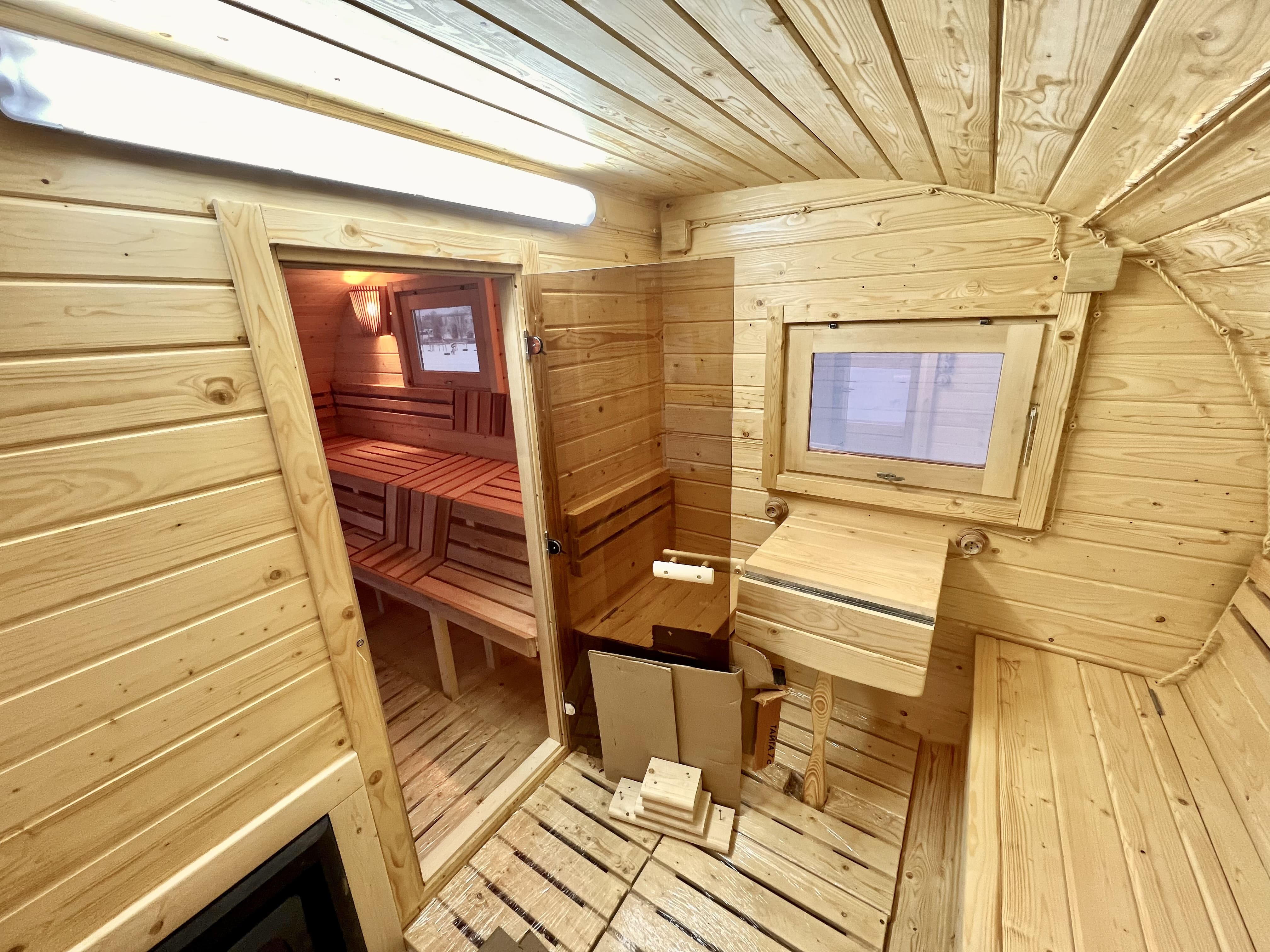 На производстве баня упаковывается и подготавливается к перевозке, после чего загружается в фуру или пятитонную машину с боковой загрузкой.