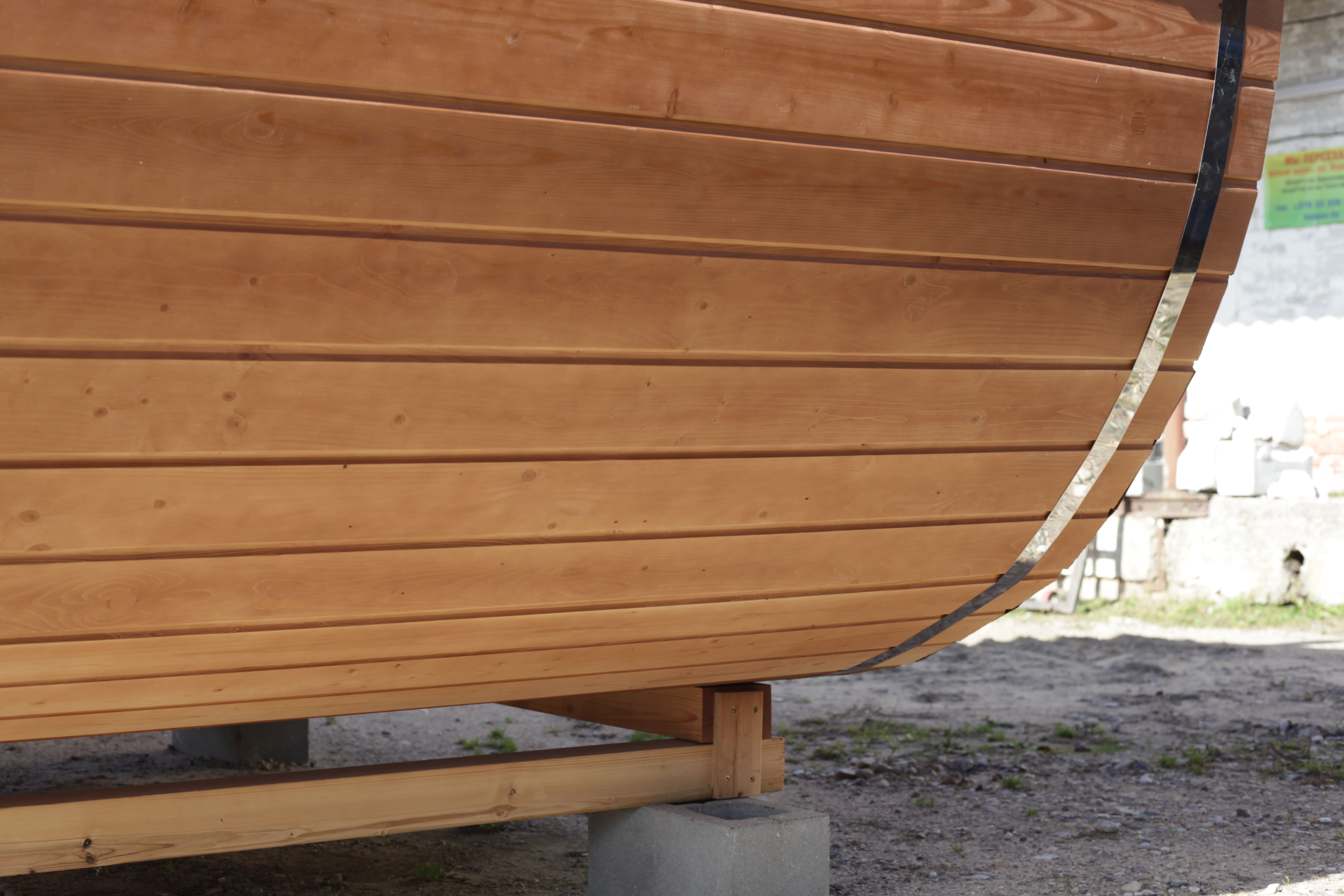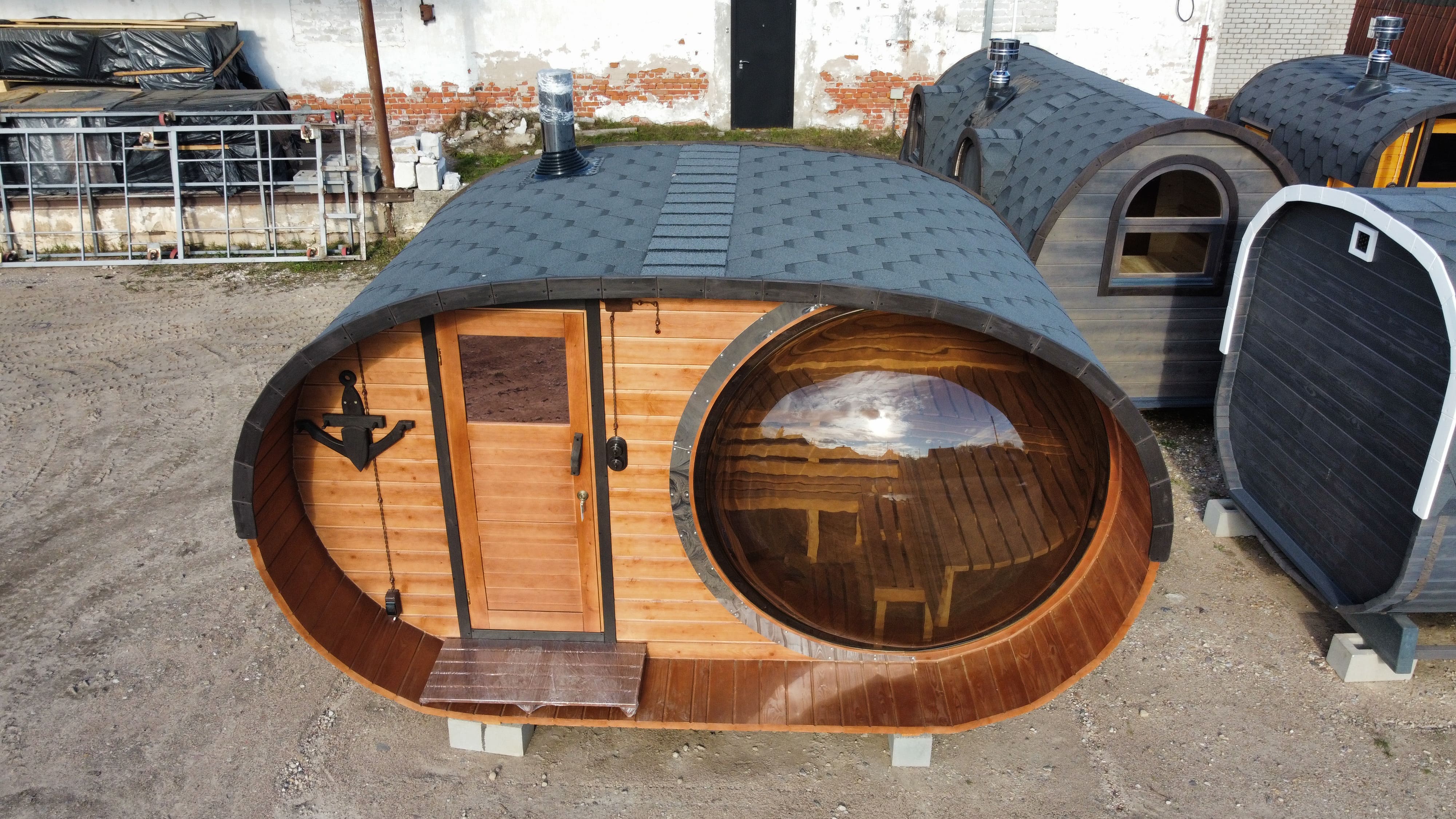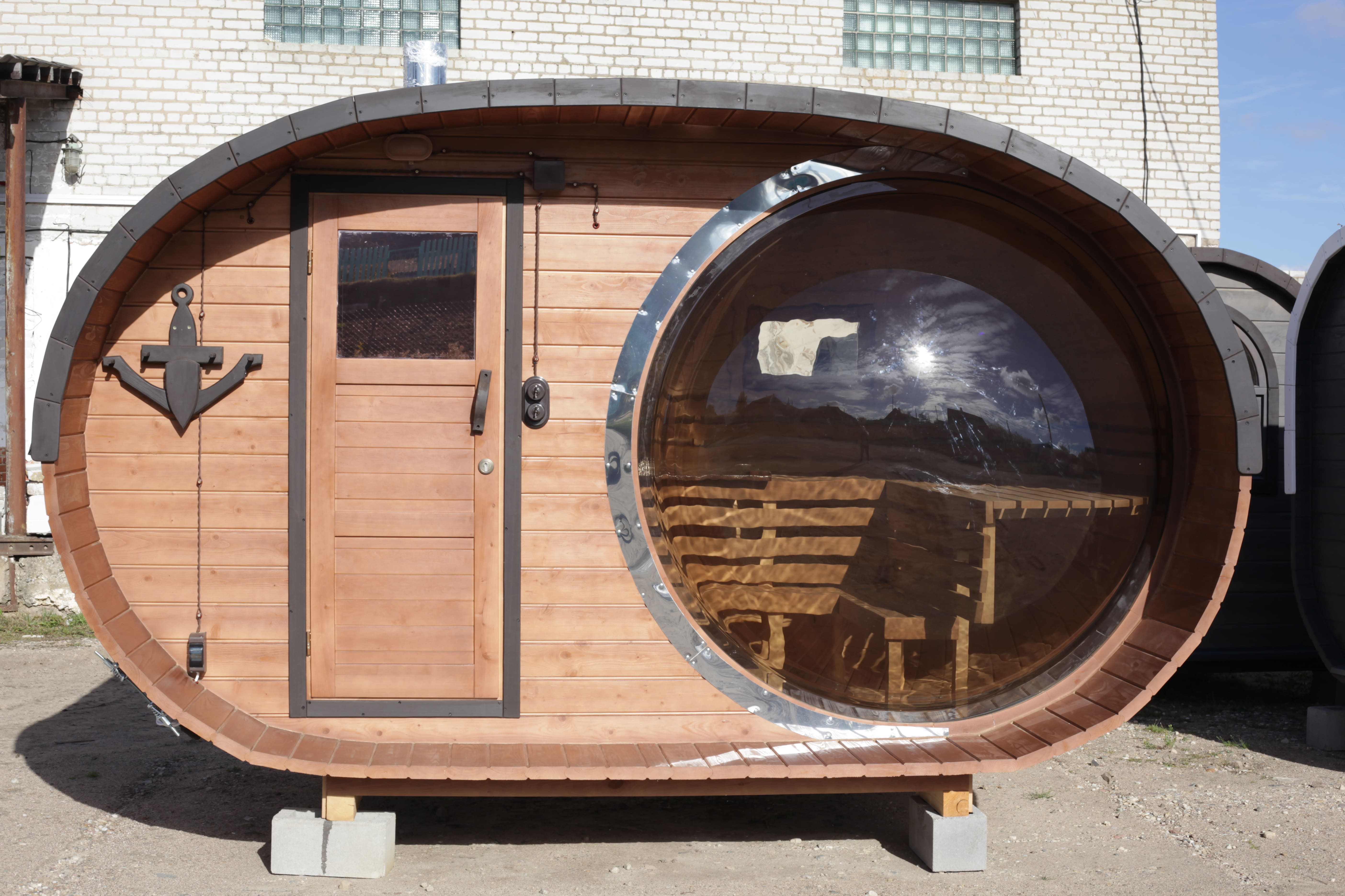 Главная / Каталог / Наши работы / Проекты овальных бань Батискаф / Баня овальная с панорамным куполом 2,4*4 м, две комнаты