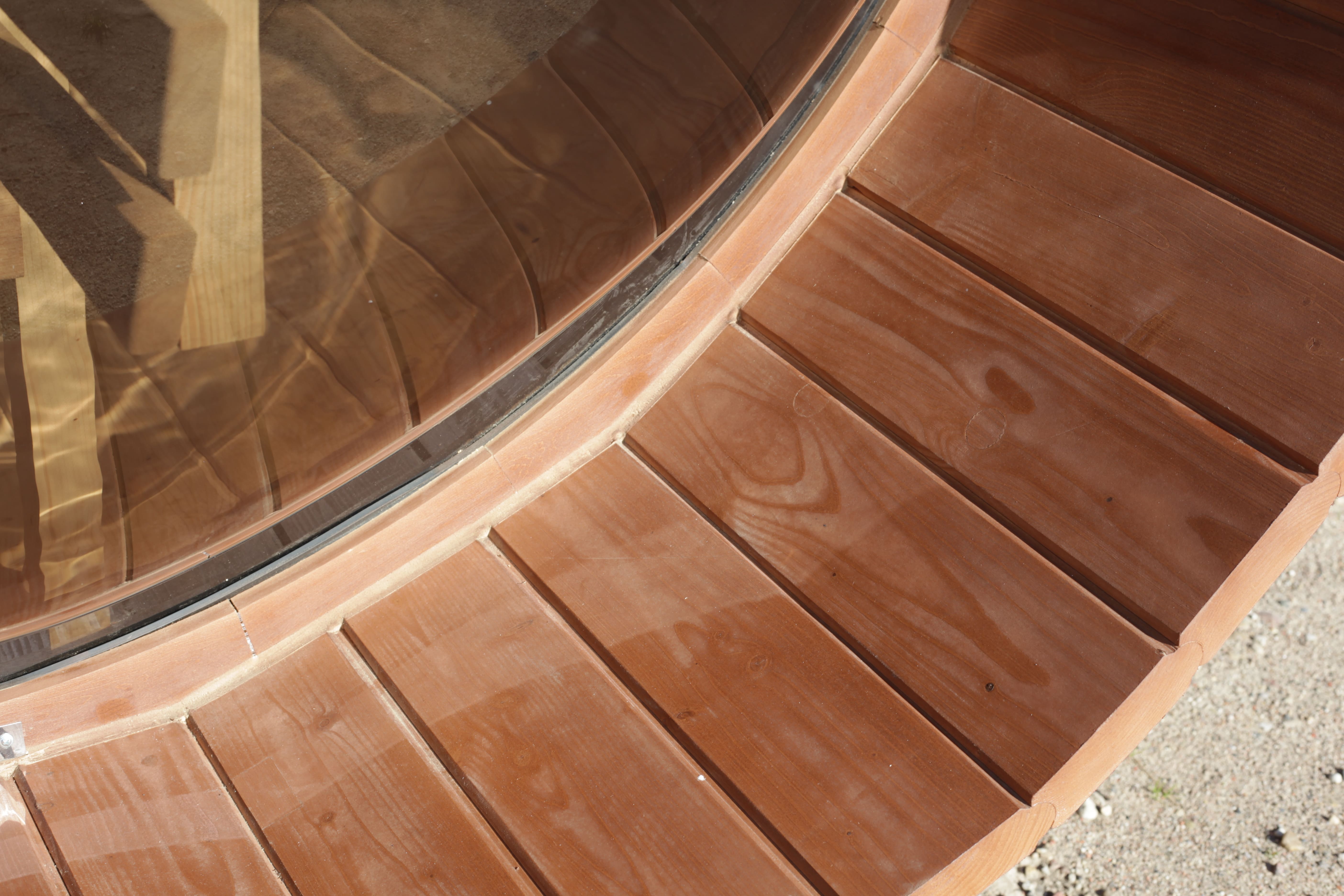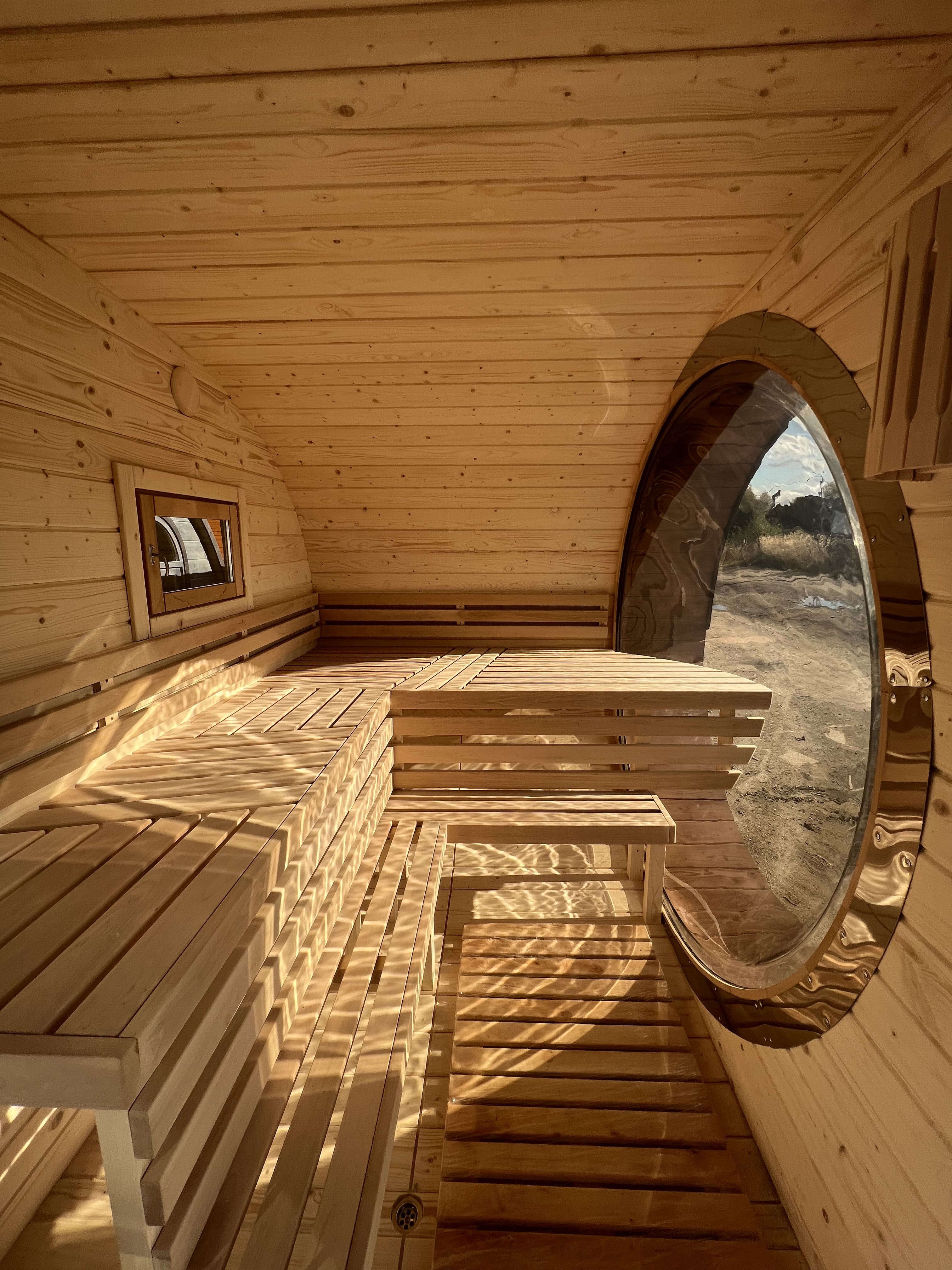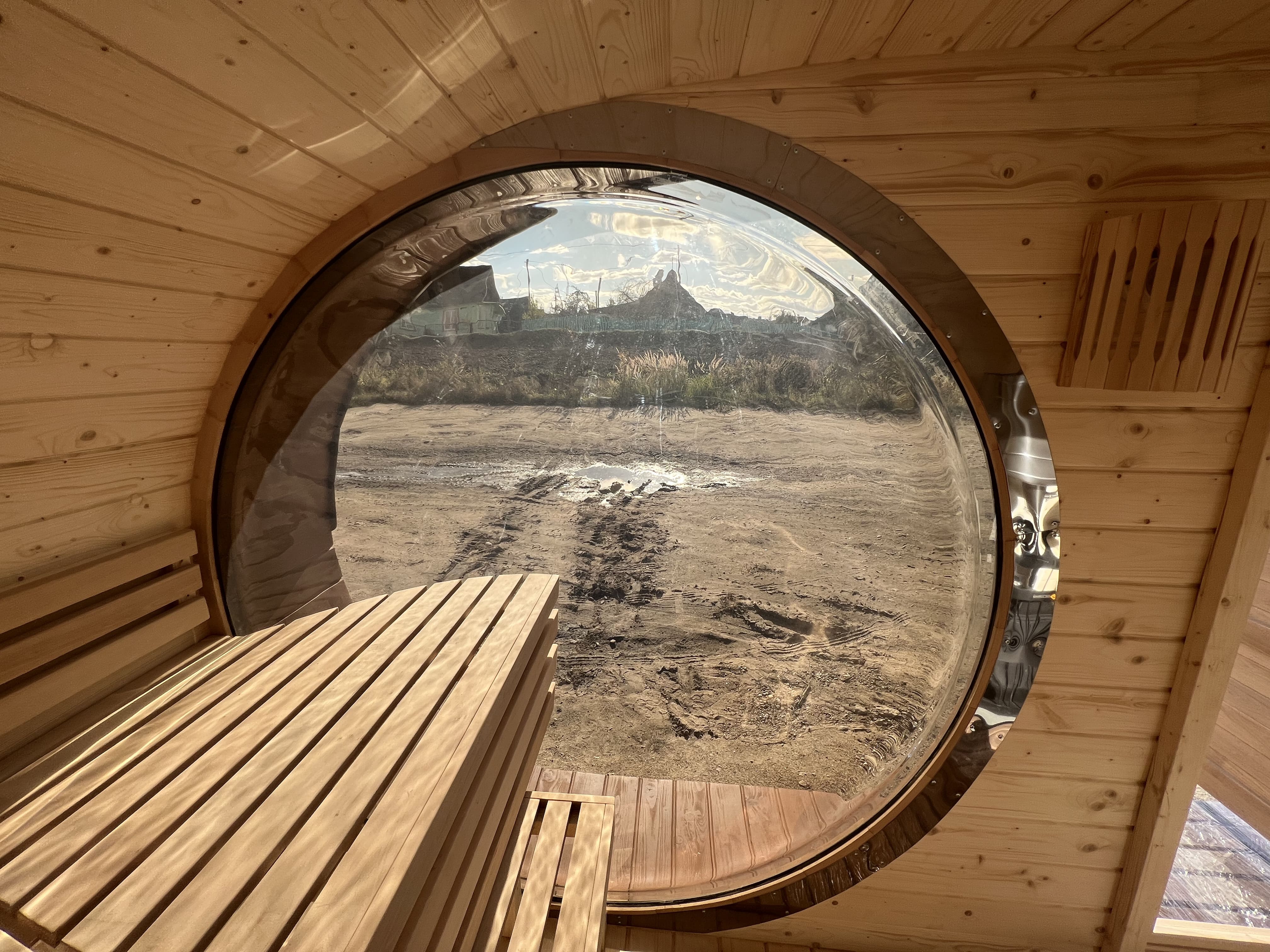 Главная / Каталог / Наши работы / Проекты овальных бань Батискаф / Баня овальная с панорамным куполом 2,4*4 м, две комнаты
