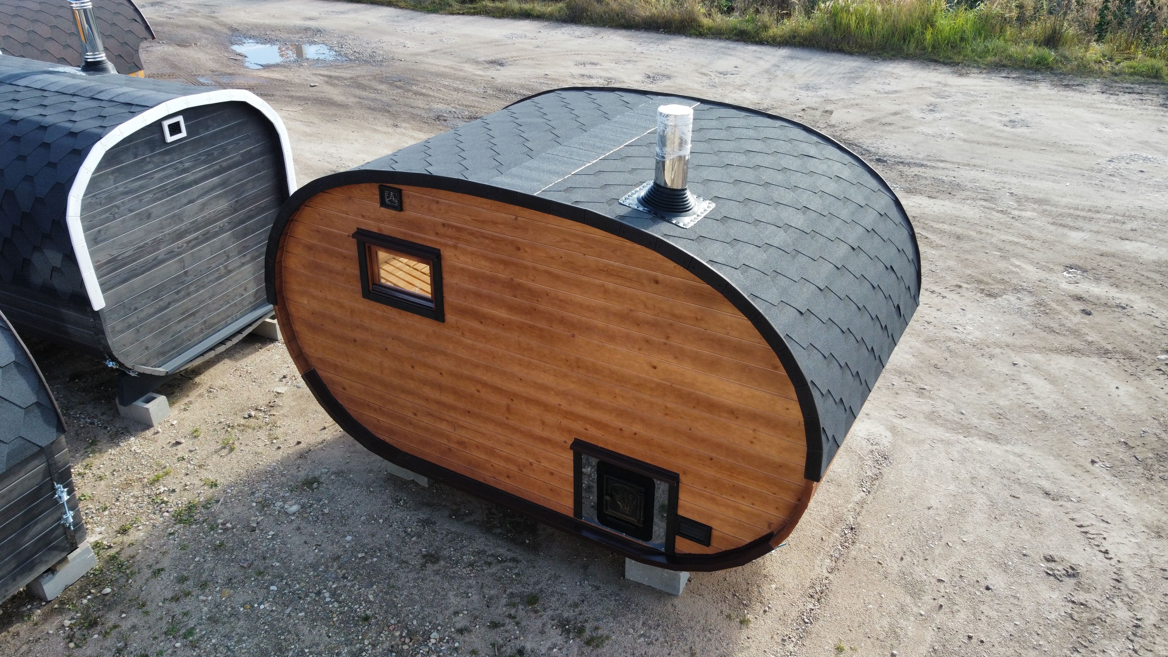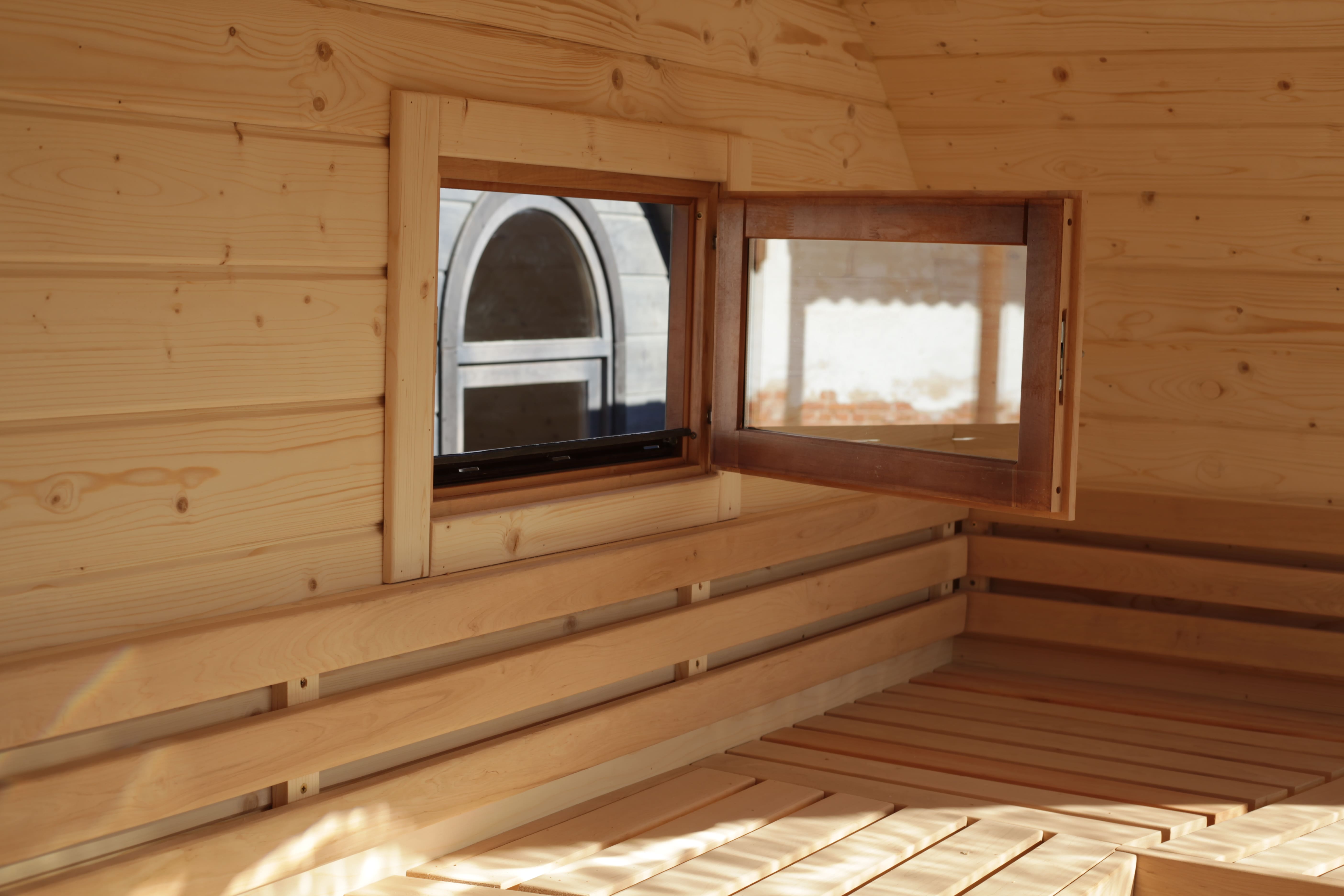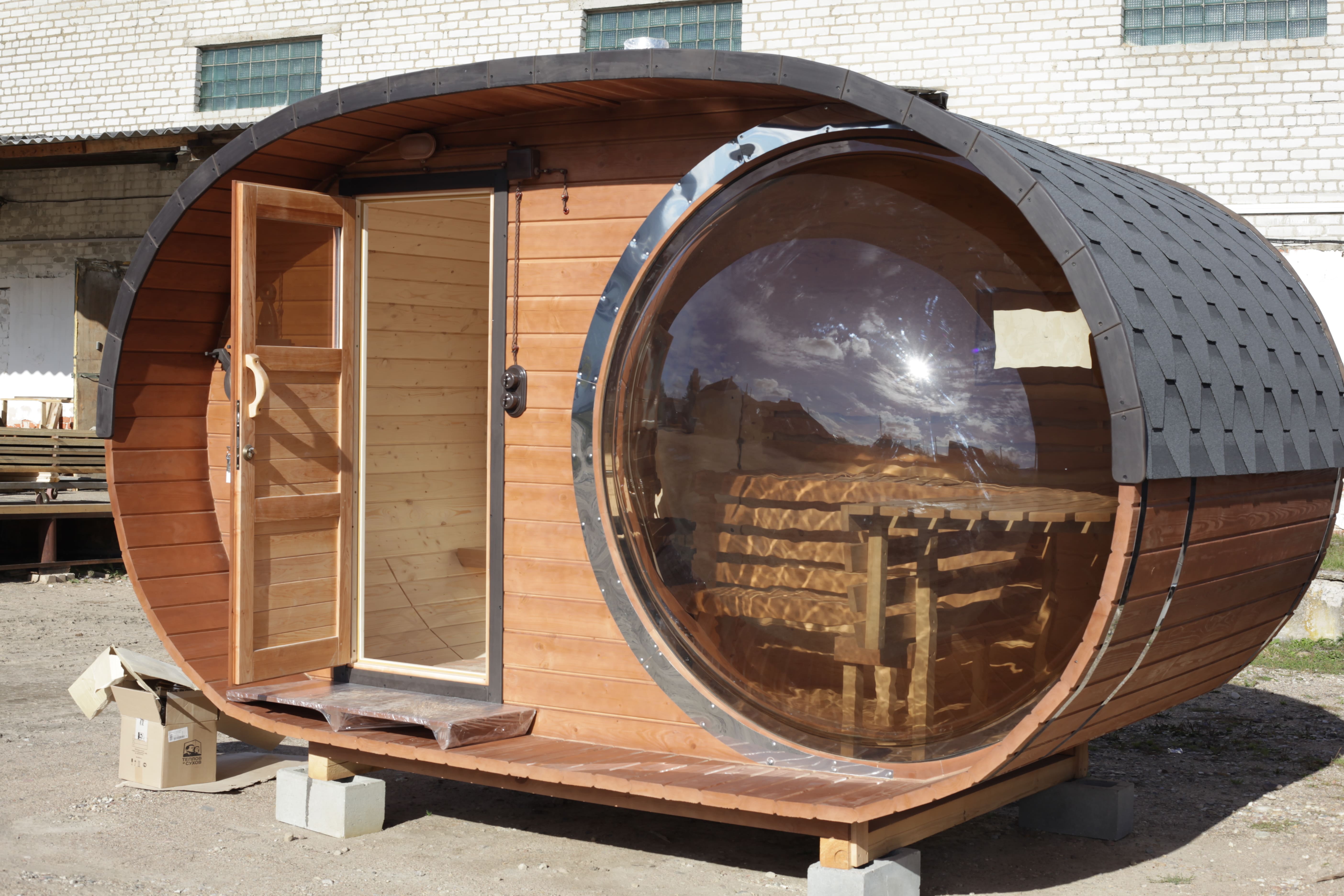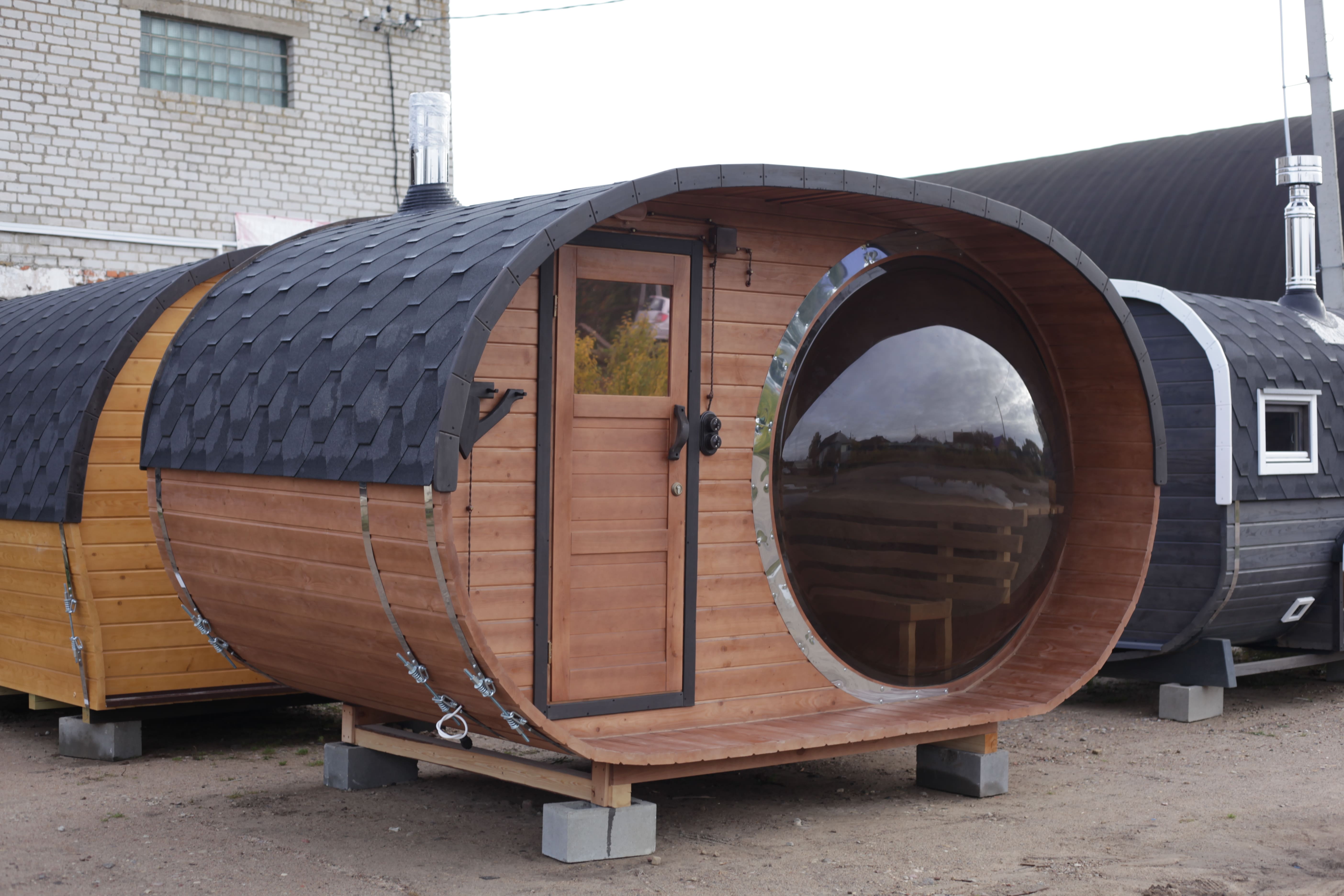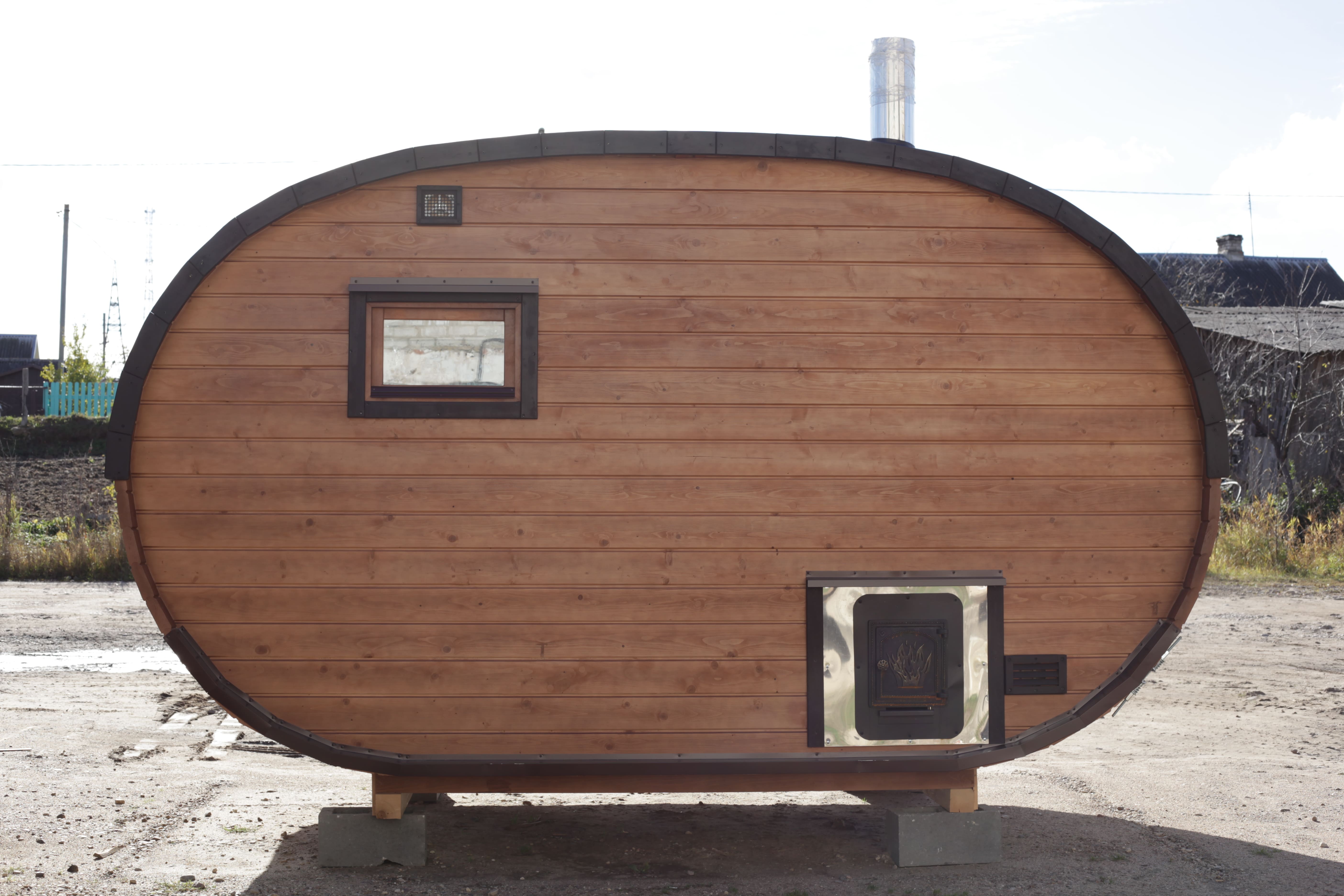 Баня овальная с панорамным куполом 2,4*4 м, две комнаты