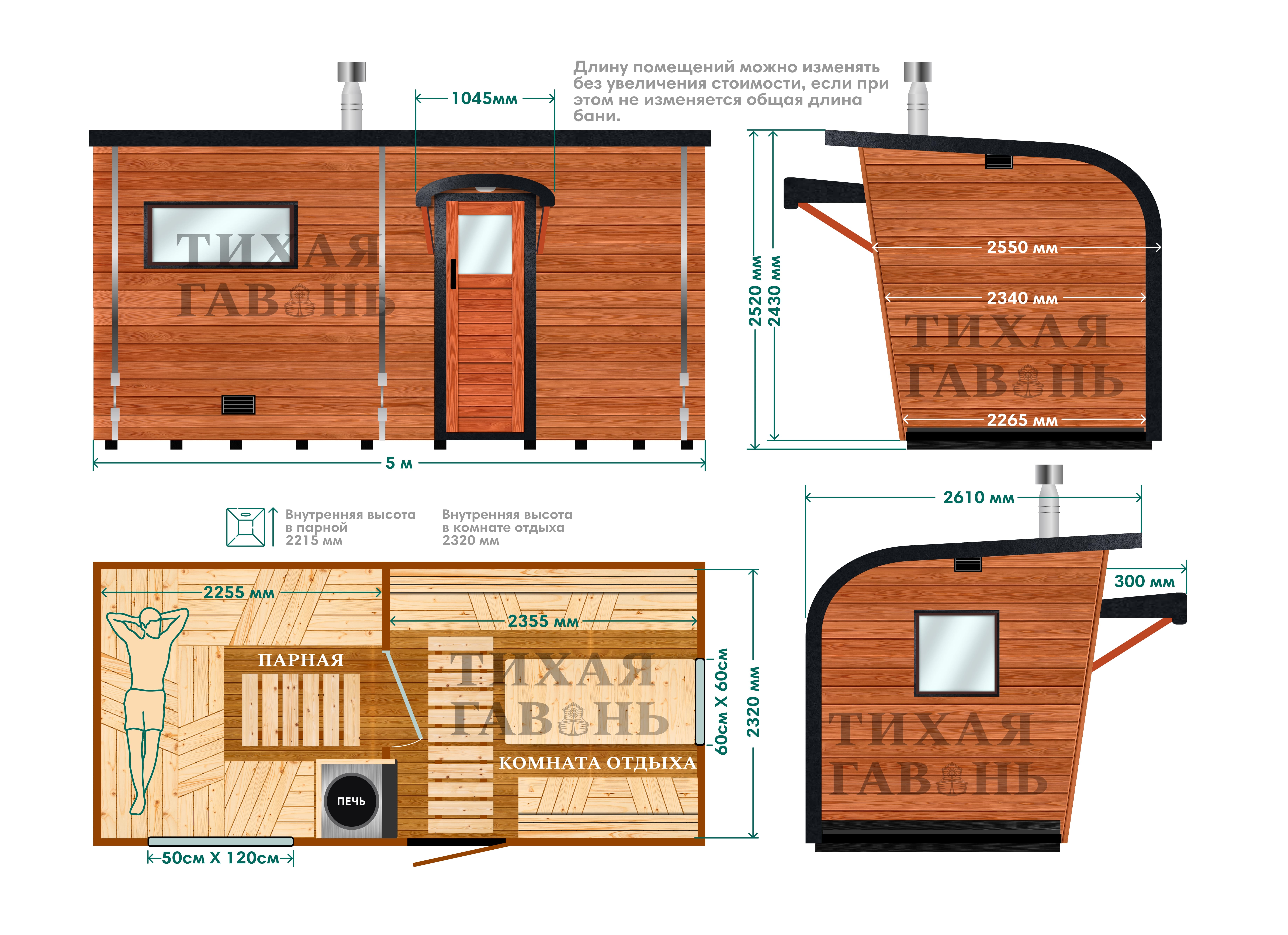 В базовой комплектации ровный пол пропитывается яхтным лаком в 2 слоя, а в парной применяется специальная пропитка для бань и саун — также в 2 слоя.
