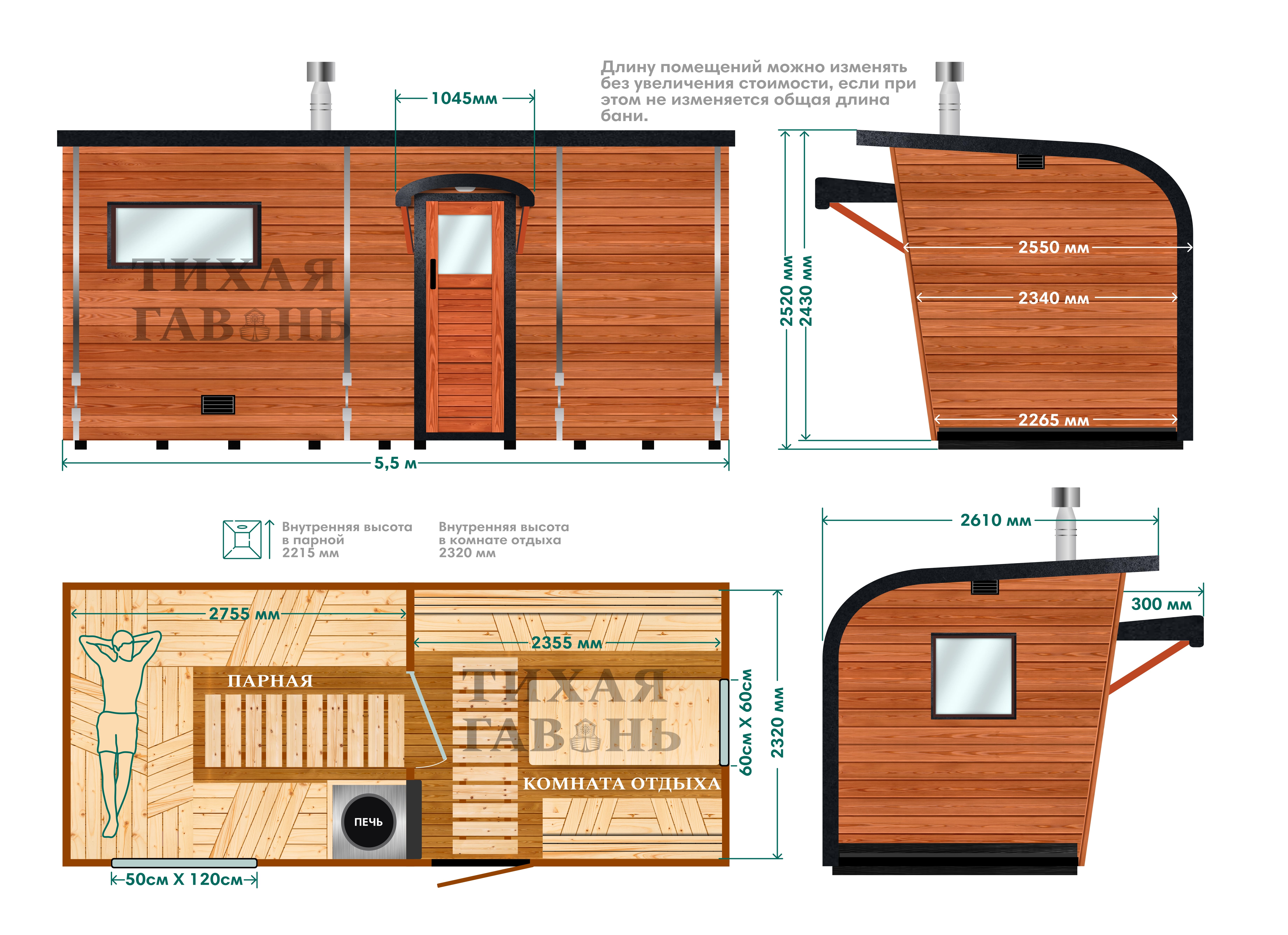 В базовой комплектации ровный пол пропитывается яхтным лаком в 2 слоя, а в парной применяется специальная пропитка для бань и саун — также в 2 слоя.