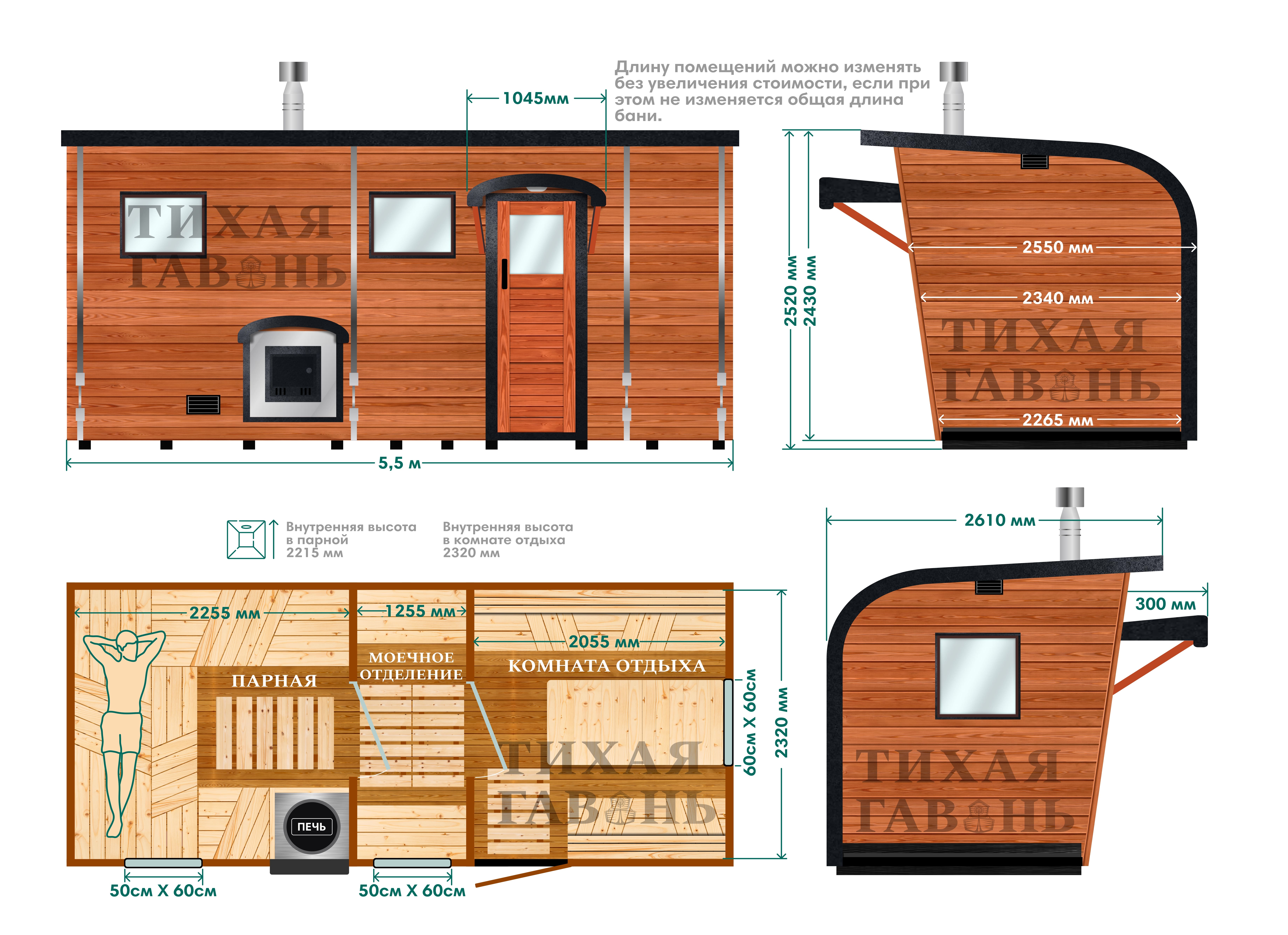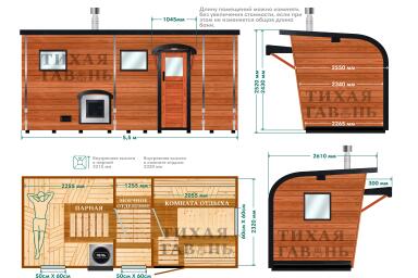 Баня «Парус» 5,5 м от «Тихой Гавани» с планировкой на три отделения представляет собой удобное решение для тех, кому требуется чёткое разделение функциональных зон. Увеличенная длина позволяет разместить полноценную комнату отдыха, отдельную помывочную и парную без ощущения тесноты. Такая баня подходит для регулярного использования и комфортно вмещает 4–6 человек.