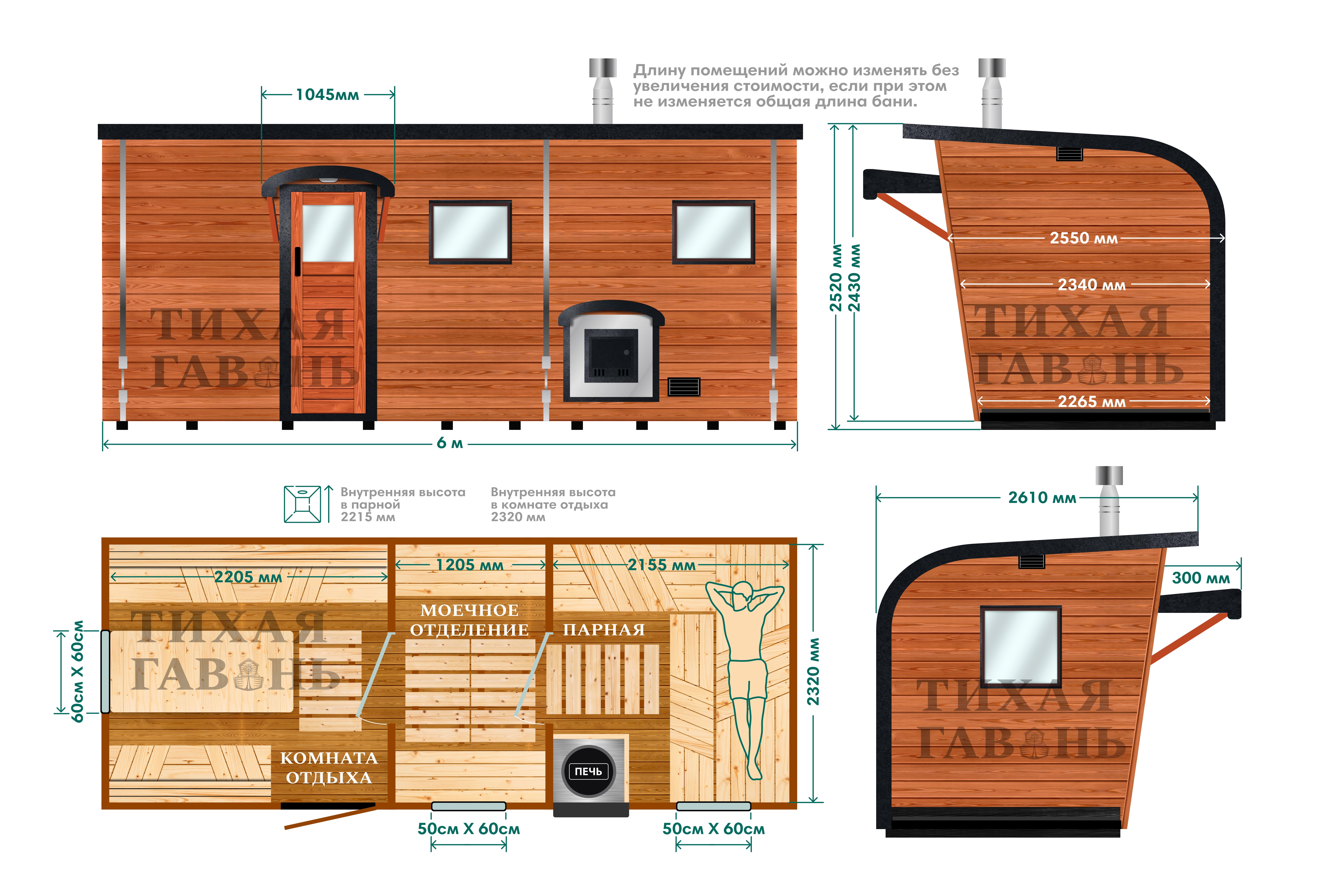 Баня «Парус» 6 м выполнена с увеличенной шириной 2,47 м и высотой 2,52 м. Такие размеры формируют больше внутреннего объёма и подходят для людей разного роста. Ровный пол по всей длине остаётся характерной особенностью серии «Парус» и упрощает передвижение между помещениями.