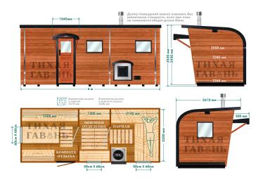 Баня Парус 6 м на три отделения от «Тихой Гавани» является самой крупной и функциональной моделью в серии «Парус». Длина 6 метров позволяет реализовать полноценный банный комплекс с чётким зонированием и комфортным внутренним пространством. Такая баня рассчитана на одновременное размещение 4–6 человек и подходит для регулярного использования в любое время года.