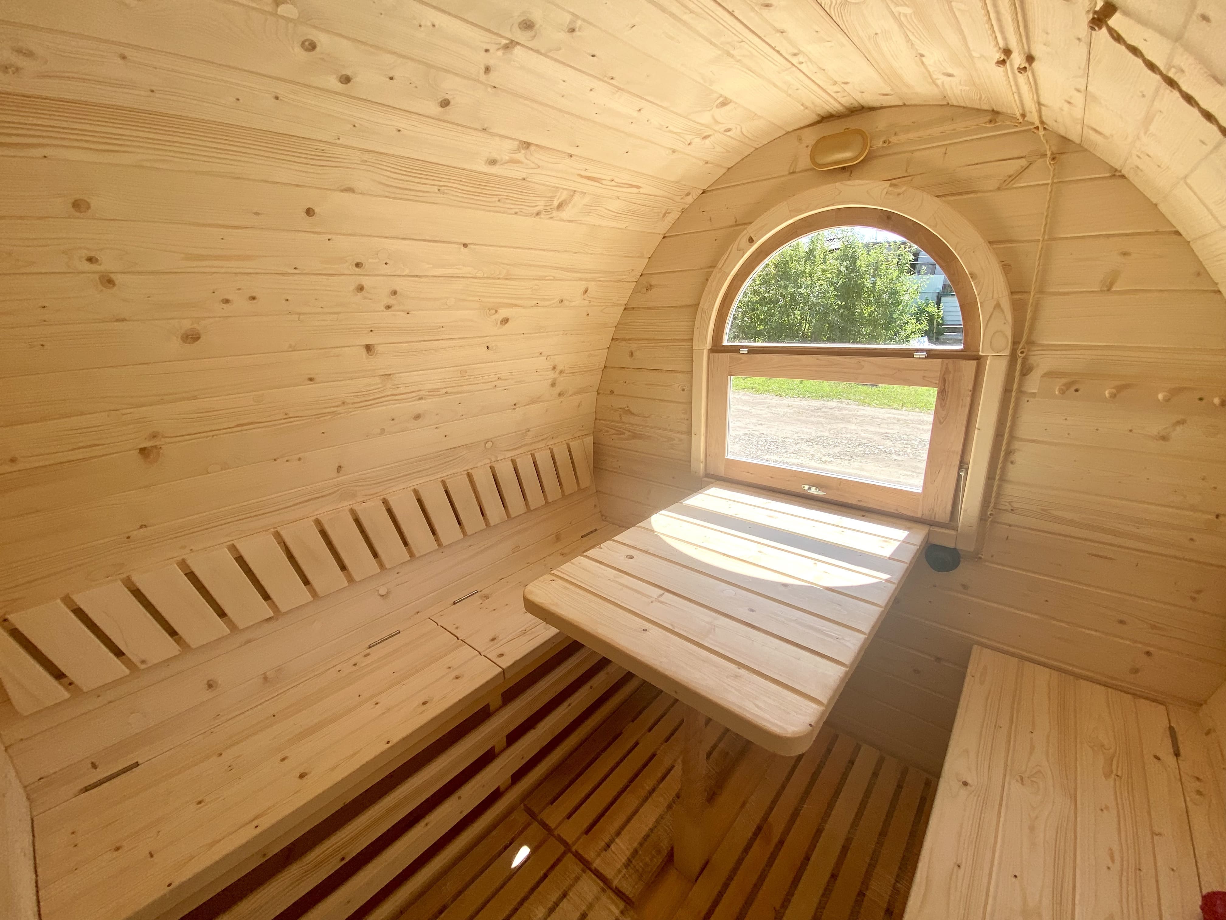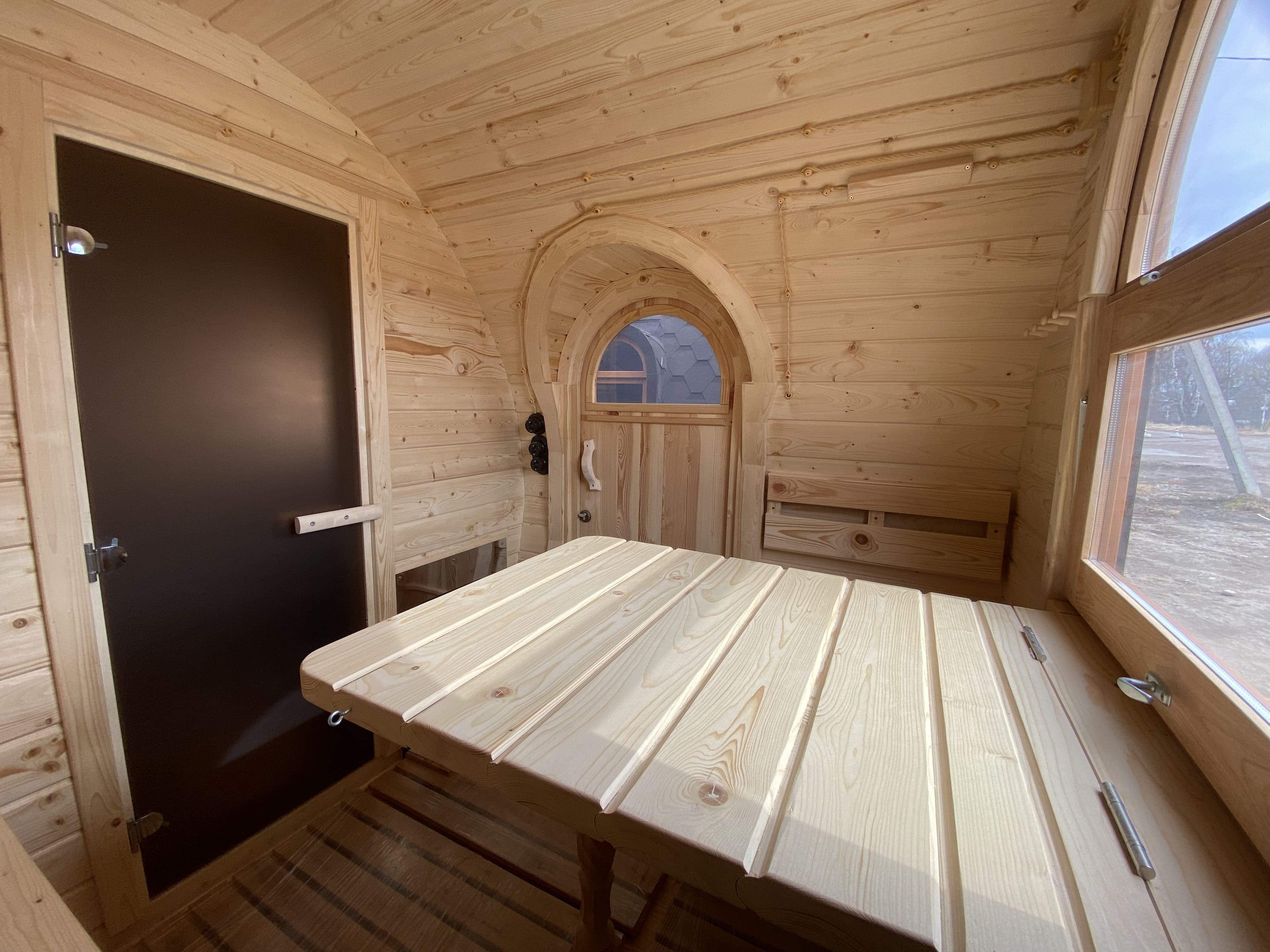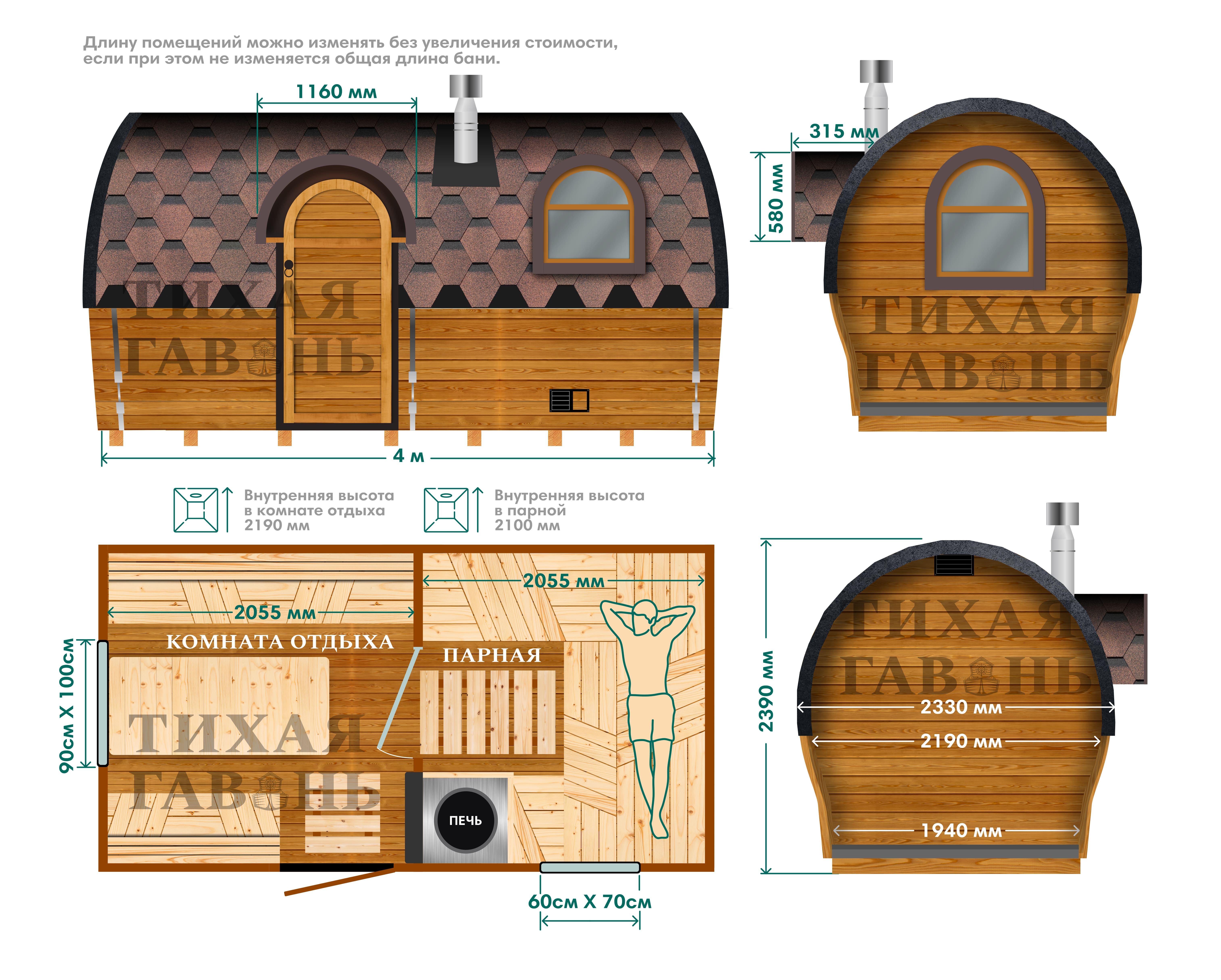 Внутри предусмотрены два помещения - комната отдыха и парная. Такой формат подходит для семьи или компании из 2-4 человек.