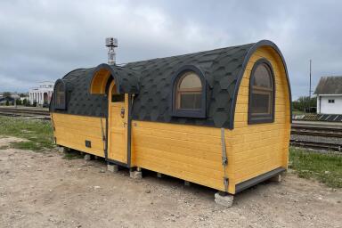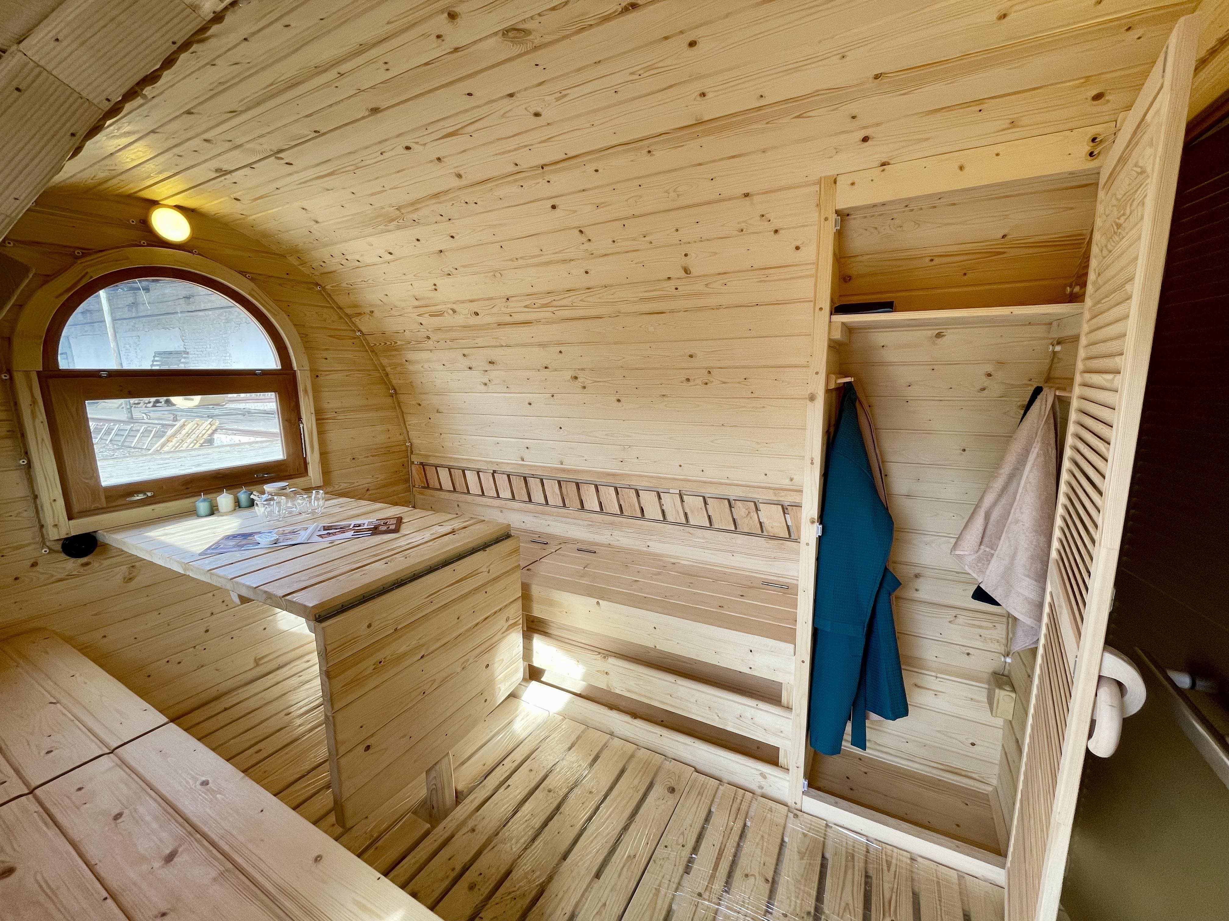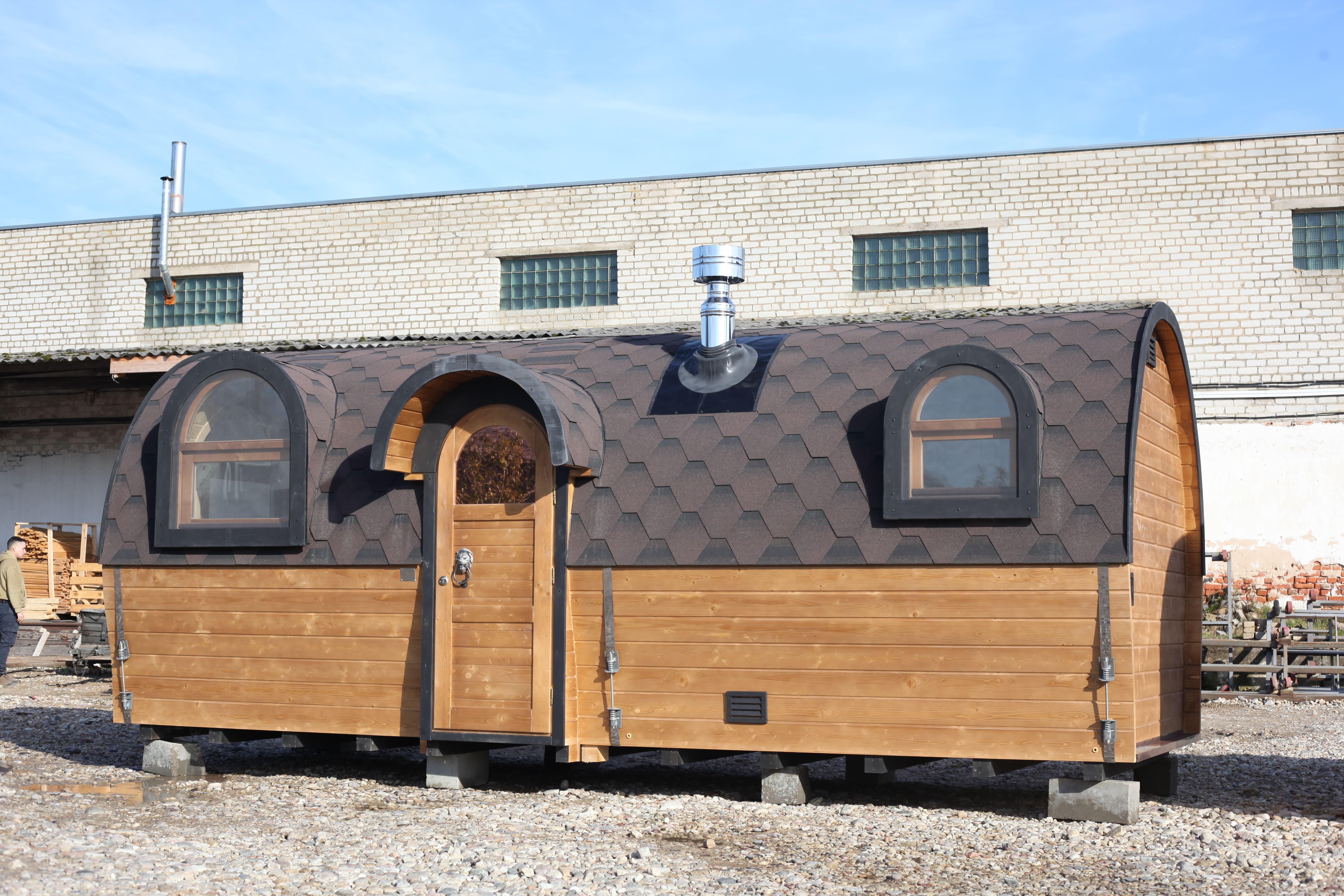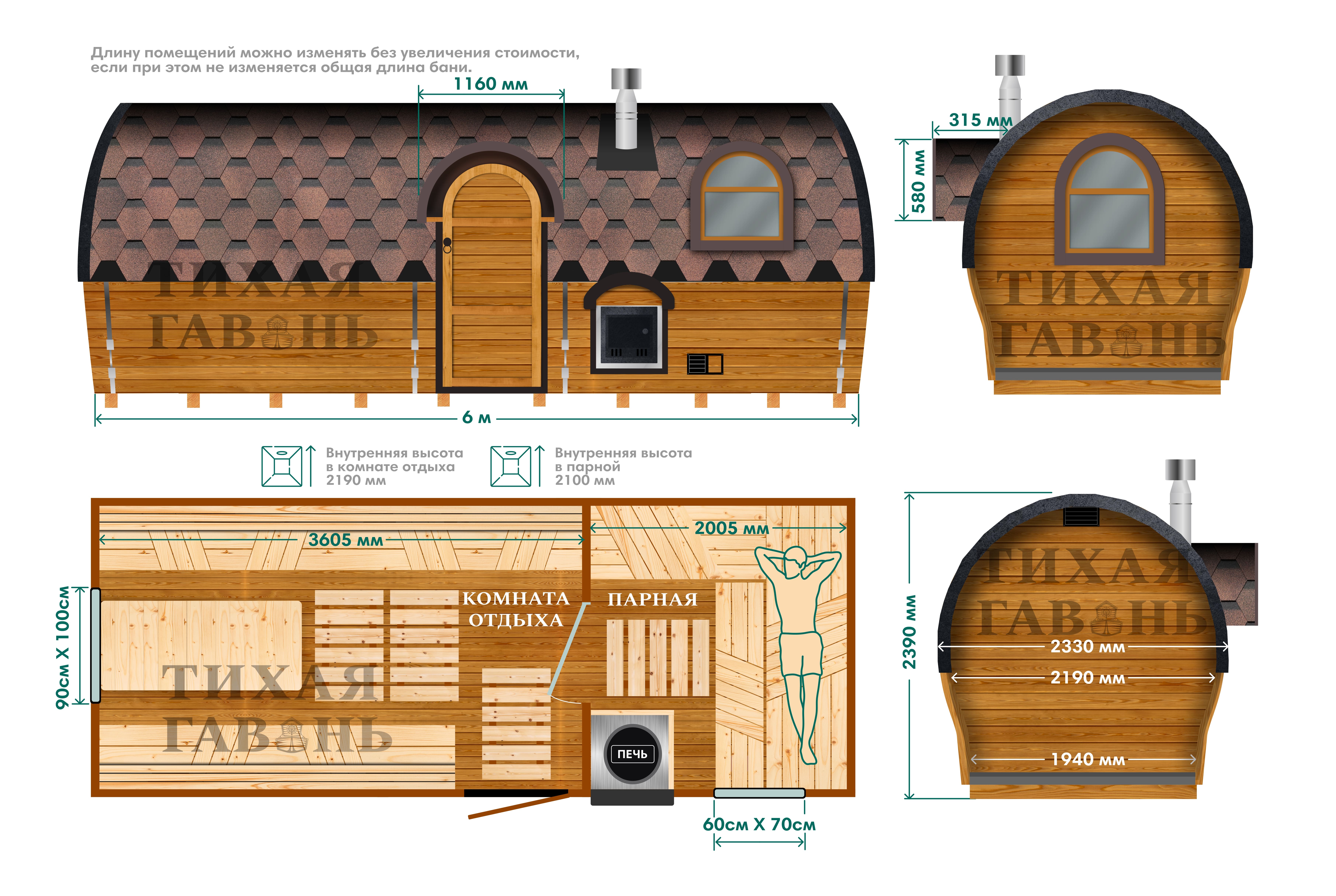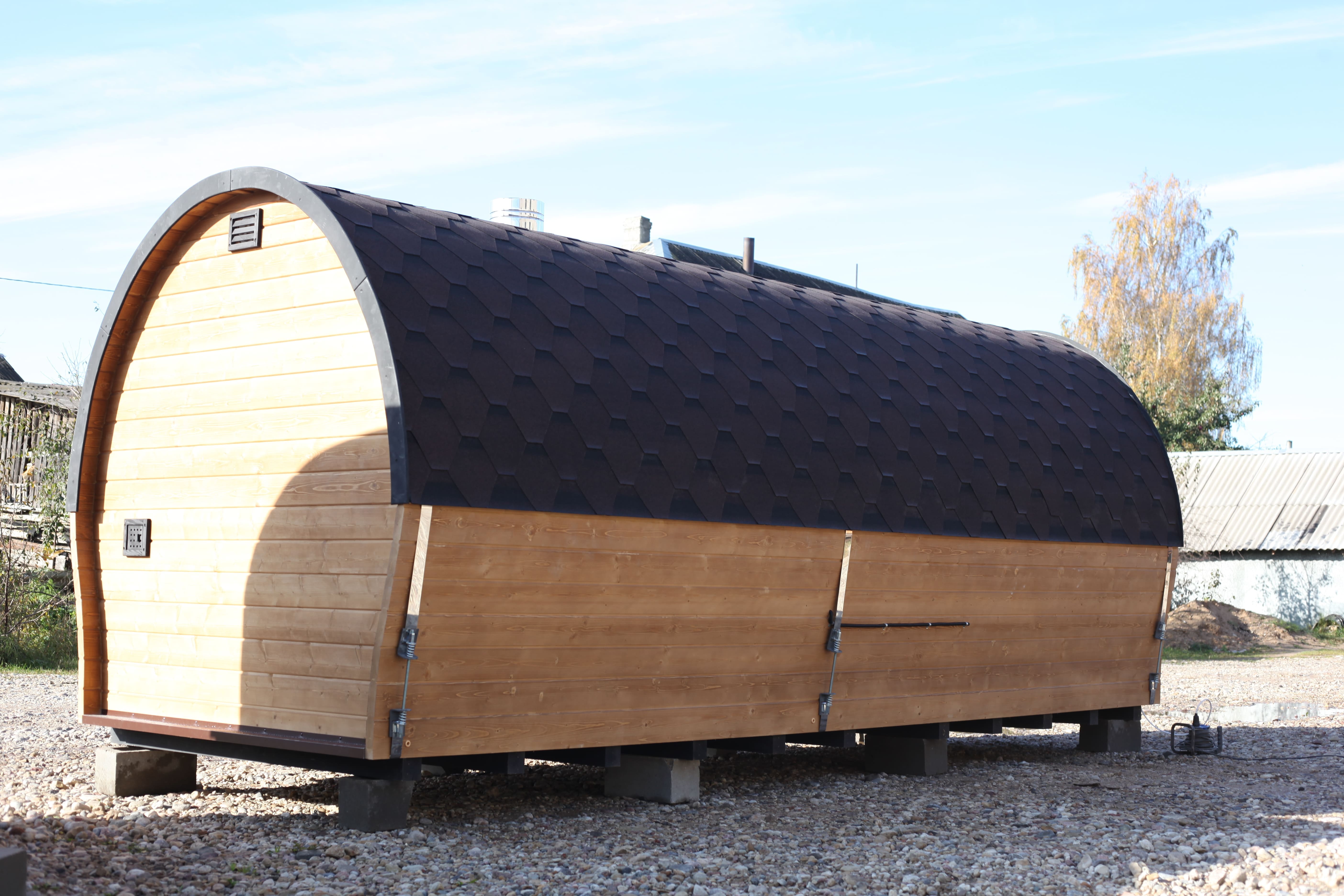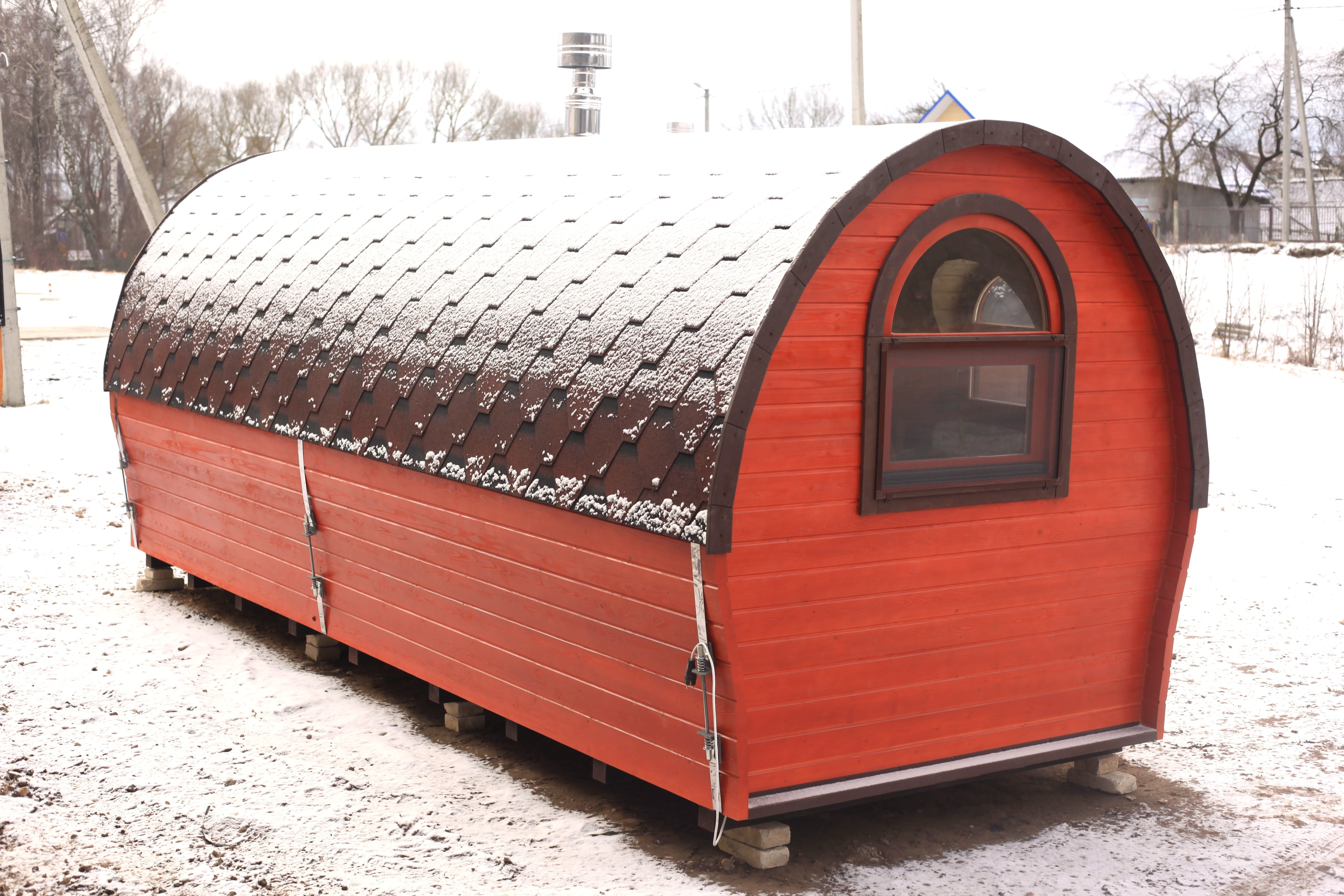 Баня сундук 6 м, 2 комнаты сохраняет узнаваемую форму с округлой верхней частью и ровным основанием. За счёт длины 6 метров внутреннее пространство становится заметно свободнее по сравнению с младшими моделями, при этом внешний силуэт остаётся аккуратным.