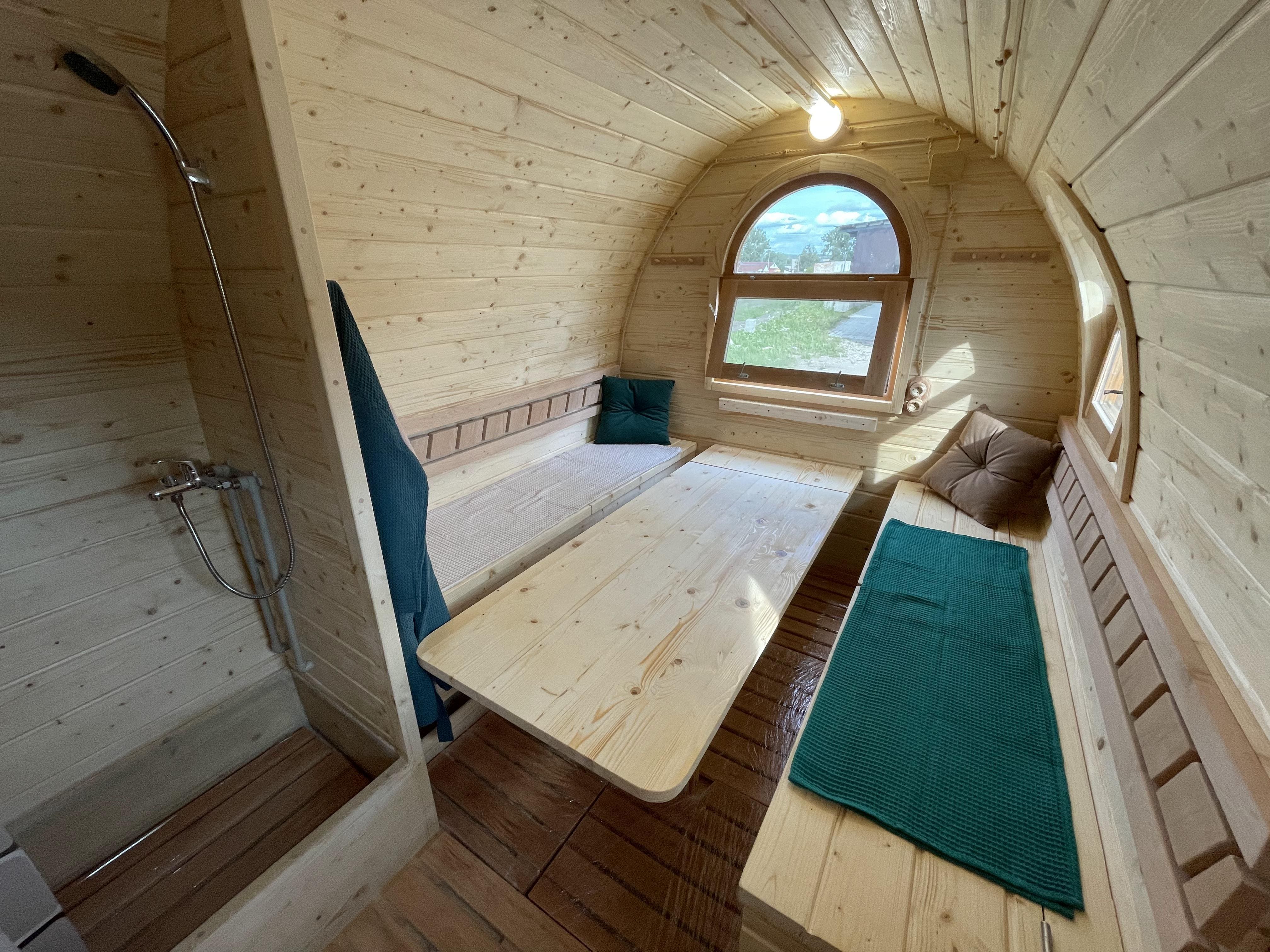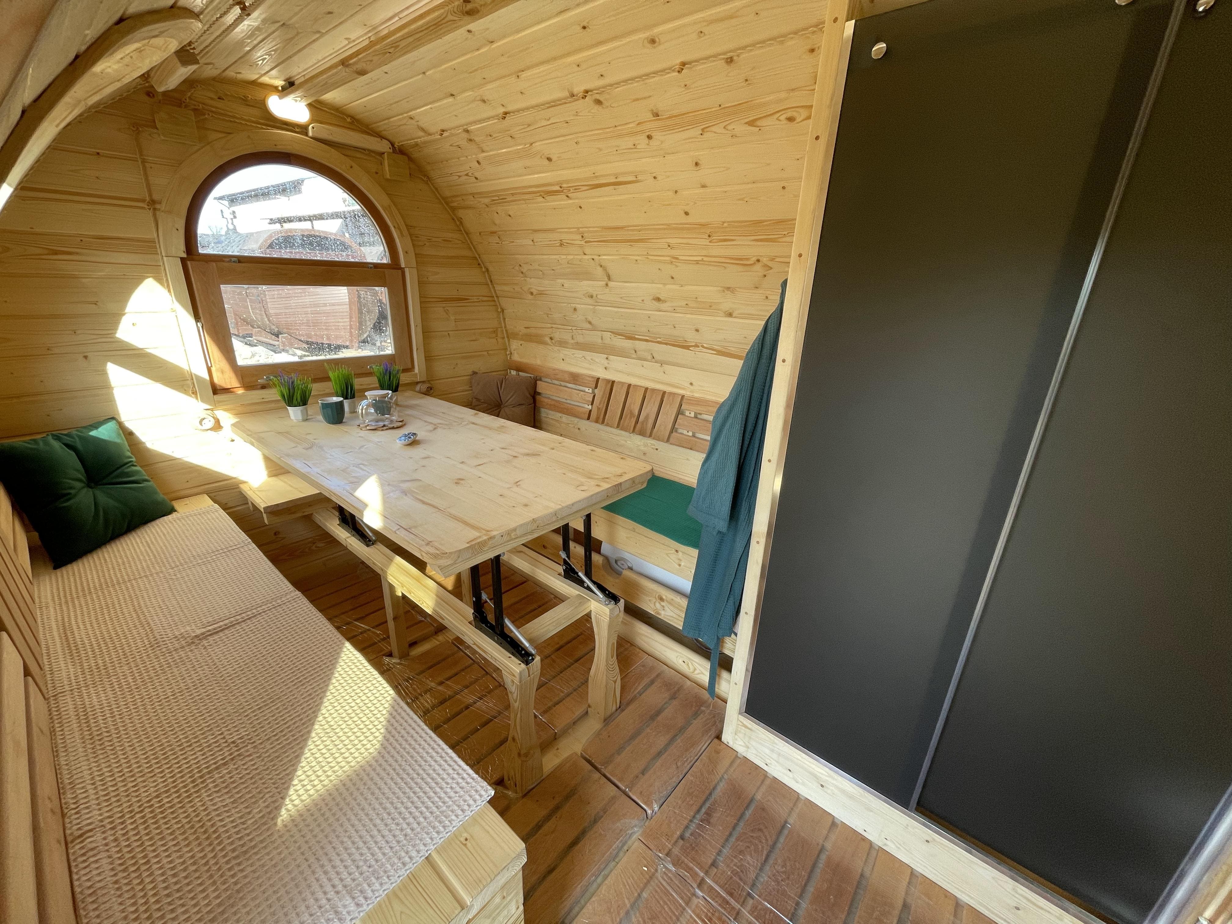 Форма корпуса увеличивает объём воздуха в верхней части, поэтому внутри нет ощущения низкого потолка. Пол остаётся ровным по всей площади, что удобно для передвижения и размещения мебели.