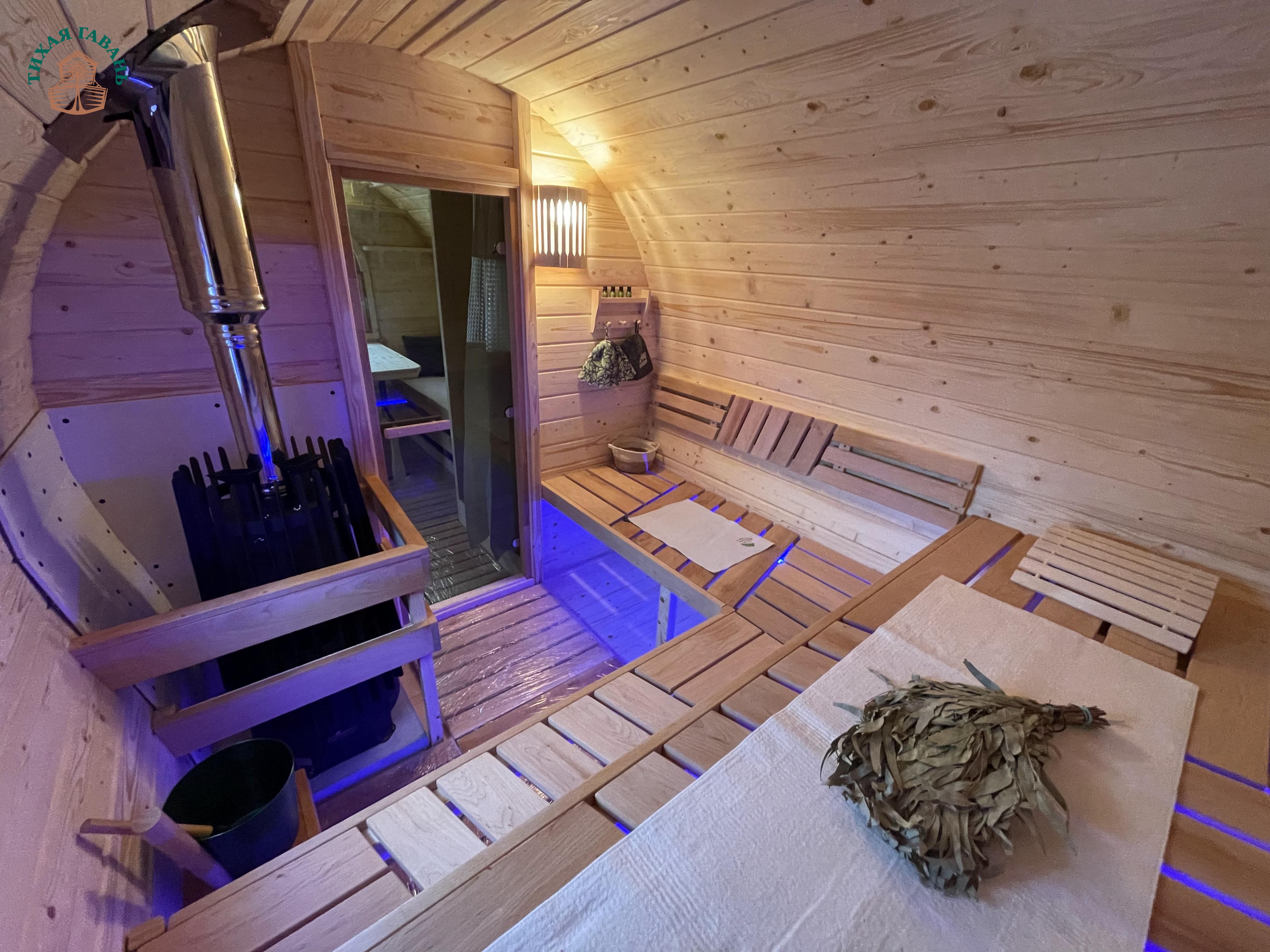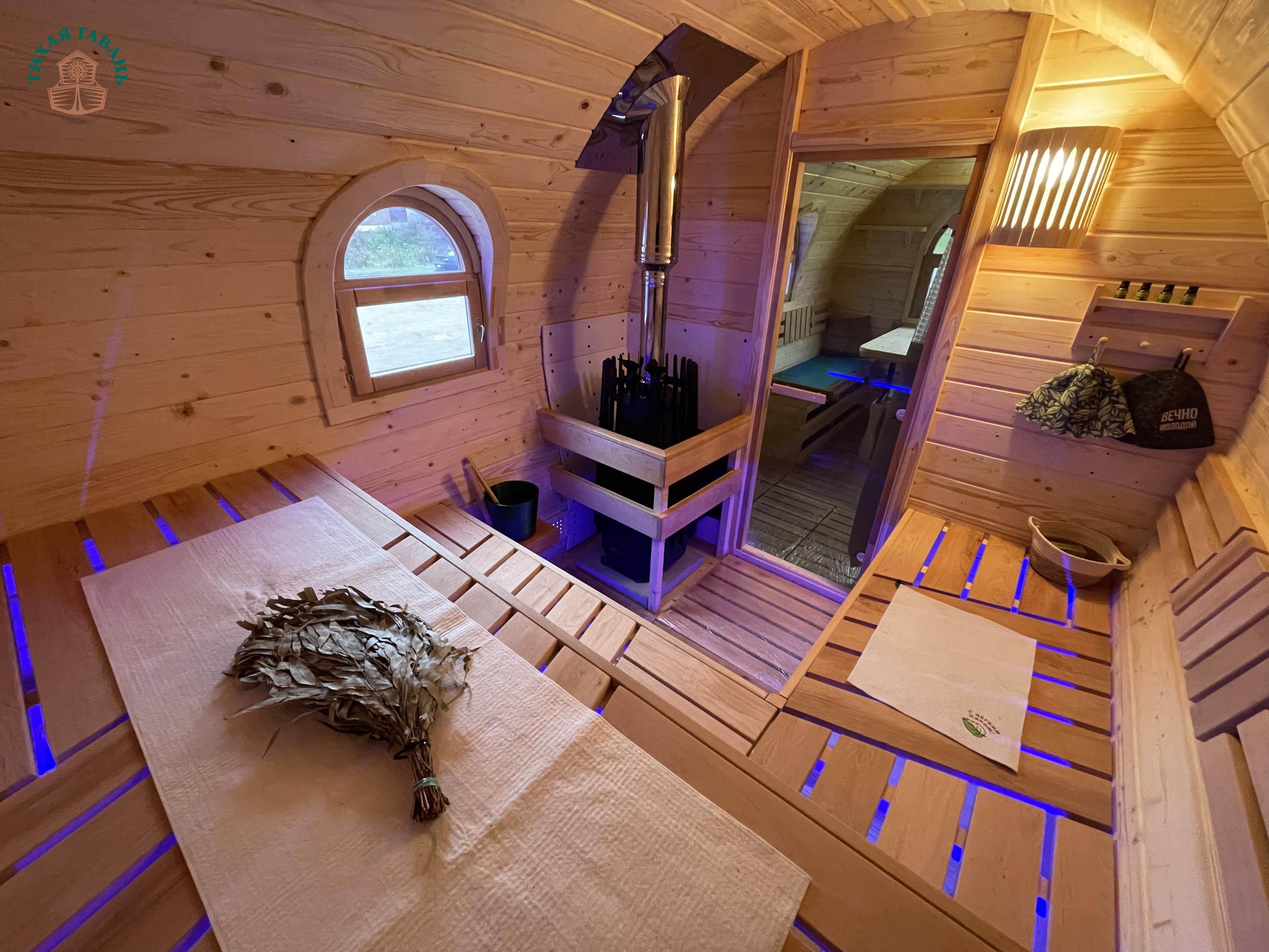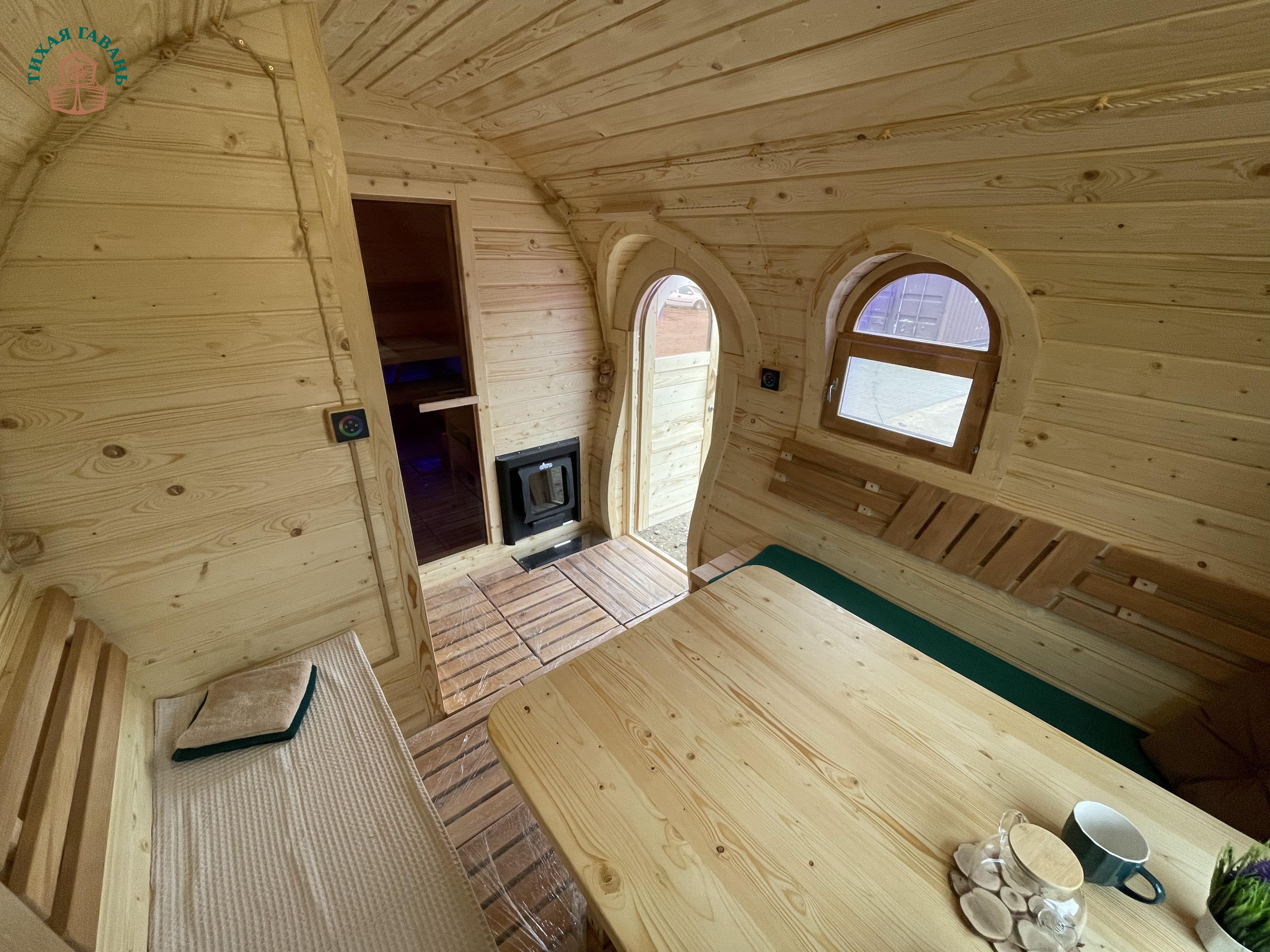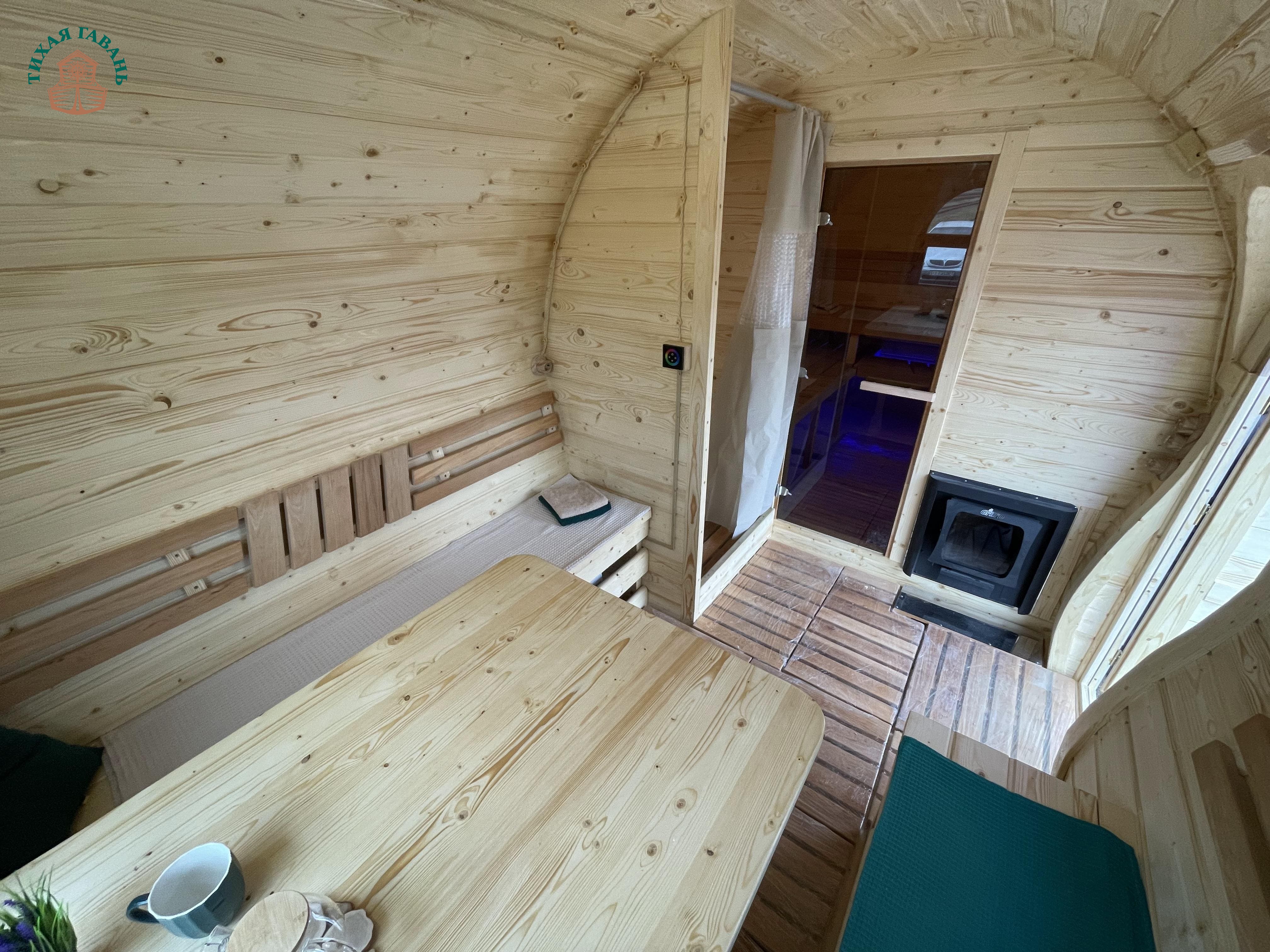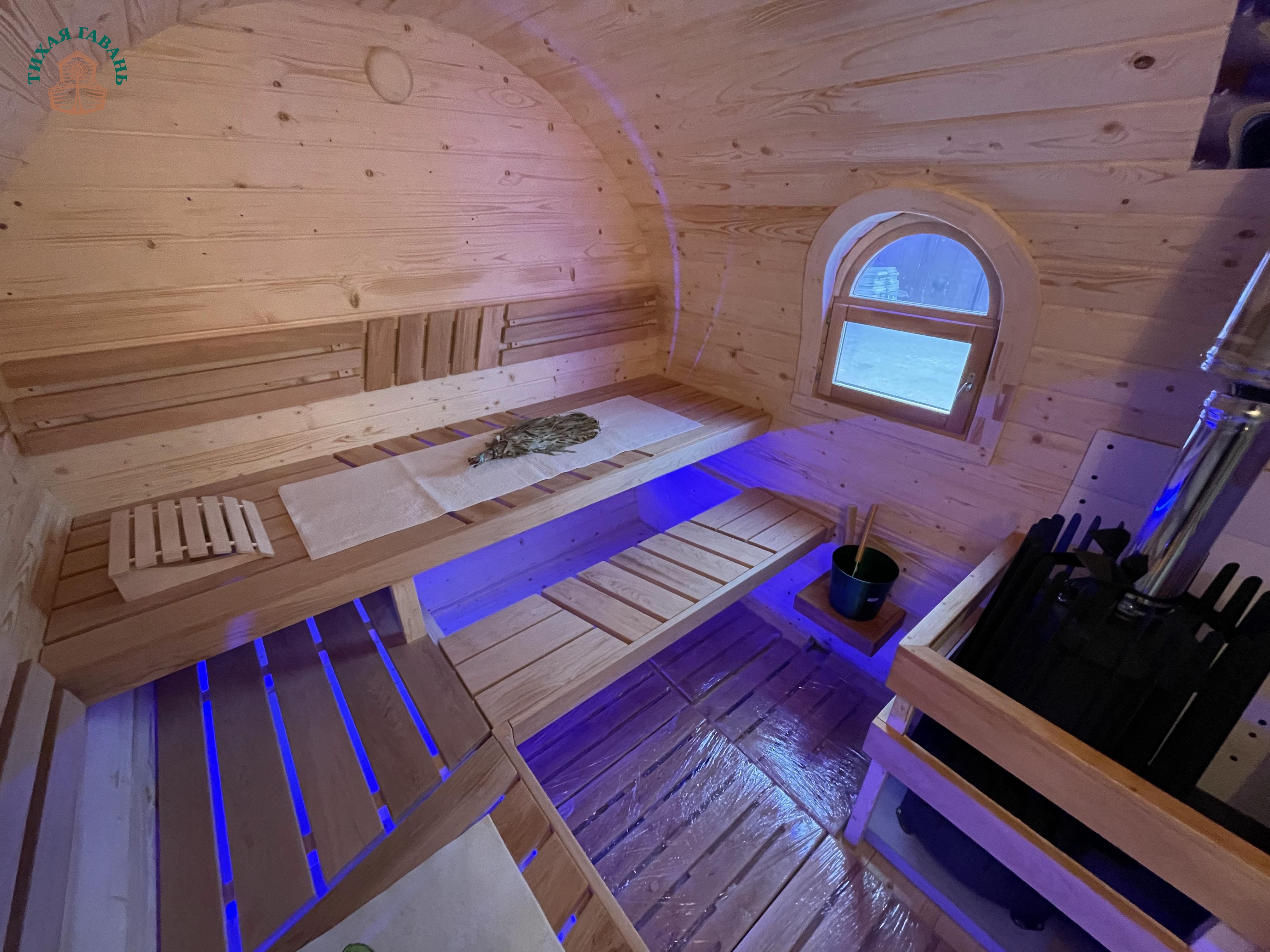 В комнате отдыха: стол трансформер длиною 1300 мм. Скамейки с подъемными крышками и ящиками для хранения. Две спинки. Душевой уголок с поддоном из стеклопластика и шторкой. Смеситель и лейка. Бойлер на 50 л. (горизонтальный). Ввод воды под быстросъем (краник, трубы, быстросъем). Полочка над окном. Две полки по обе стороны возле окна. В парной двойной пол с уклоном, с желобом из нержавеющей стали. Полки расположены на разном уровне. Дополнительный полок (400 мм) выдвижной. Две спинки. Вентклапан. Регулируется путем откручивания. Защита вокруг печи. Полочка под запарник. Обручи из нержавеющей стали с саморегулирующимися замками.