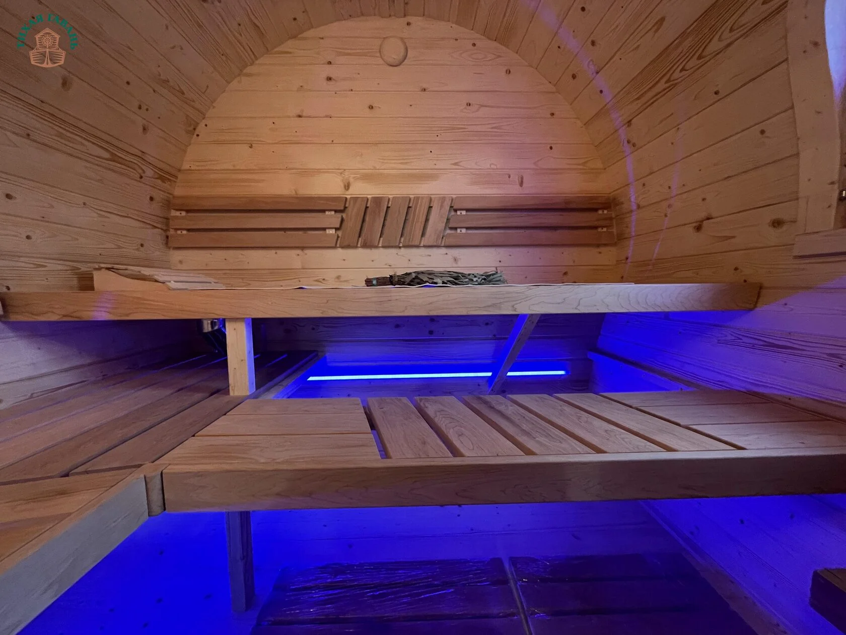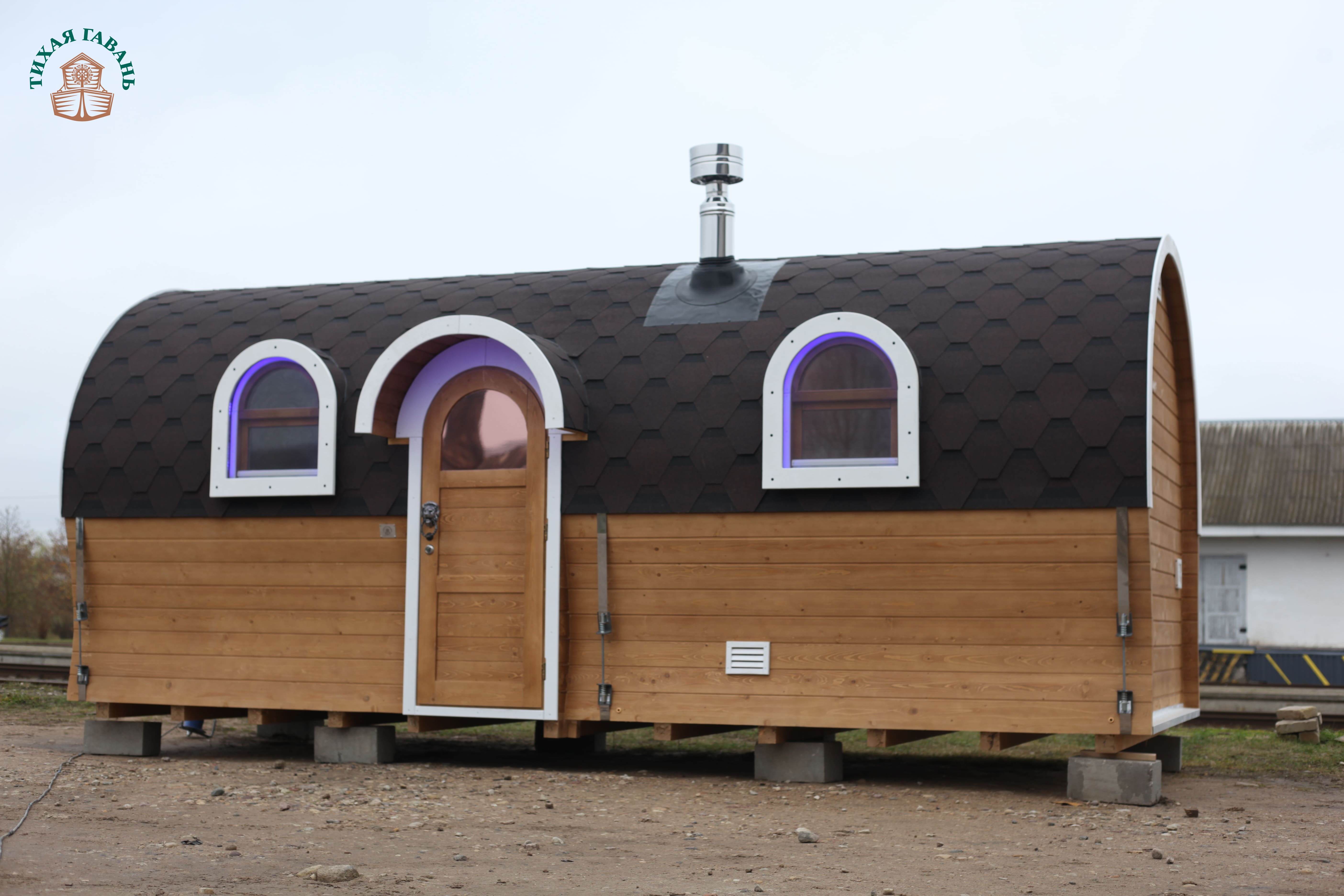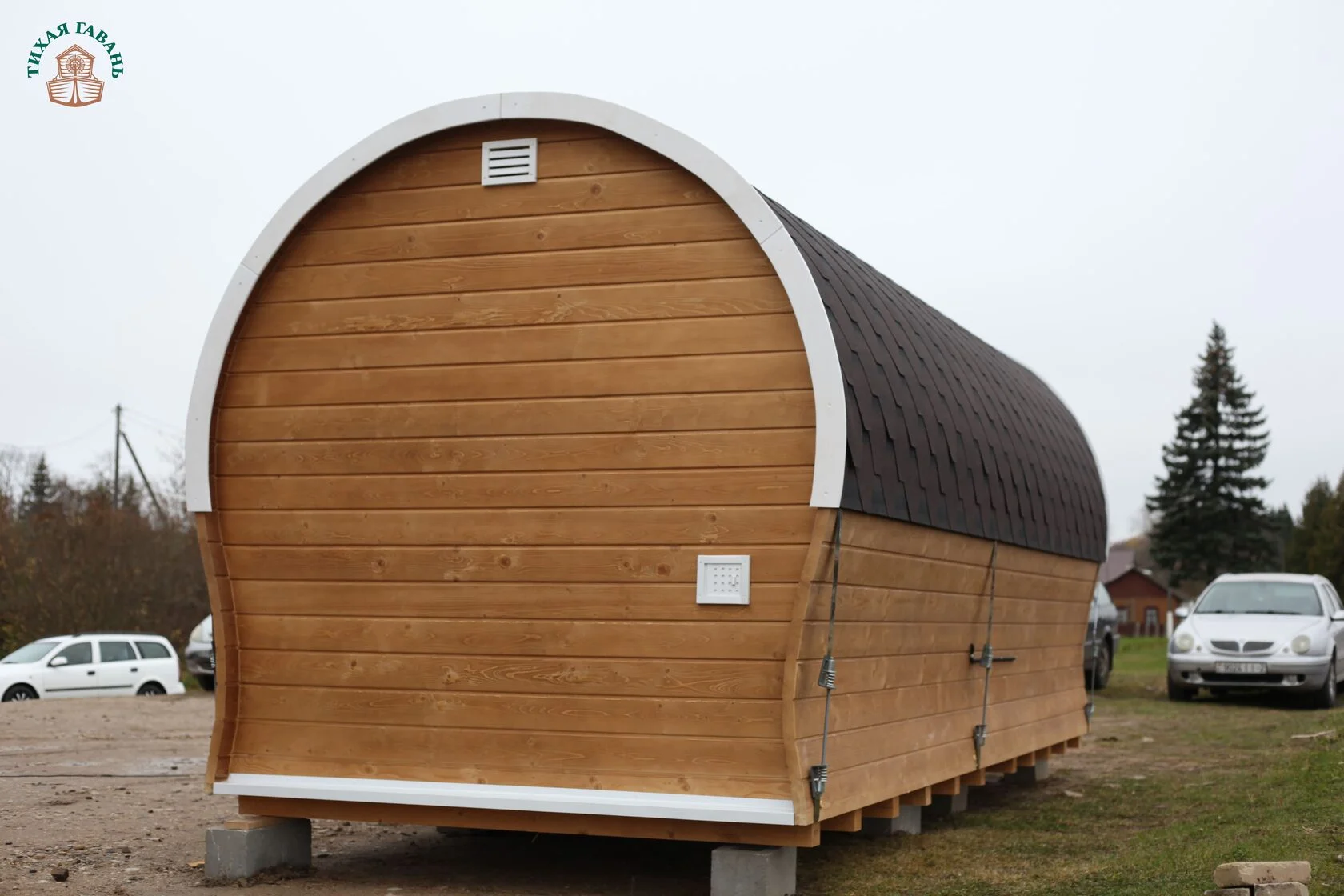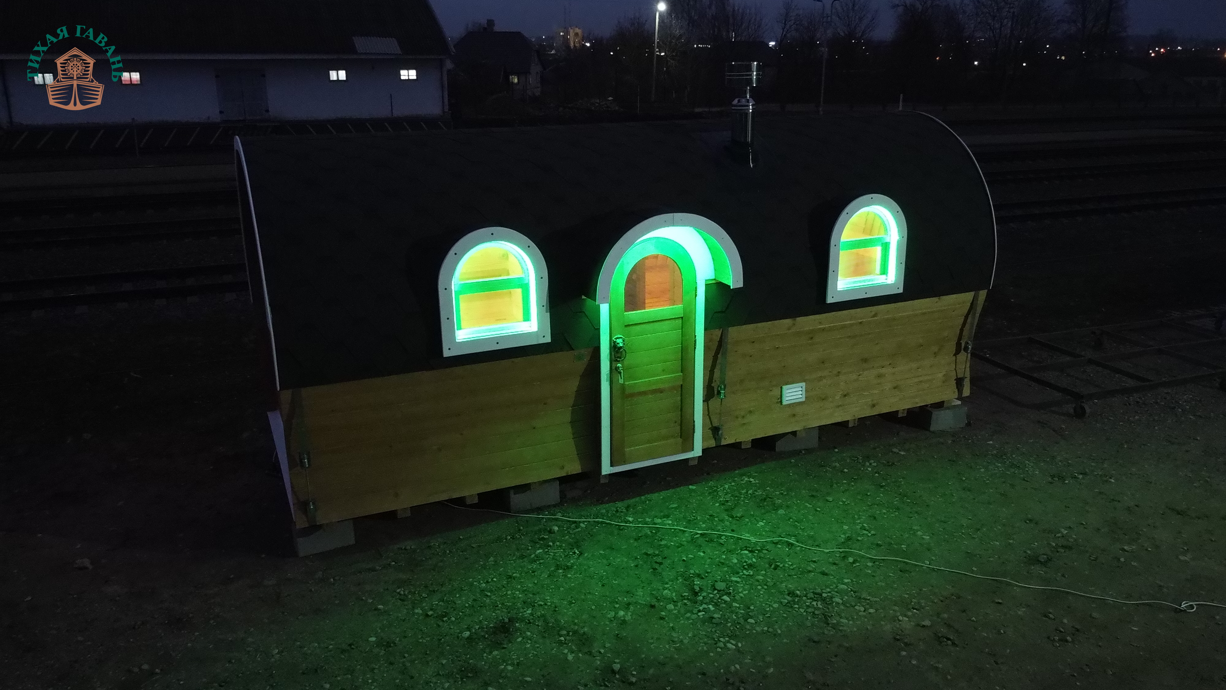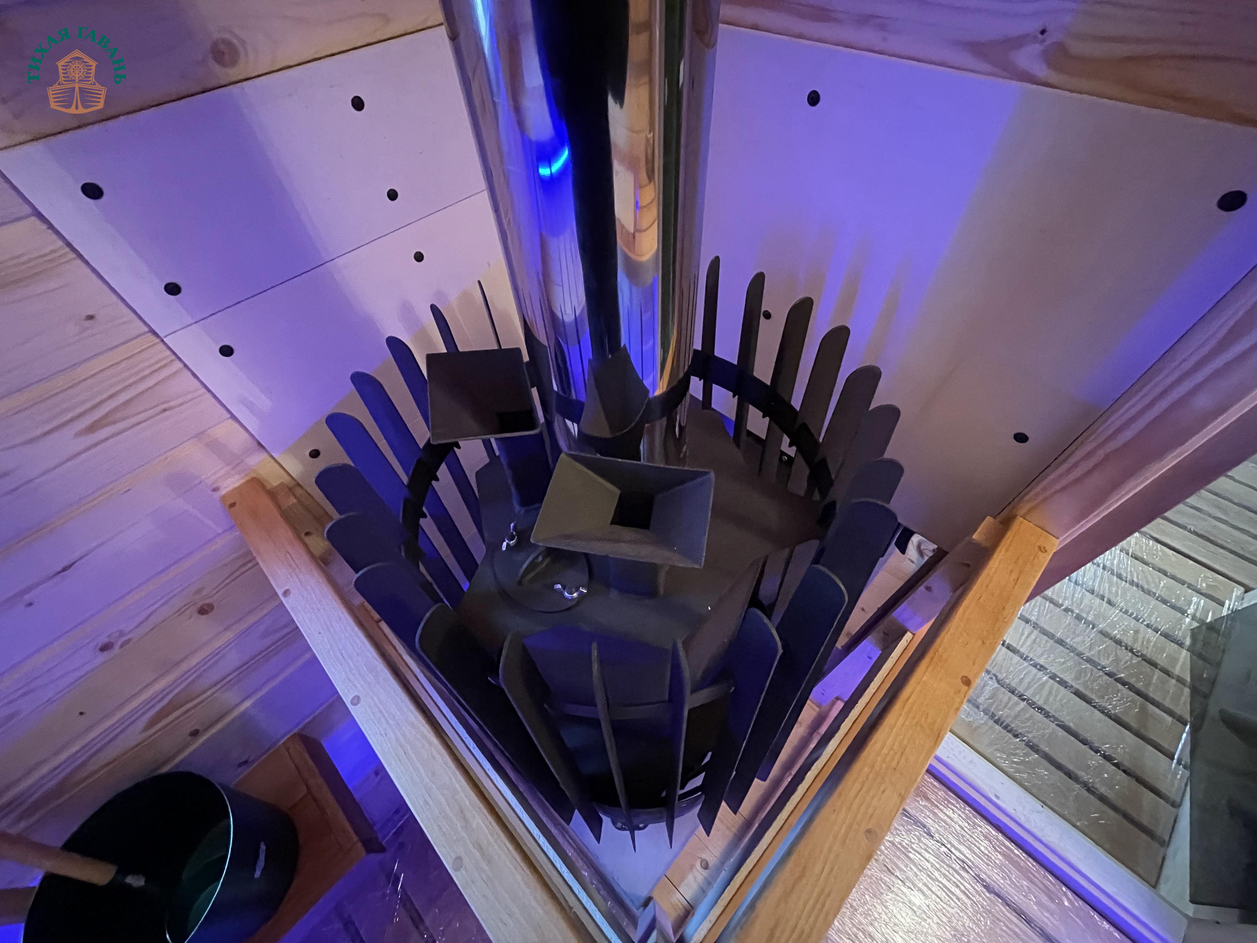 В комнате отдыха: стол трансформер длиною 1300 мм. Скамейки с подъемными крышками и ящиками для хранения. Две спинки. Душевой уголок с поддоном из стеклопластика и шторкой. Смеситель и лейка. Бойлер на 50 л. (горизонтальный). Ввод воды под быстросъем (краник, трубы, быстросъем). Полочка над окном. Две полки по обе стороны возле окна. В парной двойной пол с уклоном, с желобом из нержавеющей стали. Полки расположены на разном уровне. Дополнительный полок (400 мм) выдвижной. Две спинки. Вентклапан. Регулируется путем откручивания. Защита вокруг печи. Полочка под запарник. Обручи из нержавеющей стали с саморегулирующимися замками.