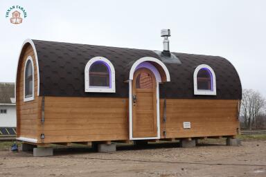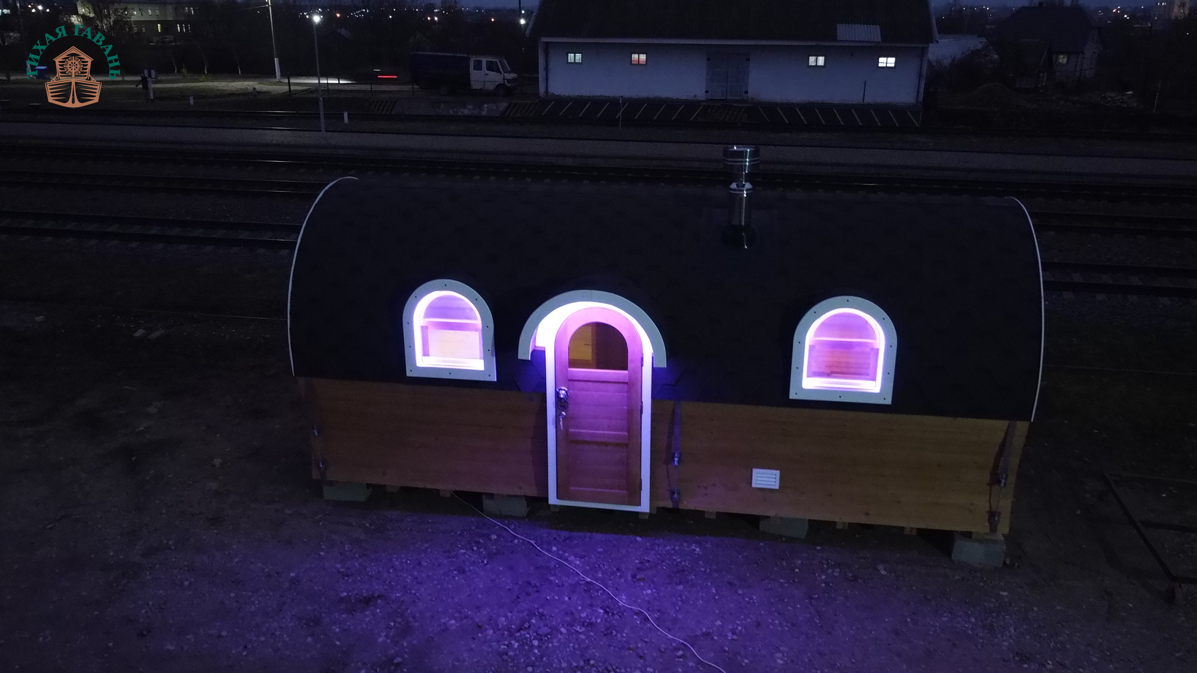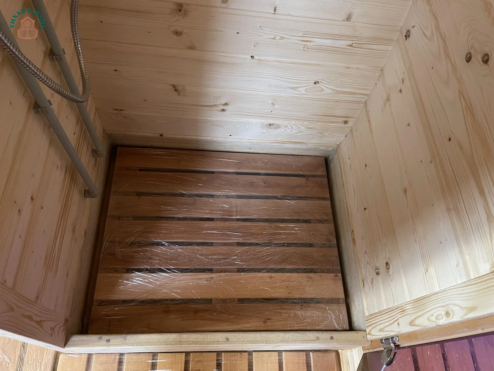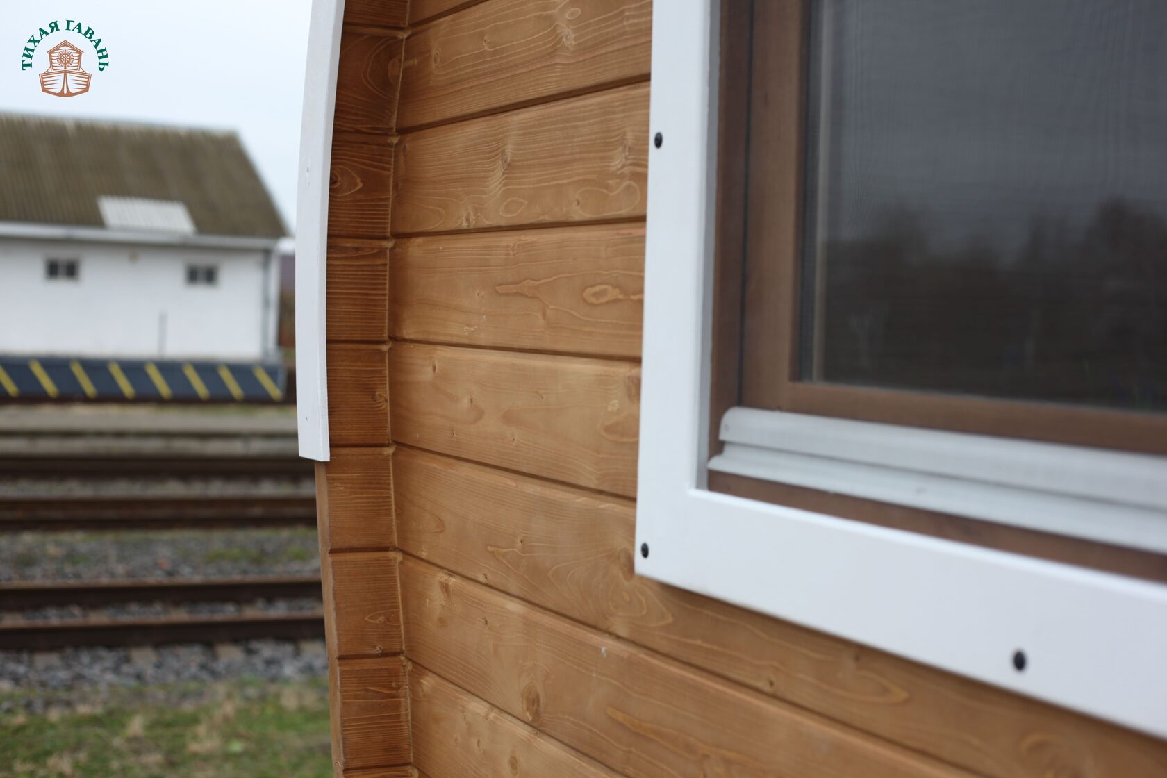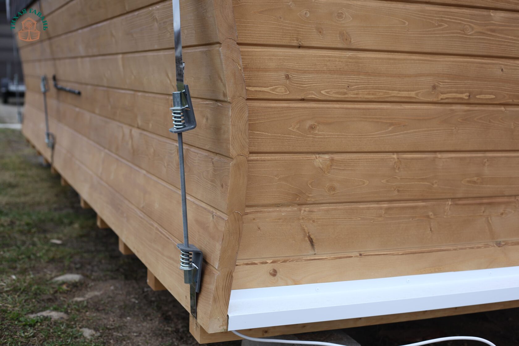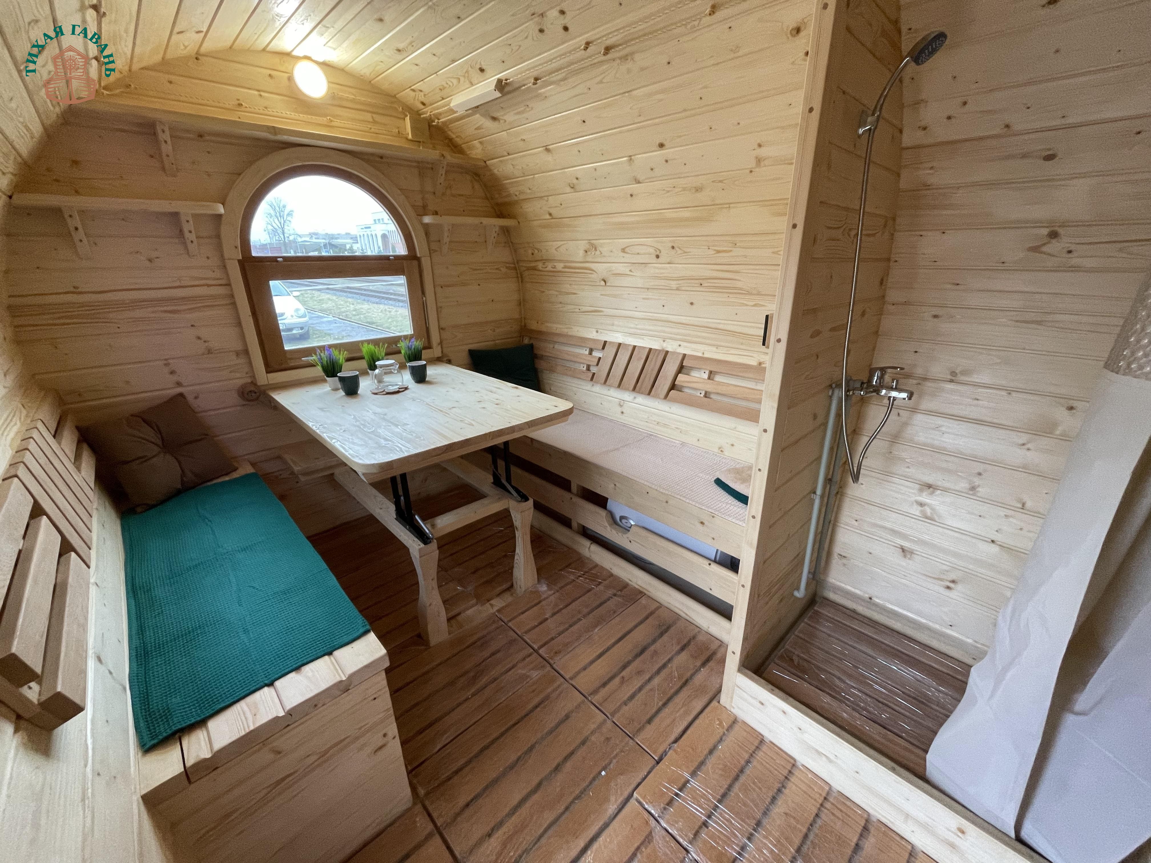 В комнате отдыха: стол трансформер длиною 1300 мм. Скамейки с подъемными крышками и ящиками для хранения. Две спинки. Душевой уголок с поддоном из стеклопластика и шторкой. Смеситель и лейка. Бойлер на 50 л. (горизонтальный). Ввод воды под быстросъем (краник, трубы, быстросъем). Полочка над окном. Две полки по обе стороны возле окна. В парной двойной пол с уклоном, с желобом из нержавеющей стали. Полки расположены на разном уровне. Дополнительный полок (400 мм) выдвижной. Две спинки. Вентклапан. Регулируется путем откручивания. Защита вокруг печи. Полочка под запарник. Обручи из нержавеющей стали с саморегулирующимися замками.