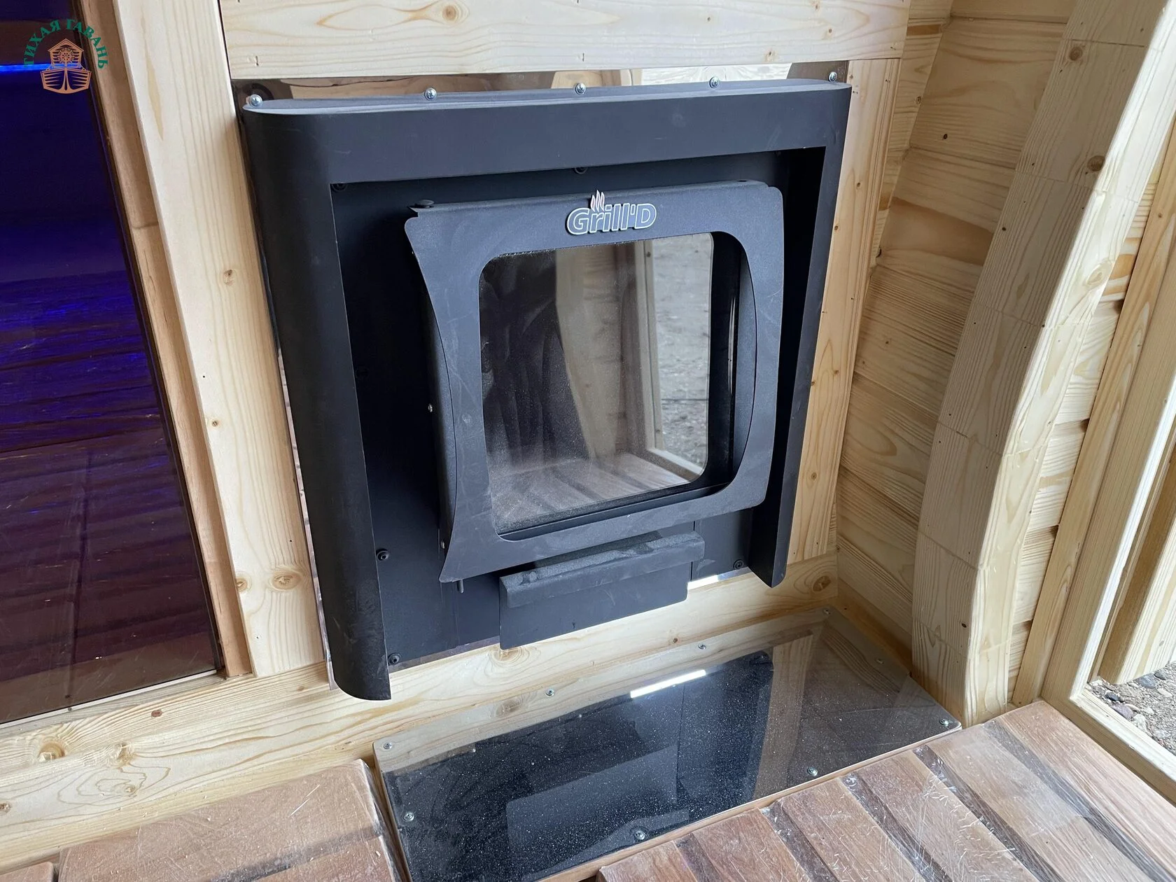 GRILL'D COMETA 180 VEGA WINDOW MAX с выносной топкой в комнату отдыха. Габбро-диабаз колотый.