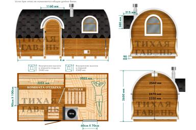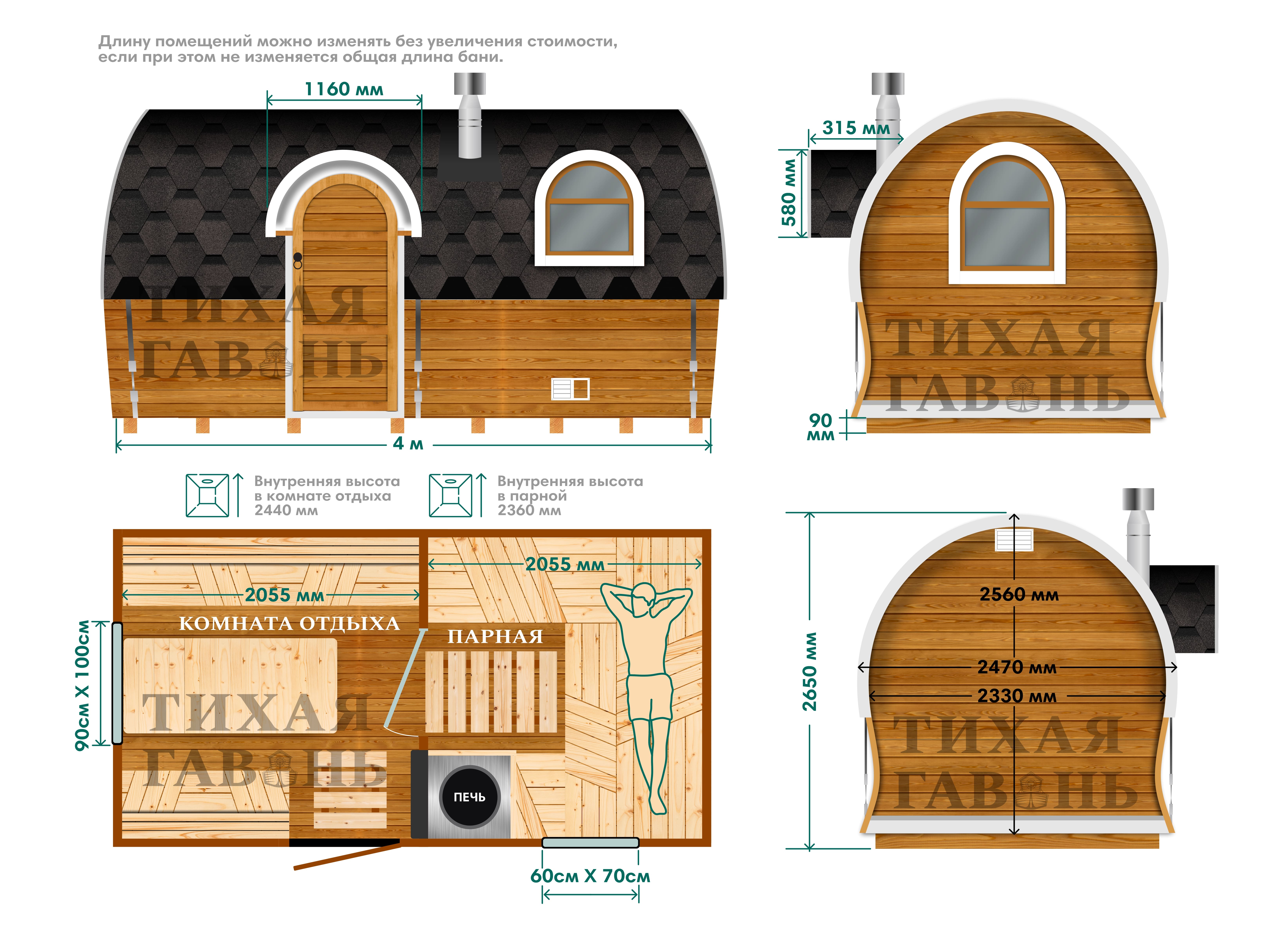 Внутри предусмотрены два помещения - комната отдыха и парная. В комнате отдыха возможно встроить душ со шторкой или отделить его стеклянной дверью. Компоновка подбирается под задачи участка без изменения внешних габаритов.