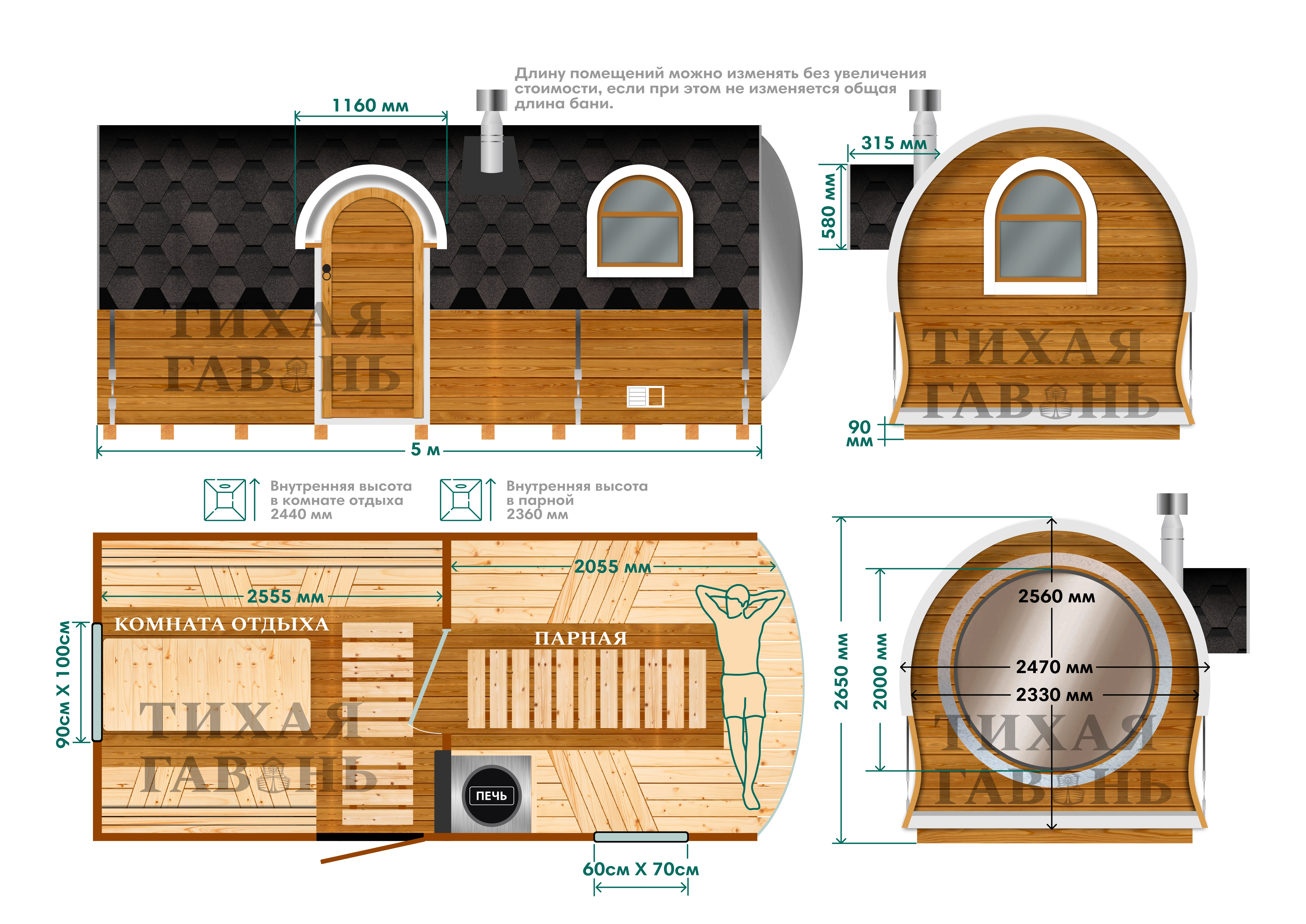Баня Сундук Премиум Сфера 5 м создана на базе модели Сундук Премиум с увеличенной длиной корпуса. За основу взята фирменная форма с шириной 2,47 м и высотой 2,56 м, после чего в парной установлено выпуклое панорамное окно.