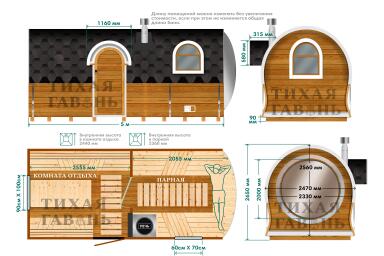 Баня рассчитана на комфортный отдых 4-6 человек. Модель изготавливается компанией Тихая Гавань и относится к авторской линейке с панорамной парной и увеличенными габаритами.