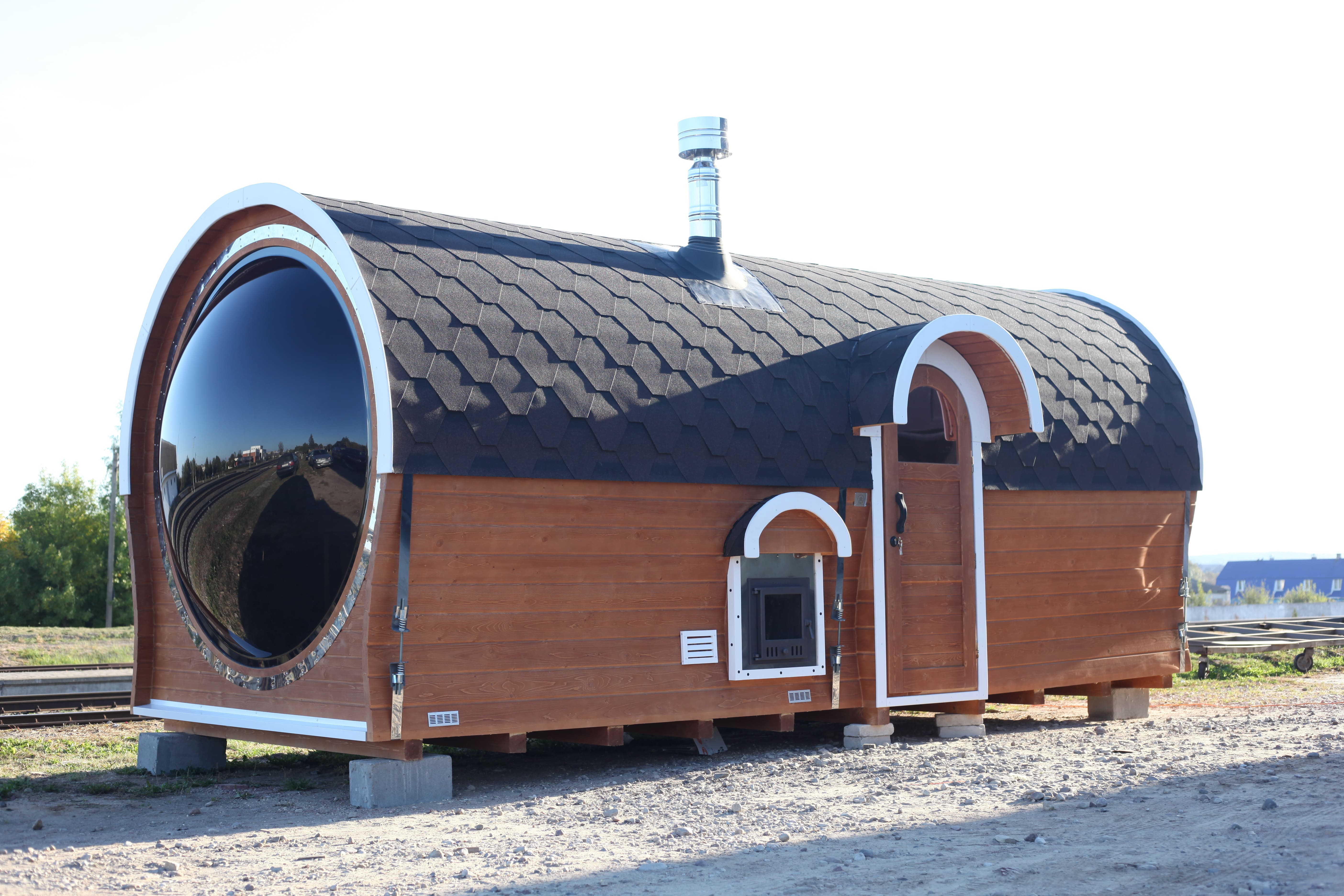 Баня Сундук Премиум Сфера 6 м изготавливается компанией Тихая Гавань и относится к флагманским моделям с увеличенными габаритами и панорамной парной.