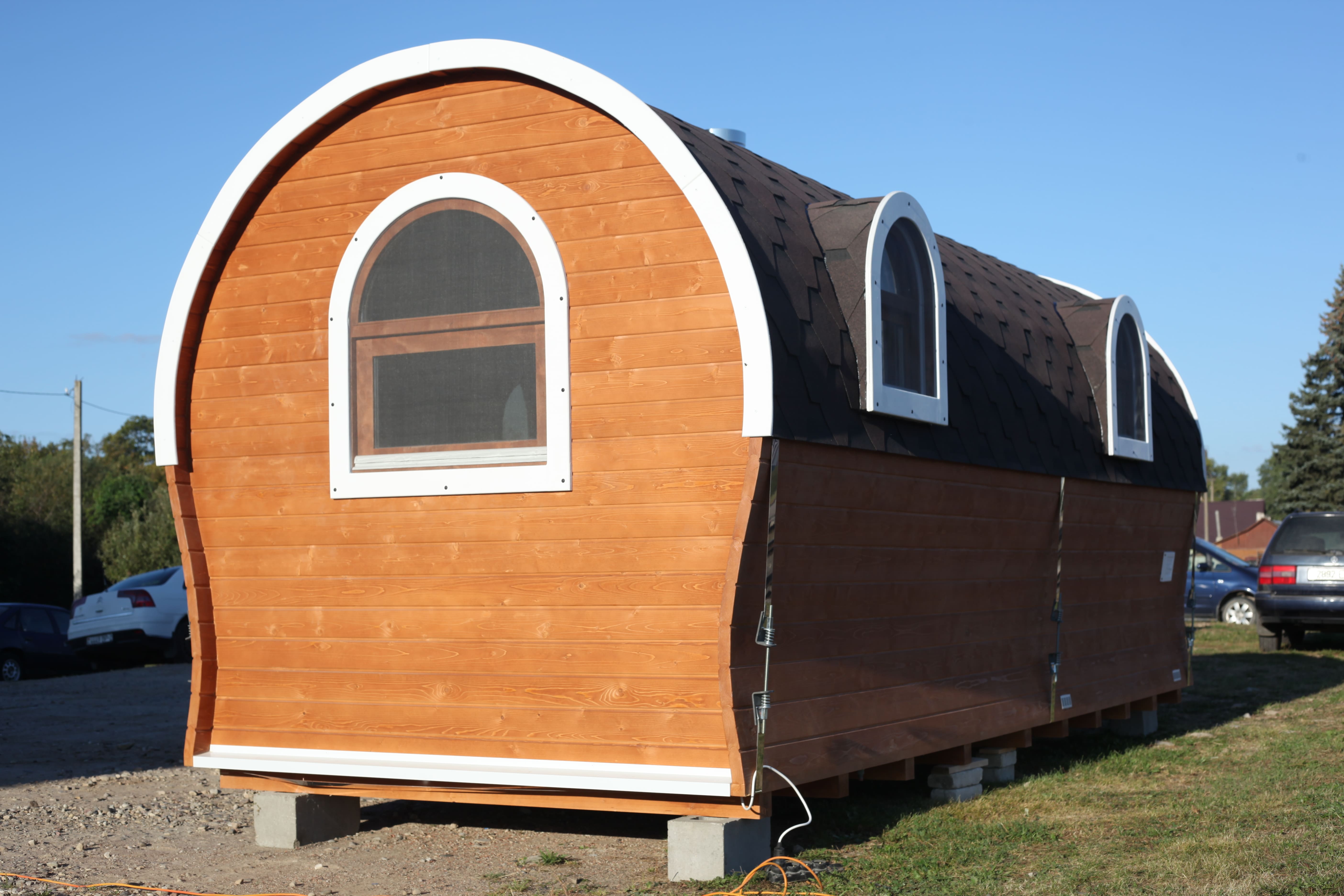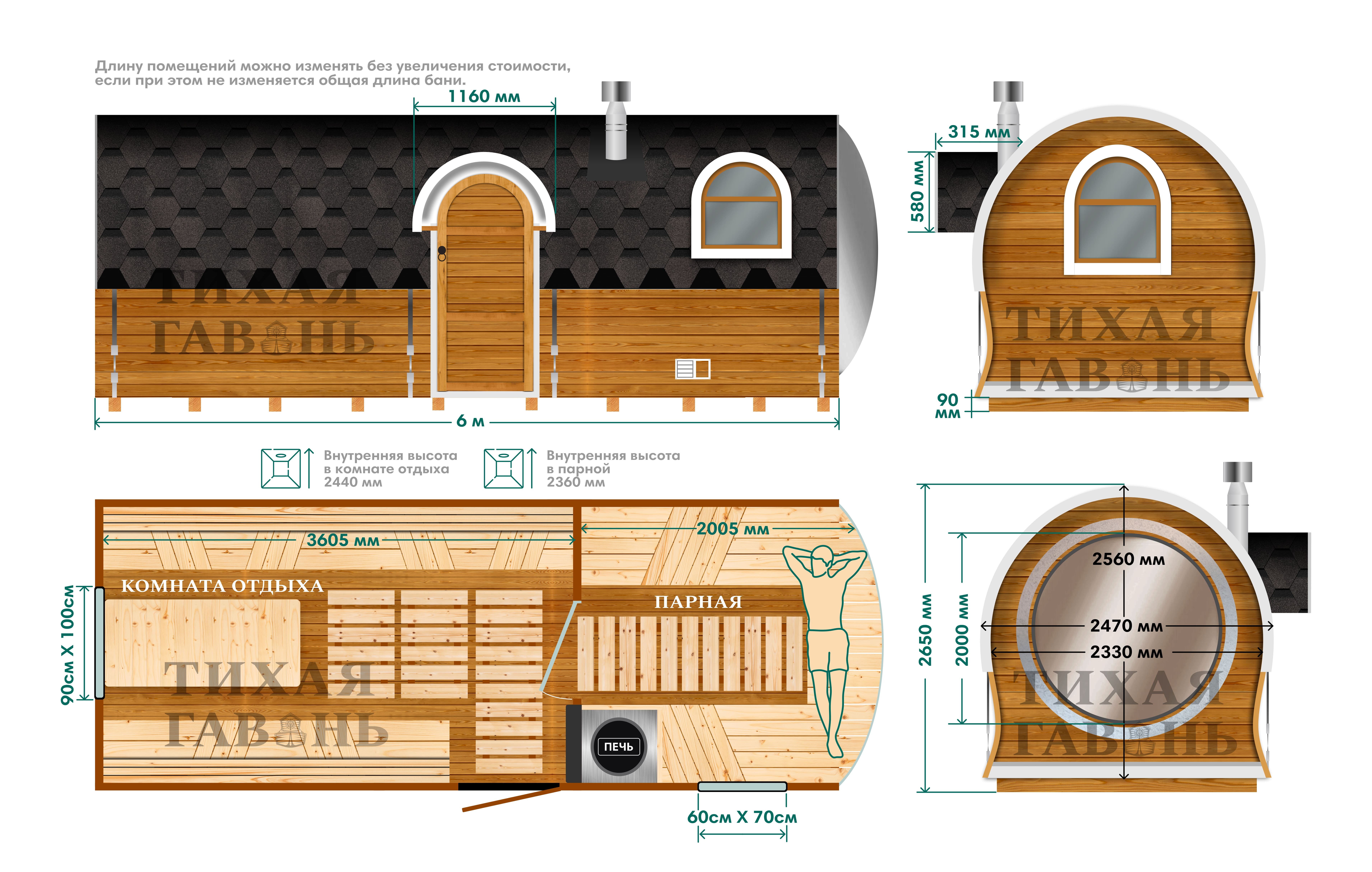 Баня Сундук Премиум Сфера 6 м - самая крупная модель в линейке Сфера. За основу взята форма Сундук Премиум с шириной 2,47 м и высотой 2,56 м, а в парной установлено выпуклое панорамное окно.