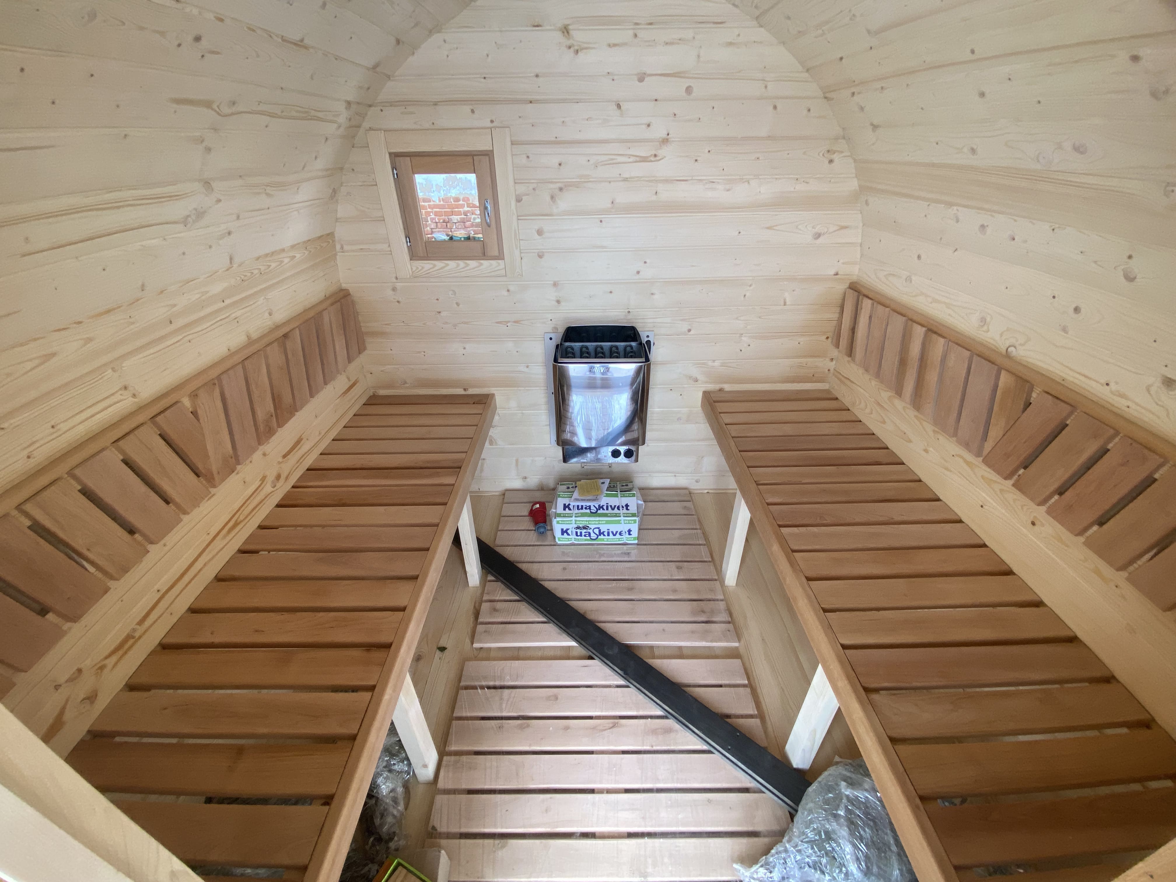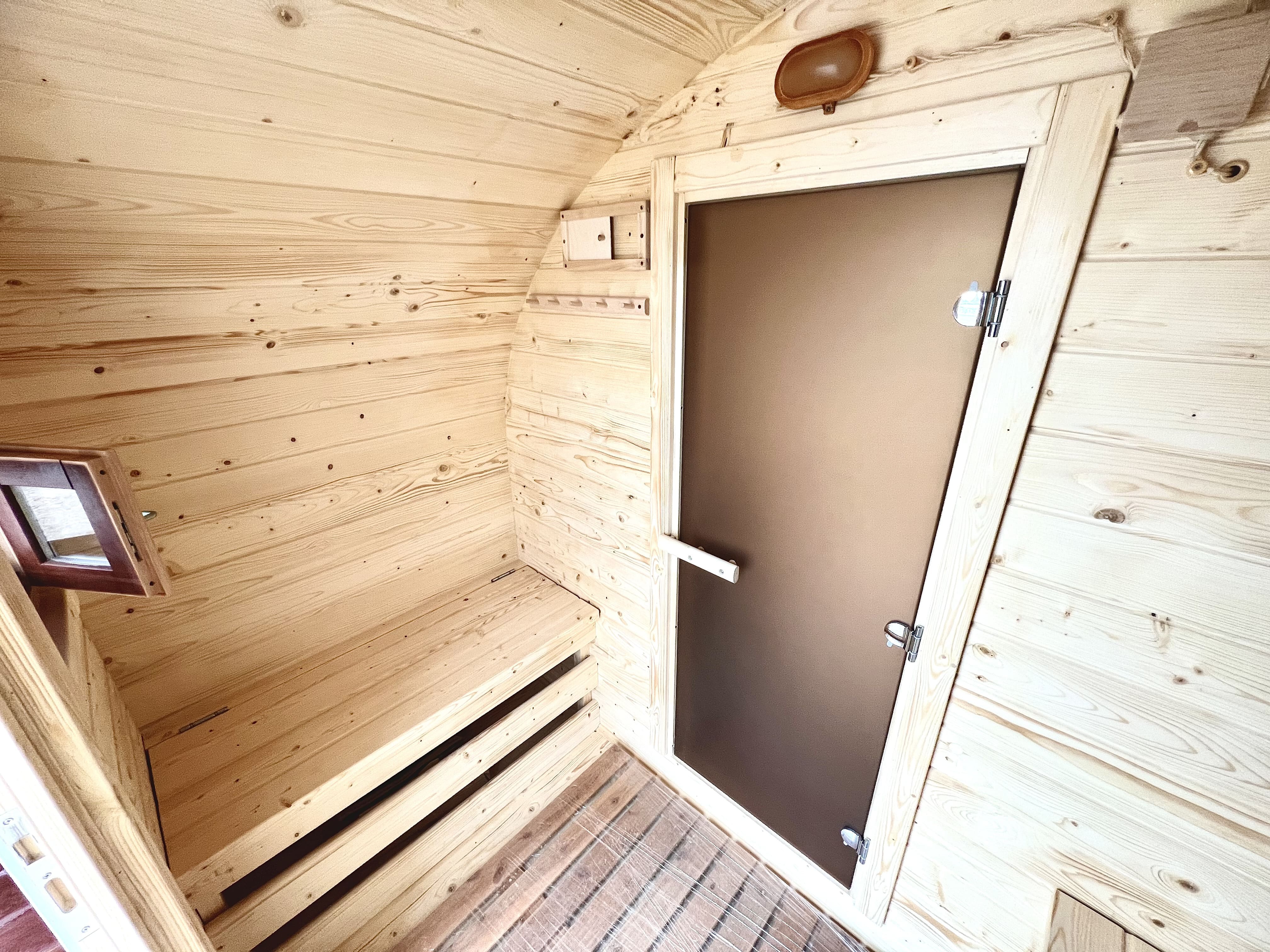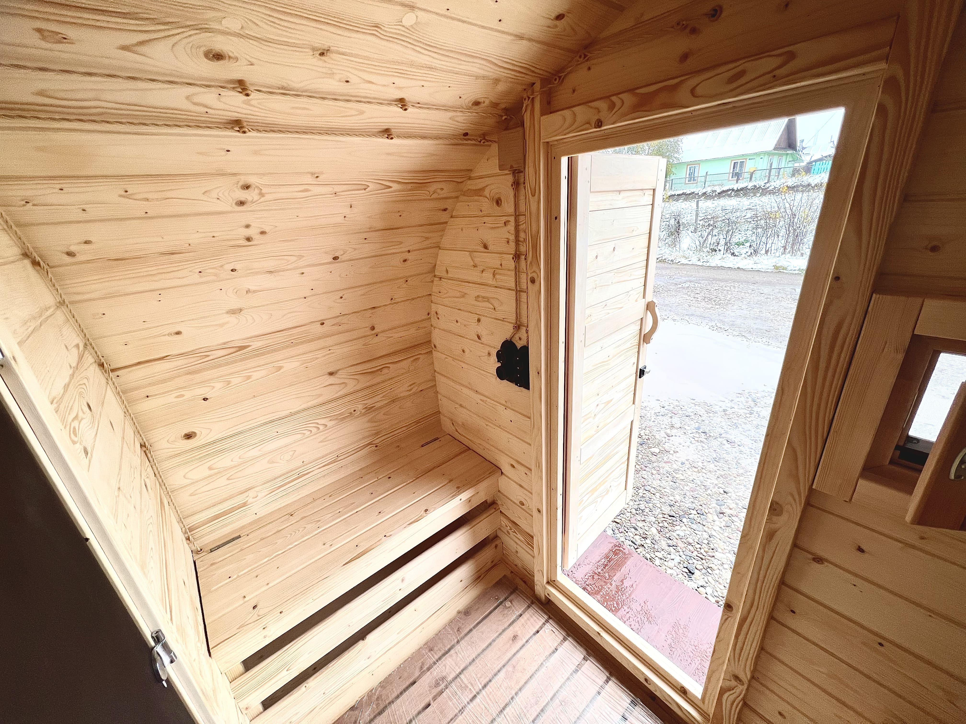 Ровный пол по всей площади облегчает передвижение и расстановку мебели. В комнате отдыха можно организовать зону для переодевания и хранения вещей, а в парной сохраняется достаточный объем воздуха за счет скругленной формы потолка.