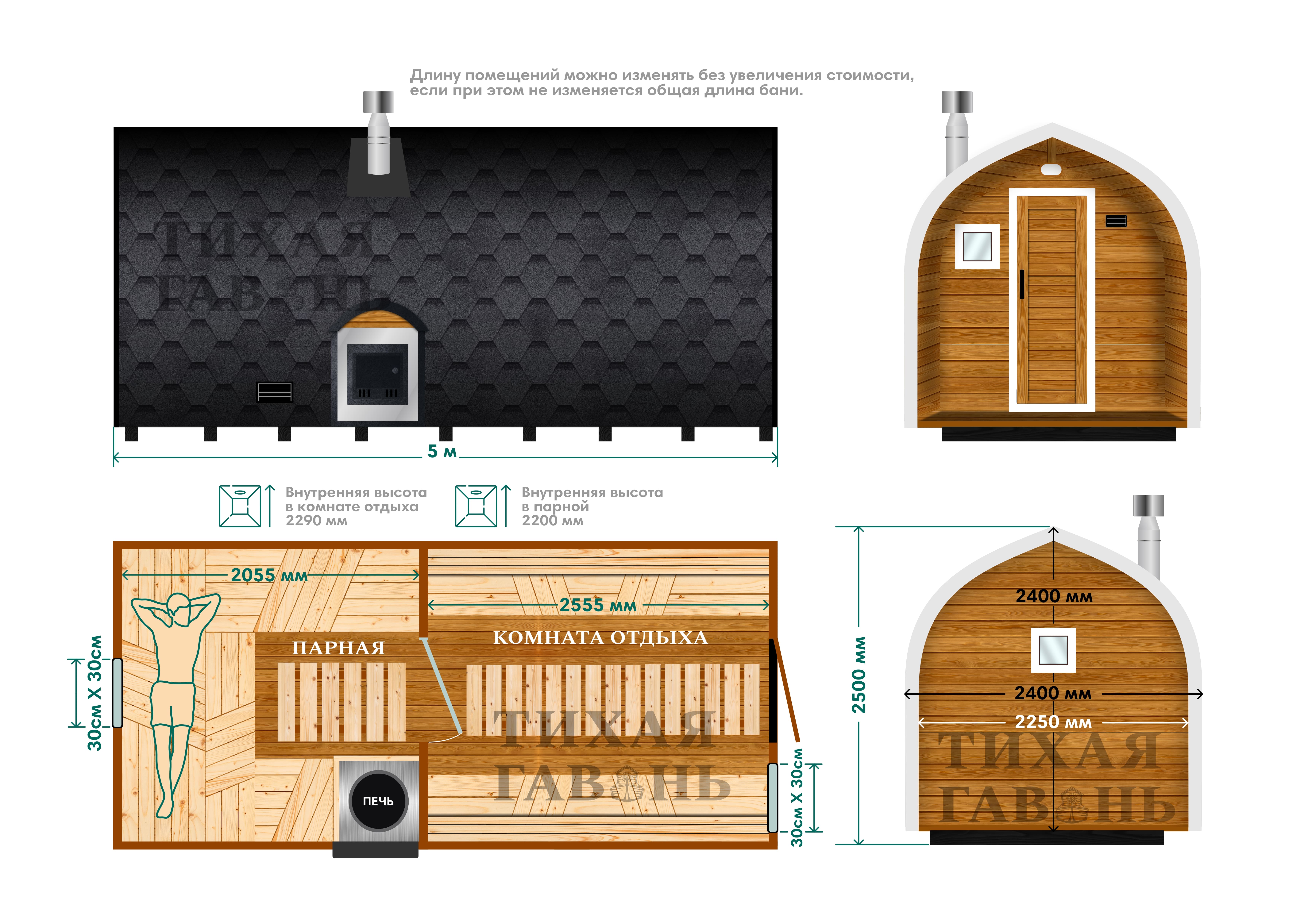 Длина 5 метров дает больше свободы в планировке по сравнению с версиями 3,5 м и 4 м. Внутри можно организовать полноценную комнату отдыха и просторную парную без ощущения тесноты. Модель рассчитана на комфортное размещение 4-6 человек.