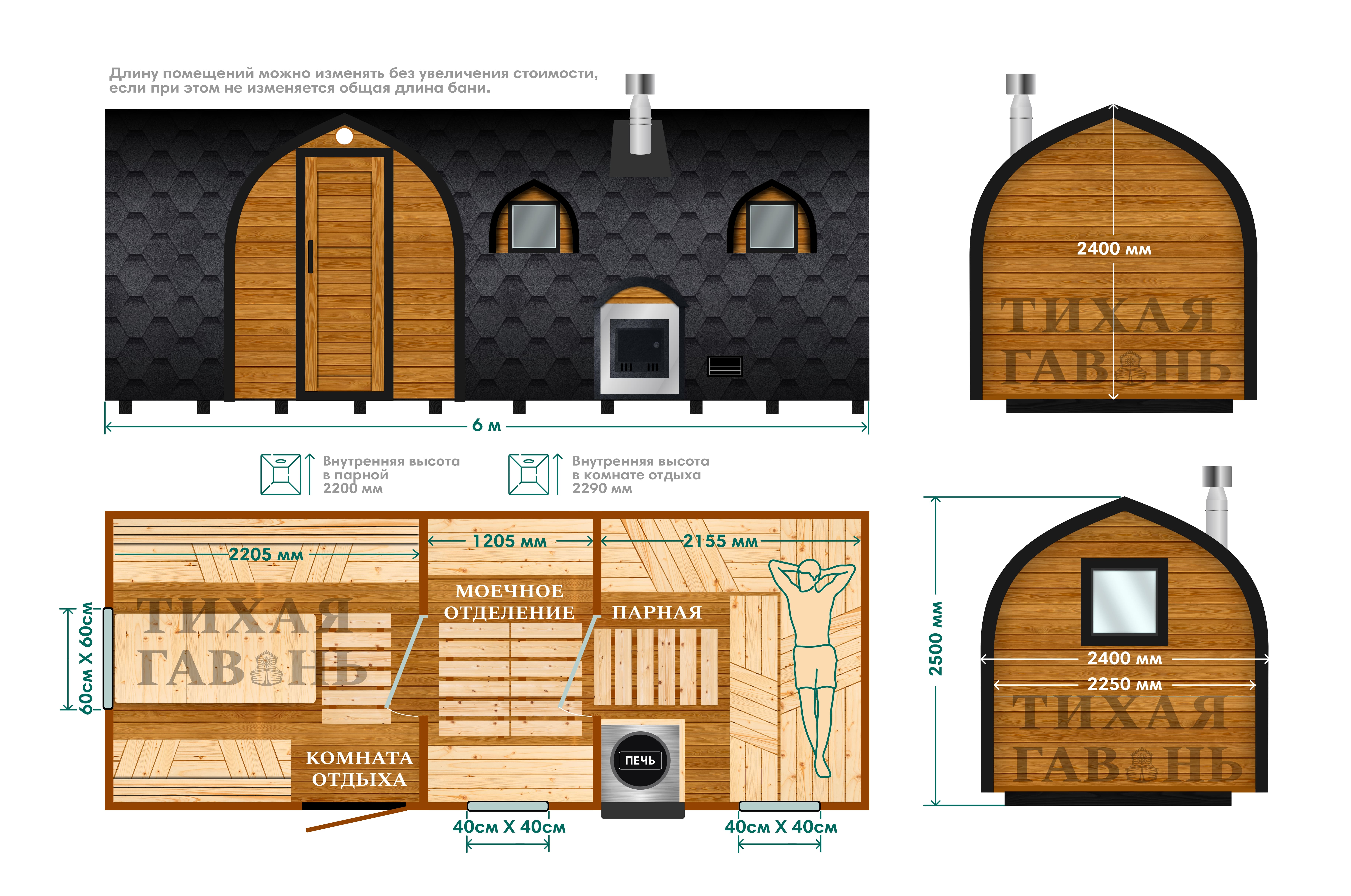 Для данной модели доступны дополнительные опции, включая различные варианты остекления, подсветки, расположения печи и оформления входной зоны. Баня Викинг 6 м изготавливается под заказ с учётом задач участка и выбранной конфигурации.
