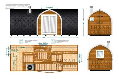 Баня прогревается примерно за 1 час. В зависимости от выбранной печи температура в парной достигает 90-120 градусов. Конструкция доставляется в готовом виде, установка на участке занимает 1 день, после чего баня полностью готова к эксплуатации.