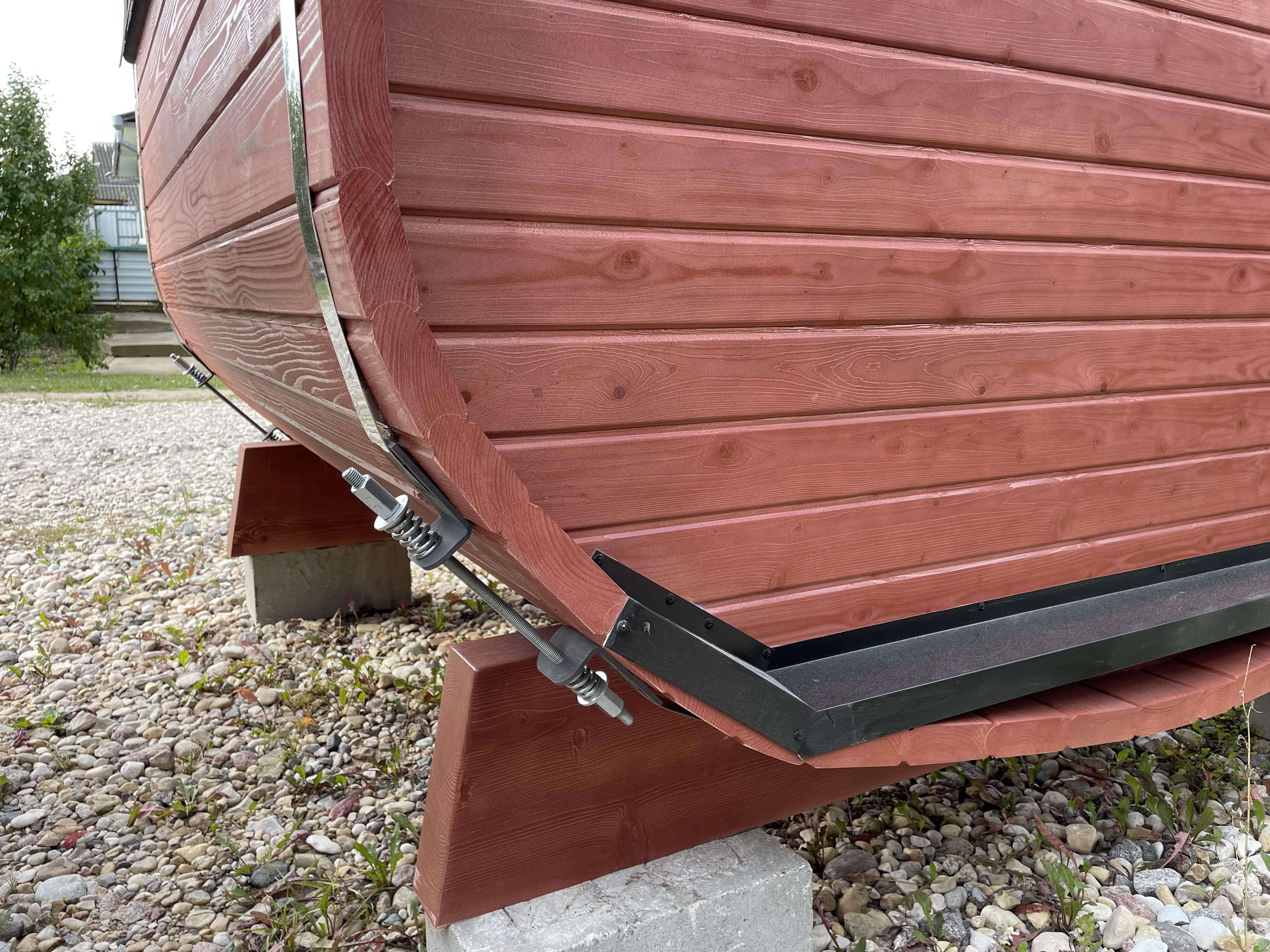 Козырек входит в базовую комплектацию и устанавливается сразу на производстве. Он защищает входную зону от осадков и делает использование бани удобнее в любое время года. Баня не требует регистрации и капитального фундамента, установка выполняется на подготовленное основание, после чего баня готова к эксплуатации.