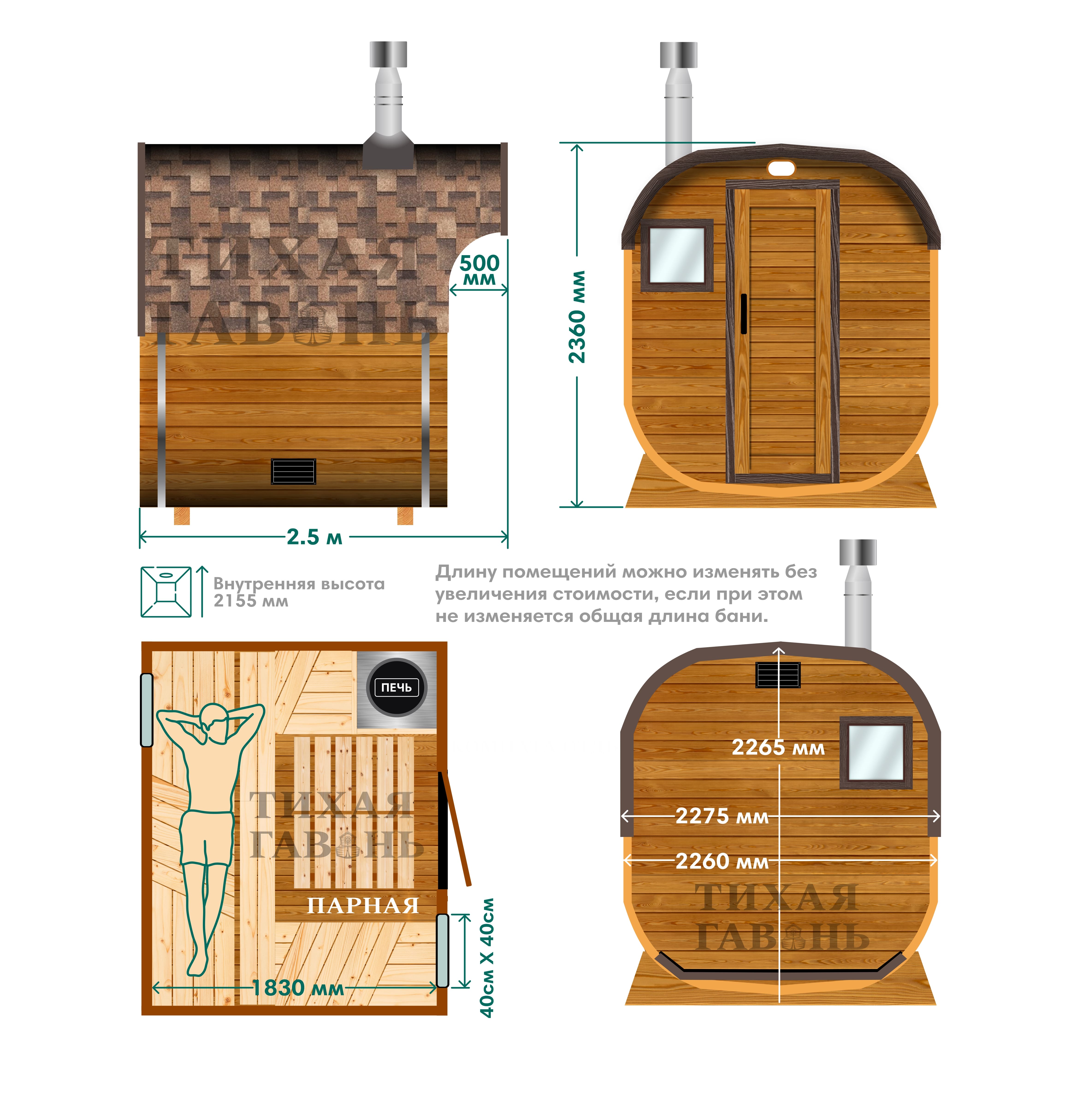 Модель изготавливается только в стандартных габаритах. Ширина бани составляет 2,27 м, высота – 2,36 м. Увеличение размеров в серии квадро не применяется, что позволяет сохранять проверенную конструкцию и стабильные эксплуатационные характеристики.