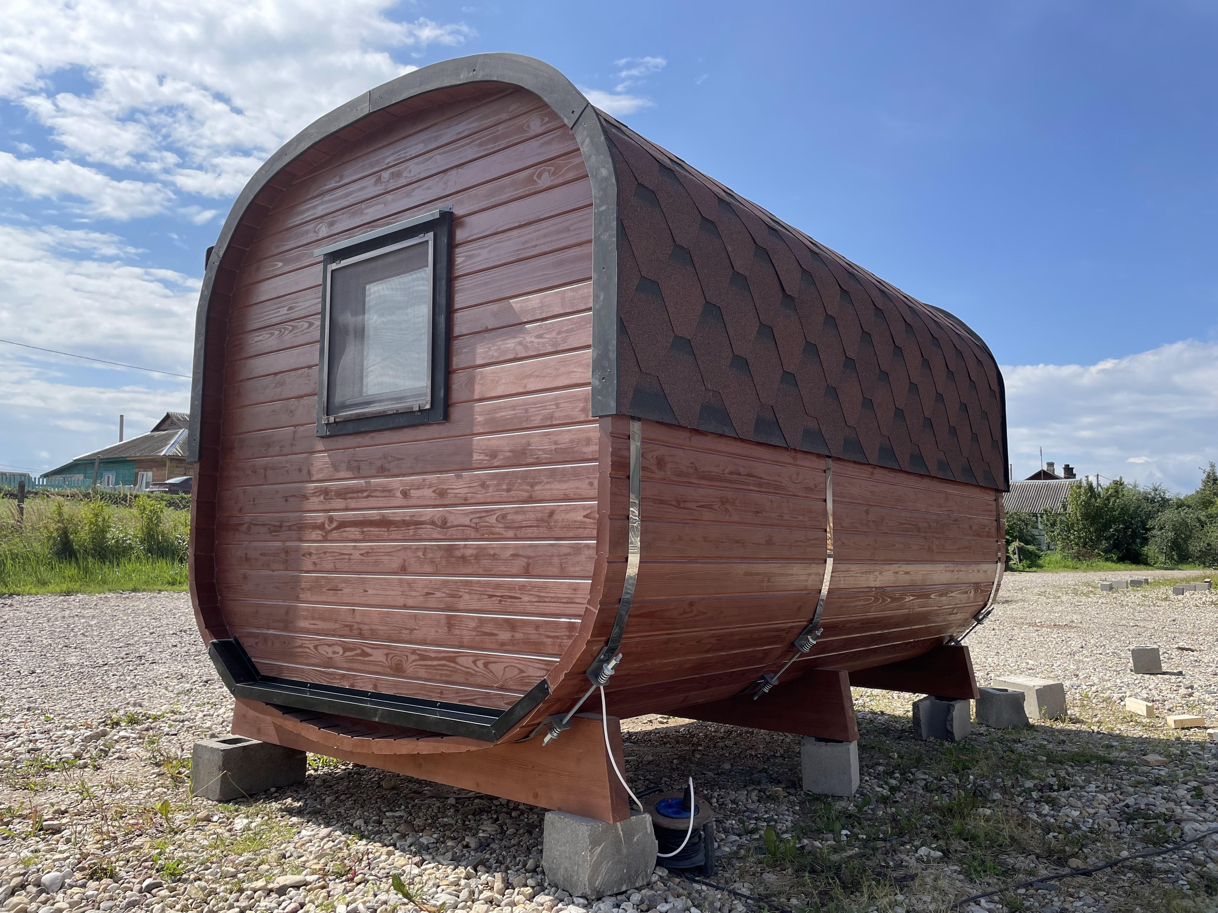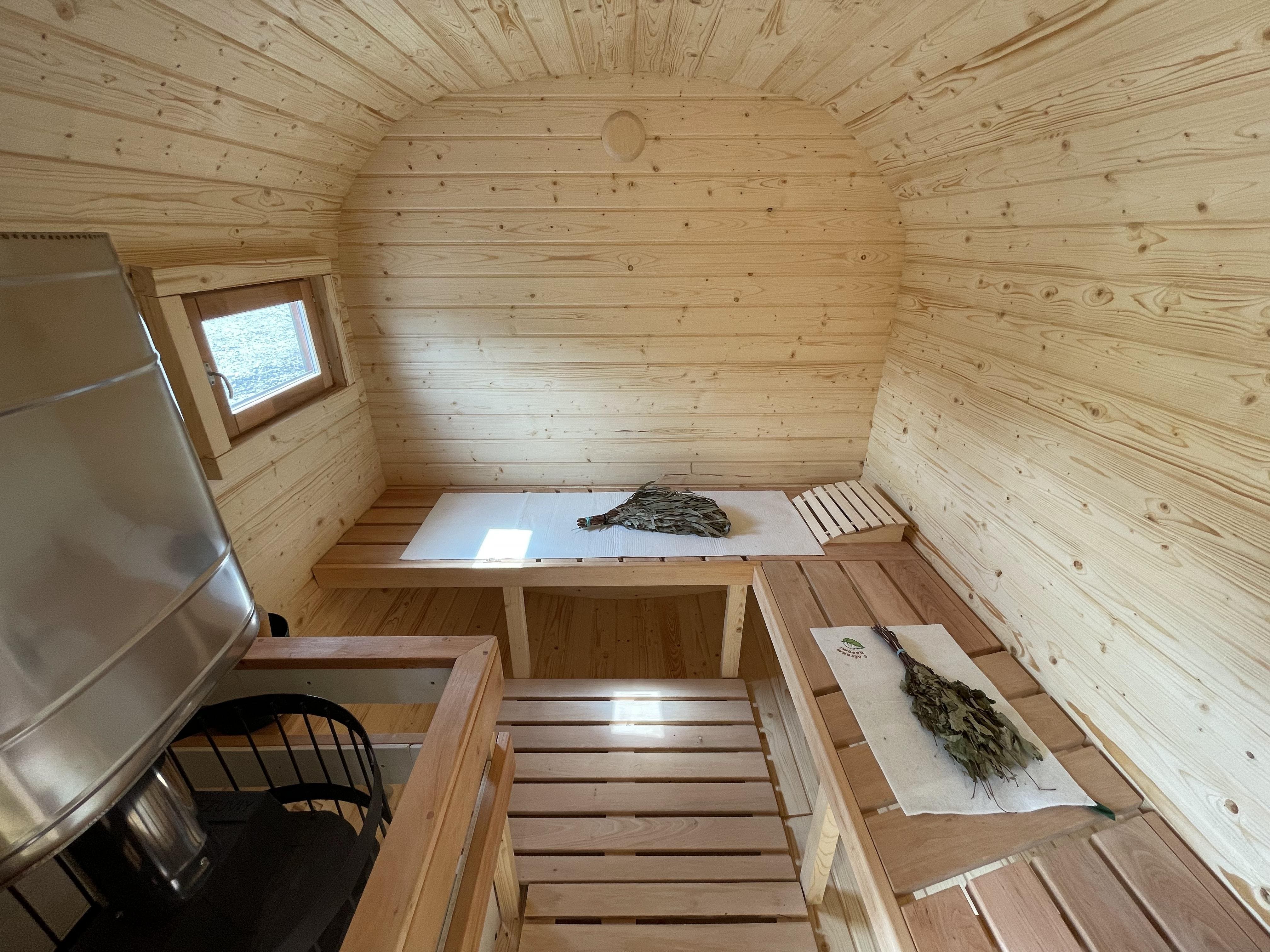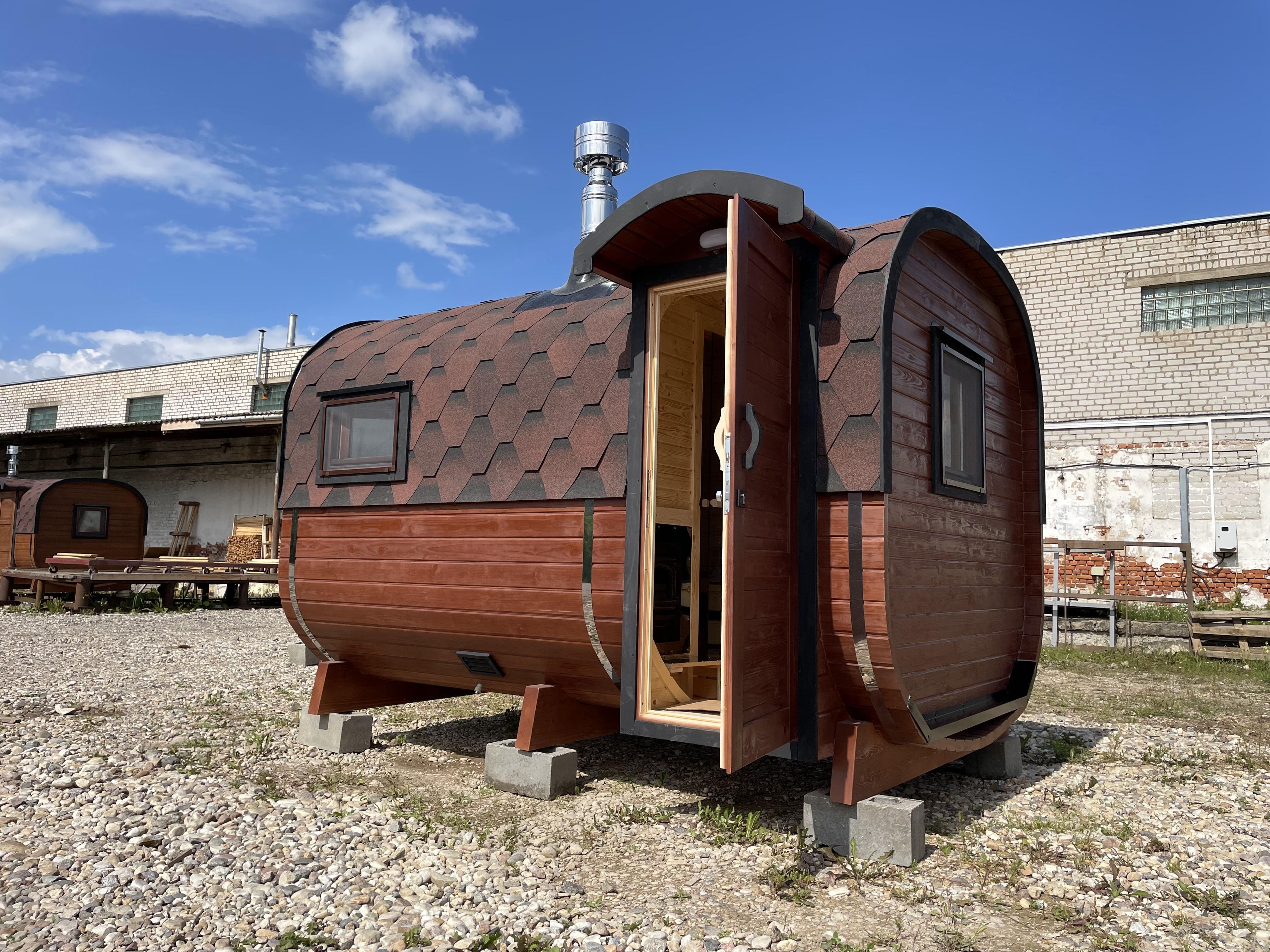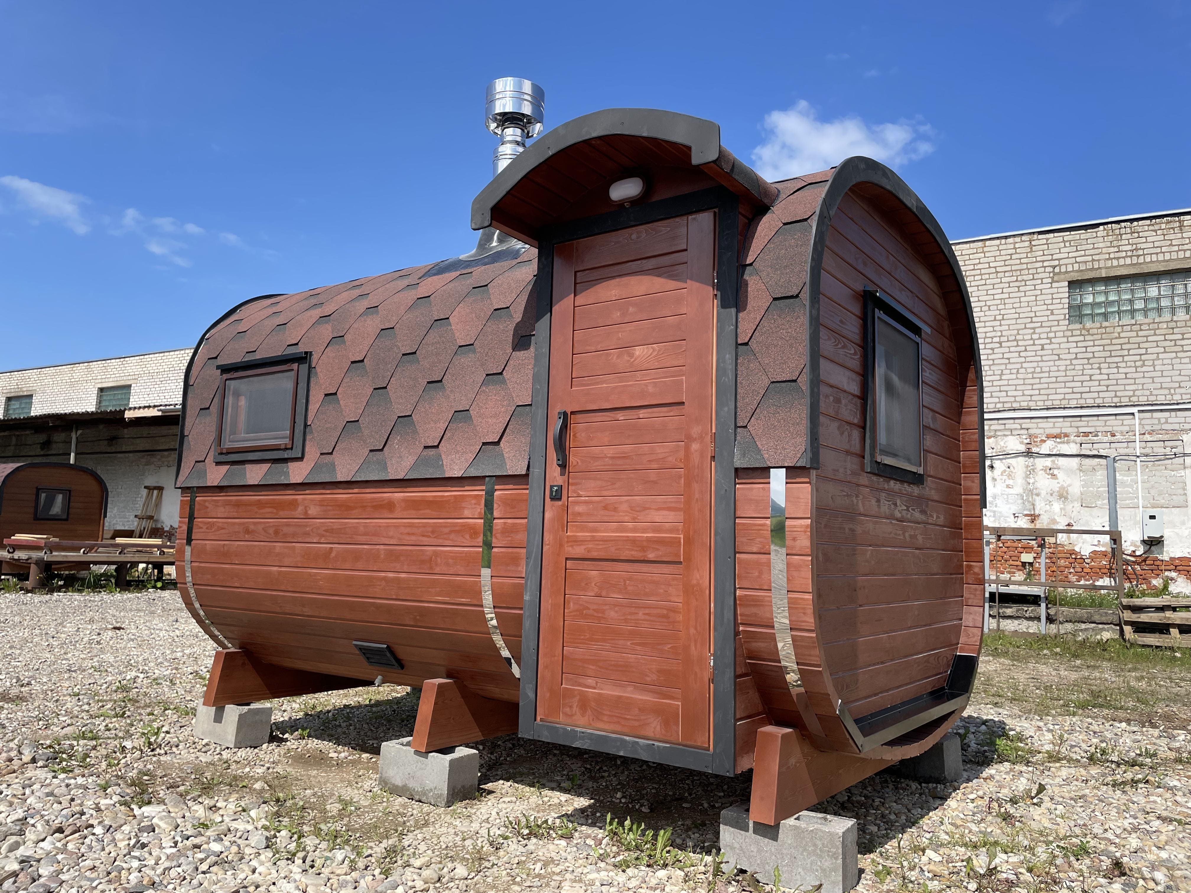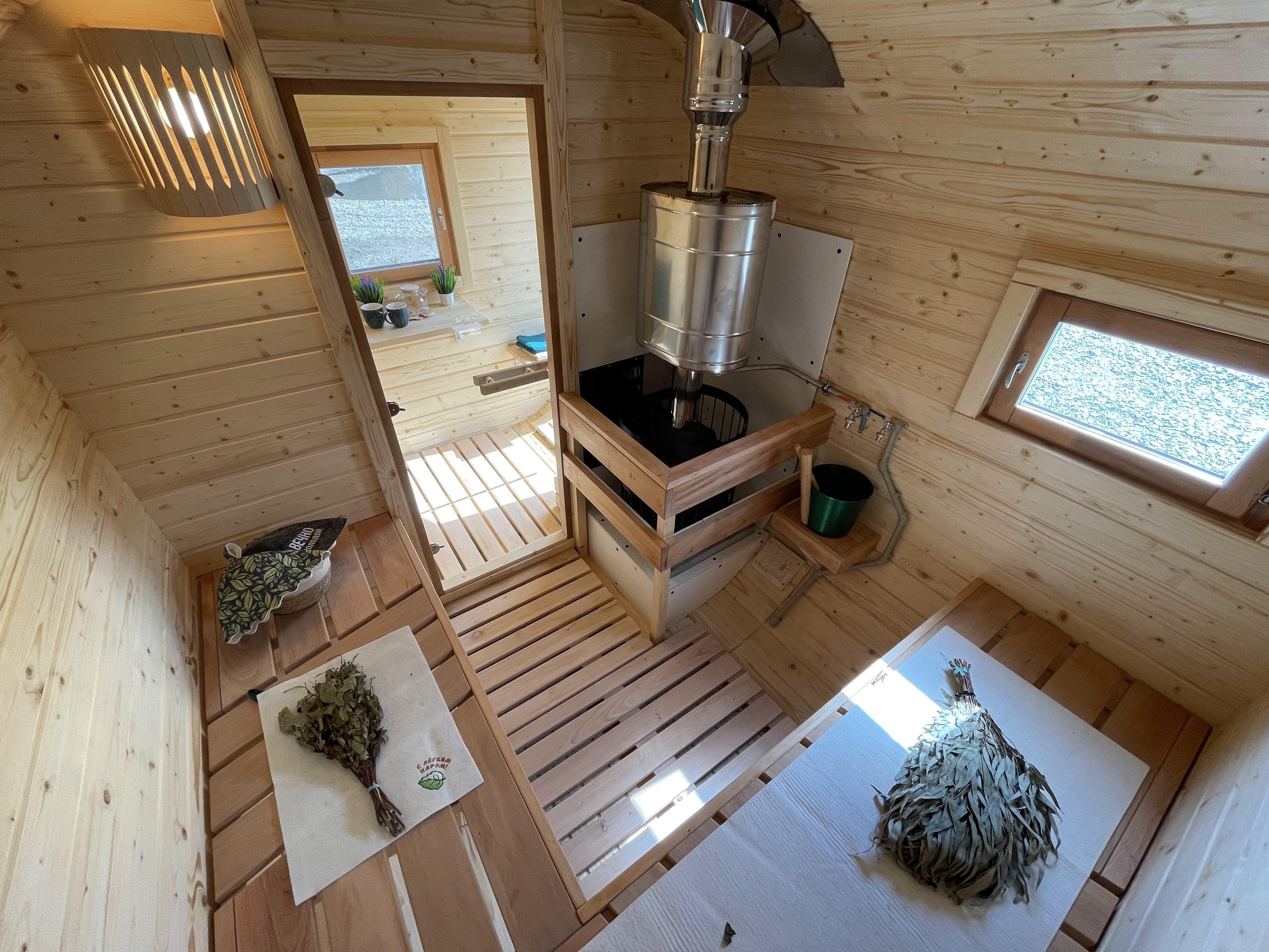 Баня быстро выходит на рабочую температуру за счёт компактного объёма. Прогрев занимает от 40 минут до 1 часа в зависимости от сезона и выбранной печи. Возможна установка дровяной или электрической печи.