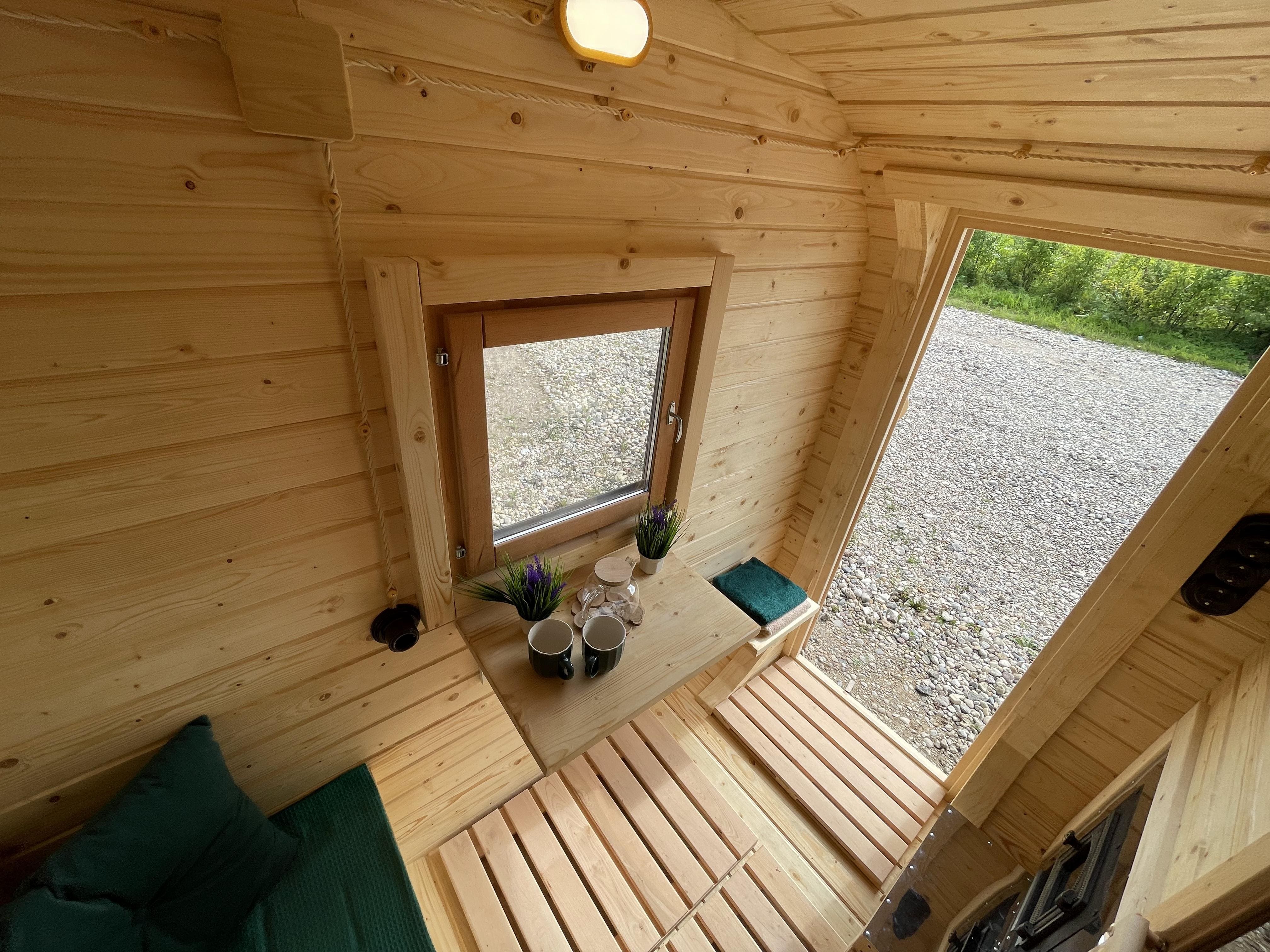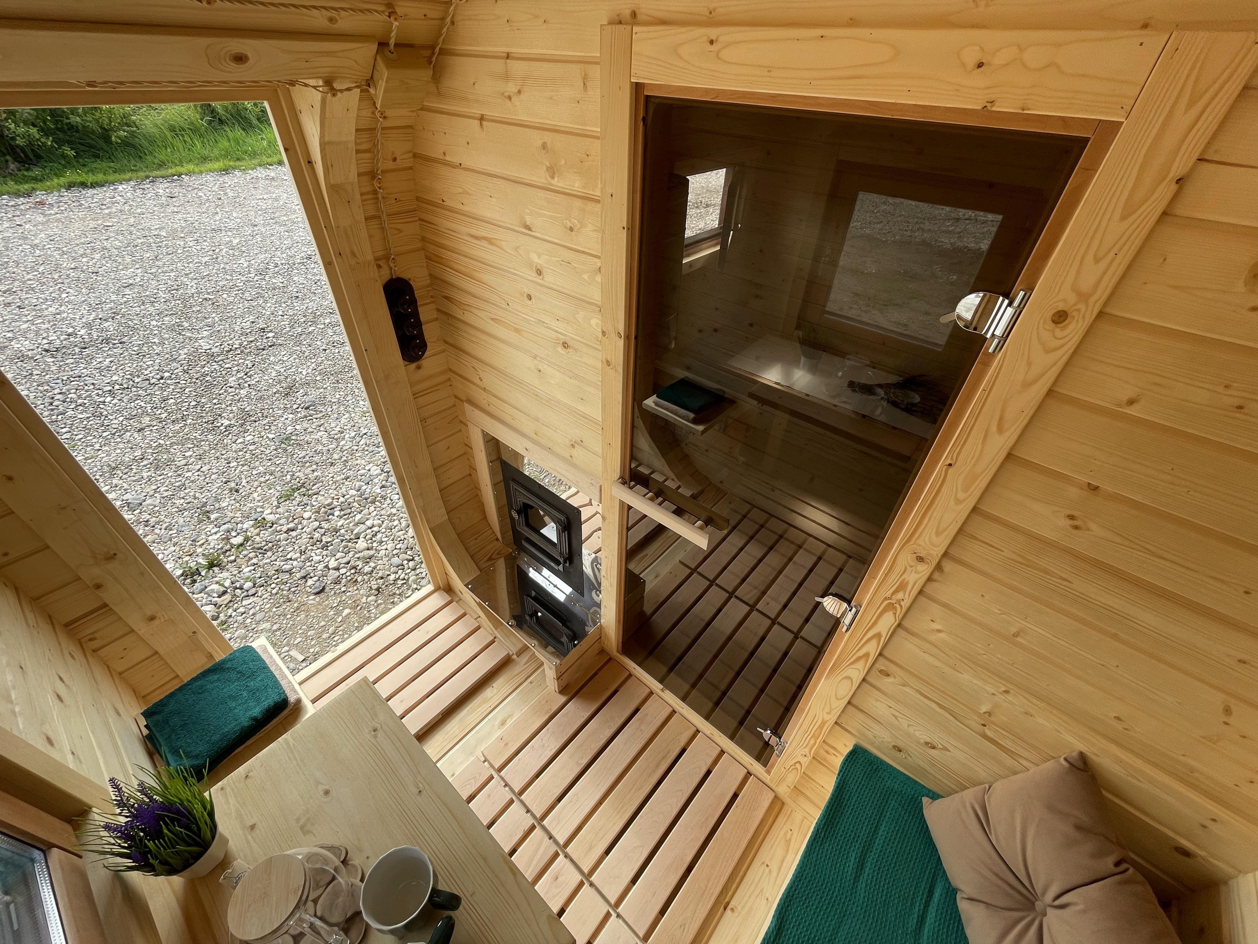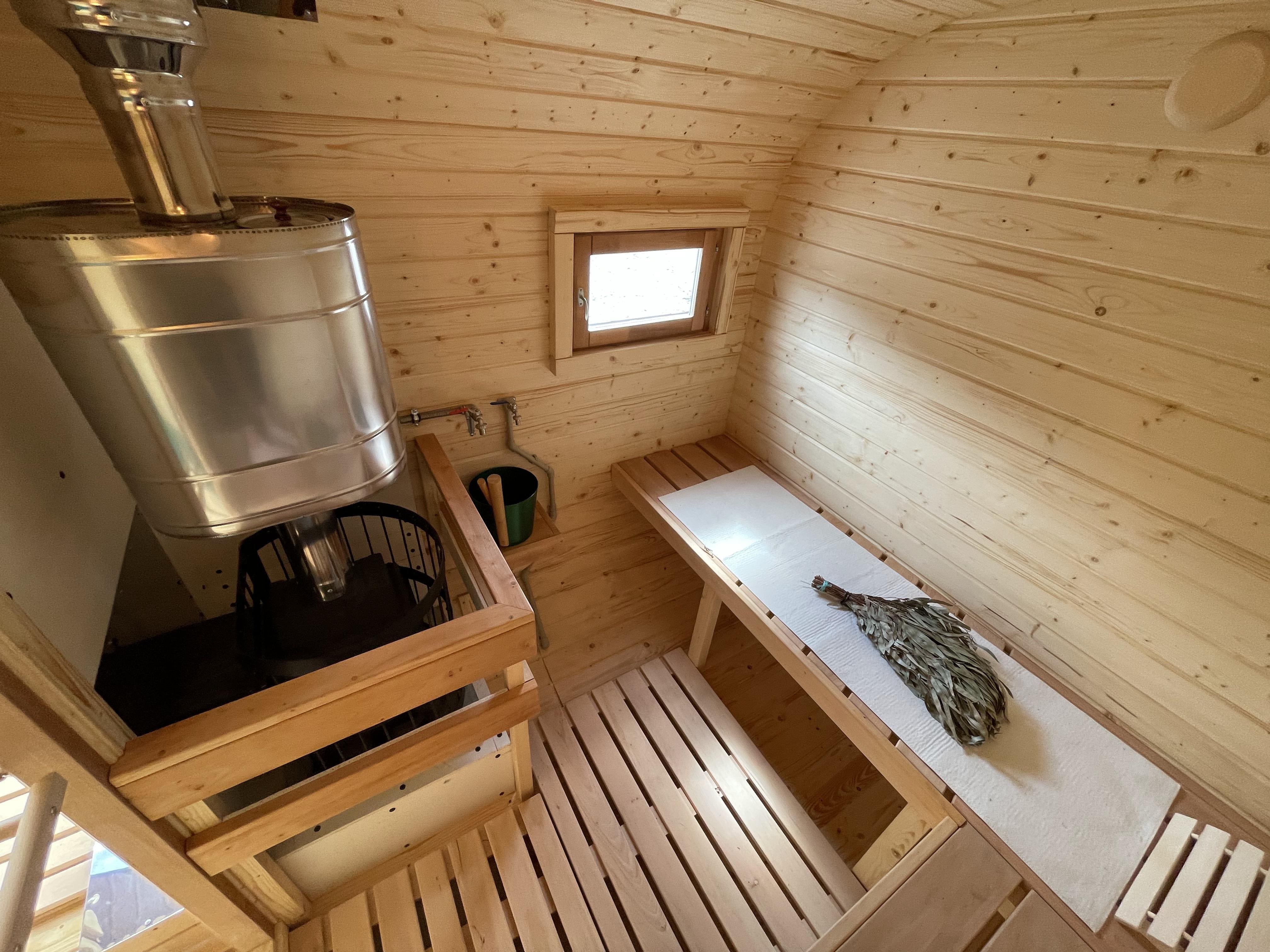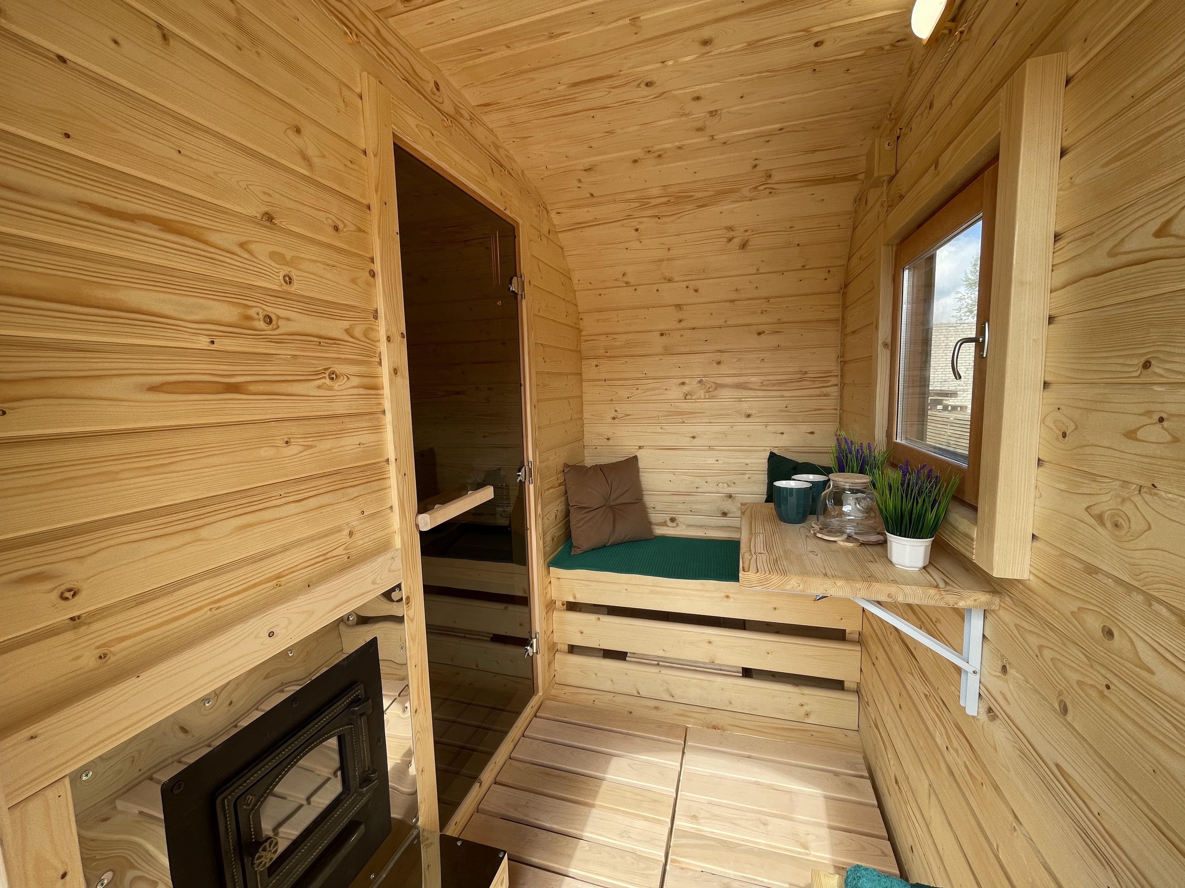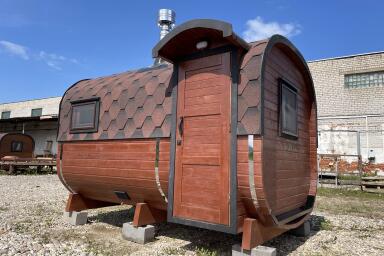 Баня быстро выходит на рабочую температуру за счёт компактного объёма. Прогрев занимает от 40 минут до 1 часа в зависимости от сезона и выбранной печи. Возможна установка дровяной или электрической печи.