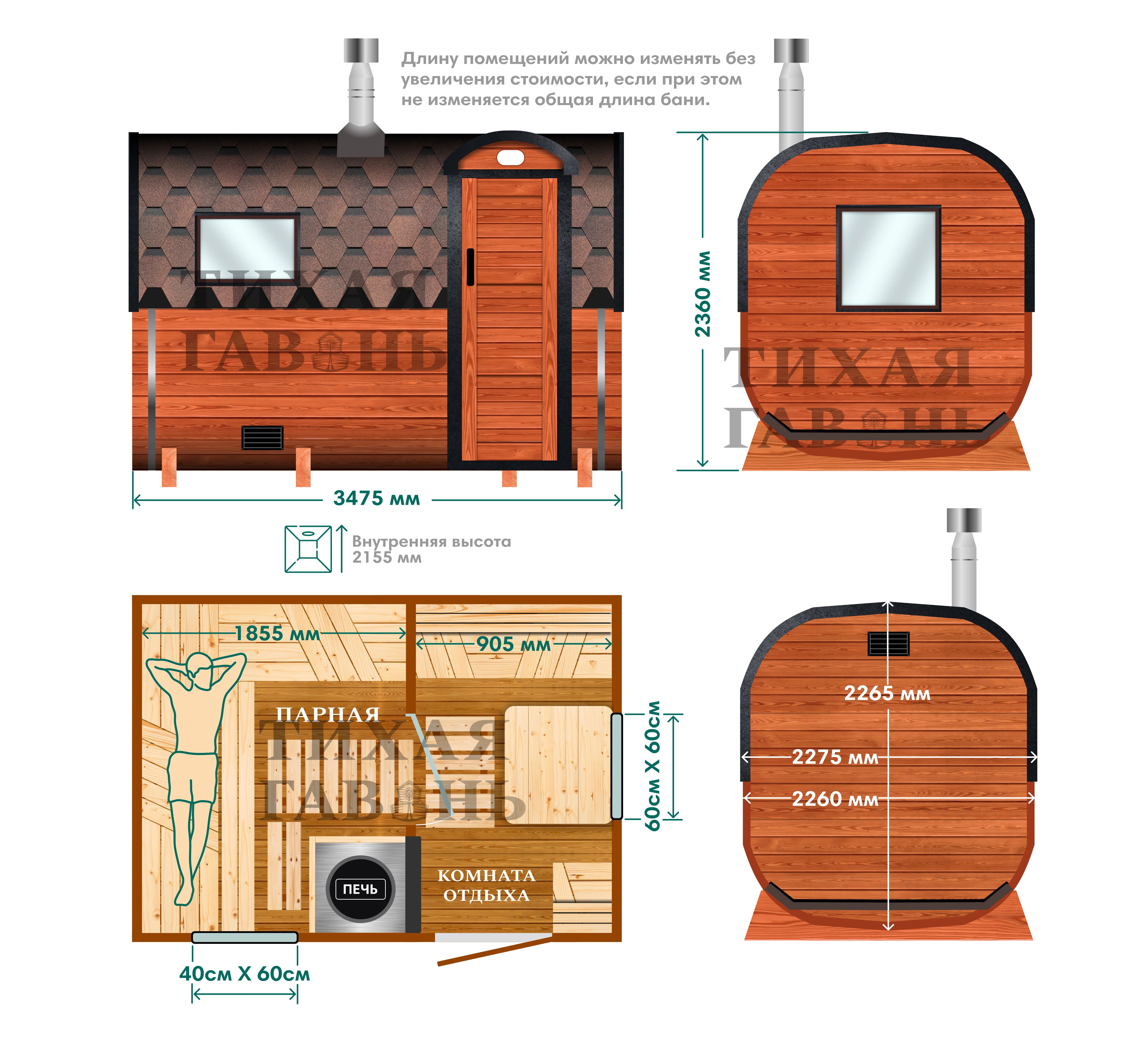 Квадро баня 3,5 м изготавливается в стандартных размерах. Ширина конструкции составляет 2,27 м, высота - 2,36 м. Увеличение габаритов в серии квадро не применяется, что сохраняет устойчивость формы и понятные параметры использования.