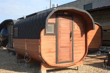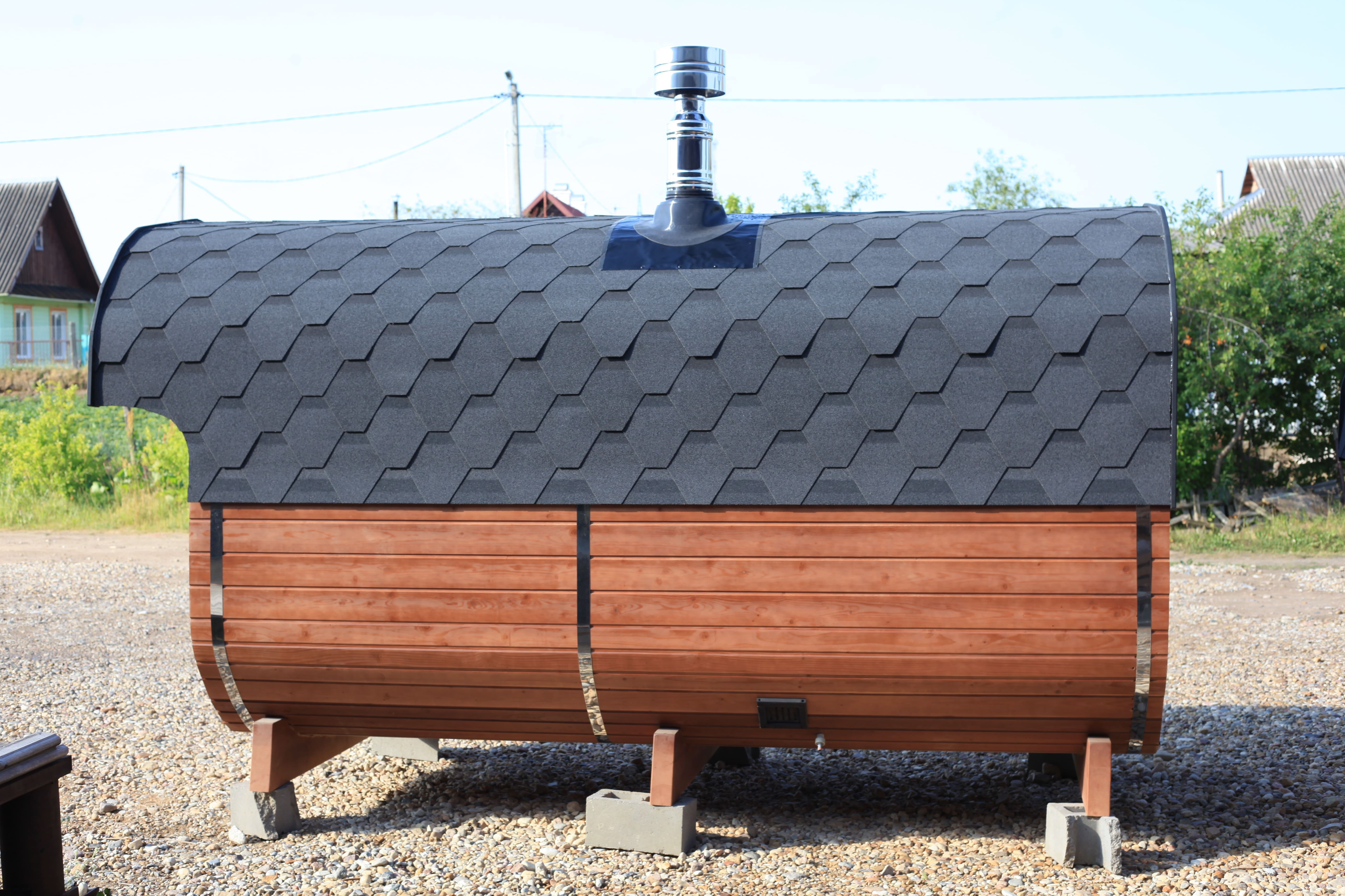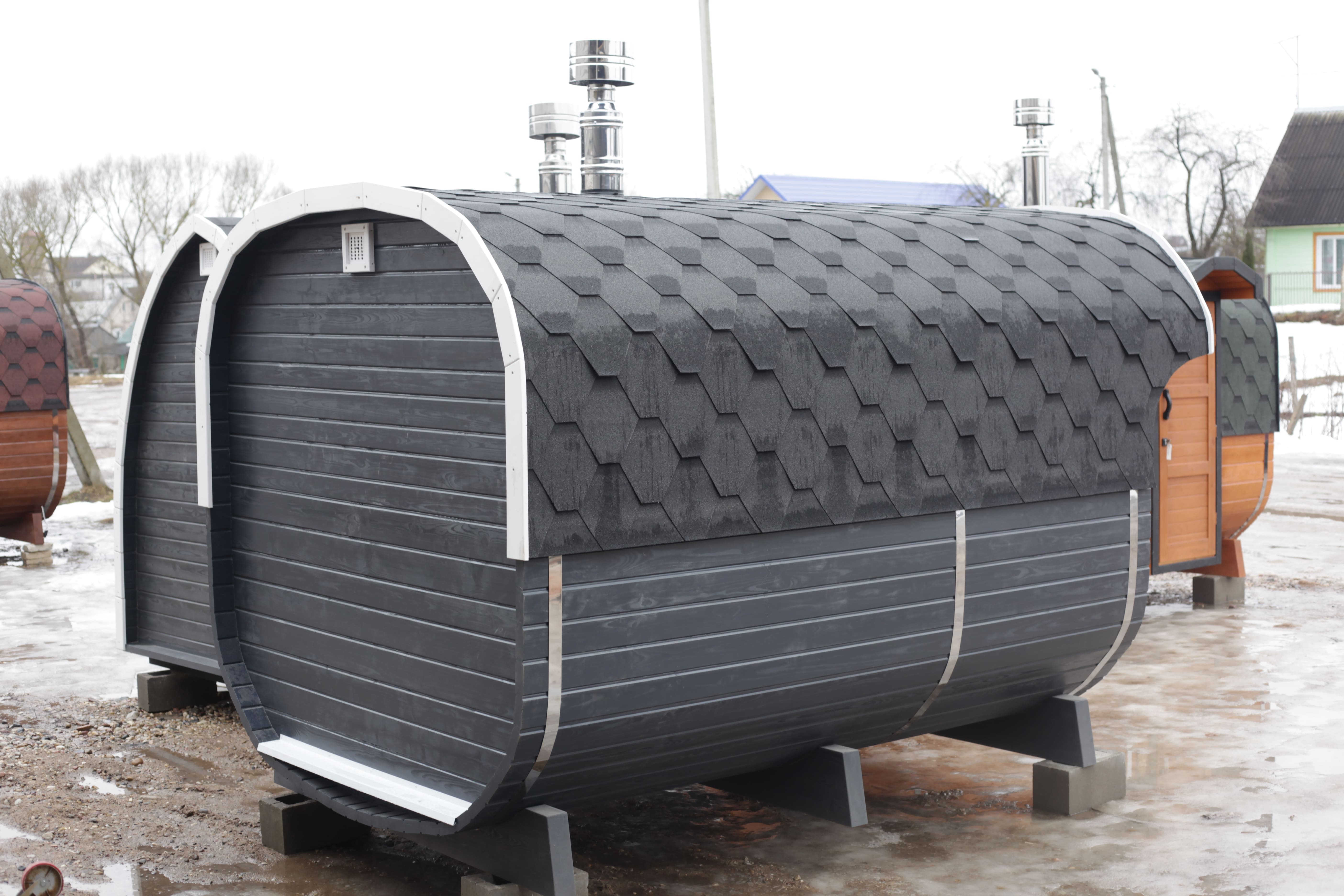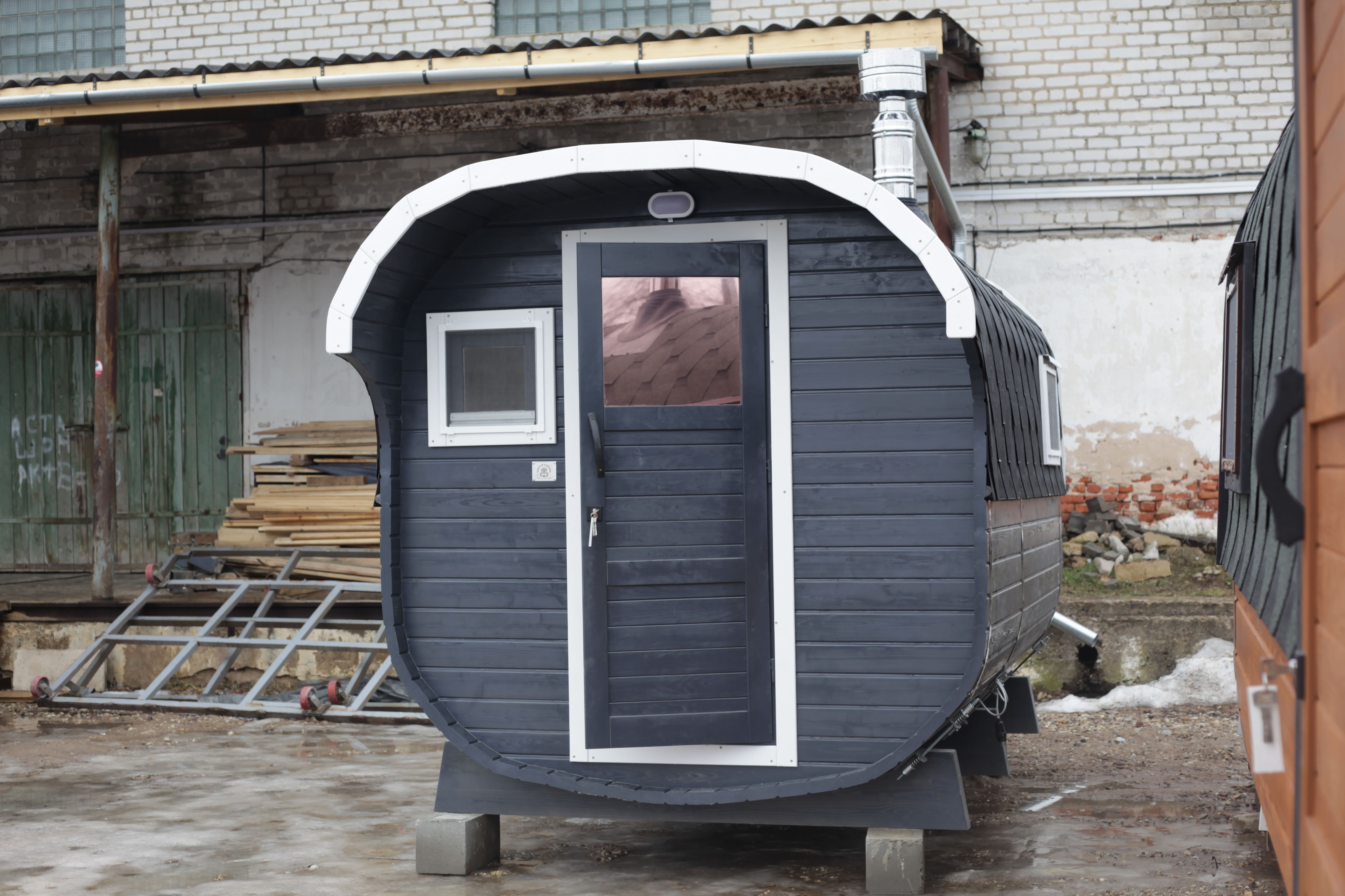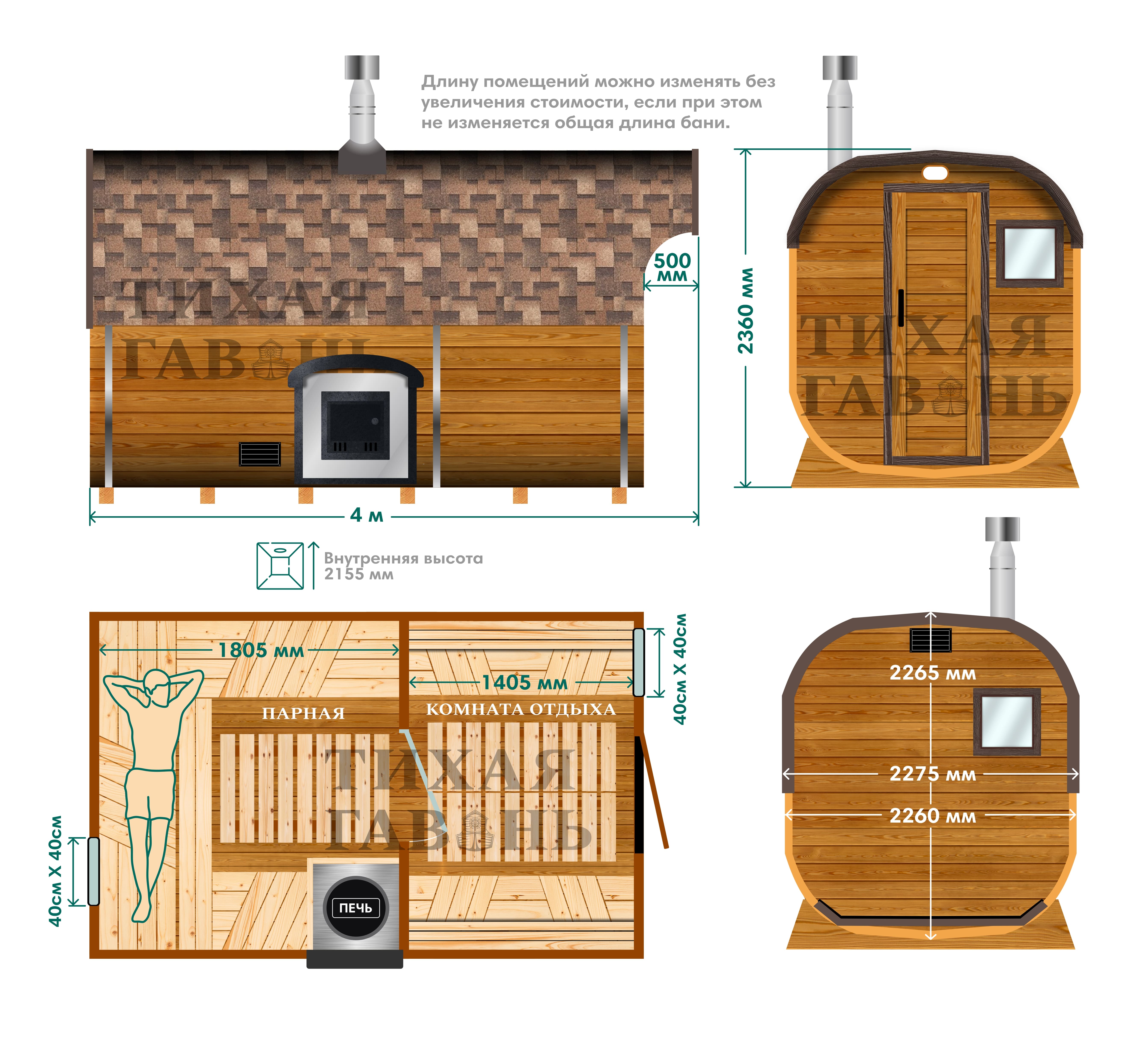 Баня быстро выходит на рабочую температуру за счет компактного объема. Среднее время прогрева составляет около 1 часа и зависит от сезона и выбранной печи. Возможна установка дровяной или электрической печи.