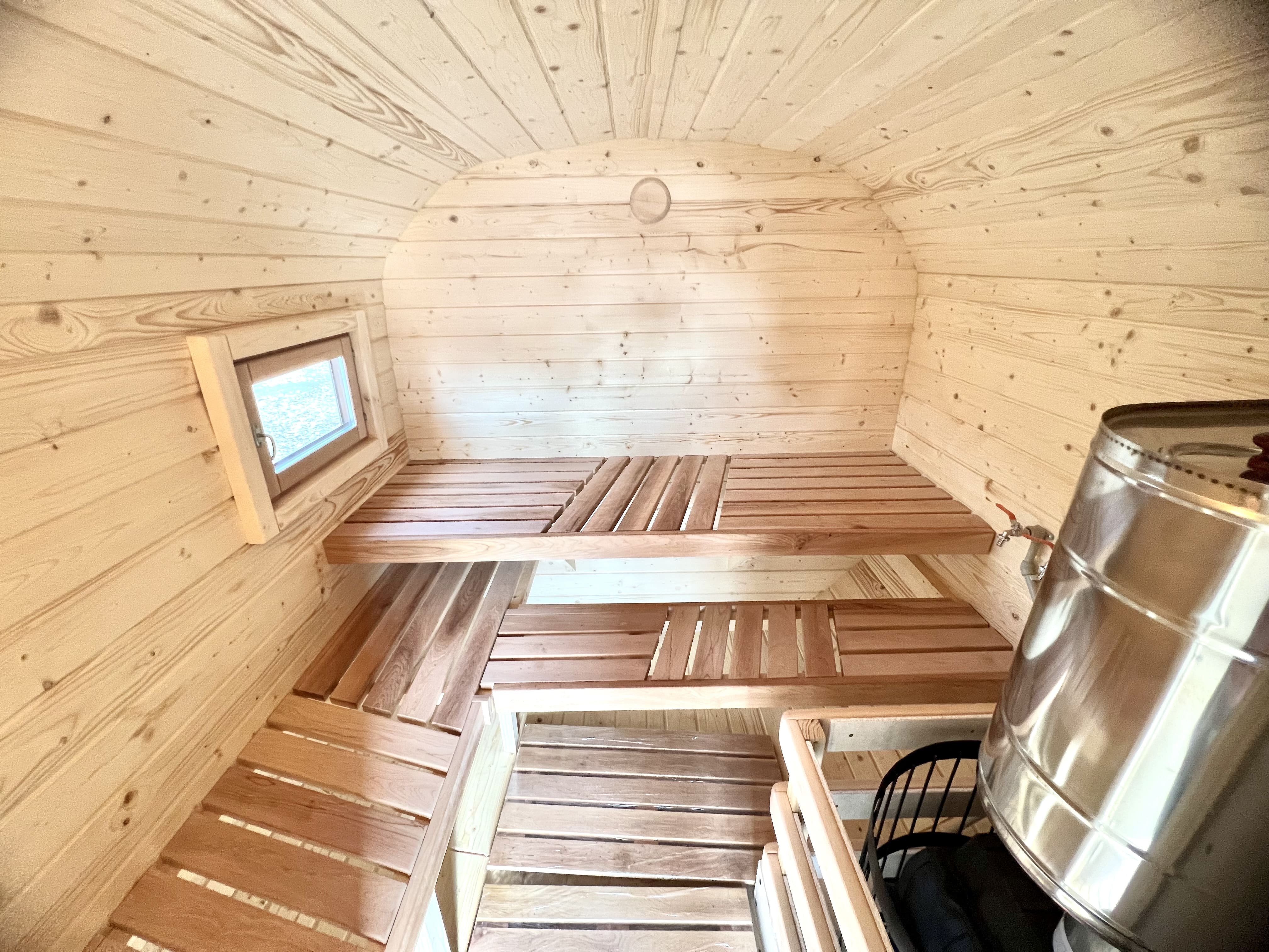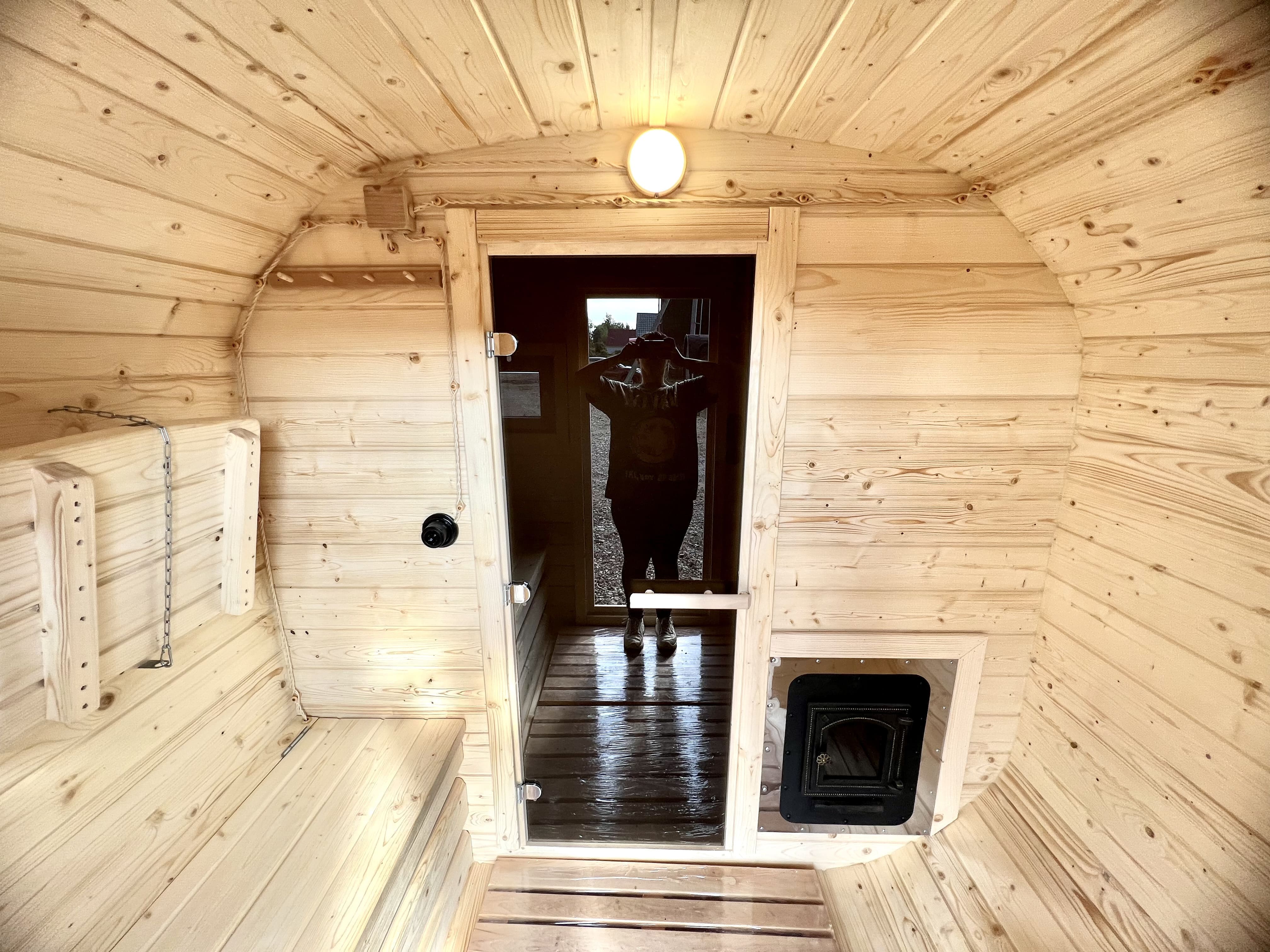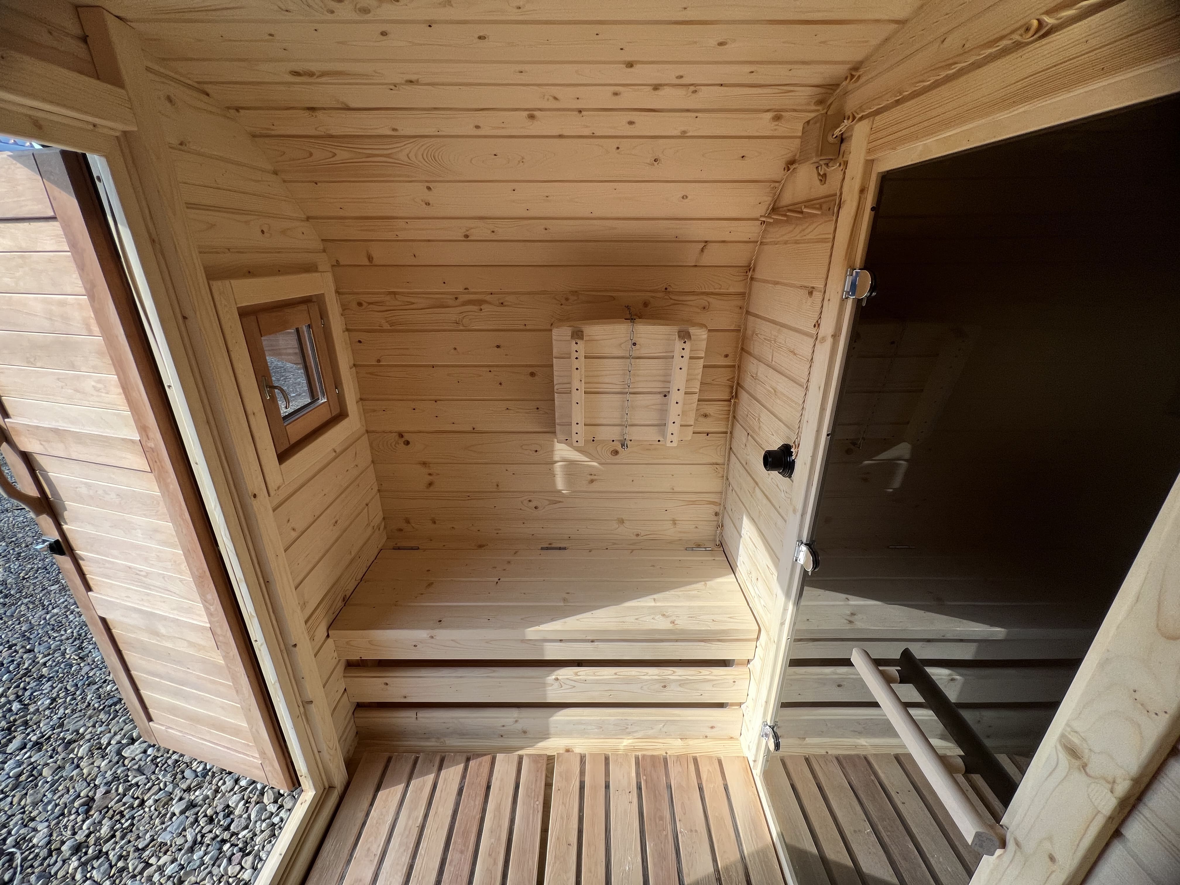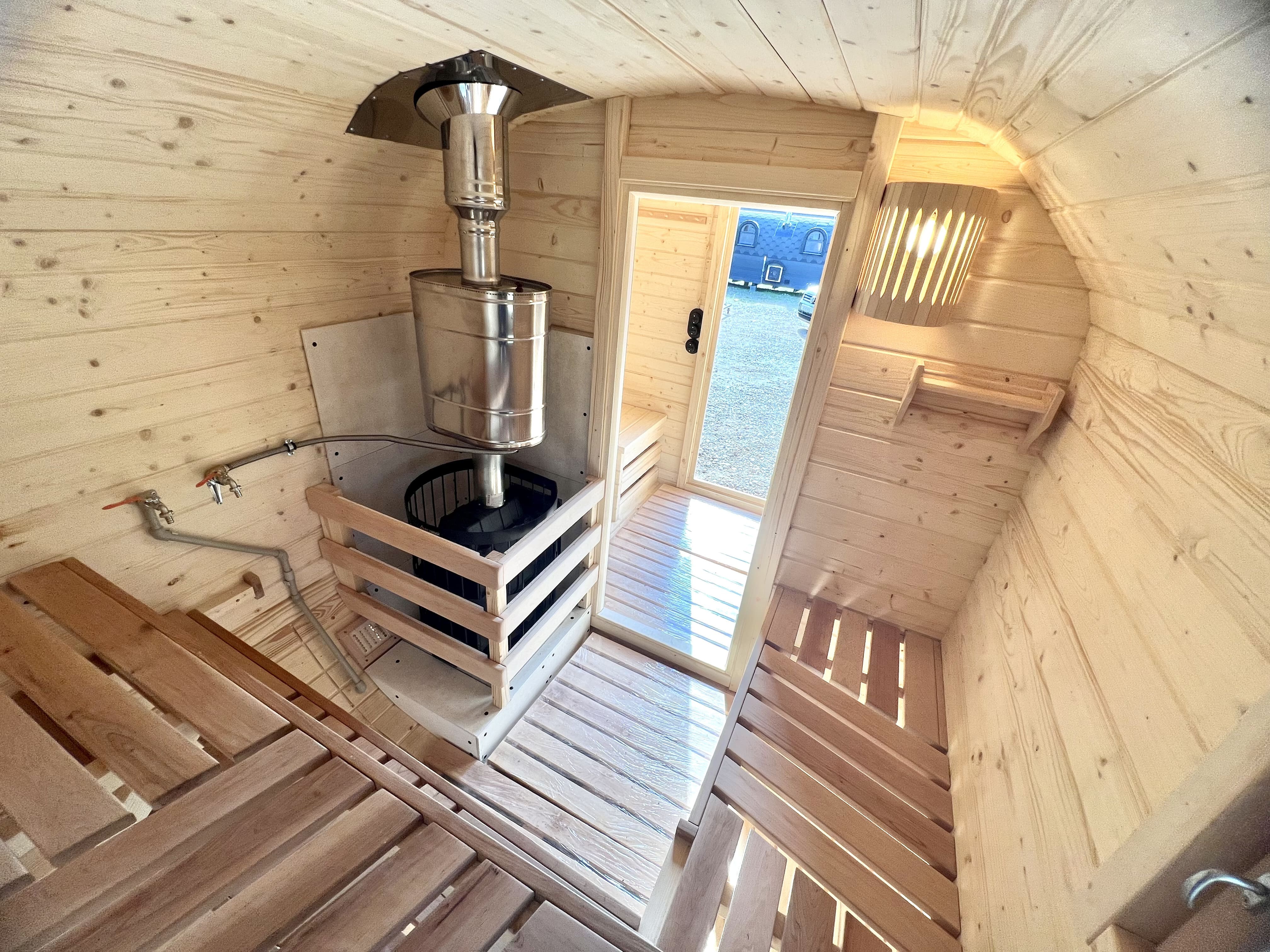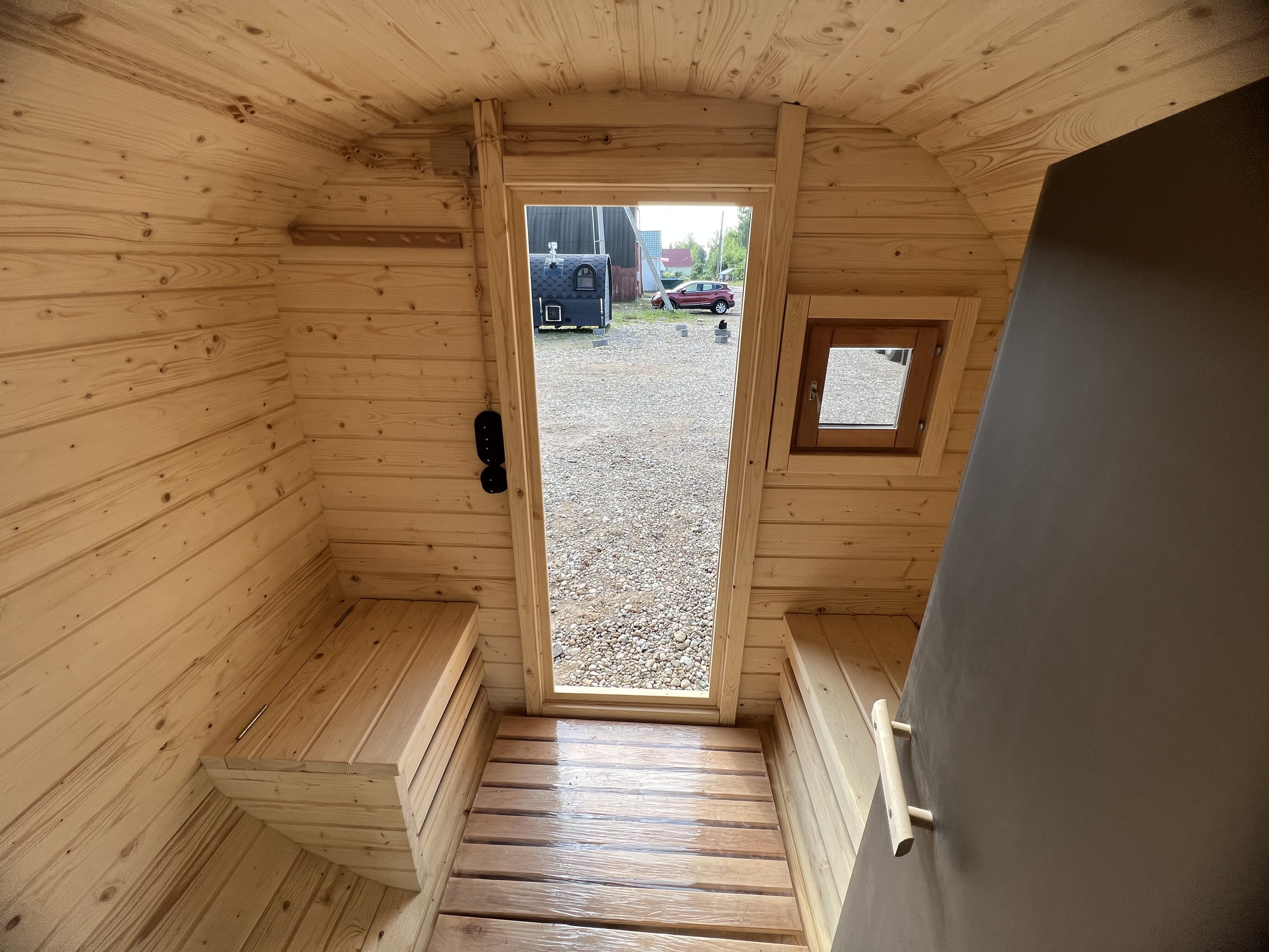 Баня быстро выходит на рабочую температуру за счет компактного объема. Среднее время прогрева составляет около 1 часа и зависит от сезона и выбранной печи. Возможна установка дровяной или электрической печи.