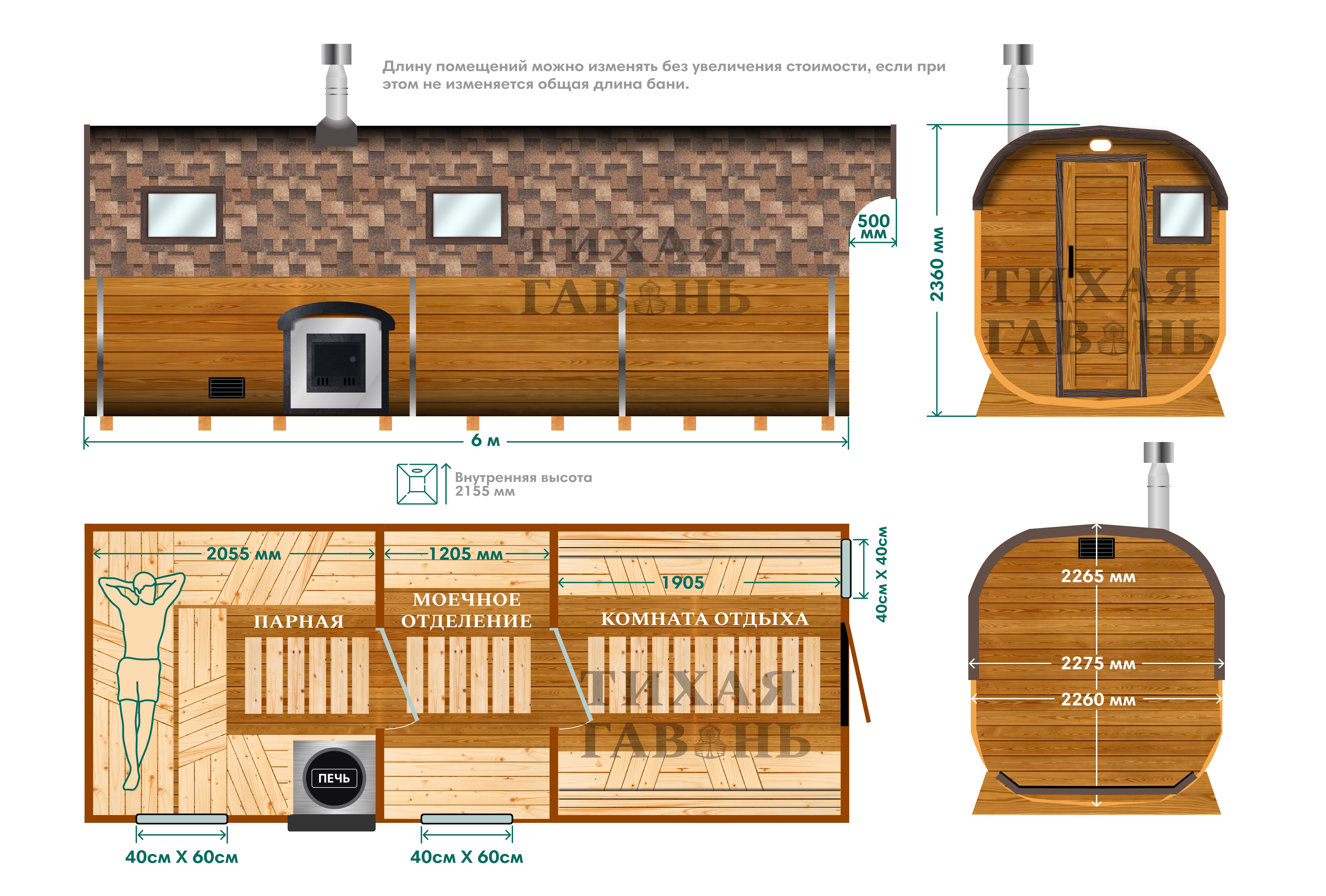 Длина 6 метров позволяет комфортно использовать баню 4–6 человекам одновременно. Формат подходит для загородных участков среднего и большого размера, а также для семейного отдыха и приёма гостей.