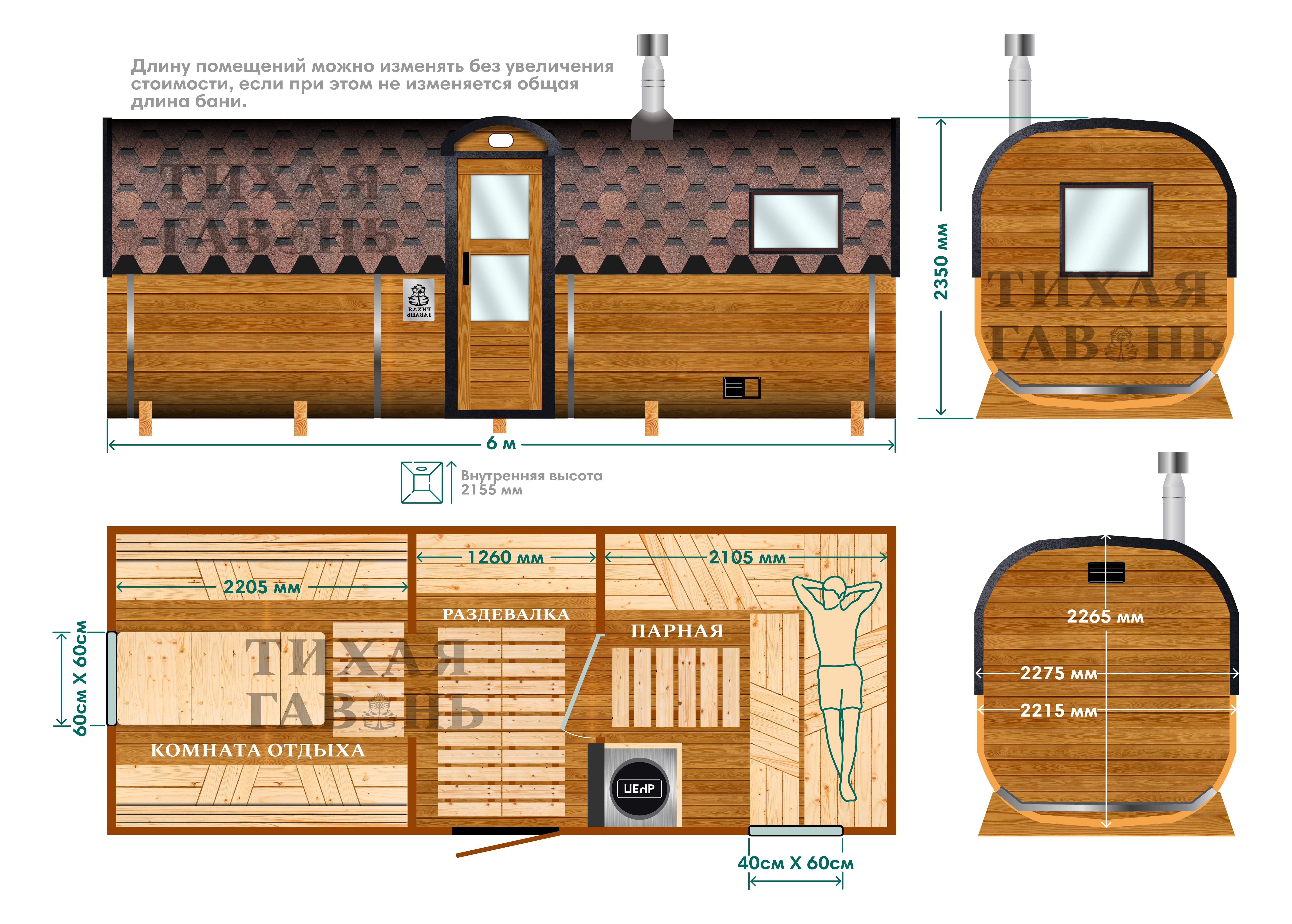 Длина 6 метров позволяет грамотно распределить пространство внутри, а боковой вход делает планировку более функциональной и удобной при размещении бани на участке. Баня рассчитана на комфортное использование 4–6 человек.