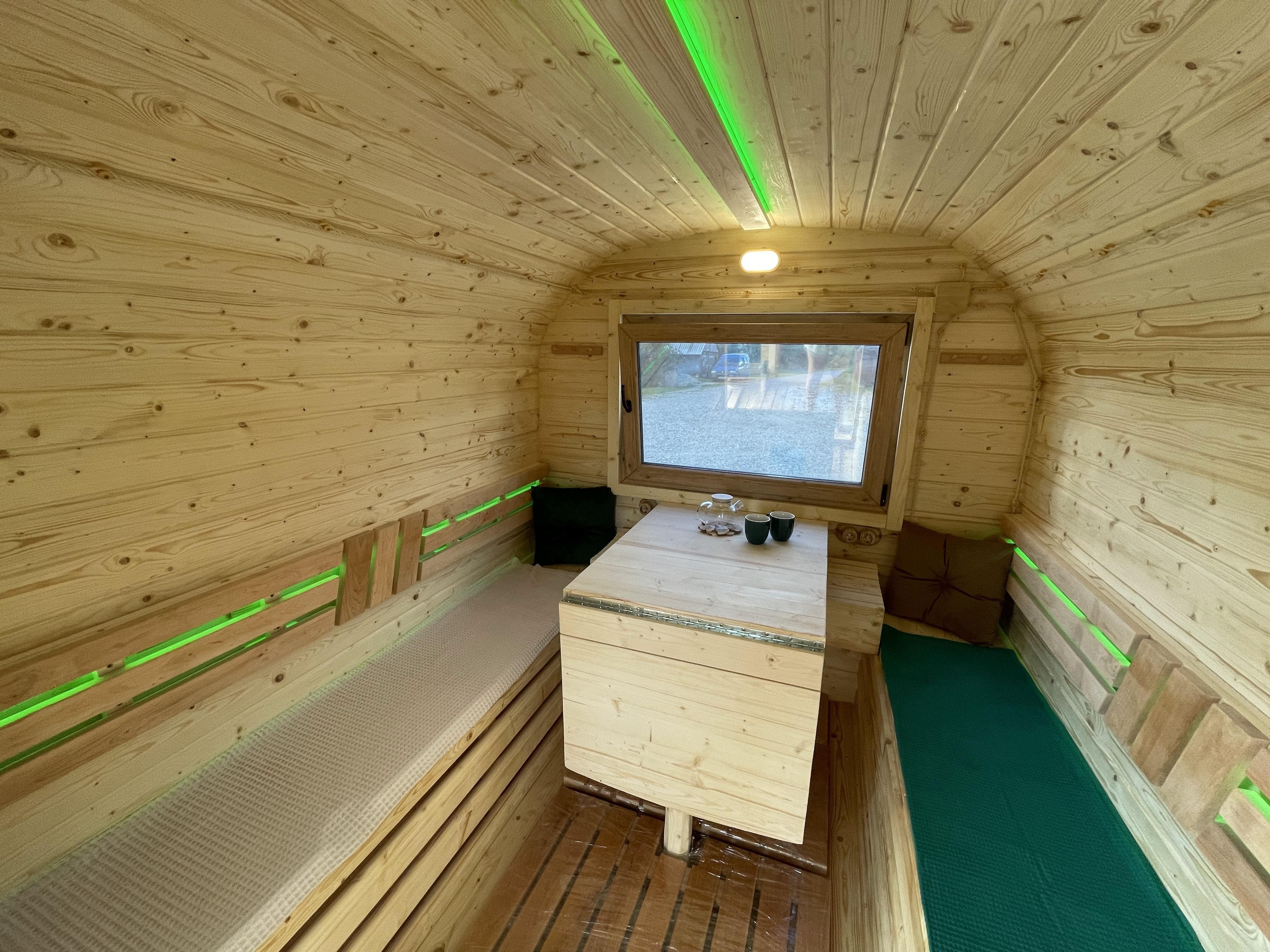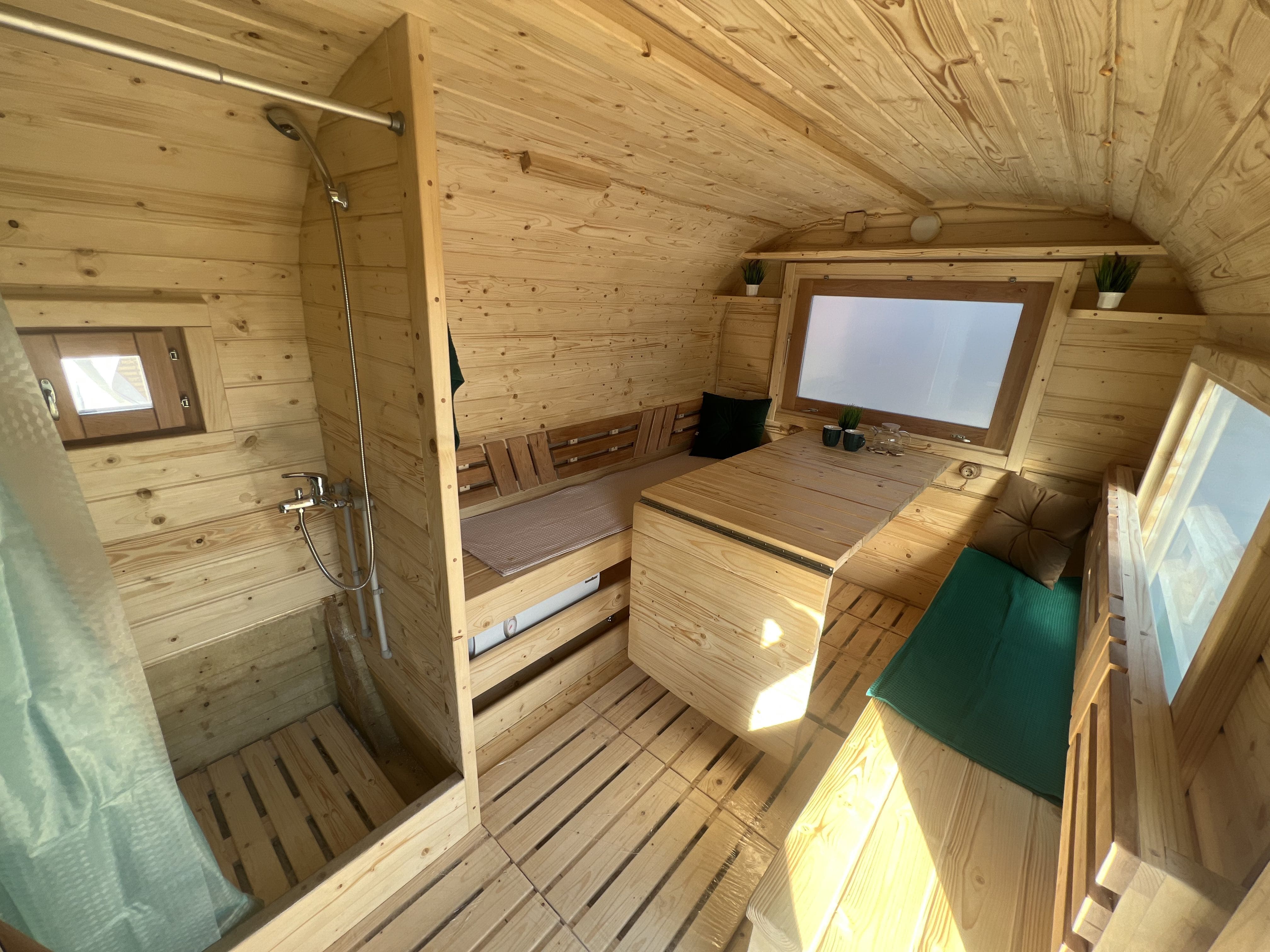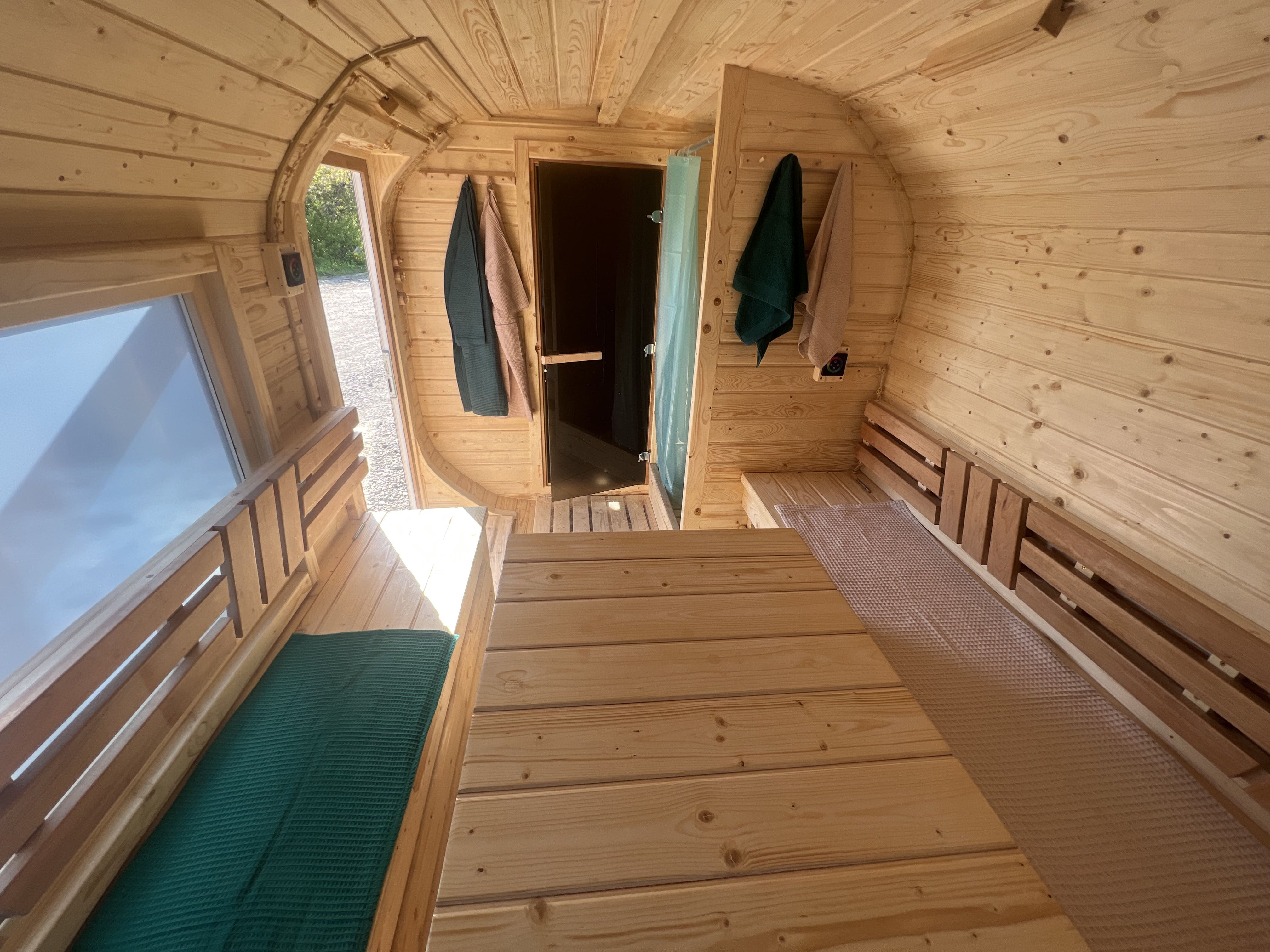 Форма квадро даёт больше полезного объёма по сравнению с банями-бочками. Прямые стены упрощают установку мебели, лавок, шкафчиков и окон большего размера. Боковой вход расширяет варианты размещения бани на участке и делает входную зону более защищённой.