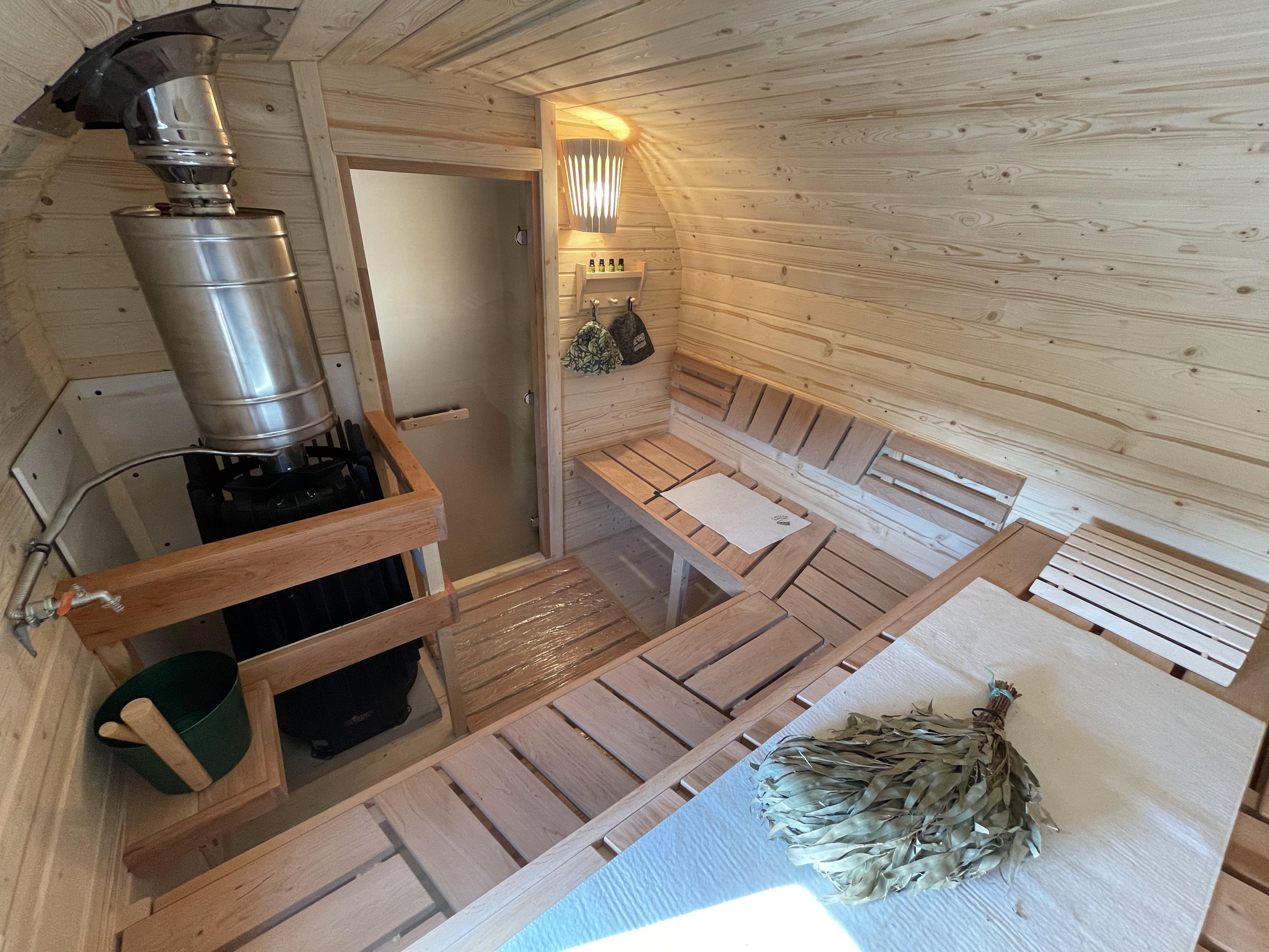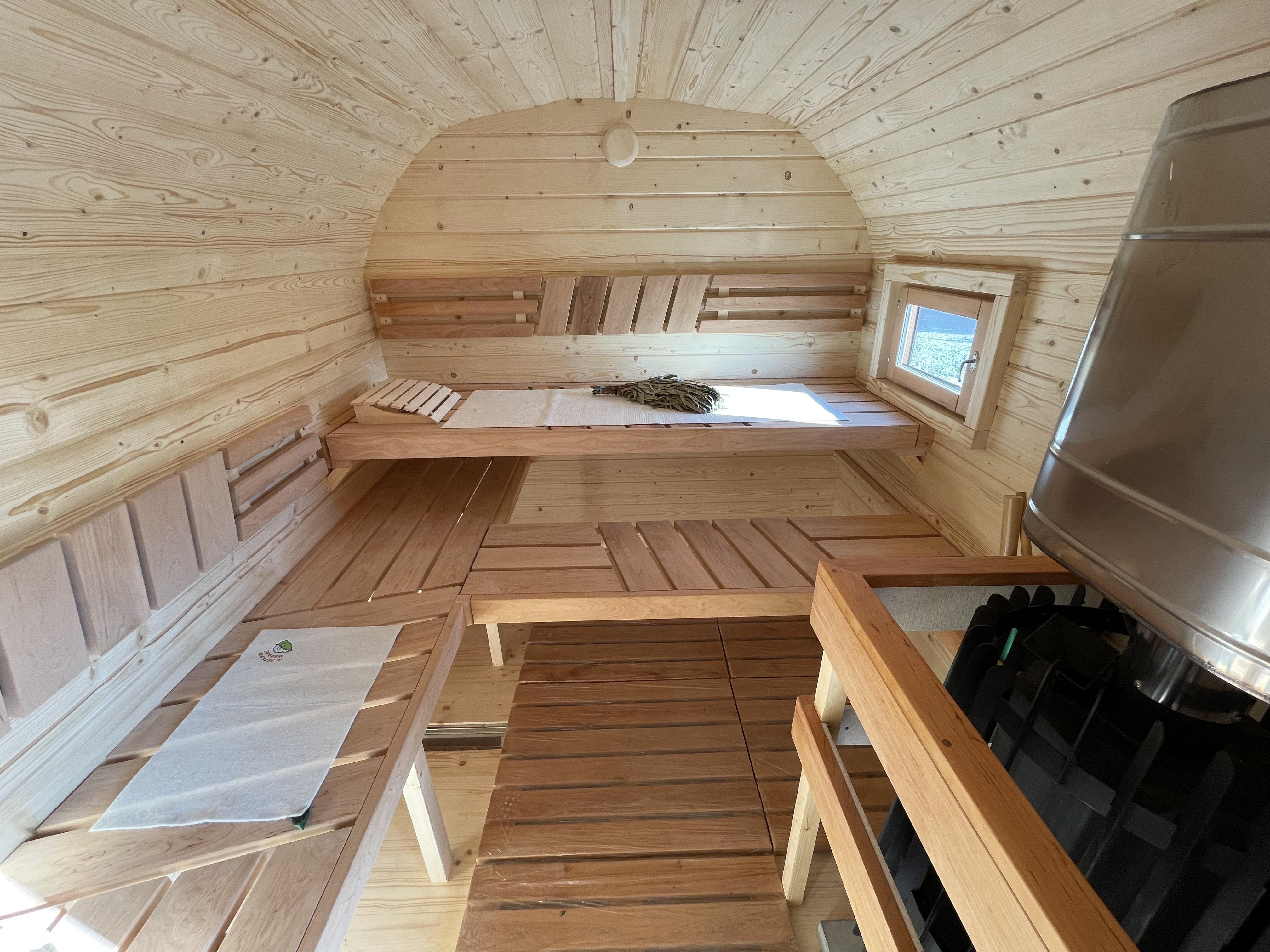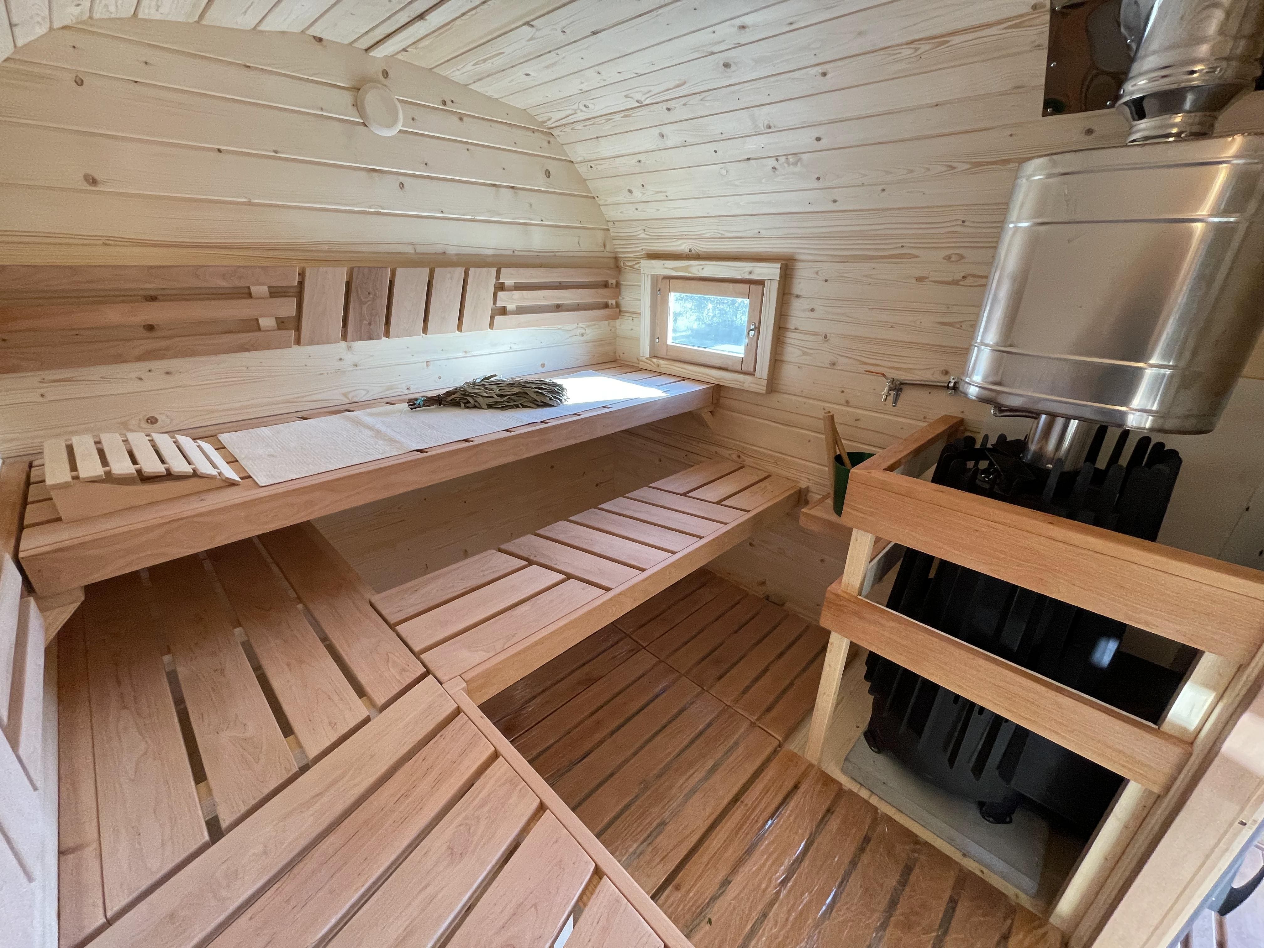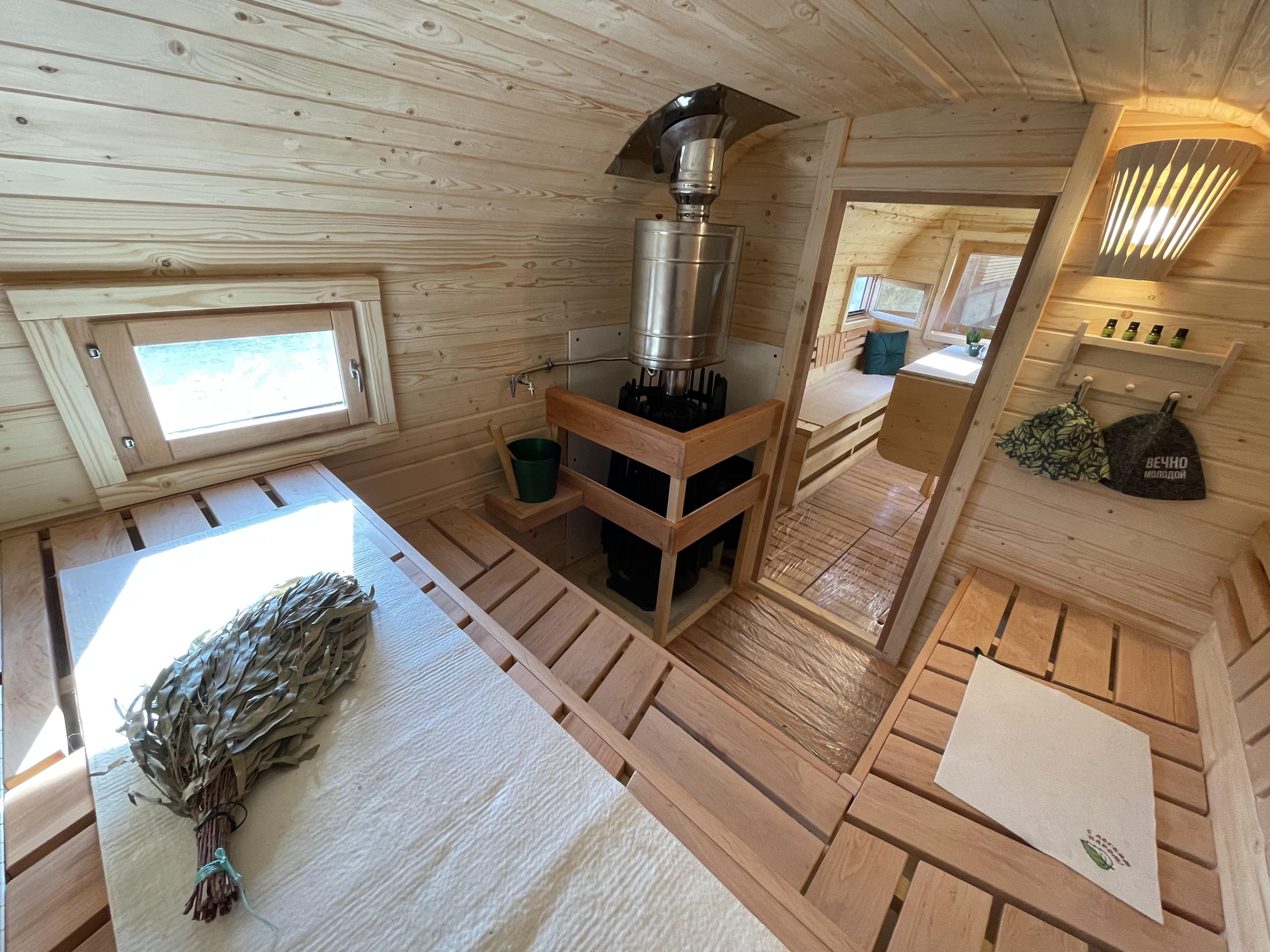 Парная: Двойной пол с уклоном, с желобом из нержавеющей стали. Полки расположены на разных уровнях. Дополнительный полок выдвижной 2000*500 мм. Верхний полок откидной (со спинкой). Две спинки над местами для сидения. Вентклапан. Регулируется путем откручивания. Защита вокруг печи. Полка возле печи. Обручи из нержавеющей стали с саморегулирующимися замками.