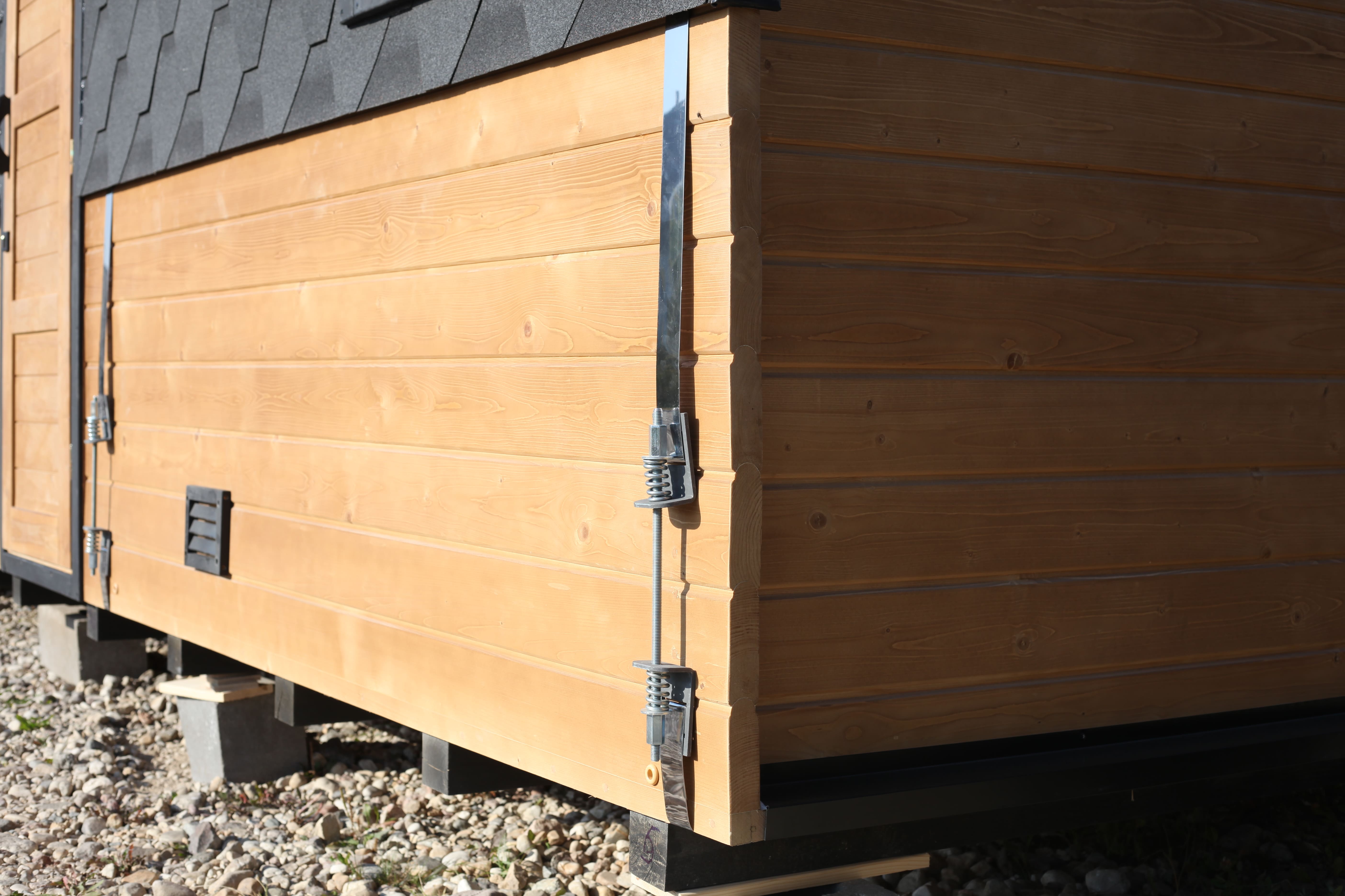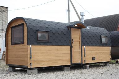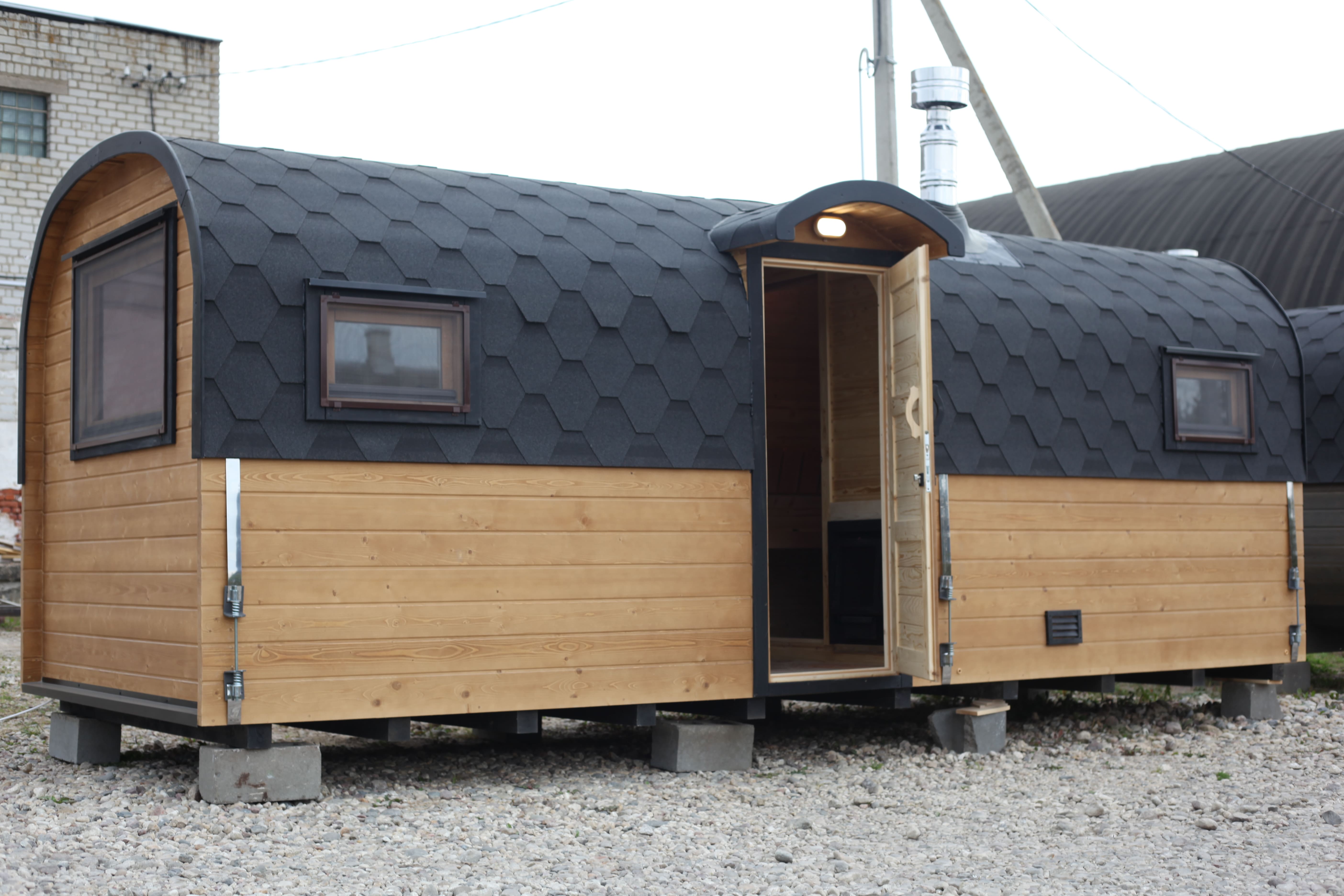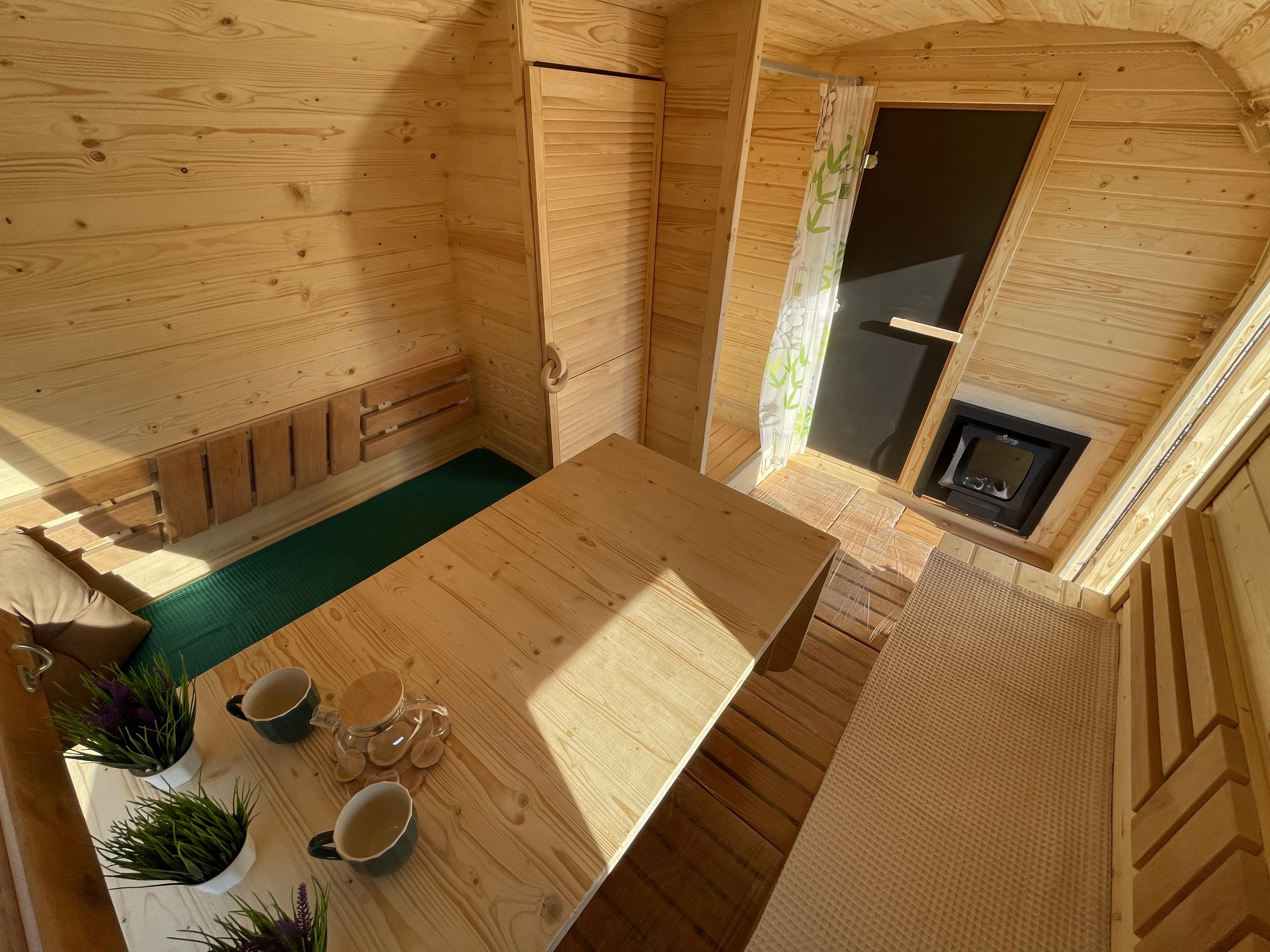 Парная: Двойной пол с уклоном, с желобом из нержавеющей стали. Полки расположены на разных уровнях. Дополнительный полок выдвижной 2000*500 мм. Верхний полок откидной (со спинкой). Две спинки над местами для сидения. Вентклапан. Регулируется путем откручивания. Защита вокруг печи. Полка возле печи. Обручи из нержавеющей стали с саморегулирующимися замками.