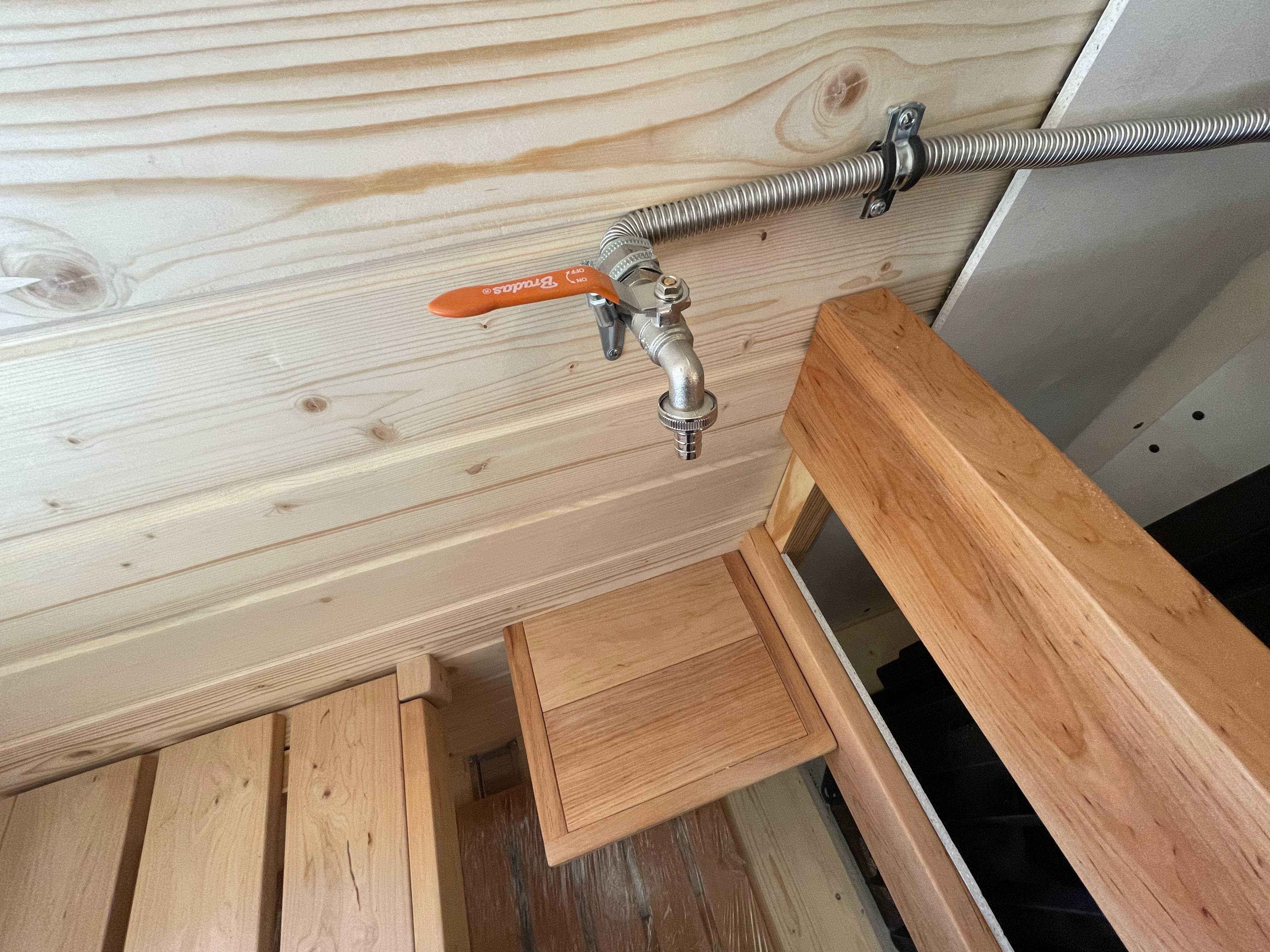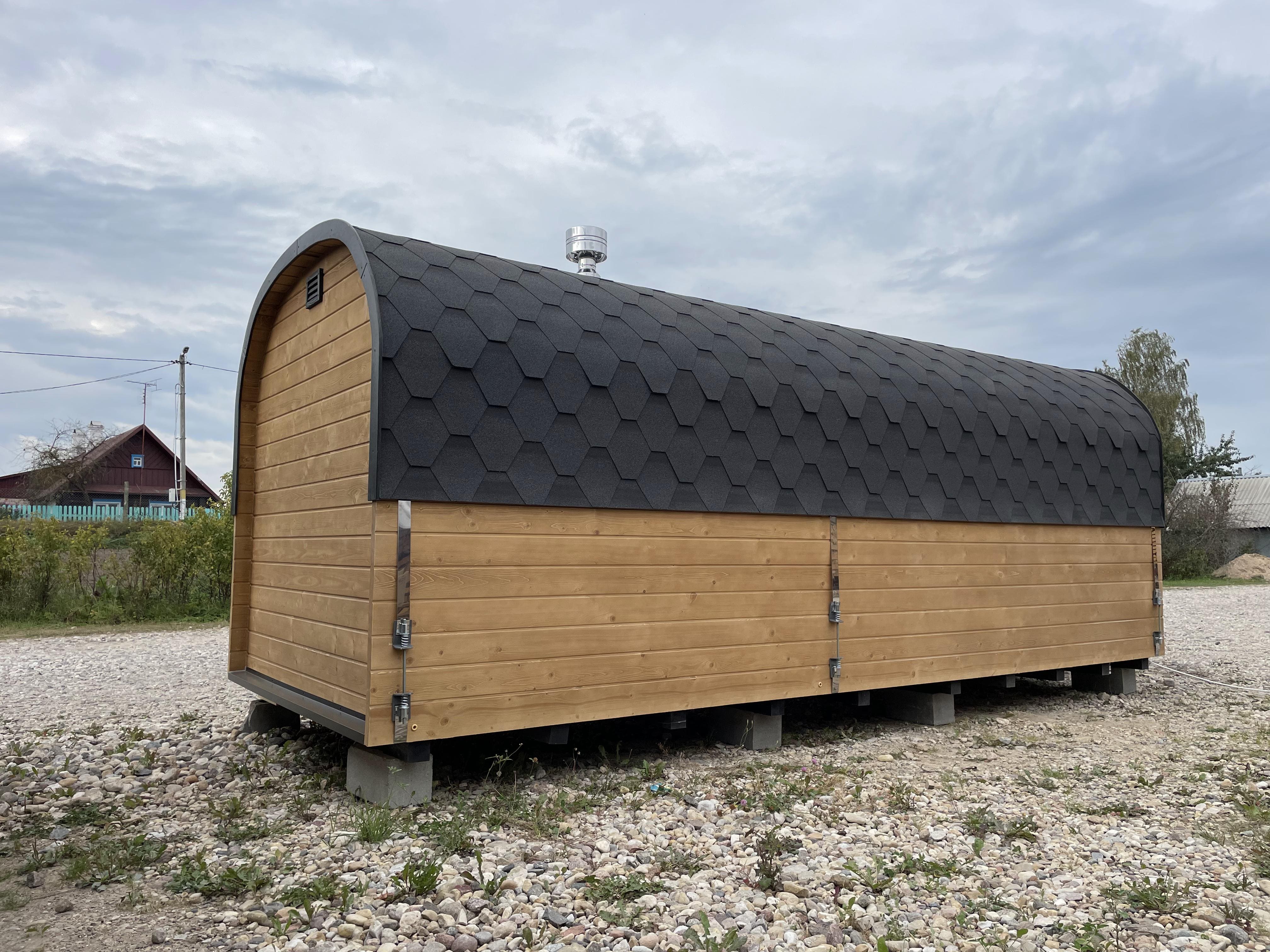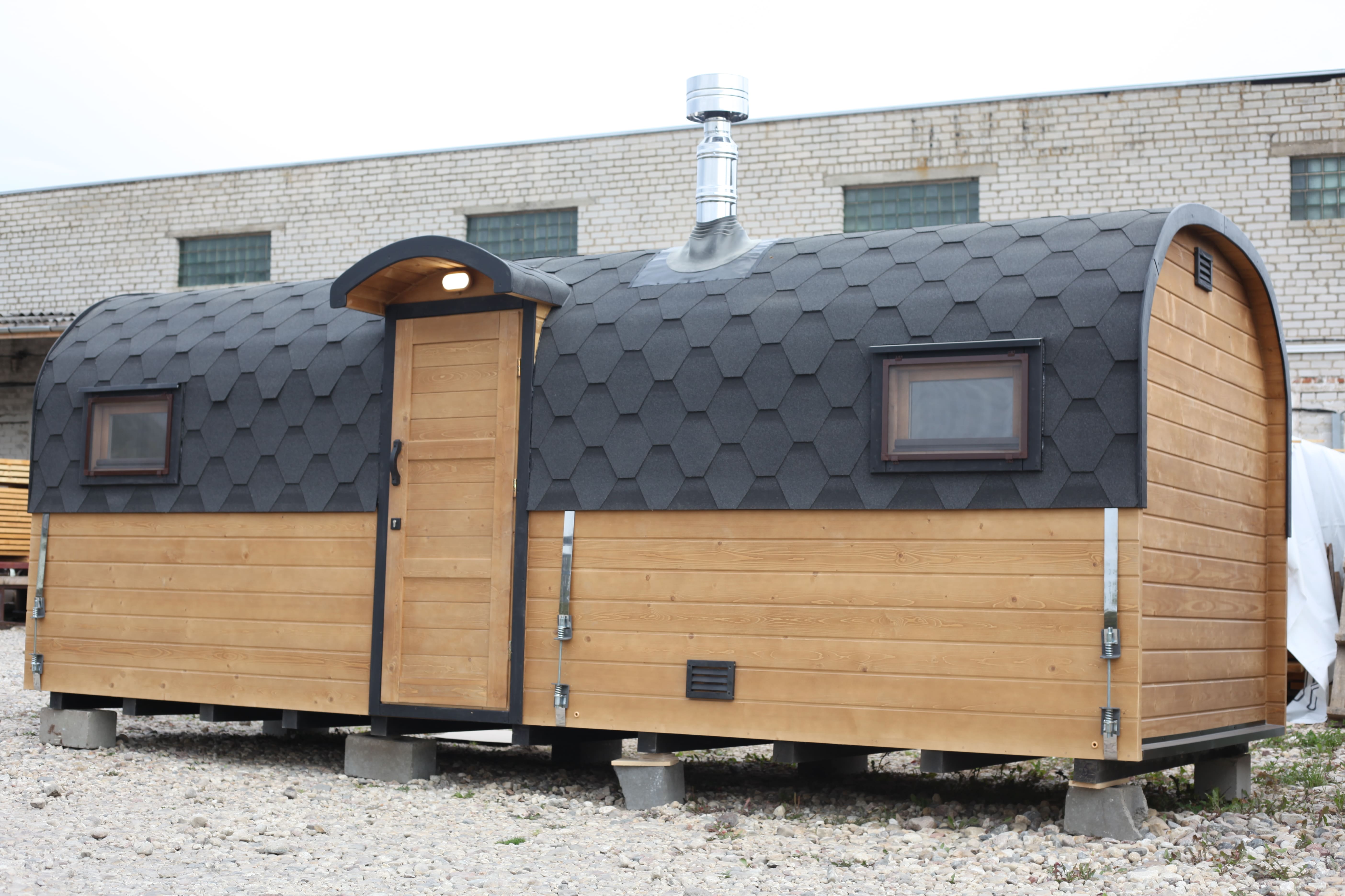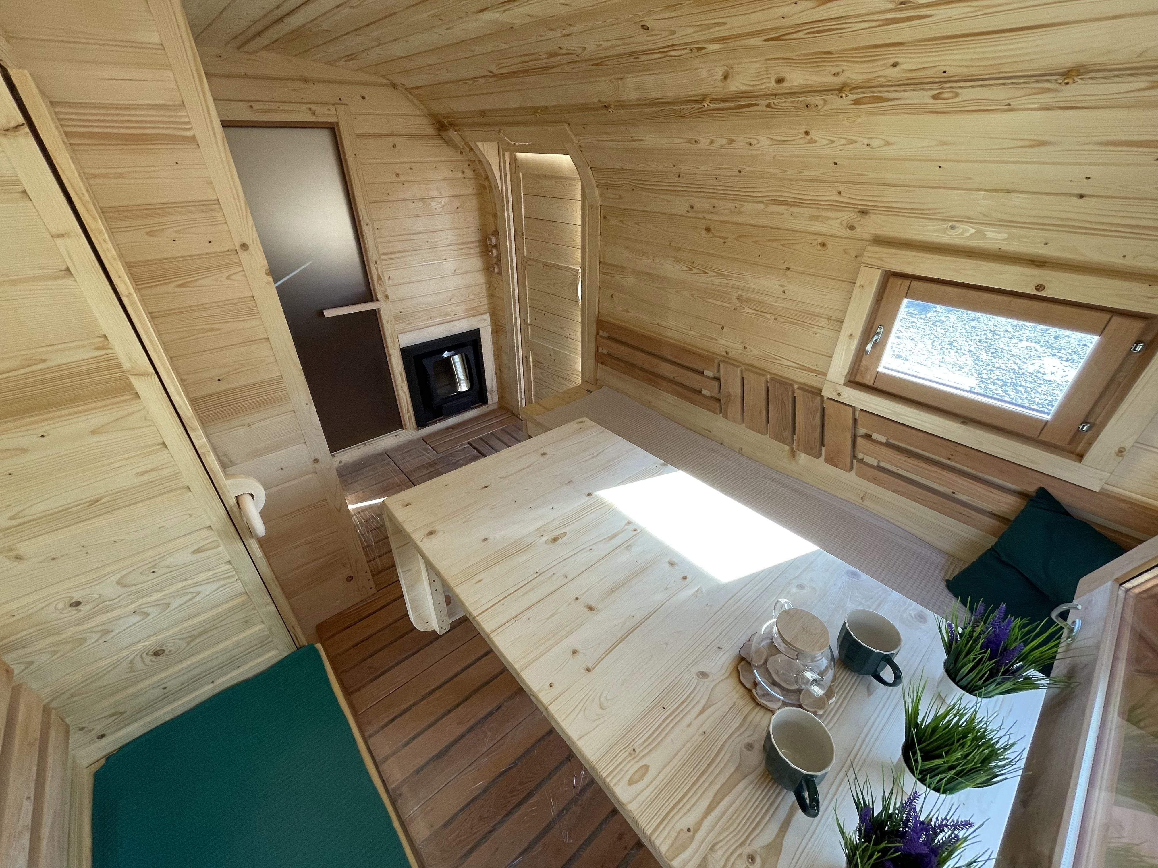 Парная: Двойной пол с уклоном, с желобом из нержавеющей стали. Полки расположены на разных уровнях. Дополнительный полок выдвижной 2000*500 мм. Верхний полок откидной (со спинкой). Две спинки над местами для сидения. Вентклапан. Регулируется путем откручивания. Защита вокруг печи. Полка возле печи. Обручи из нержавеющей стали с саморегулирующимися замками.